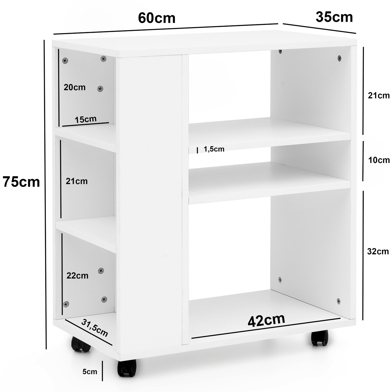 Dieses weiße Rollregal mit Melaminbeschichtung vereint Praktikabilität und modernes Design. Ideal für Küche, Büro oder Wohnzimmer mit sechs geräumigen Ablagen und leichtgängigen Rollen.