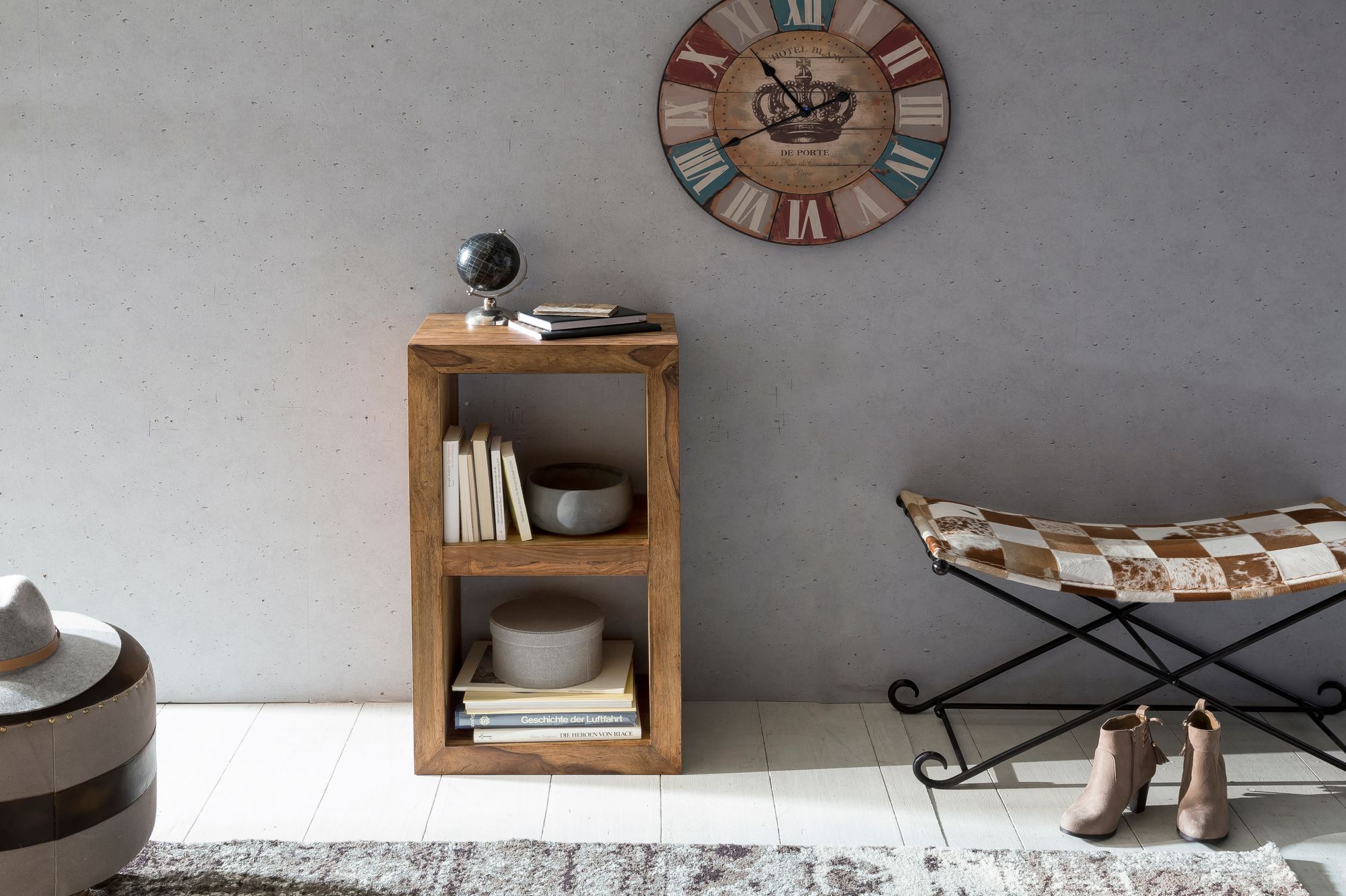 Standregal aus massivem Sheesham-Holz mit natürlichem und elegantem Design, ideal als Beistelltisch, Aufbewahrungsmöbel oder kleiner Couchtisch. Die geradlinige Form mit 2 Böden bietet vielseitige Einsatzmöglichkeiten.