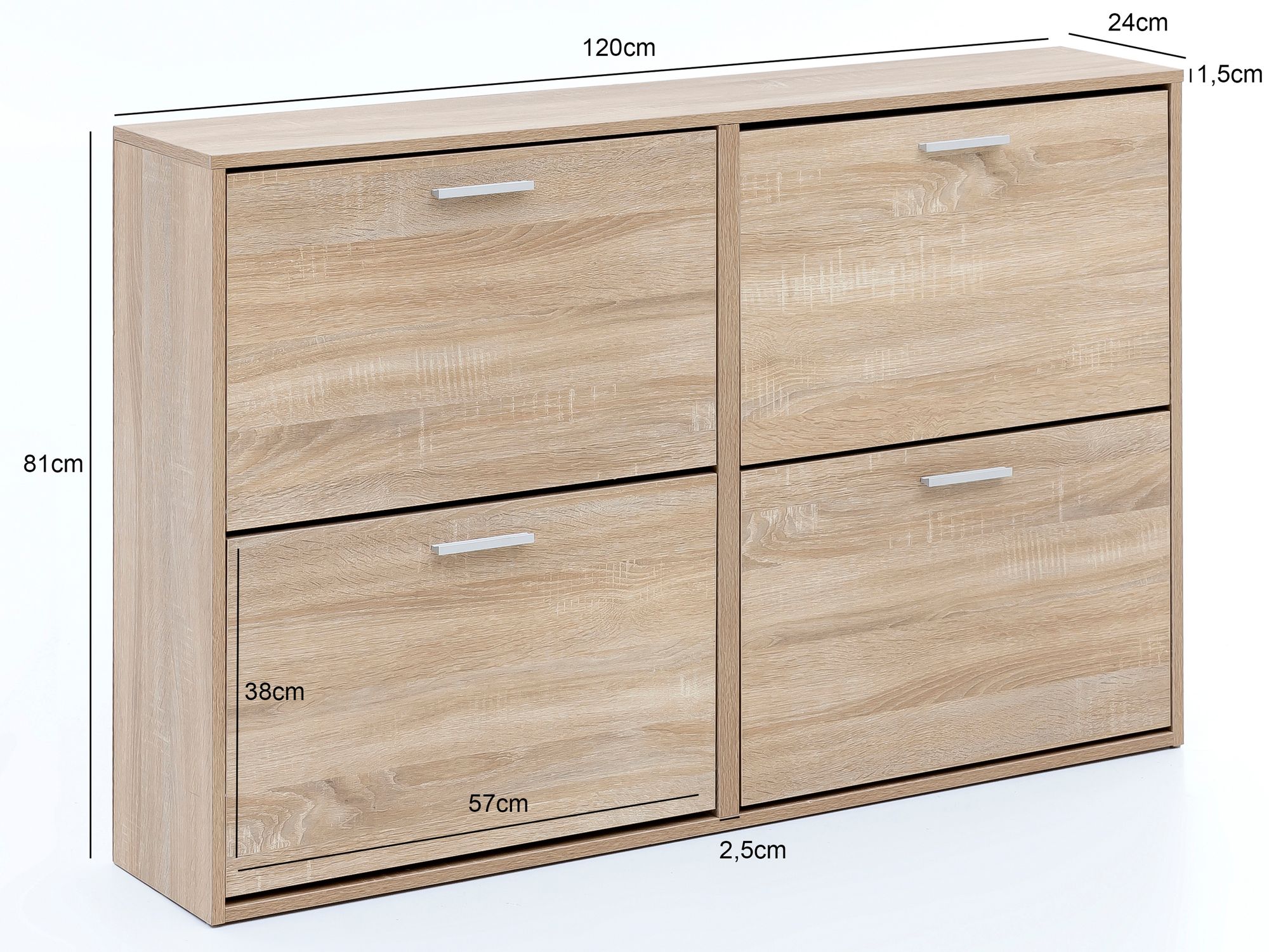 Schuhschrank Holz Sonoma | 120x81x24 cm | 4 Fächer, Aluminiumgriffe