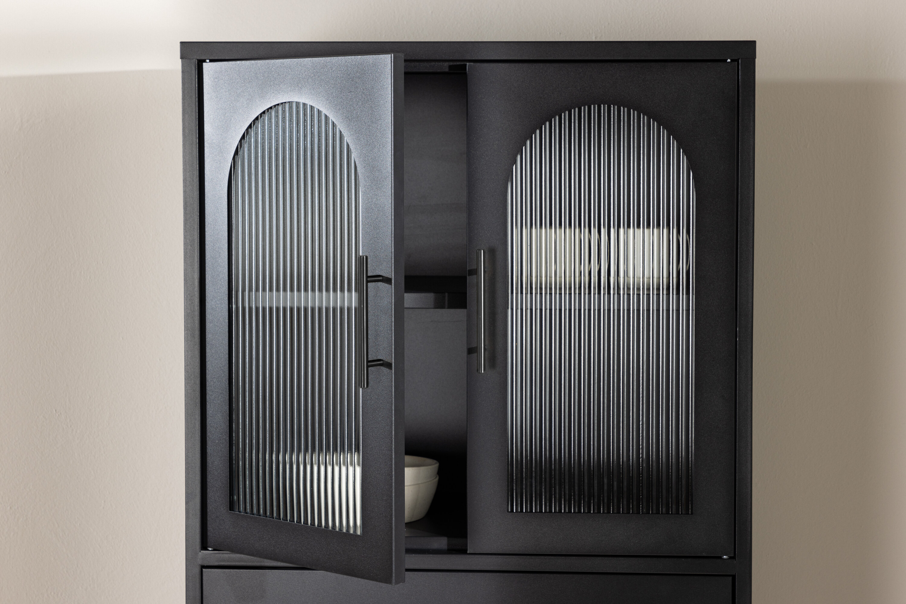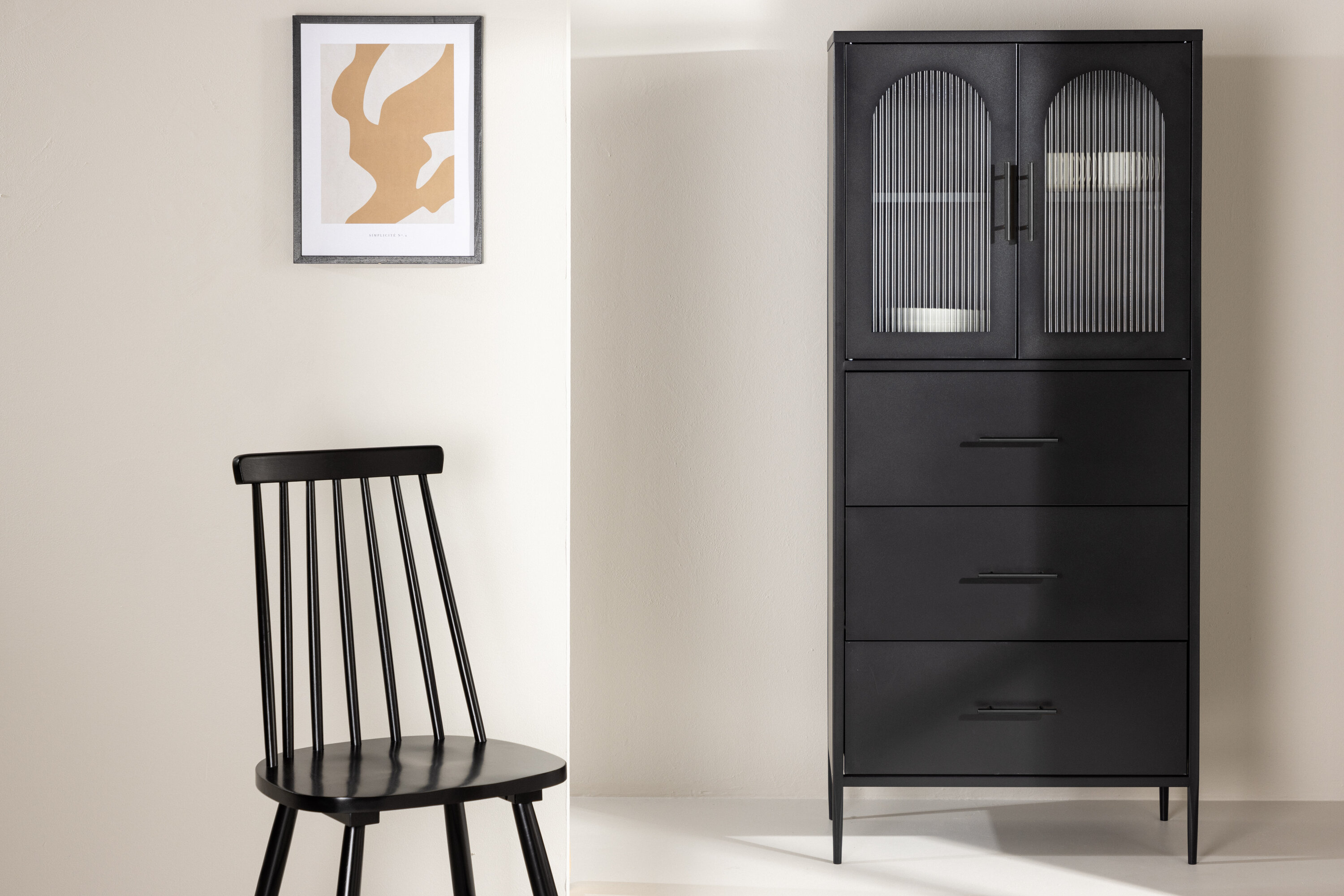 Mit seinen vier schmalen Beinen schafft der Schrank ein Gefühl von Leichtigkeit und bietet auch Platz für Ihren Staubsauger. Drei großzügige Schubladen am Boden bieten verdeckte Aufbewahrung und tragen dazu bei, dass dein Raum organisiert und ordentlich bleibt. Der obere Schrank verfügt über zwei schön geschwungene Glastüren, die einen Einblick in seinen Inhalt geben. Sein gewölbtes Design verleiht einen Hauch von Eleganz und schafft ein großartiges Gefühl in Ihrem Zuhause.