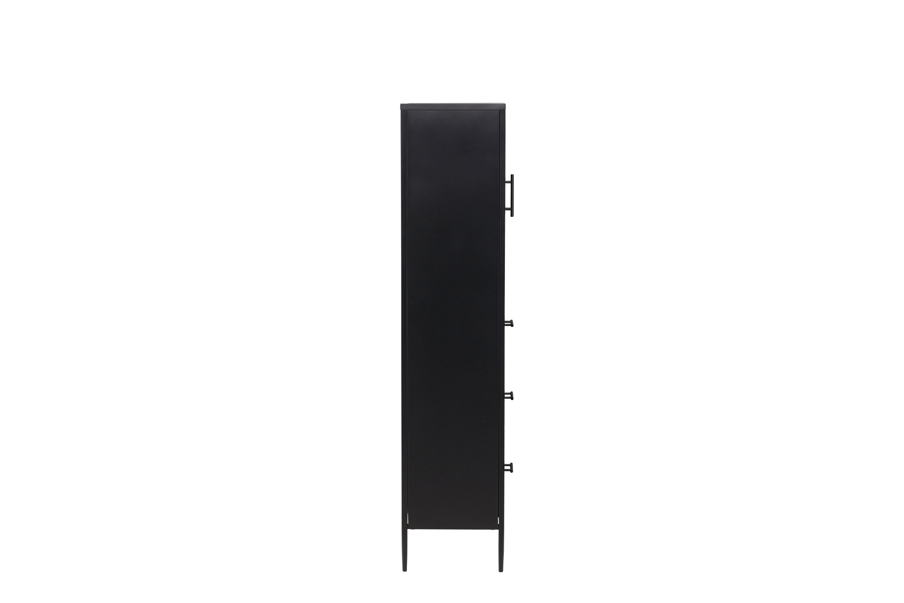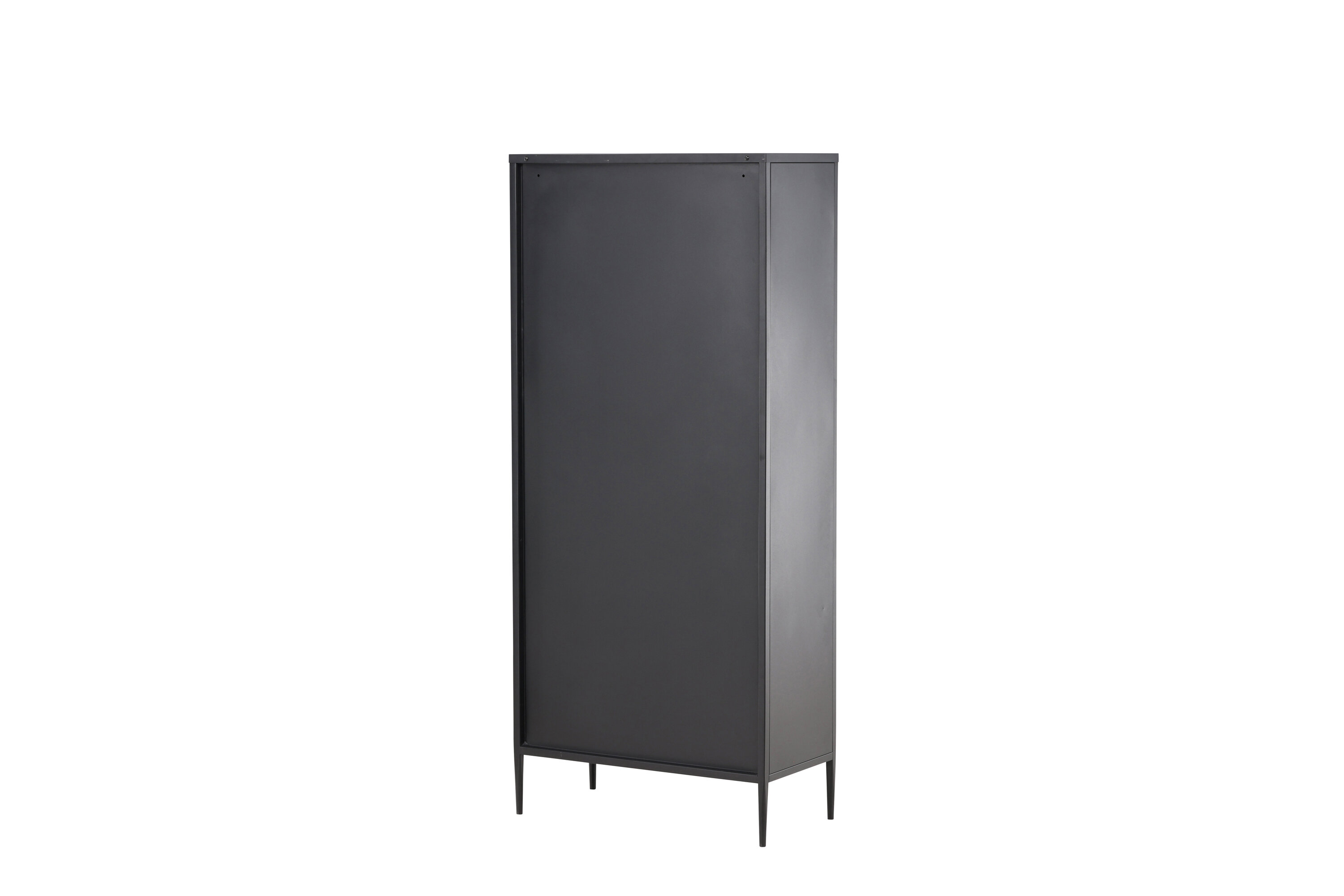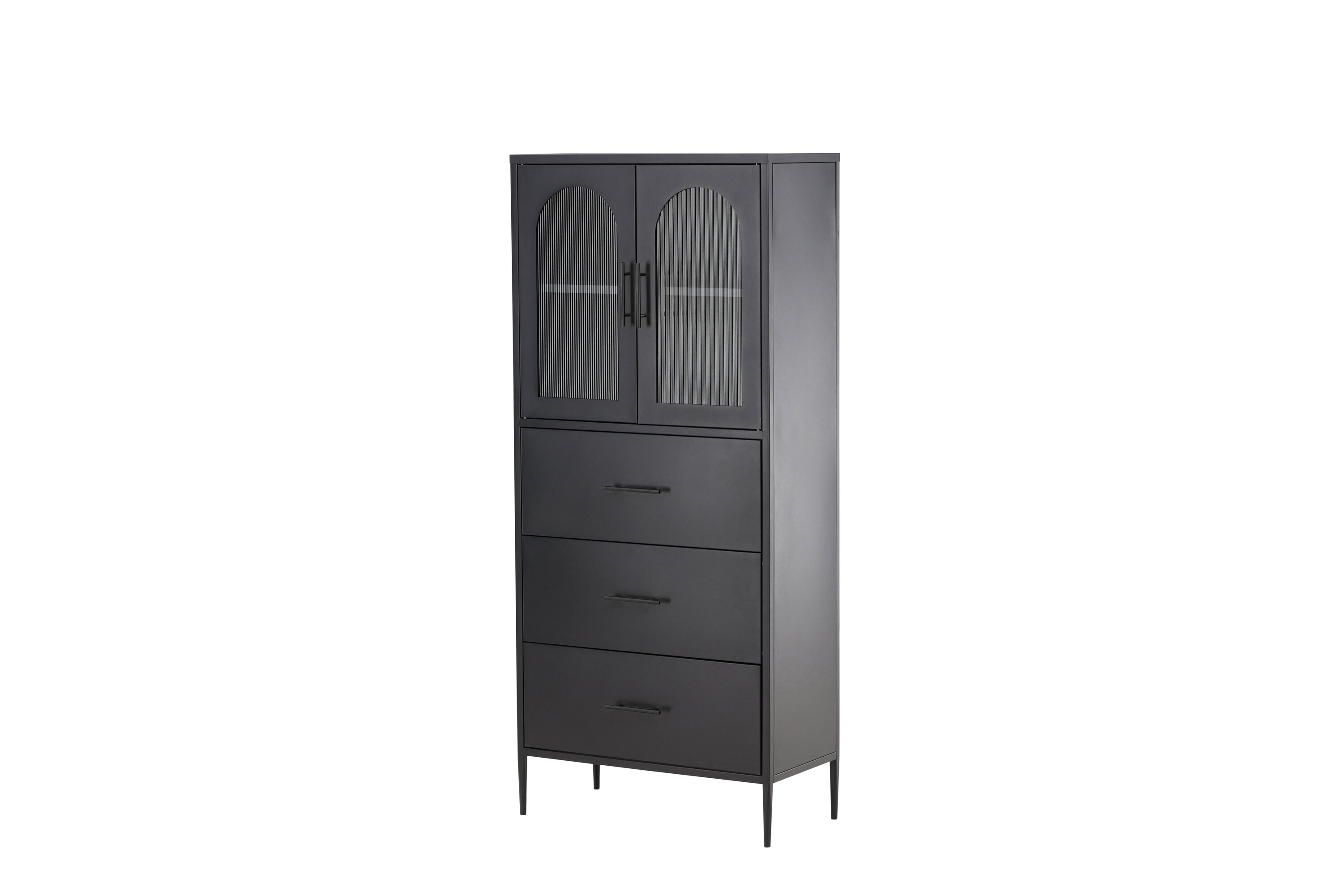 Der stattliche Aufbewahrungsschrank in schwarzem Farbton – Lassen Sie uns La Paz vorstellen! Dieser schwarze pulverbeschichtete Schrank verbindet auf wunderbare Weise Eleganz mit Funktionalität. Die messingfarbenen Griffe verleihen der Oberfläche des Schranks einen subtilen Hauch von Luxus und ziehen sofort Ihre Aufmerksamkeit auf sich.
