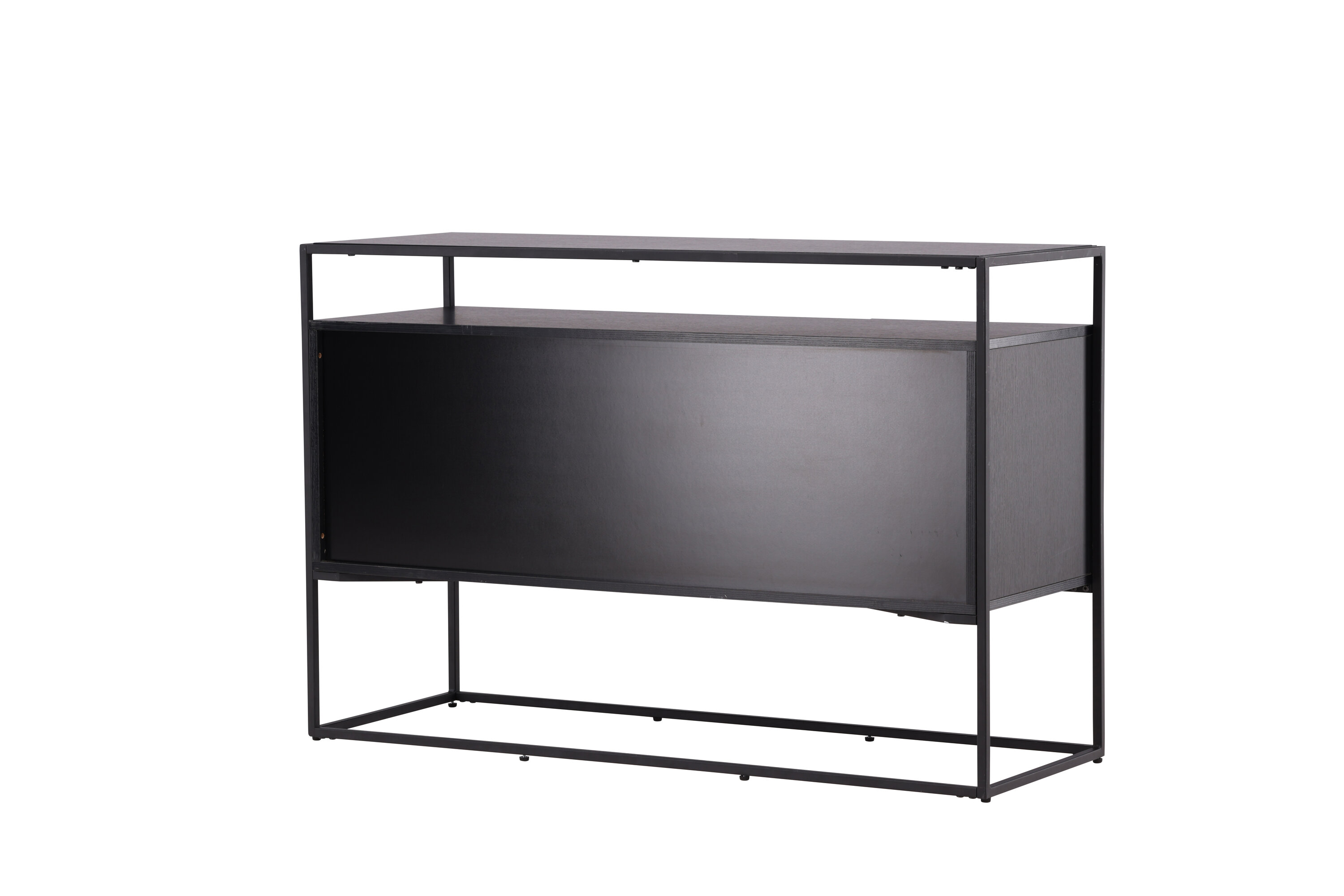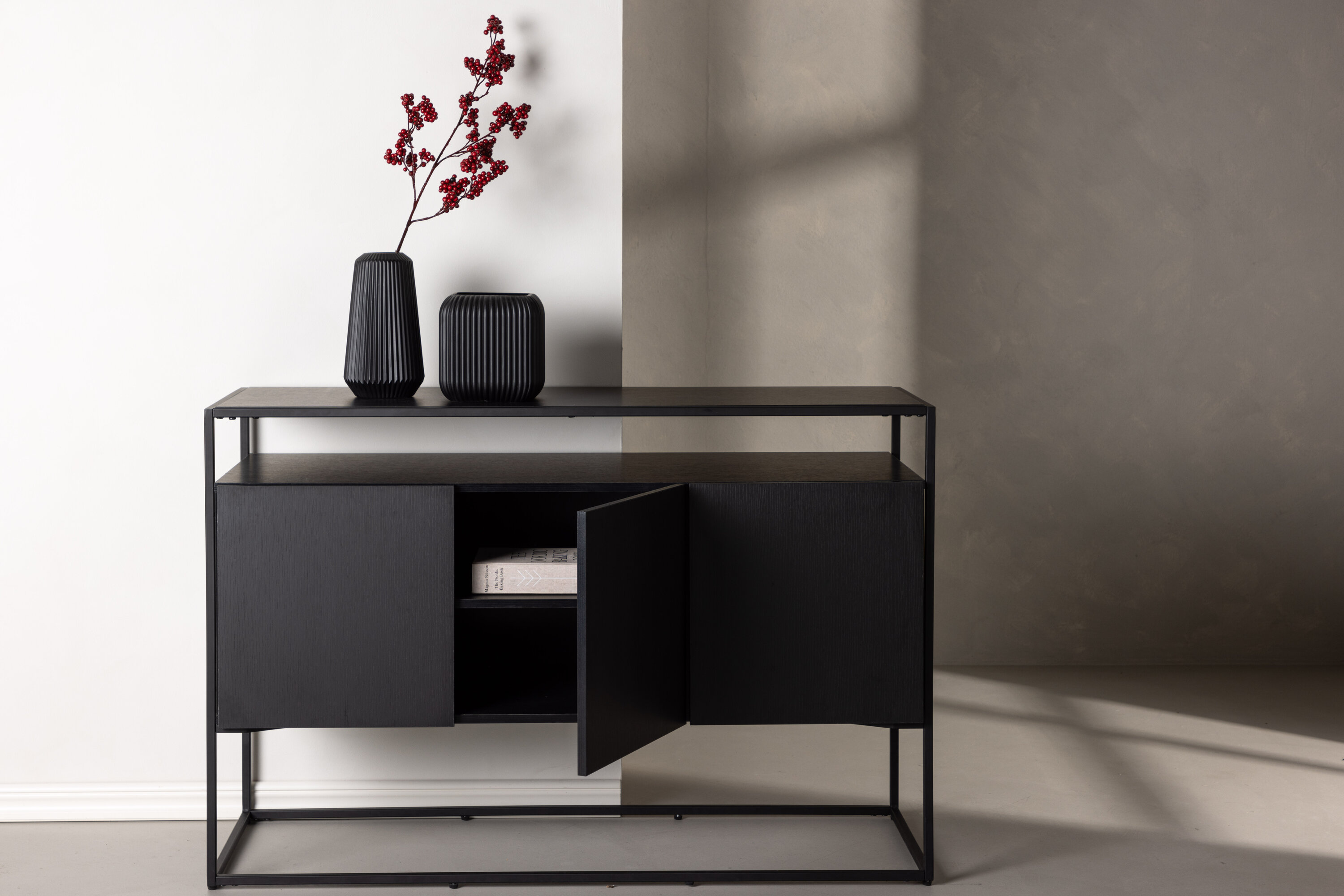 Der Relieftisch Kingsport ermöglicht sowohl versteckte als auch sichtbare Aufbewahrung und ist so praktisch wie stilvoll! Dank der großzügigen Größe und der drei Regale ist es geräumig und bietet Platz für alle Arten von Stauraum, der elegant und stilvoll platziert werden muss. Aus schwarzem MDF mit schwarzem Rahmenrahmen in Stahl. Der minimalistische Rahmen vermittelt einen stilvollen Eindruck und ermöglicht zudem ein einfaches Staubsaugen. Verlassen Sie die Tischplatte mit schönen Dekorationen und Leuchtern und füllen Sie das Büro mit allem, was Ihnen passt!