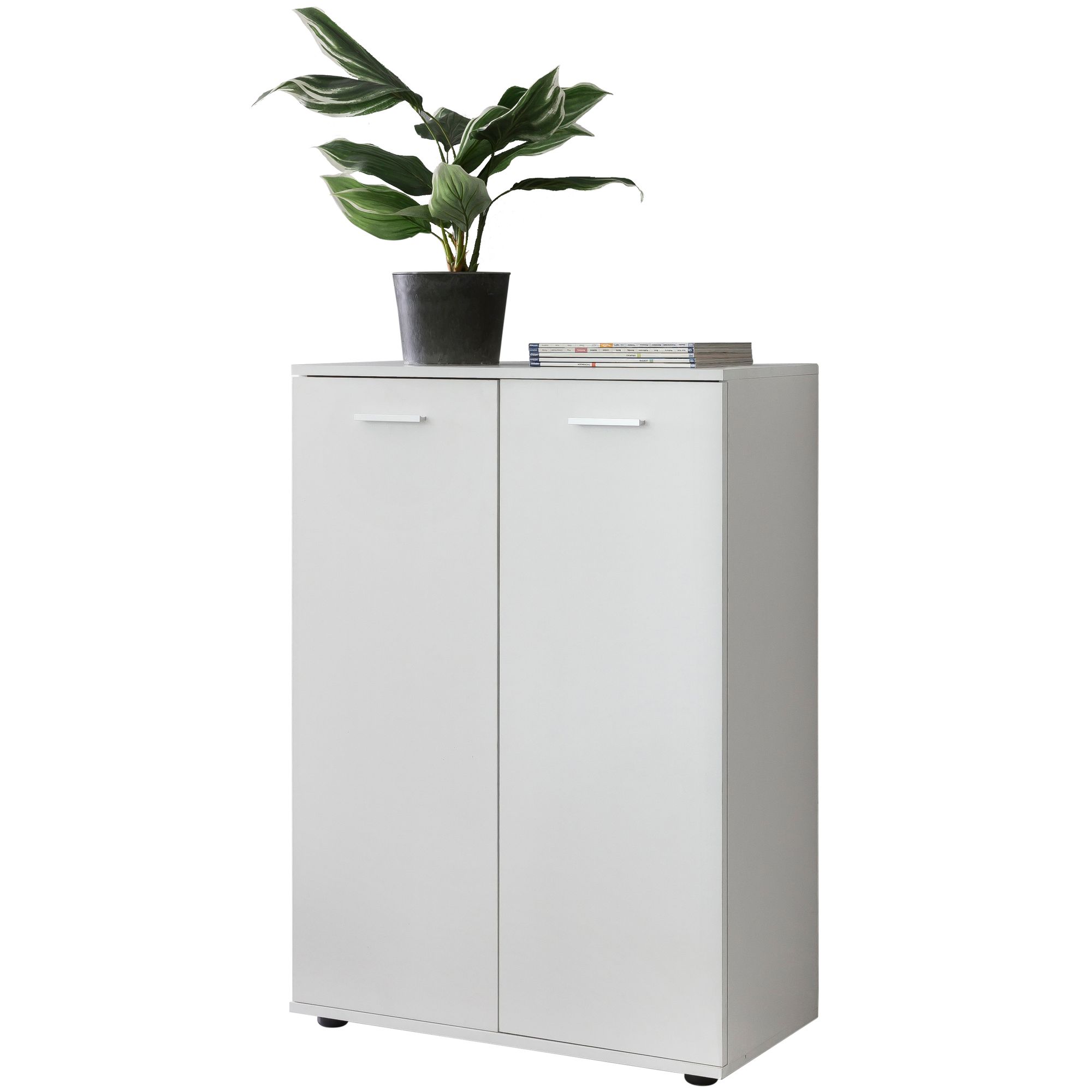 Diese mattweiße Holzkommode vereint modernes Design und Funktionalität für optimale Aufbewahrung. Mit zwei eleganten Türen und drei geräumigen Ablagen passt sie perfekt in kleine Räume.