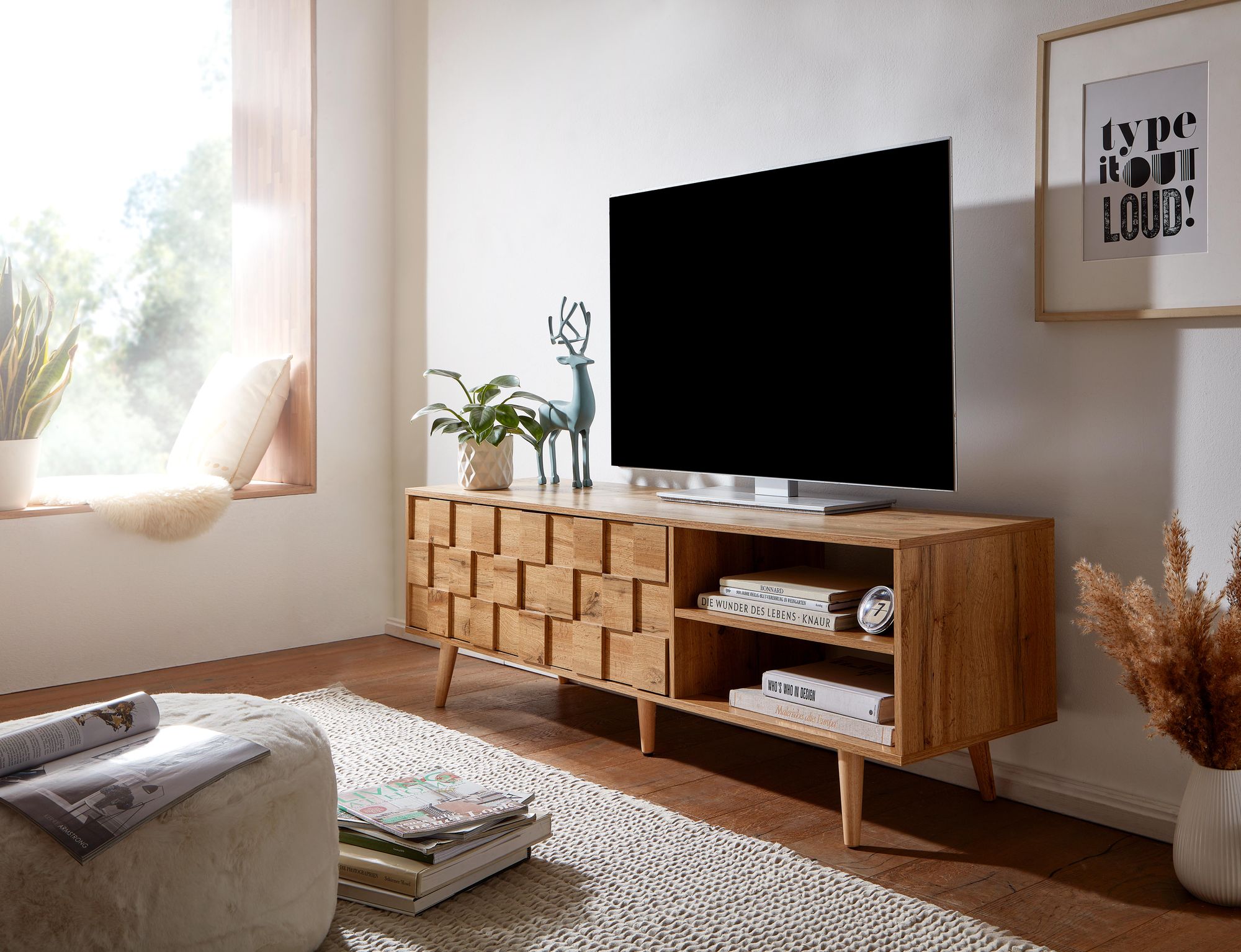 Moderner Lowboard mit Eiche-Dekor und ansprechendem Kachelmuster auf den Türen. Die rechteckige Ablagefläche bietet viel Platz für Fernseher bis 70 Zoll. Die Türen sind mit Push-to-open-Funktion für ein griffloses Öffnen ausgestattet. Zwei offene Fächer für Konsolen und zwei geschlossene Fächer ideal für Spiele und DVDs.