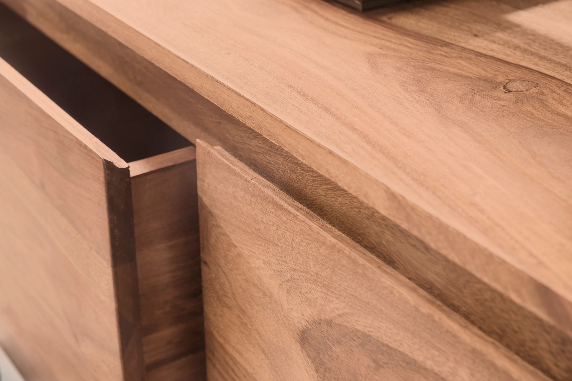 Das Lowboard besteht aus massivem Akazienholz und besticht durch seine natürliche Oberfläche mit einzigartiger Maserung. Die großzügige Ablagefläche von 140 cm Breite eignet sich für Fernseher fast aller Größen. Es verfügt über zwei offene Fächer, eine Tür und eine Schublade mit Schubladenstopp.