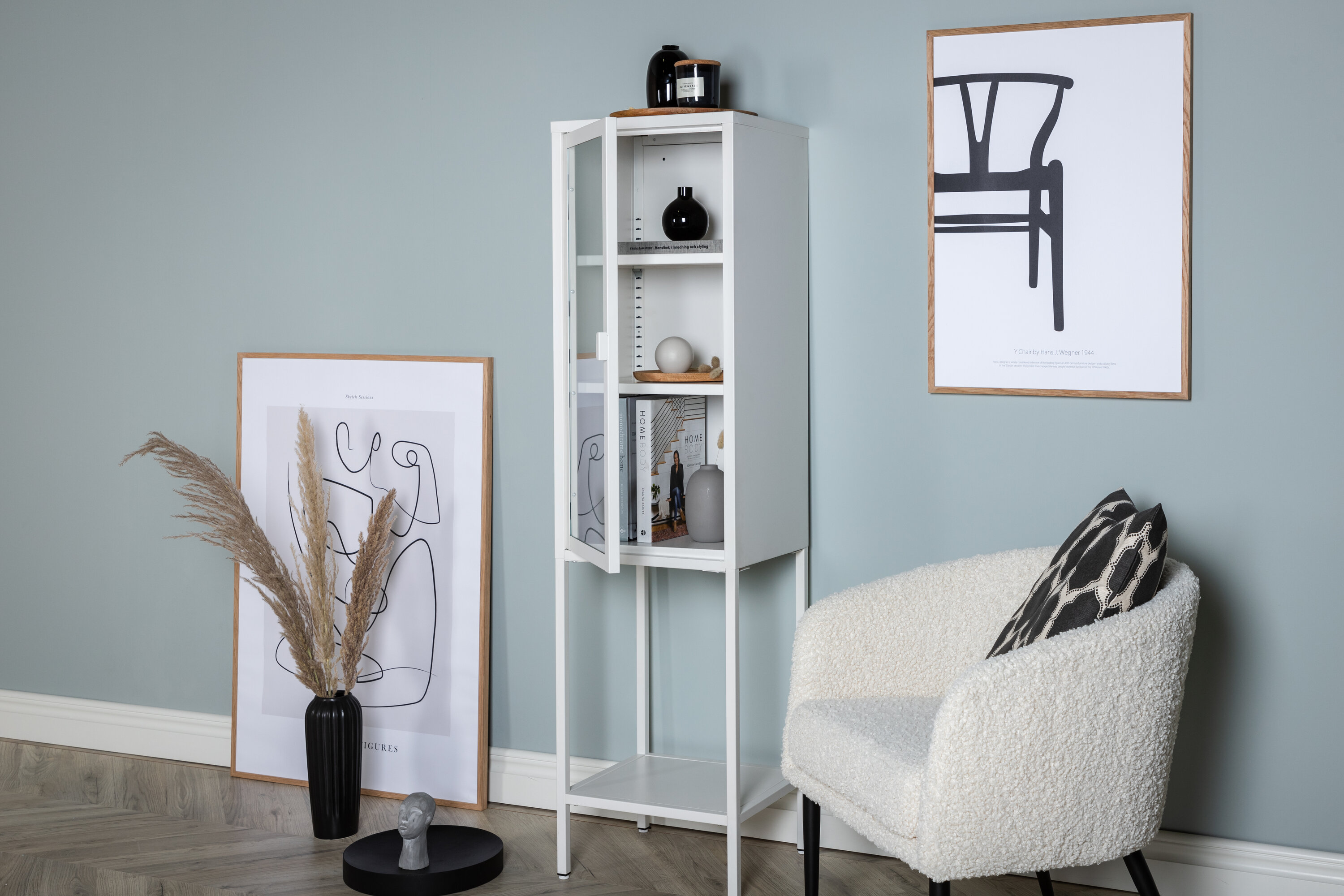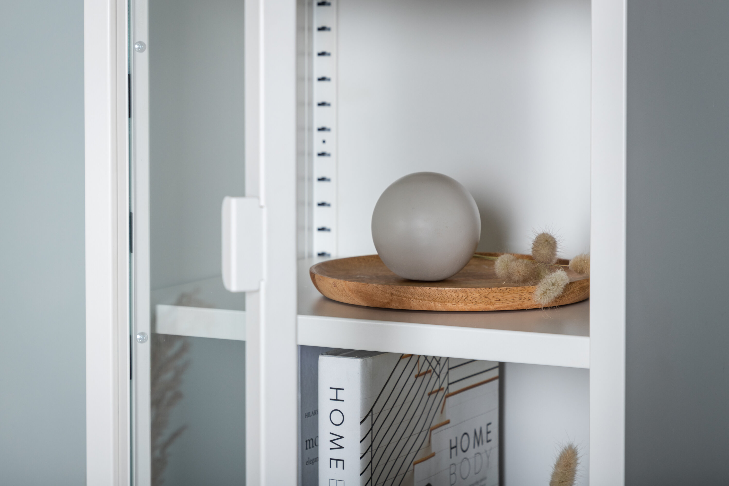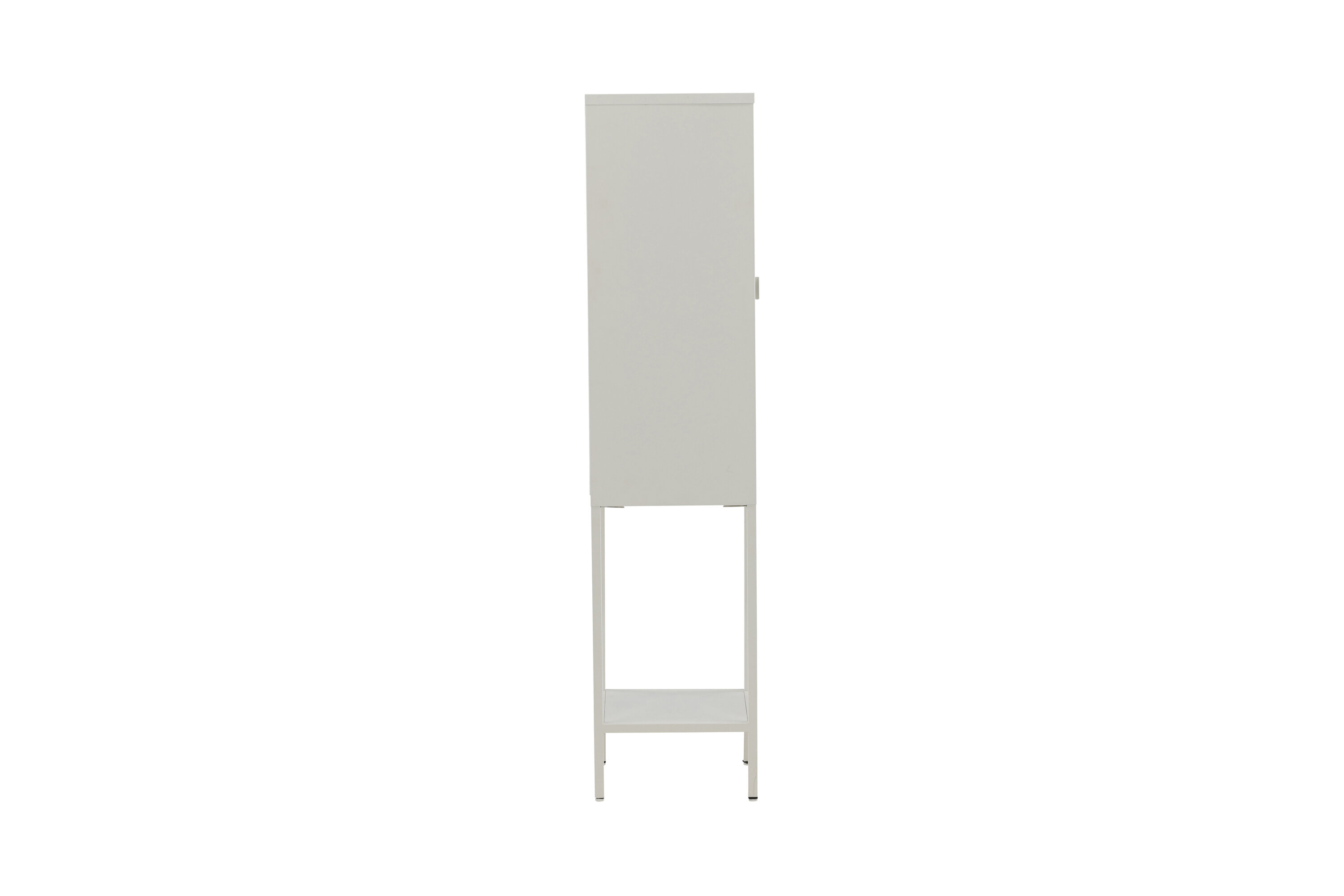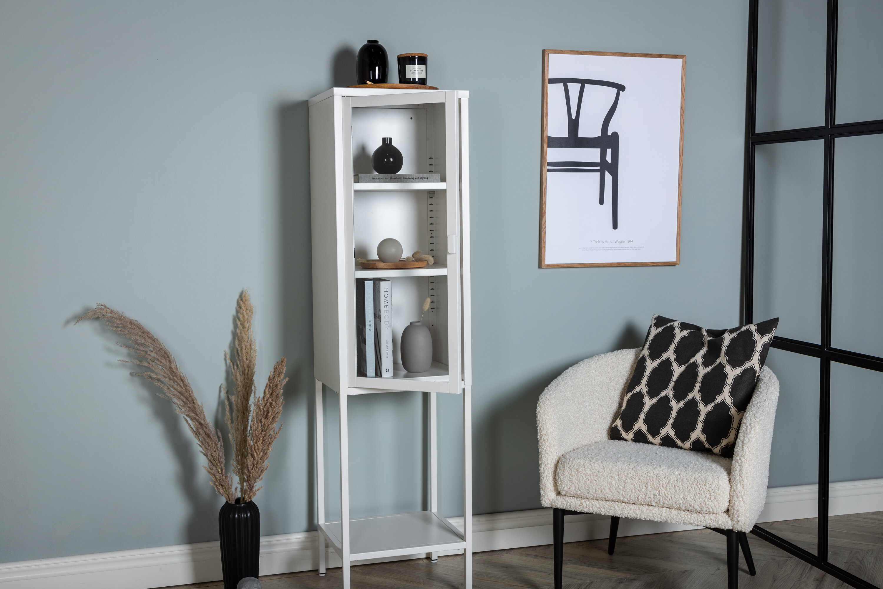 Bettlakenschränke sind eine beliebte und praktische Ergänzung des Interieurs! Dieser Schrank der Serie Misha hat eine stattliche Höhe mit einem Ganzen im modernen Industriedesign, aus pulverbeschichtetem weißem Stahl mit einer Glastür. Das Glas lässt schönes Licht in den Schrank und hebt alles, womit man ihn füllt, wunderschön hervor. Es gibt drei intelligente Reliefoberflächen, die zum Aufbewahren von Porzellan, Büchern oder zum Dekorieren mit schönen Innendetails verwendet werden können. Maße: Länge: 40,5 cm, Breite: 35 cm, Höhe: 150 cm. Leichtere Montage ist erforderlich.
