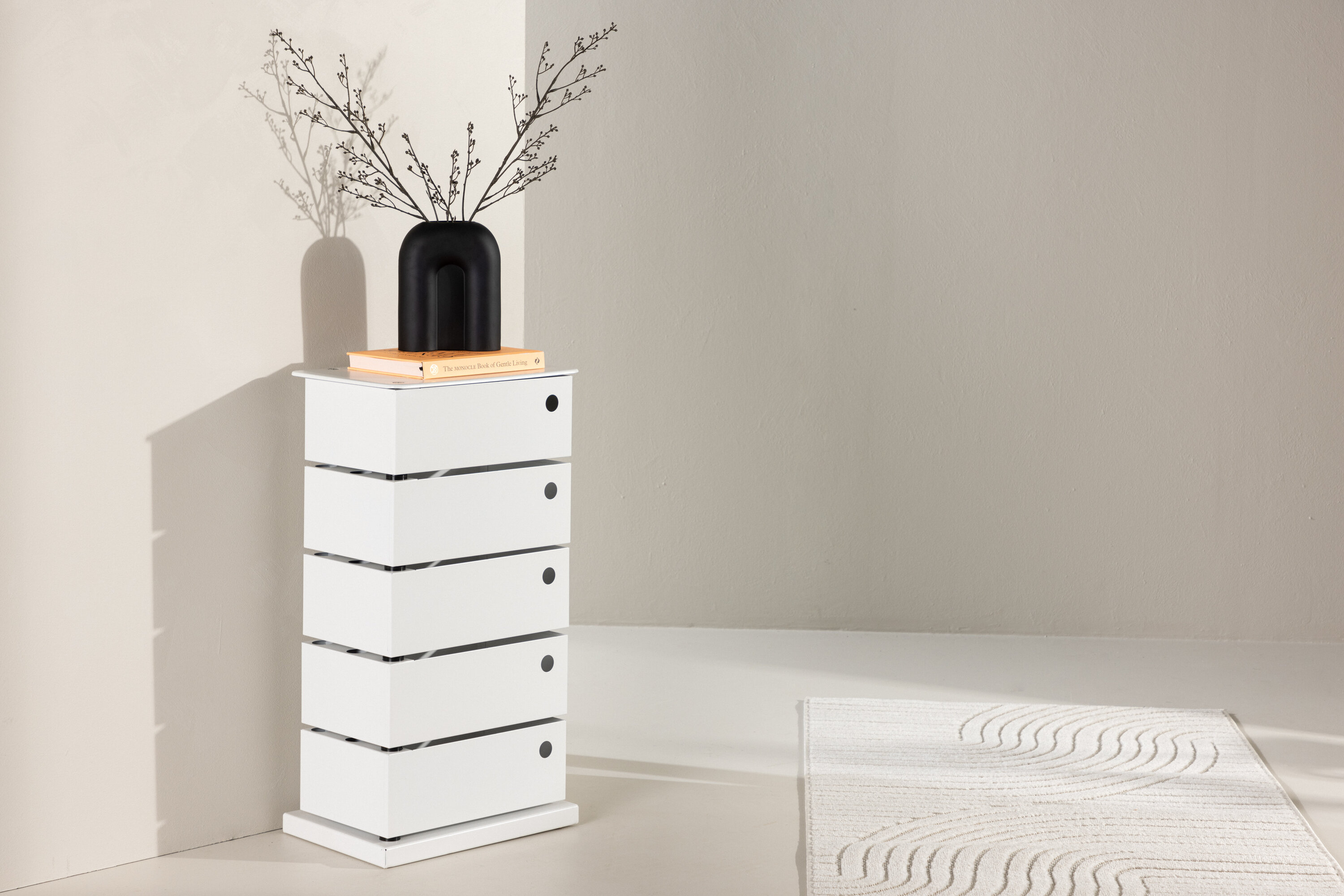 Mit seinen vier Ablageschubladen bietet das San Carlos viel Platz, um Ihr Zuhause zu organisieren. Was diese Kommode einzigartig macht, ist, dass sich die Schubladen in entgegengesetzte Richtungen öffnen und ihrem Design eine elegante Asymmetrie und eine spielerische Note verleihen. Diese clevere Funktion erleichtert den Zugriff auf Ihre Habseligkeiten aus verschiedenen Blickwinkeln und schafft eine interessante visuelle Dynamik. Sein modernes und minimalistisches Design passt perfekt in jeden Raum und hilft Ihnen, den Raum mit Stil zu optimieren.