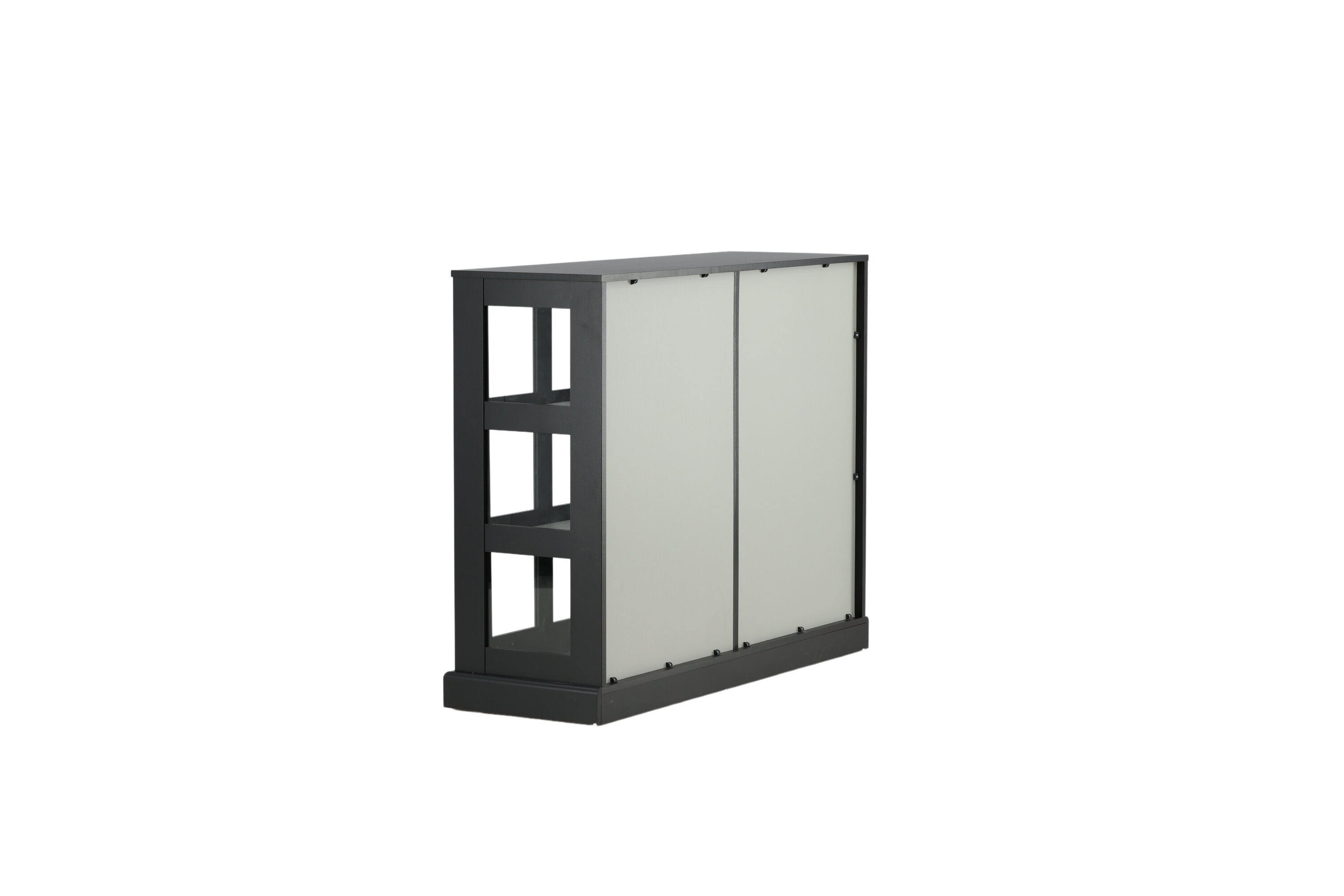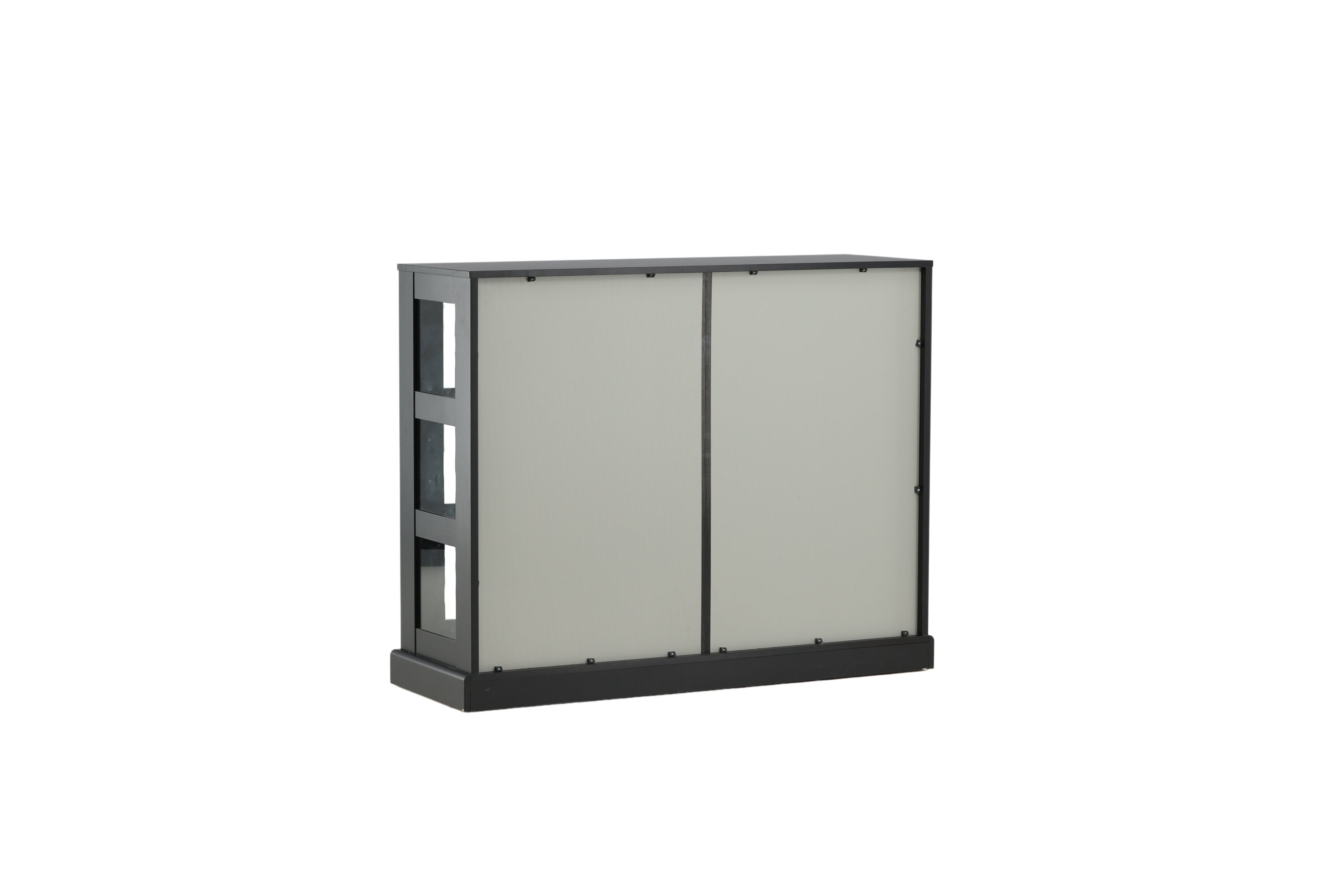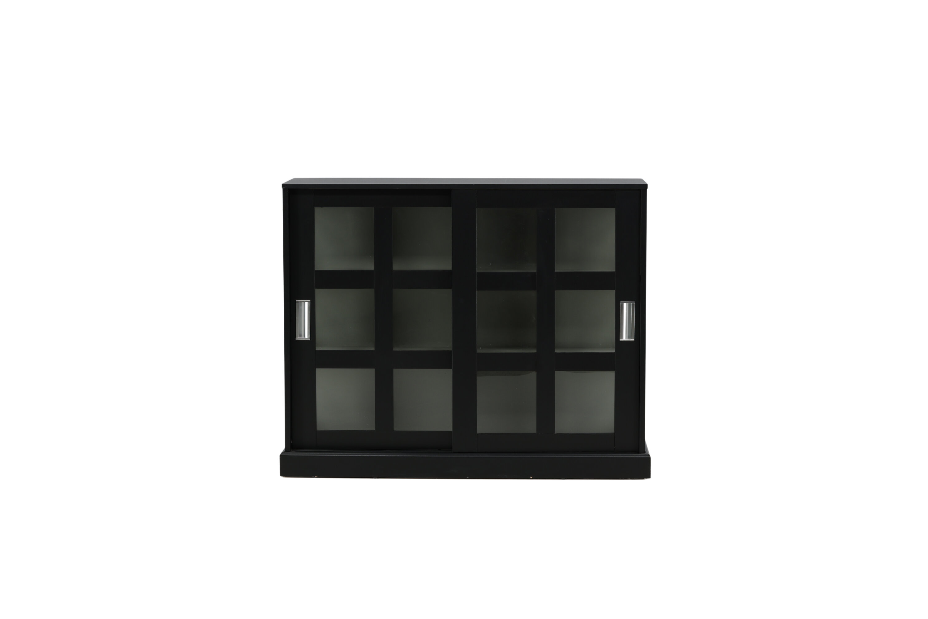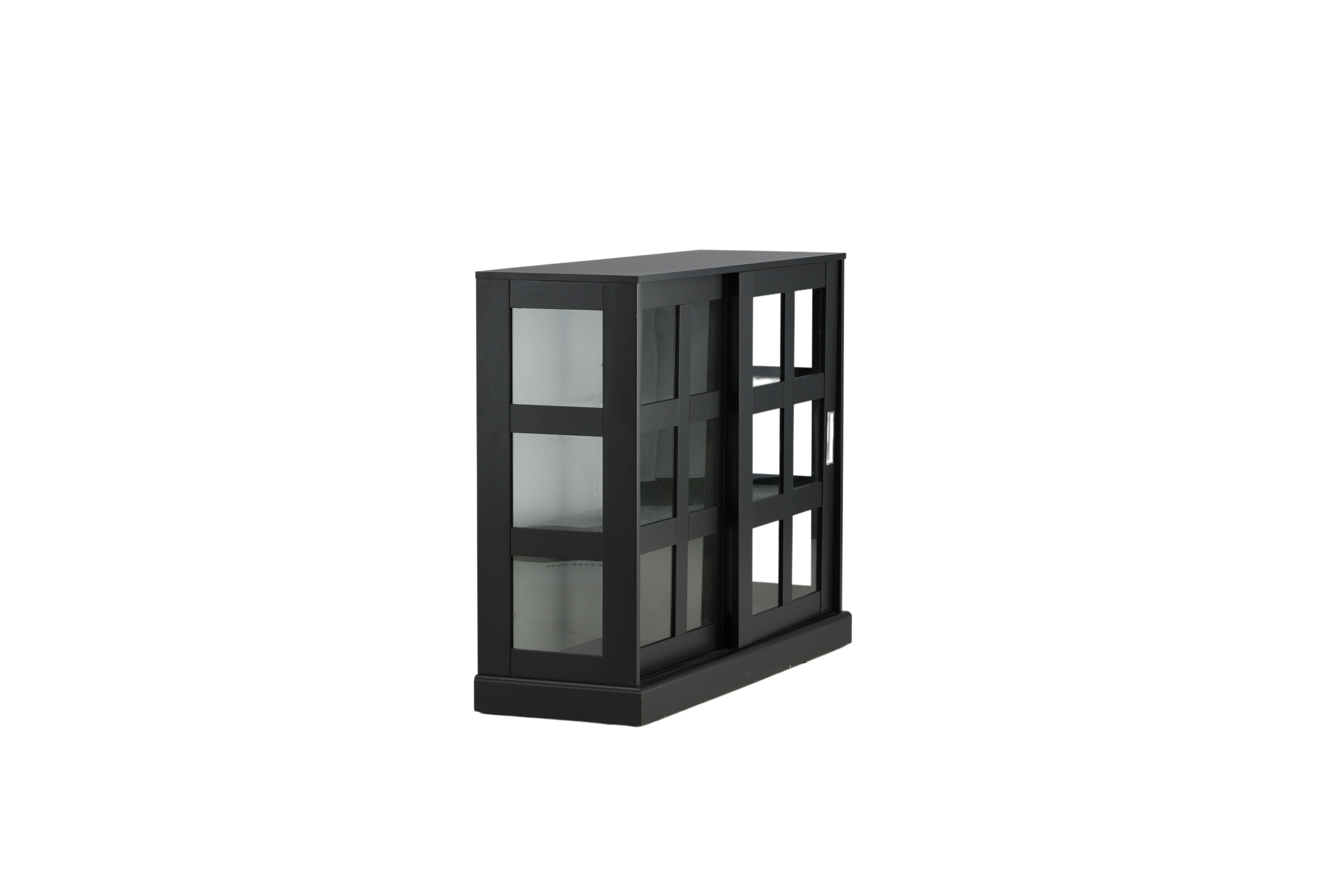 Deckel, in robustem Design ist ein eleganter und praktischer Reliefschrank. Der Schrank ist aus schwarzem MDF gefertigt und verfügt über zwei Glasschiebetüren mit Rahmen aus schwarzem MDF. Das durchdachte Gesamtdesign bietet Ihnen sowohl ein elegantes Aufbewahrungsmöbel als auch ein schönes Innendetail mit seinen trendigen quadratischen Glasfenstern und einem nützlichen Geschenk auf der Oberseite. Füllen und dekorieren Sie den Schrank mit Porzellan, schönen Vasen, Büchern oder anderen Gegenständen, die nicht gut verstaut sind. Leichtere Montage ist erforderlich.
