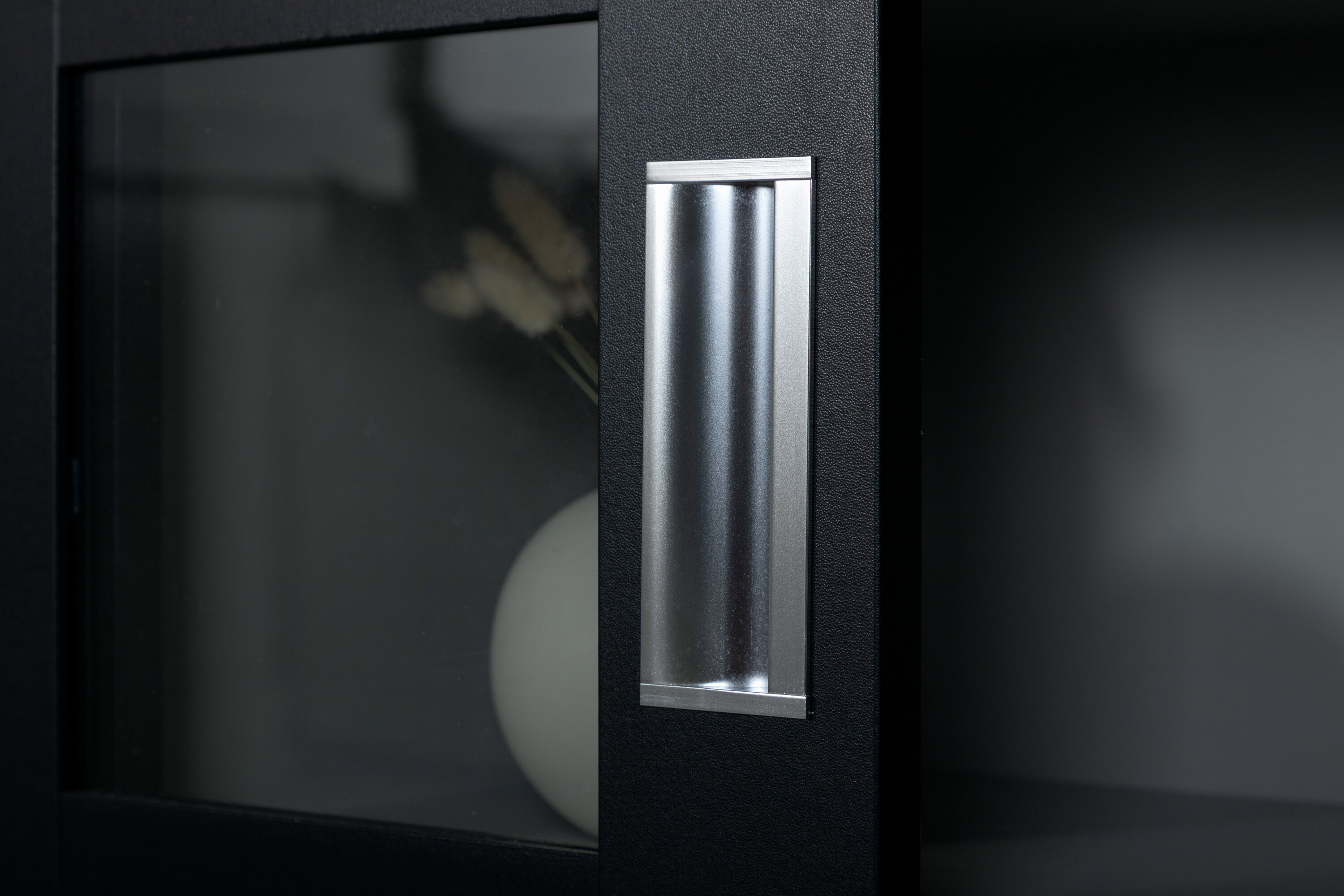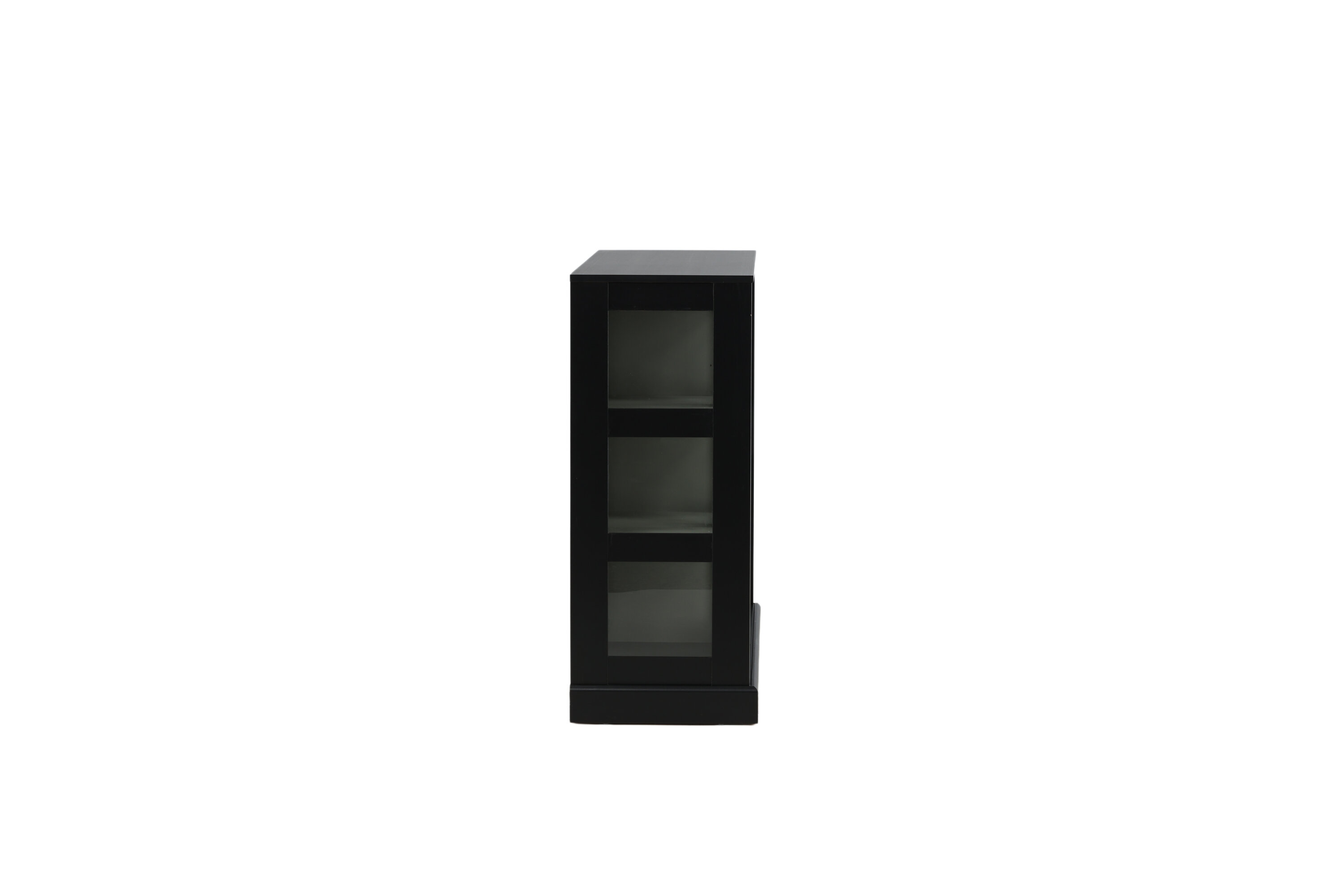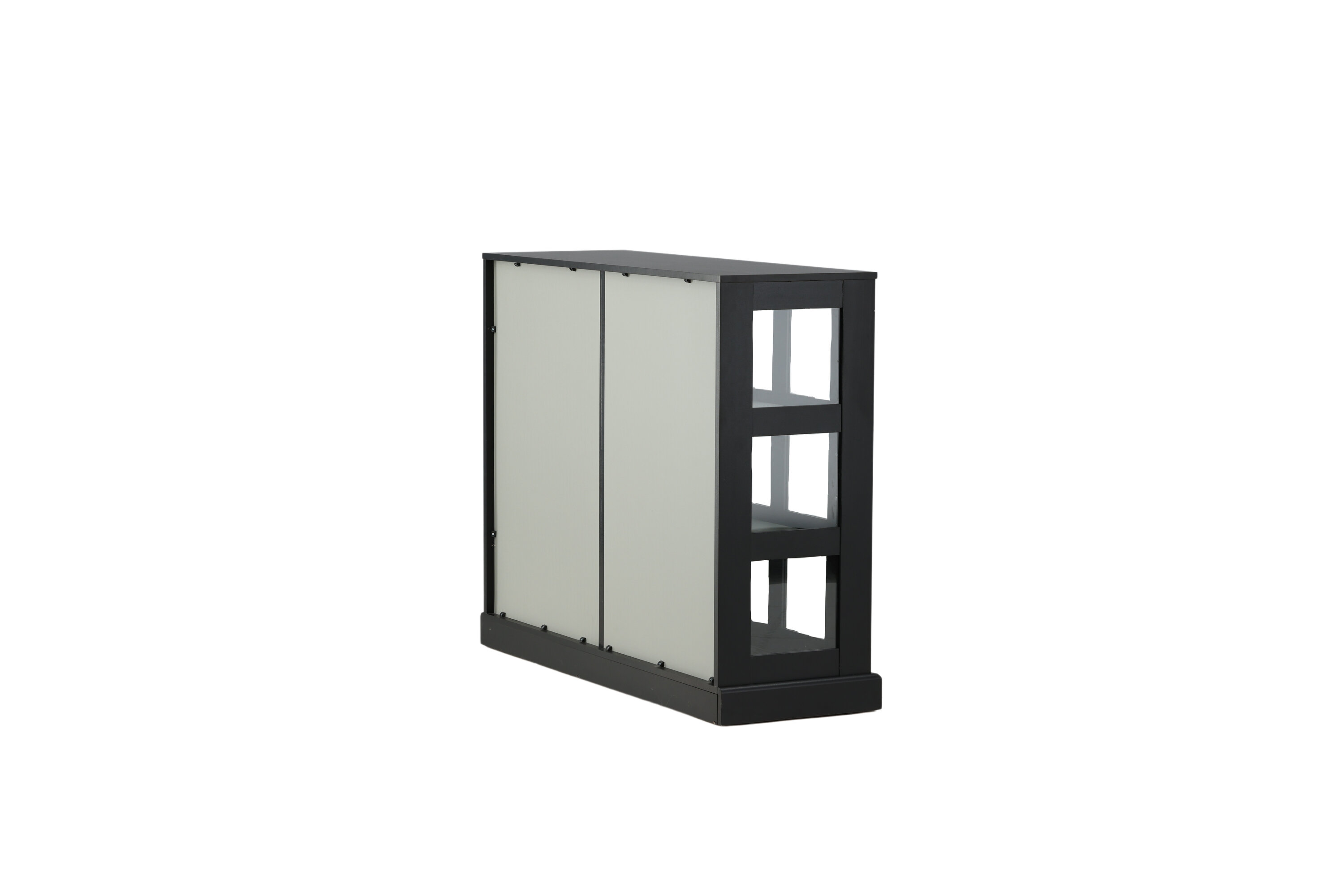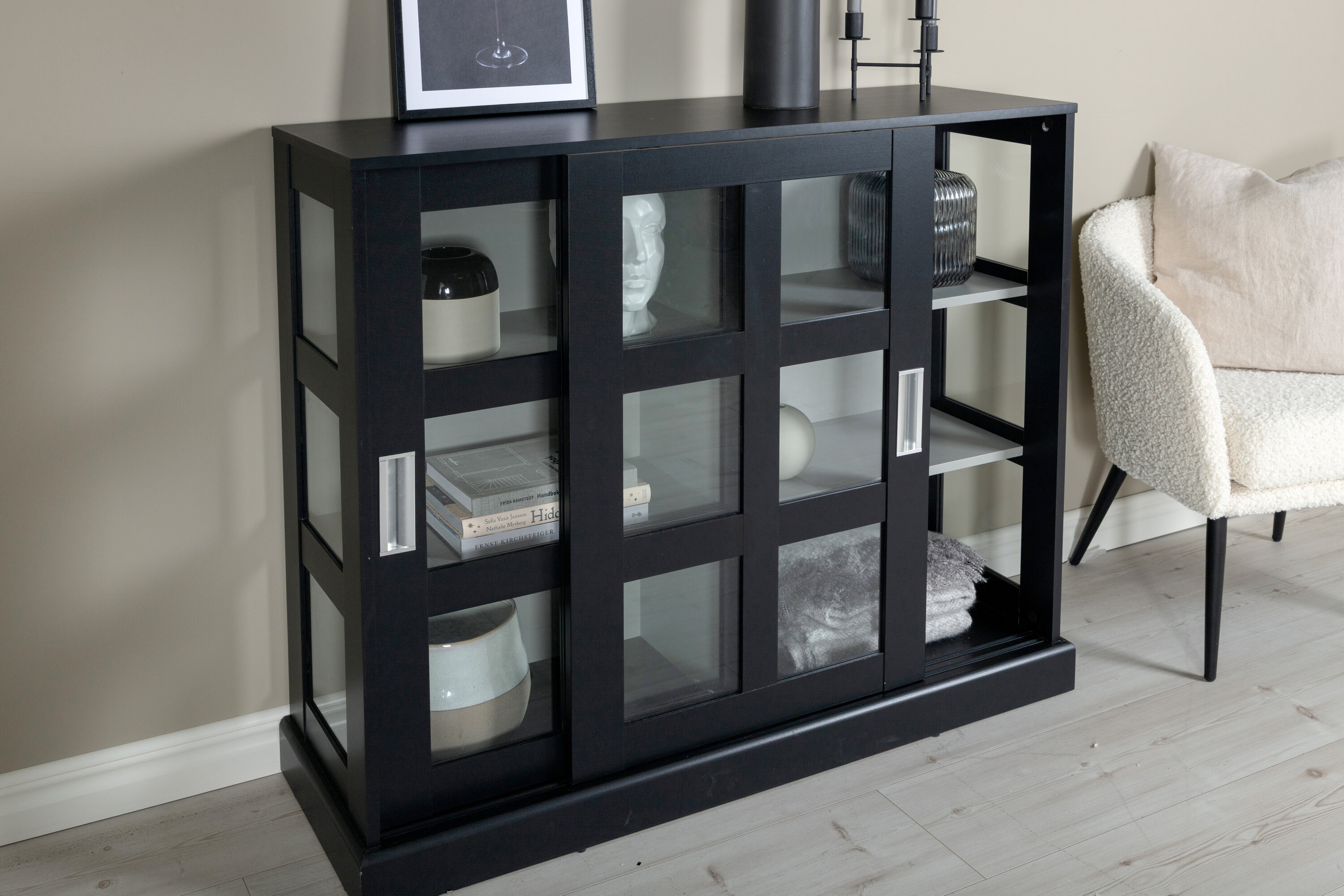 Deckel, in robustem Design ist ein eleganter und praktischer Reliefschrank. Der Schrank ist aus schwarzem MDF gefertigt und verfügt über zwei Glasschiebetüren mit Rahmen aus schwarzem MDF. Das durchdachte Gesamtdesign bietet Ihnen sowohl ein elegantes Aufbewahrungsmöbel als auch ein schönes Innendetail mit seinen trendigen quadratischen Glasfenstern und einem nützlichen Geschenk auf der Oberseite. Füllen und dekorieren Sie den Schrank mit Porzellan, schönen Vasen, Büchern oder anderen Gegenständen, die nicht gut verstaut sind. Leichtere Montage ist erforderlich.