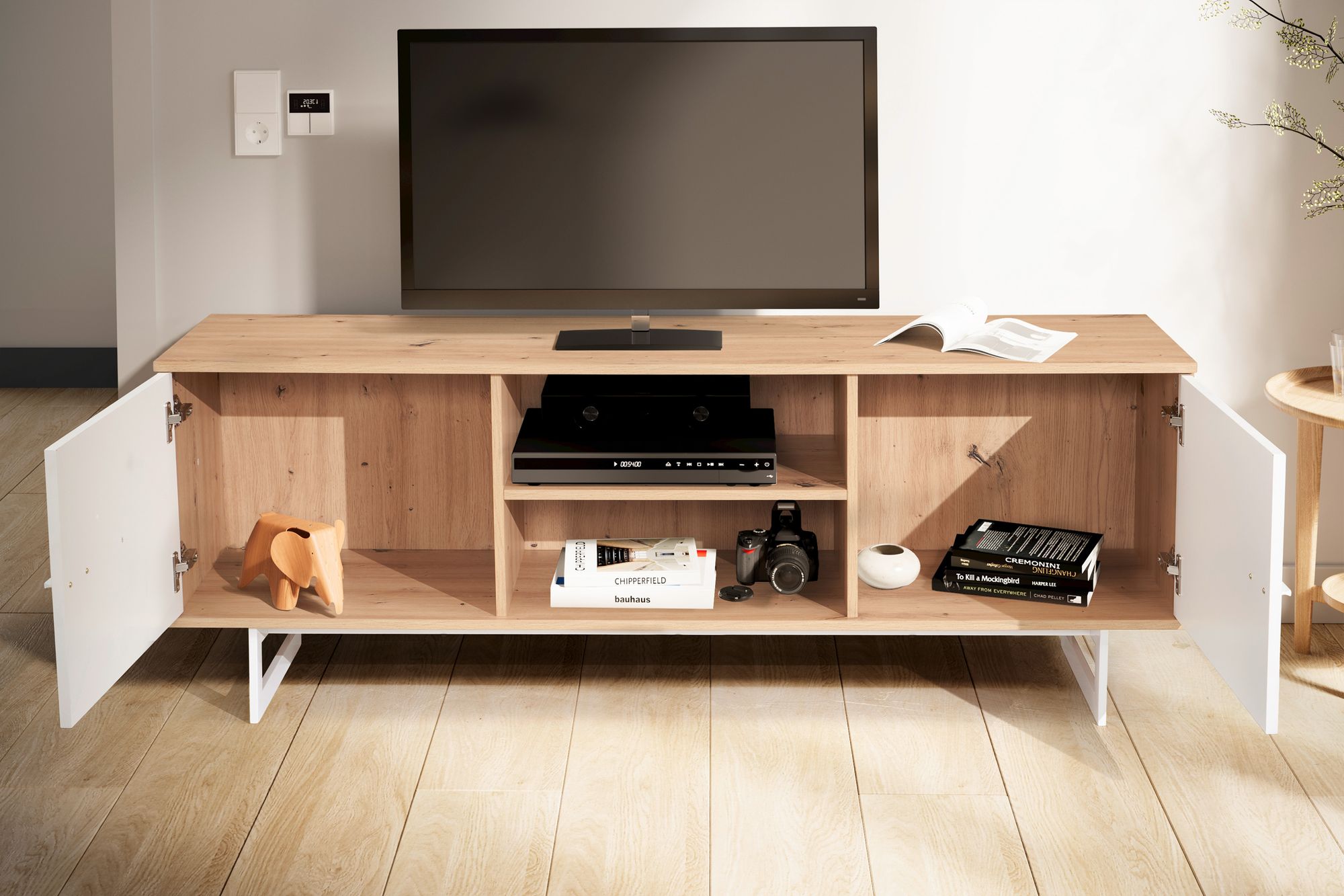Dieser moderne Lowboard kombiniert hellen Eiche-Dekor mit weißen Türen, Griffen und Beinen für ein helles und sauberes Aussehen. Die großzügige Ablagefläche trägt Fernseher bis zu 70 Zoll. Zwei geschlossene Türen und zwei offene Fächer bieten optimalen Stauraum für Konsolen, DVDs und Multimedia-Geräte.