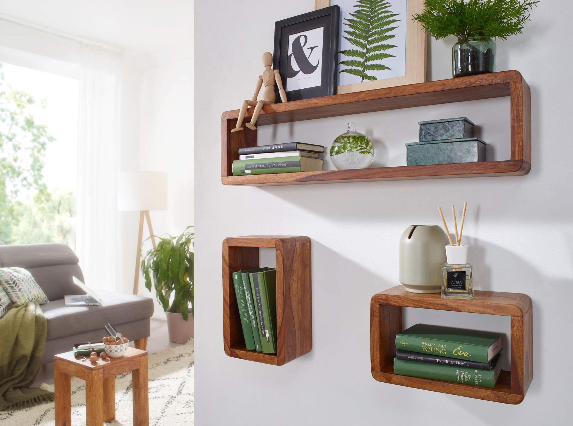 Design Wandregal 3er Set BOHA Massivholz Sheesham | Natur | 80x20x15 cm, 34x20x15 cm