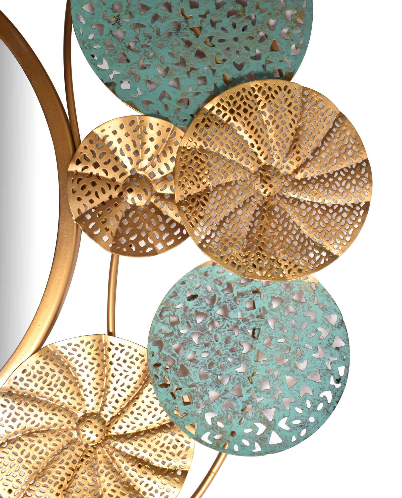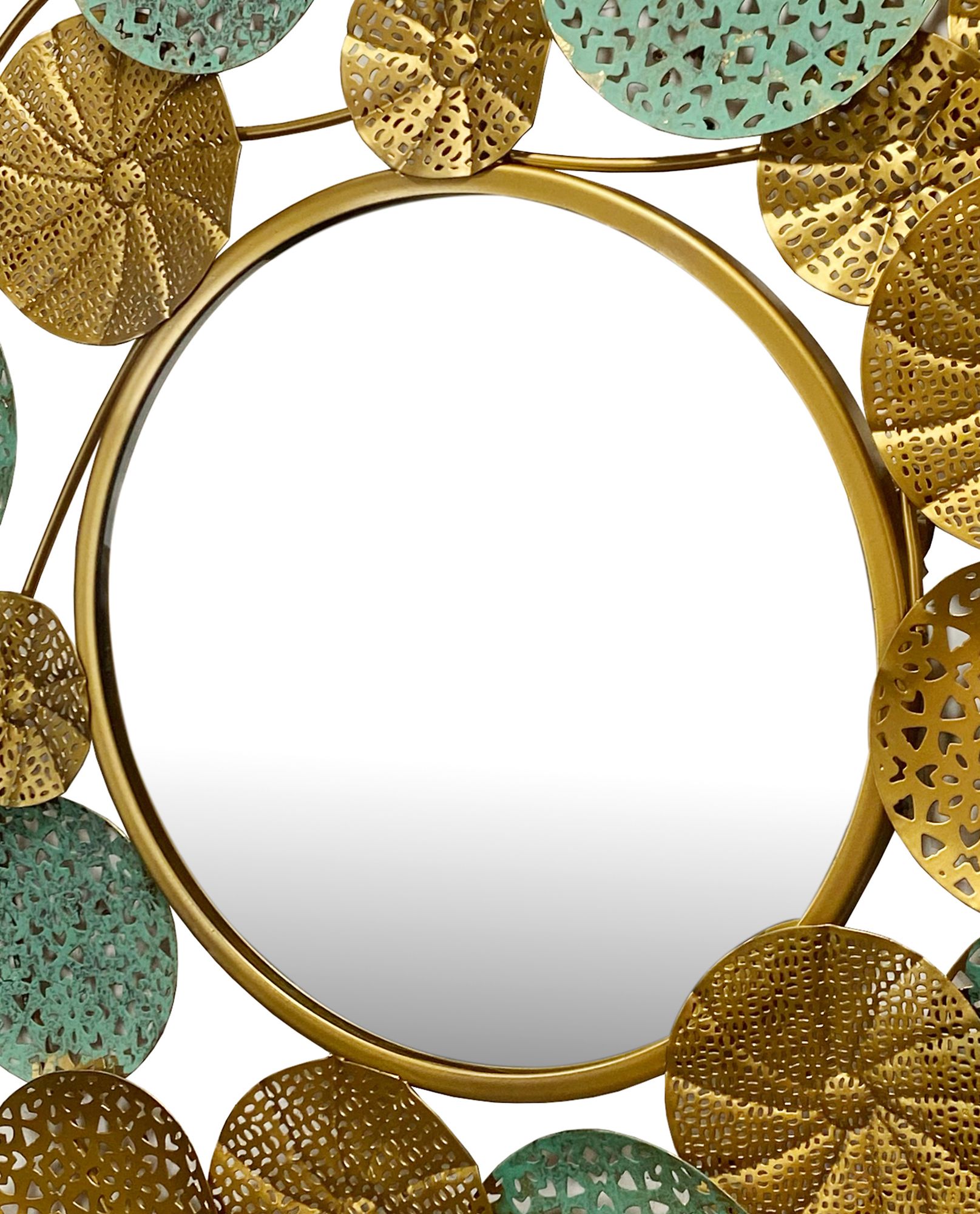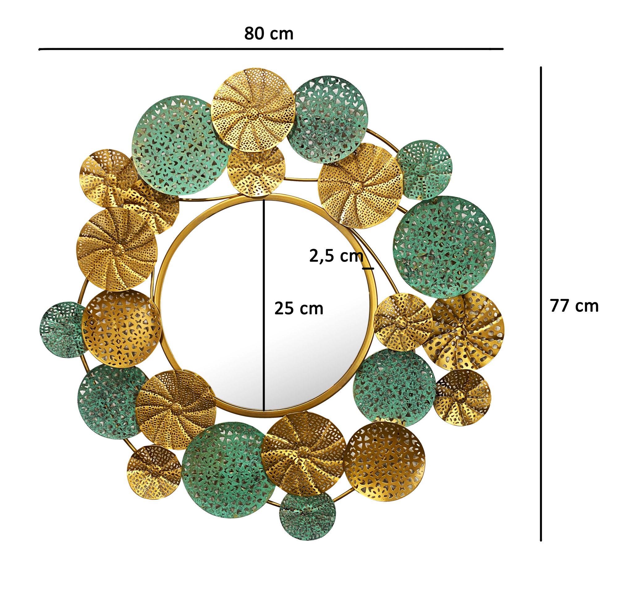 Setzen Sie Akzente mit diesem 80x77 cm großen runden Wandspiegel mit 25 cm Durchmesser und einem Rahmen aus lackiertem Eisen in Gold und grünem Patina-Farbton. Handgefertigt für eine kunstvolle Ausstrahlung.