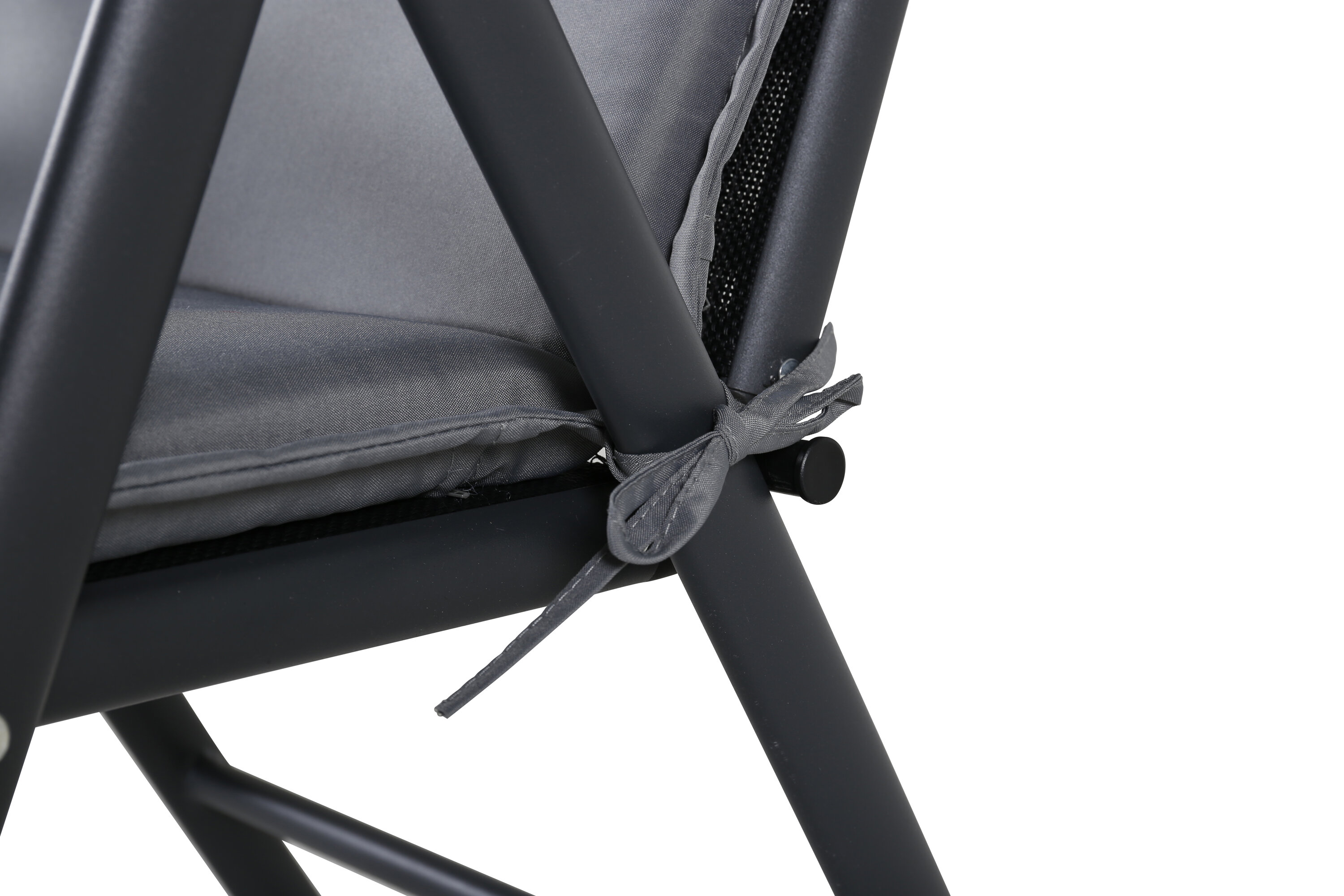 Klassisches und stilvolles schwarzes Positionspad mit Kissen und Riemen. Die Gurte helfen, das Kissen an Ort und Stelle zu halten. Genießen Sie Ihre schönen Sommertage!
