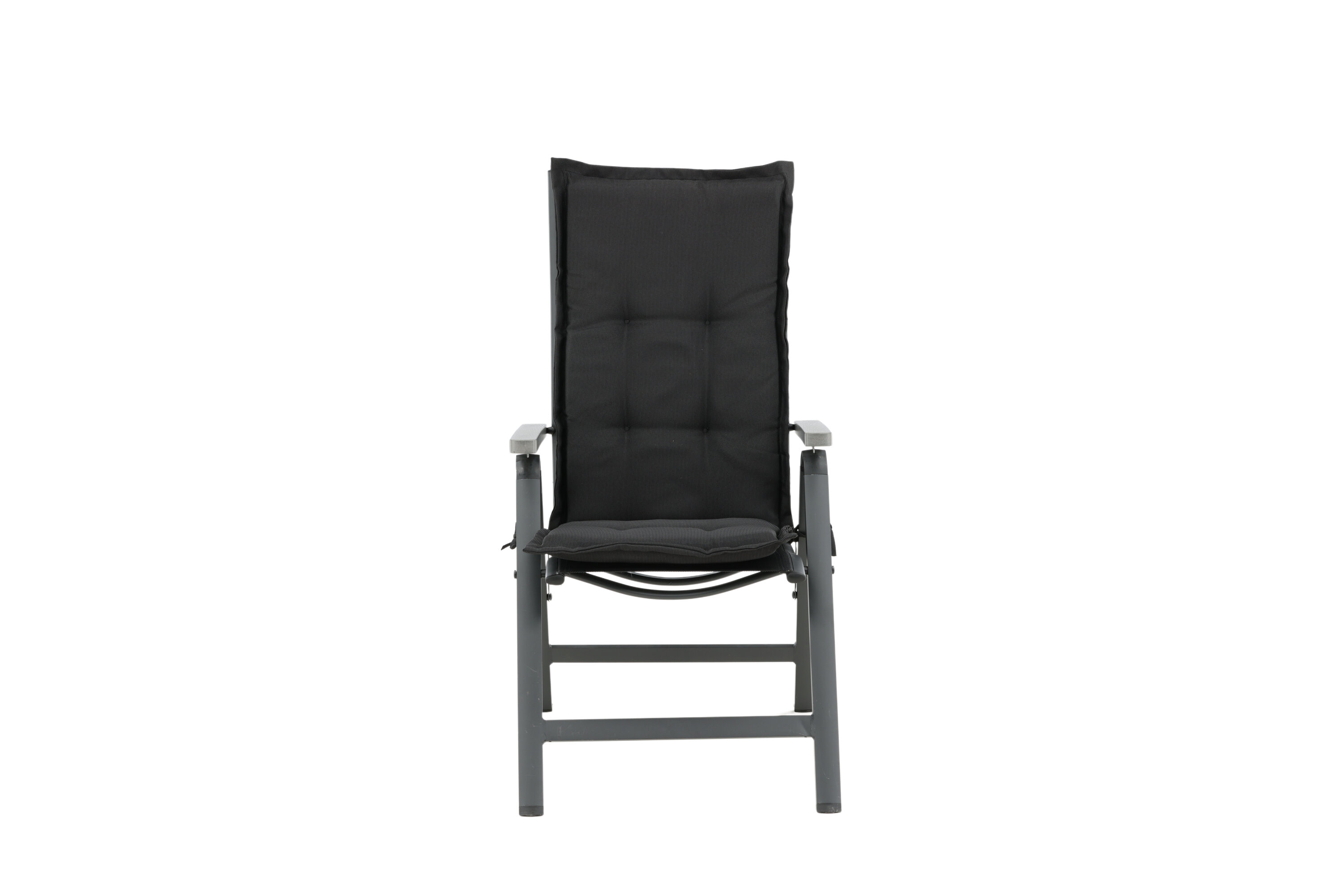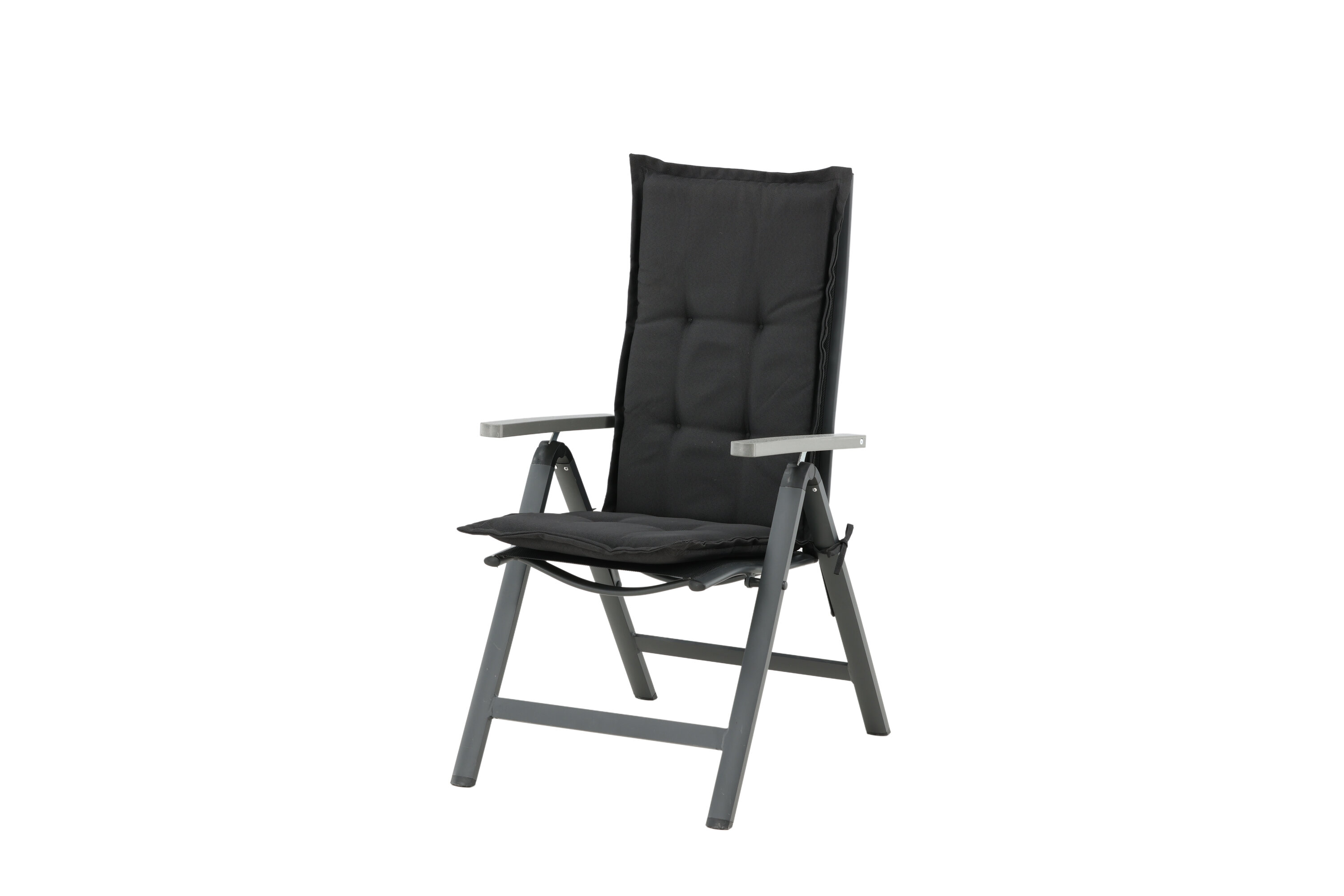 Schwarzes Stuhlkissen für unsere Klappstühle. Auf der Rückseite befinden sich zwei Anhänger, die dazu beitragen, dass das Pad richtig an Ort und Stelle bleibt.