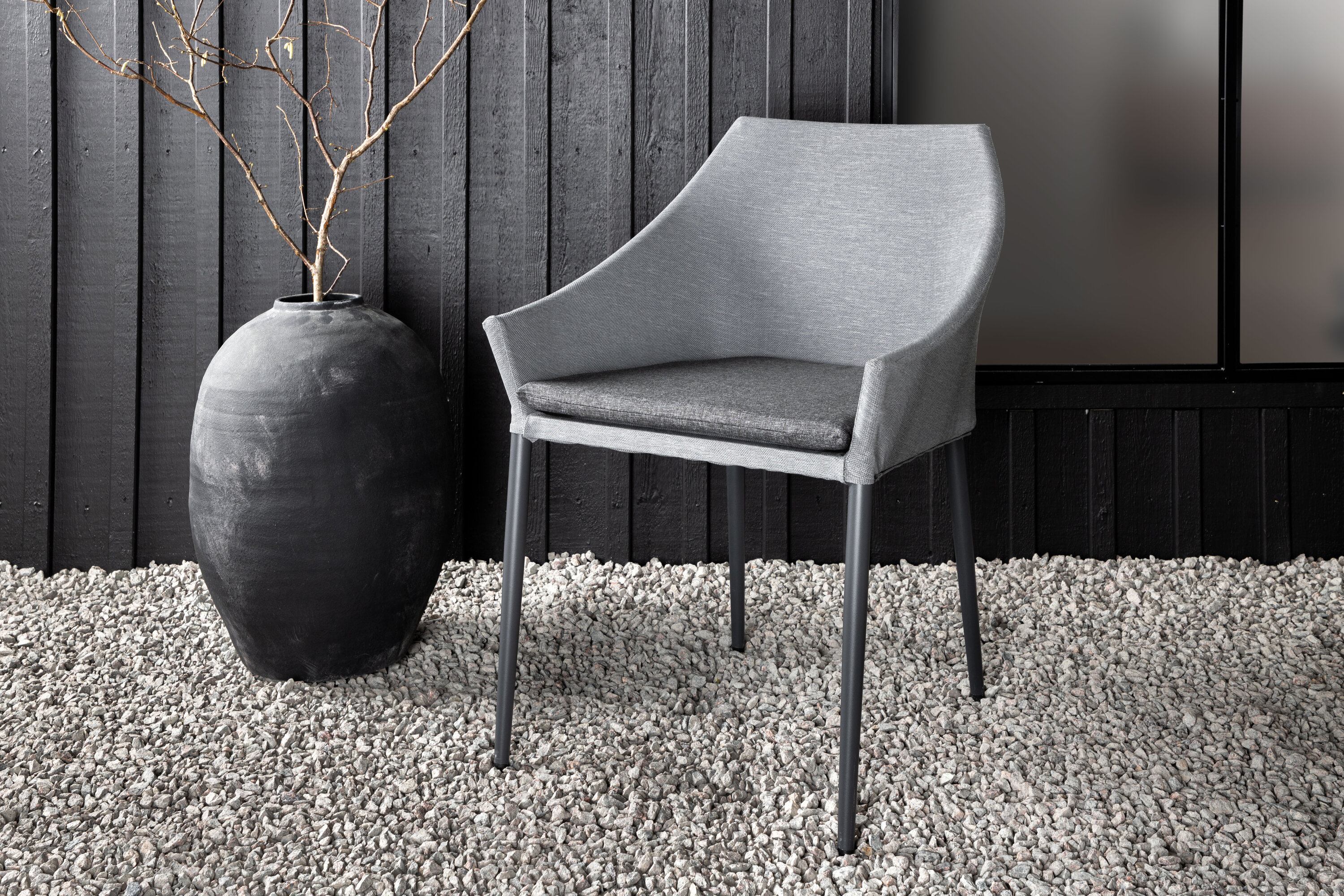 Ein geschmackvoller und bequemer Stuhl in Grau mit schwarzen Beinen, der perfekt zu allen Abendessen auf dem Balkon oder der Terrasse passt. Kombinieren Sie mit Ihrem Lieblingstisch und Sie sind bereit! Spoga hat ein zeitloses Design mit neutralen Farben, das eine lange Nutzung des Stuhls ermöglicht.