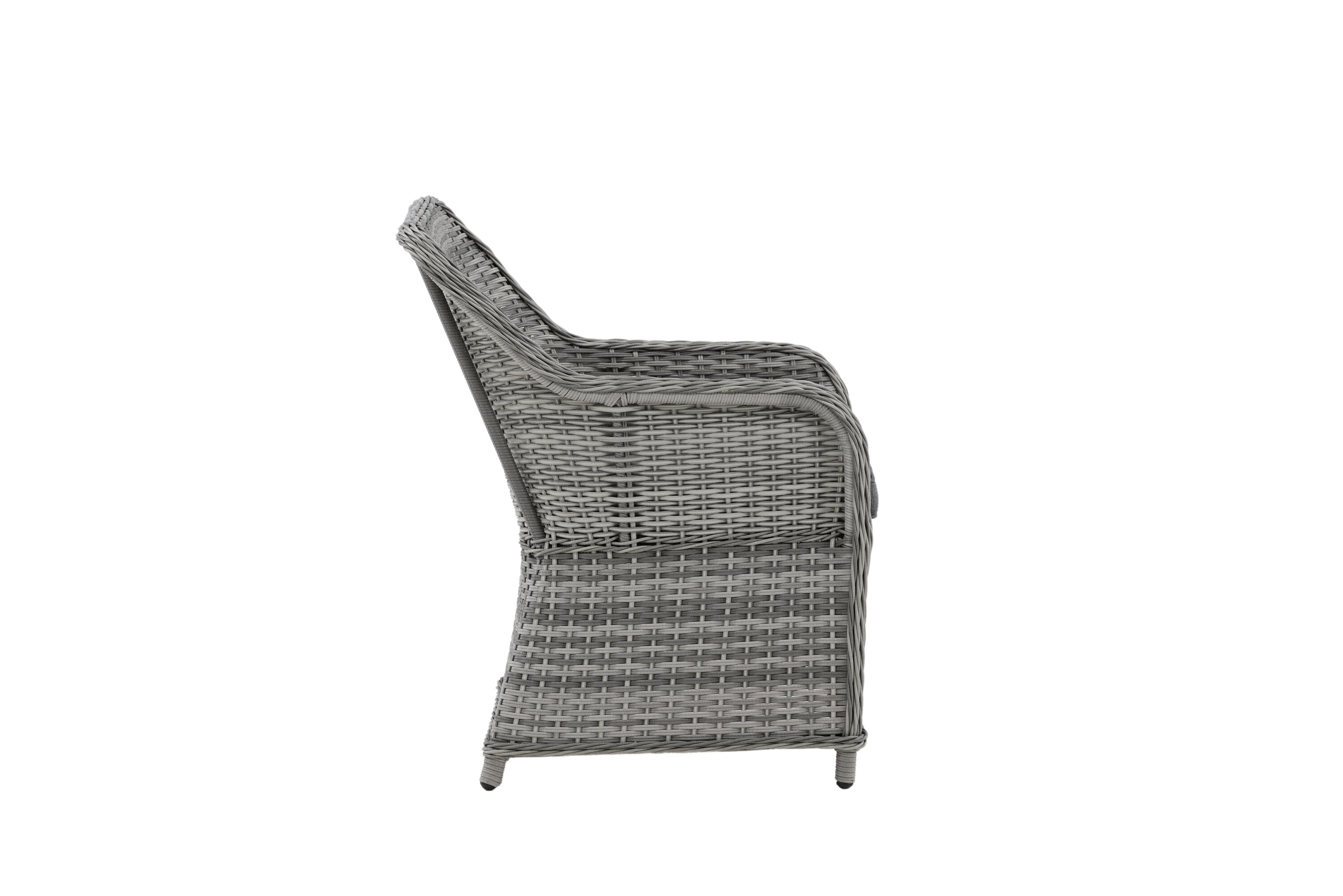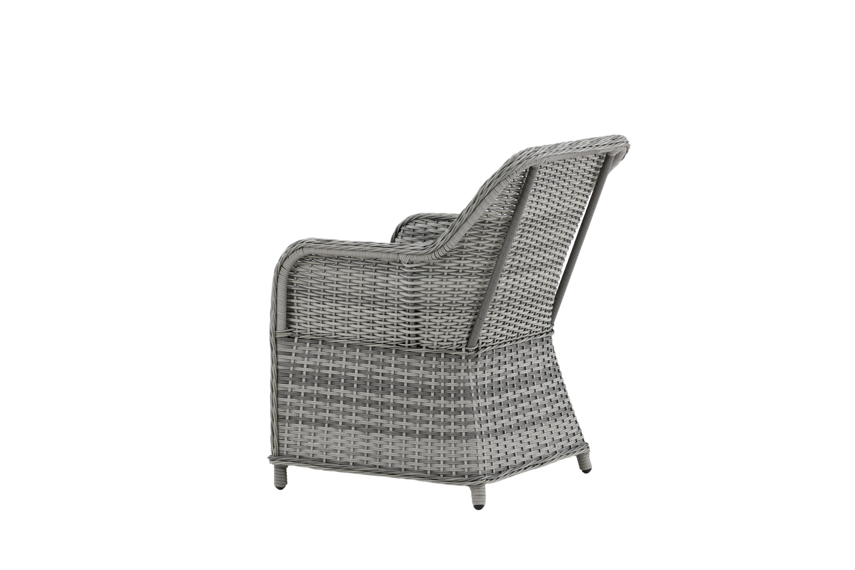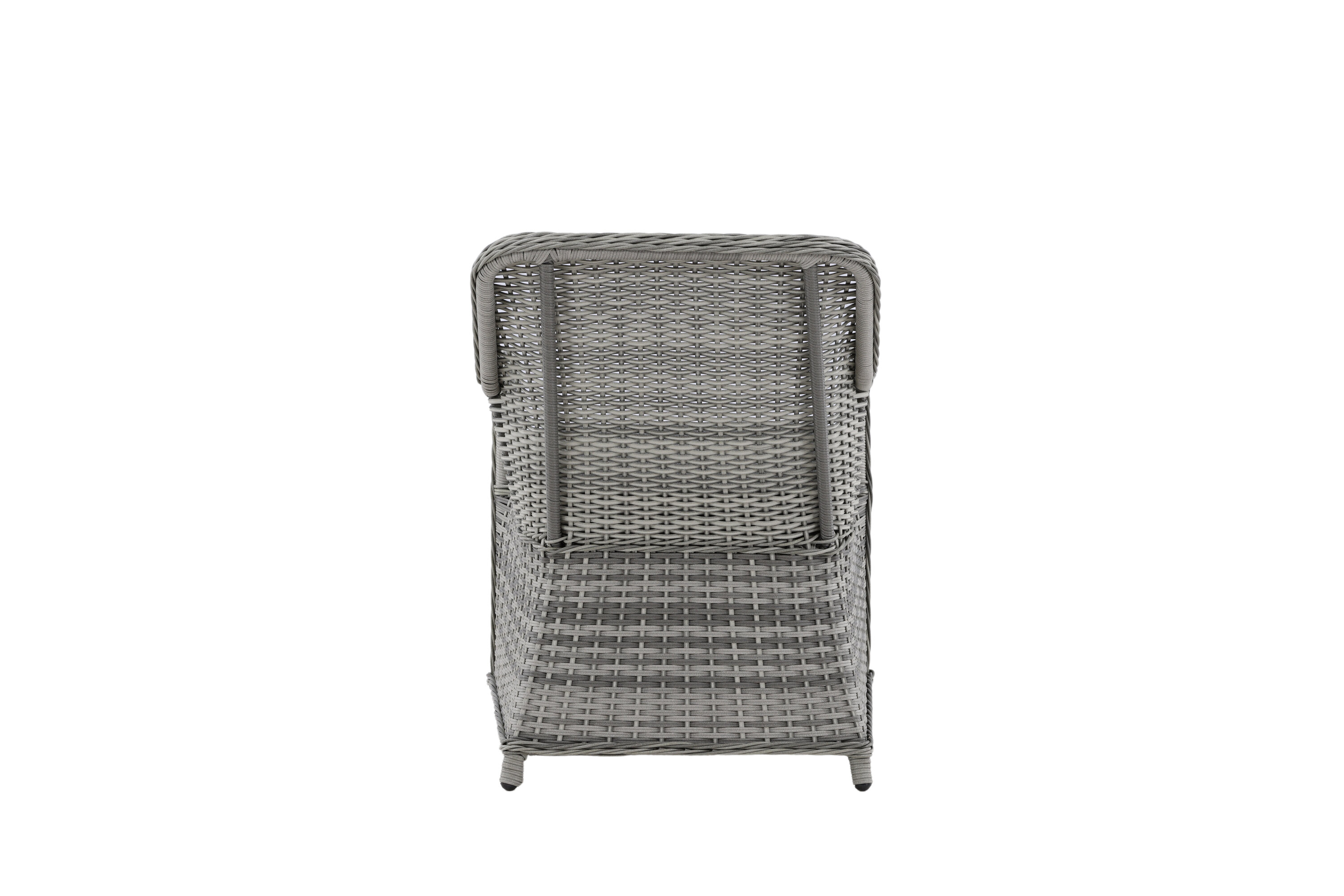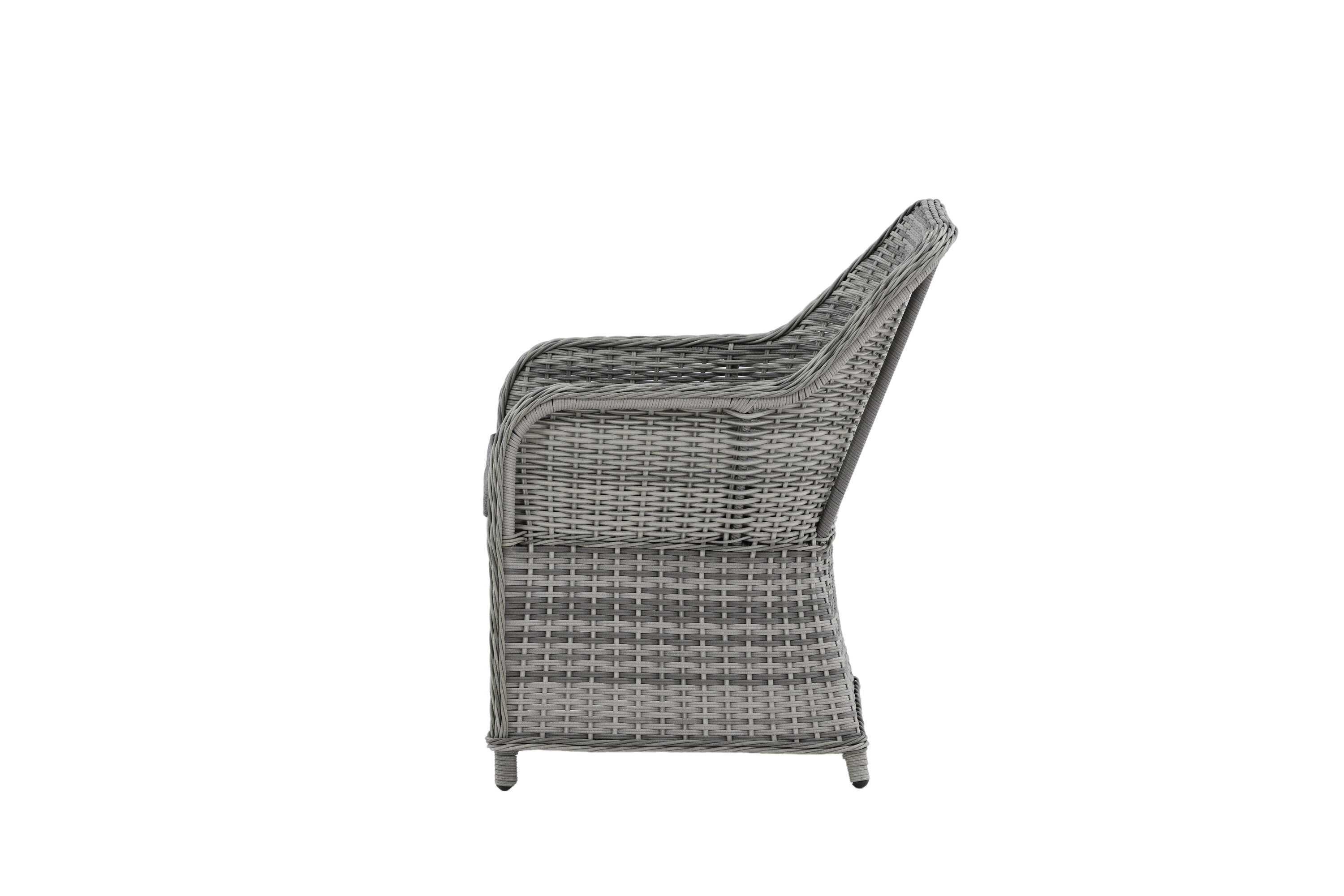 Vikelund, ein sehr stabiler Sessel aus modernem grauem Kunstrattan. Die robuste Konstruktion und das langlebige Material geben Ihnen einen Stuhl, der im Laufe der Zeit steht. Die Rückenlehne lässt sich leicht falten und durch die hohen Armlehnen sitzt man bequem nah am Tisch. Genießen Sie viele wunderbare gemeinsame Sommerdinner!