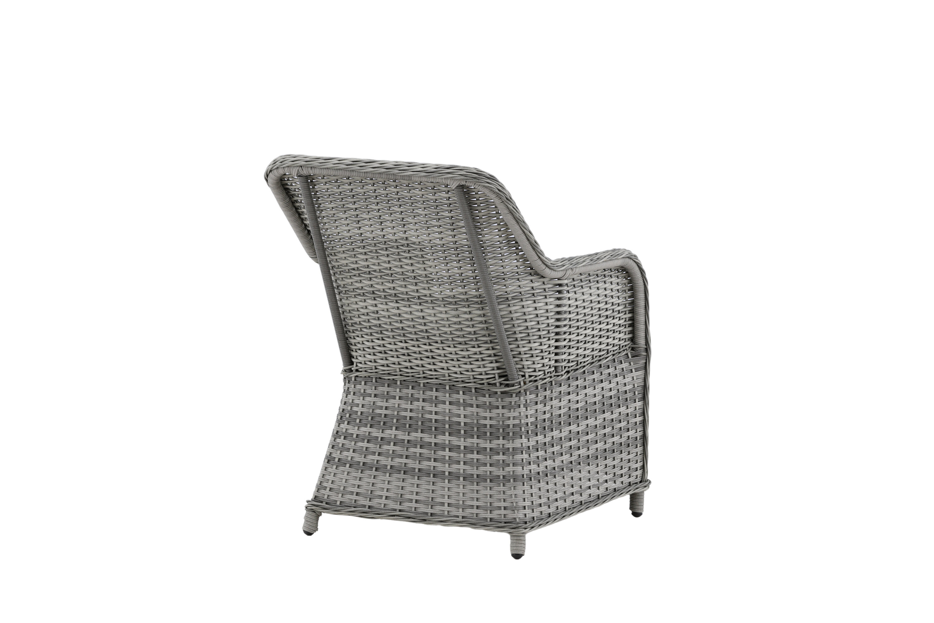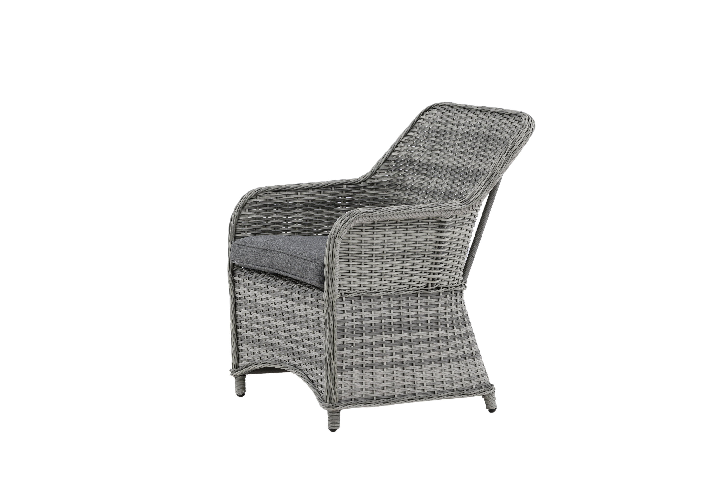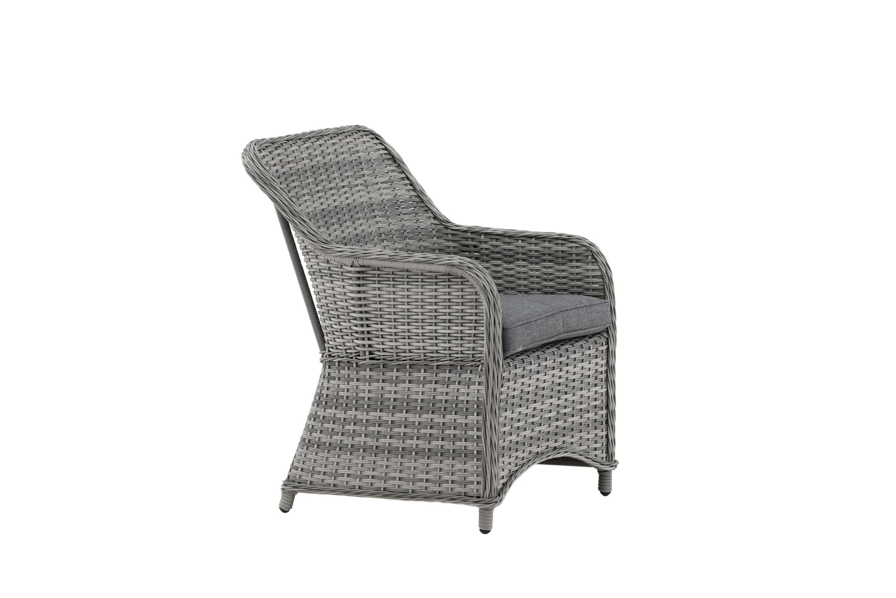 Vikelund, ein sehr stabiler Sessel aus modernem grauem Kunstrattan. Die robuste Konstruktion und das langlebige Material geben Ihnen einen Stuhl, der im Laufe der Zeit steht. Die Rückenlehne lässt sich leicht falten und durch die hohen Armlehnen sitzt man bequem nah am Tisch. Genießen Sie viele wunderbare gemeinsame Sommerdinner!