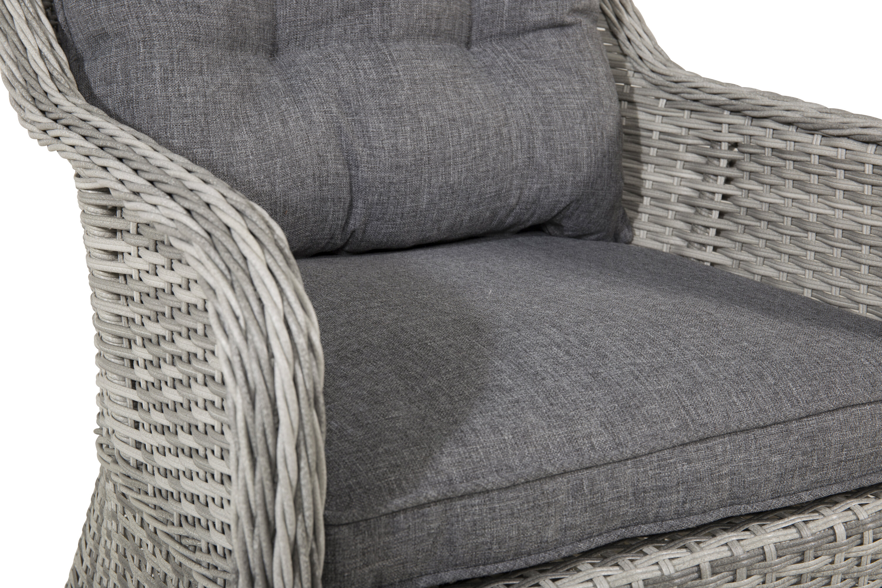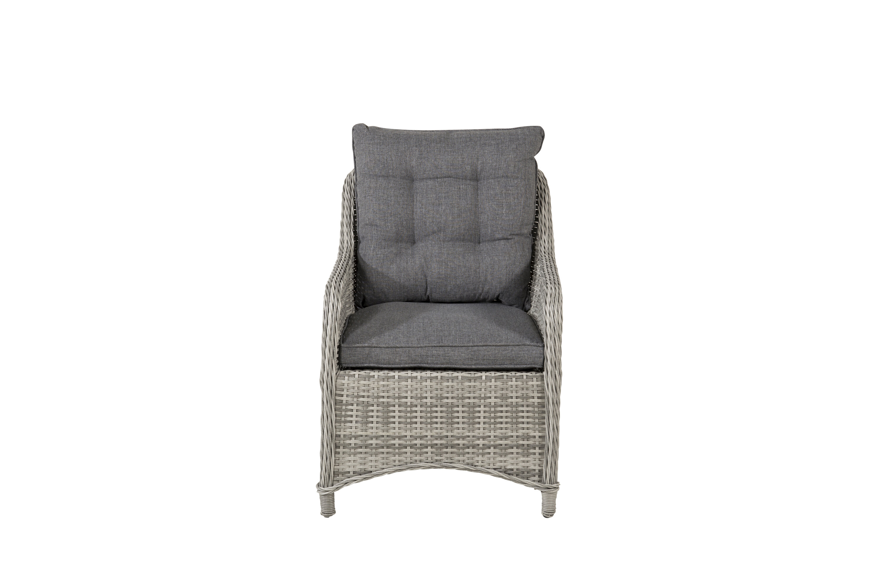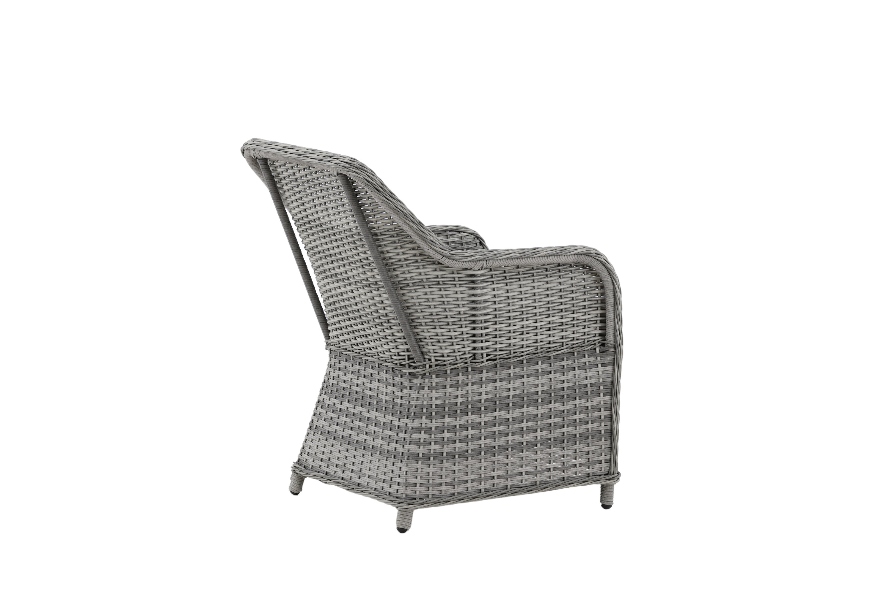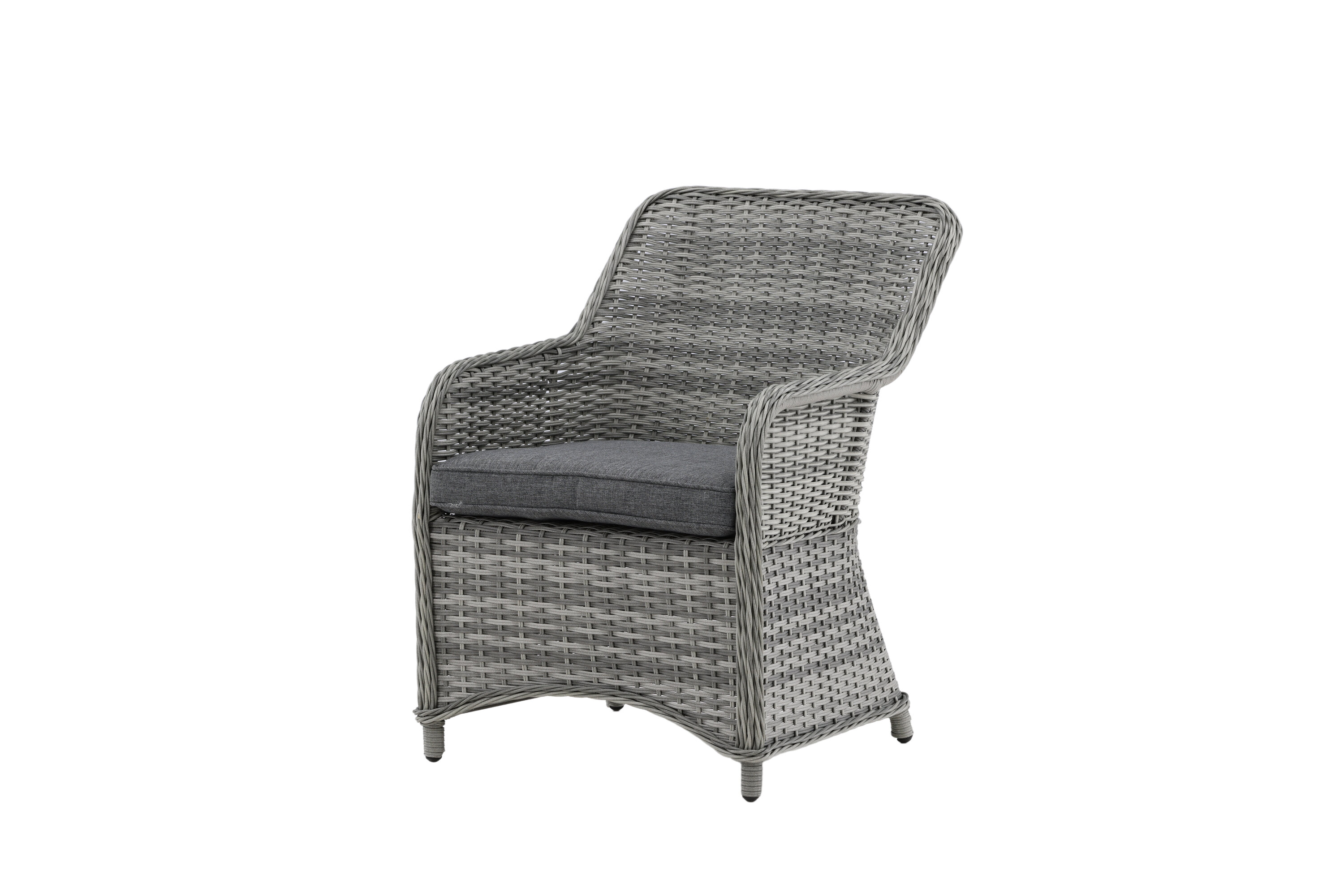 Vikelund, ein sehr stabiler Sessel aus modernem grauem Kunstrattan. Die robuste Konstruktion und das langlebige Material geben Ihnen einen Stuhl, der im Laufe der Zeit steht. Die Rückenlehne lässt sich leicht falten und durch die hohen Armlehnen sitzt man bequem nah am Tisch. Genießen Sie viele wunderbare gemeinsame Sommerdinner!