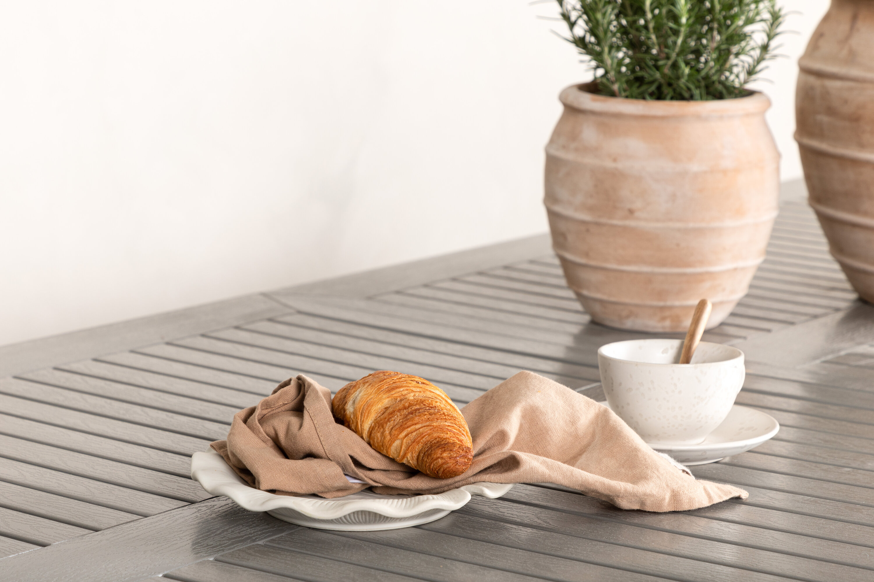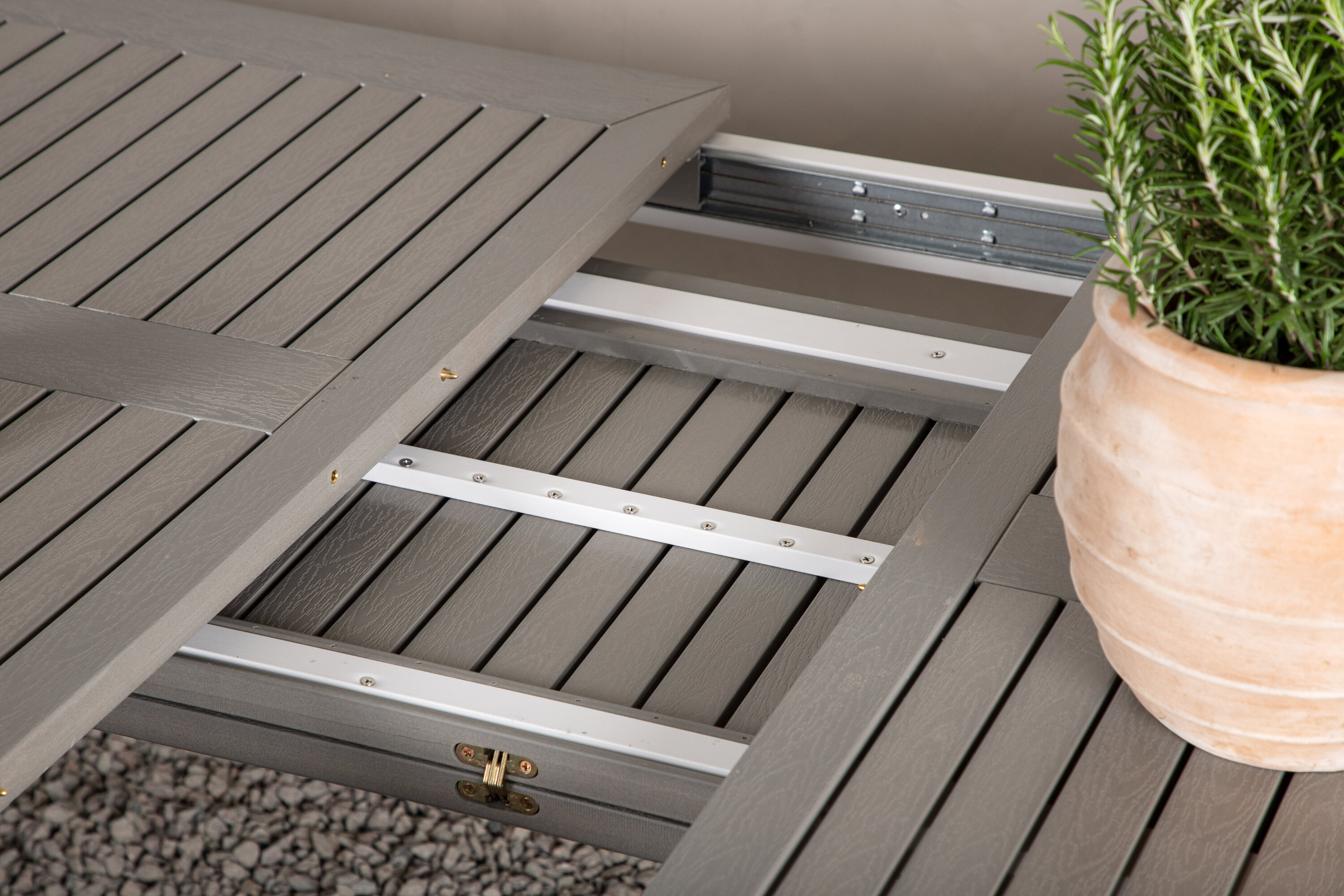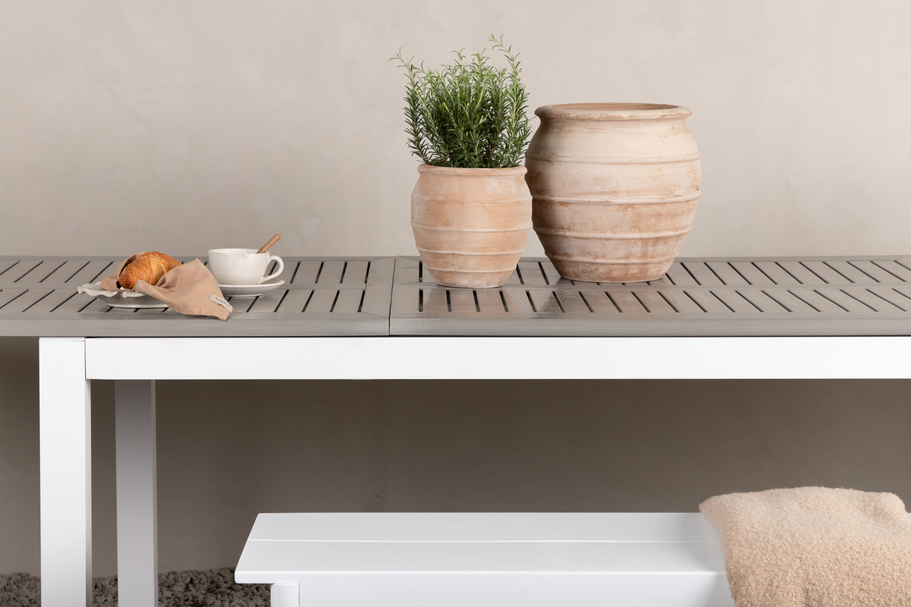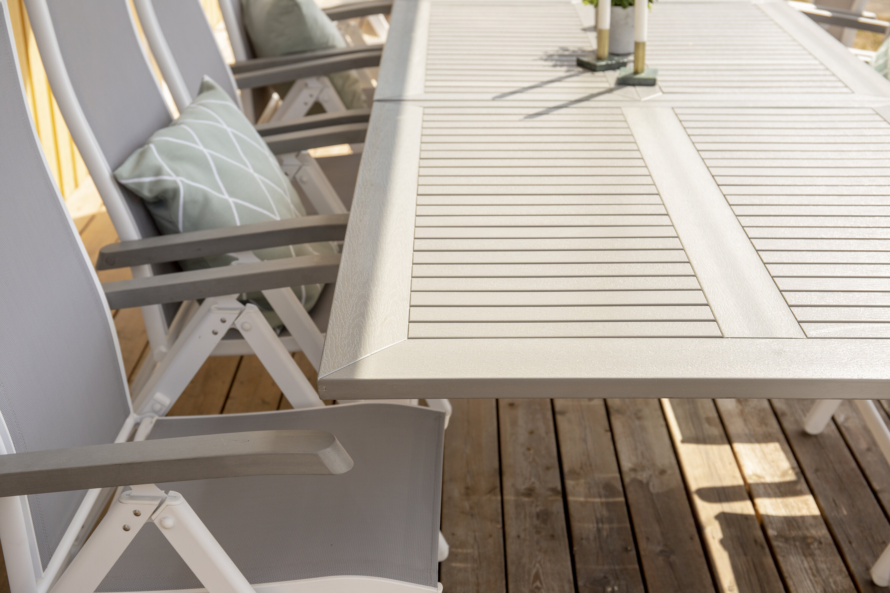 Das Material ist für den Einsatz im Freien konzipiert, da es witterungsbeständig ist und sowohl Feuchtigkeit als auch Schimmel widersteht. Aintwood ist daher ein optimales Material für Outdoor-Möbel. Vermeiden Sie Beschädigungen des Tisches, indem Sie eine Unterlage verwenden und keine heißen Gegenstände direkt auf die Oberfläche legen.