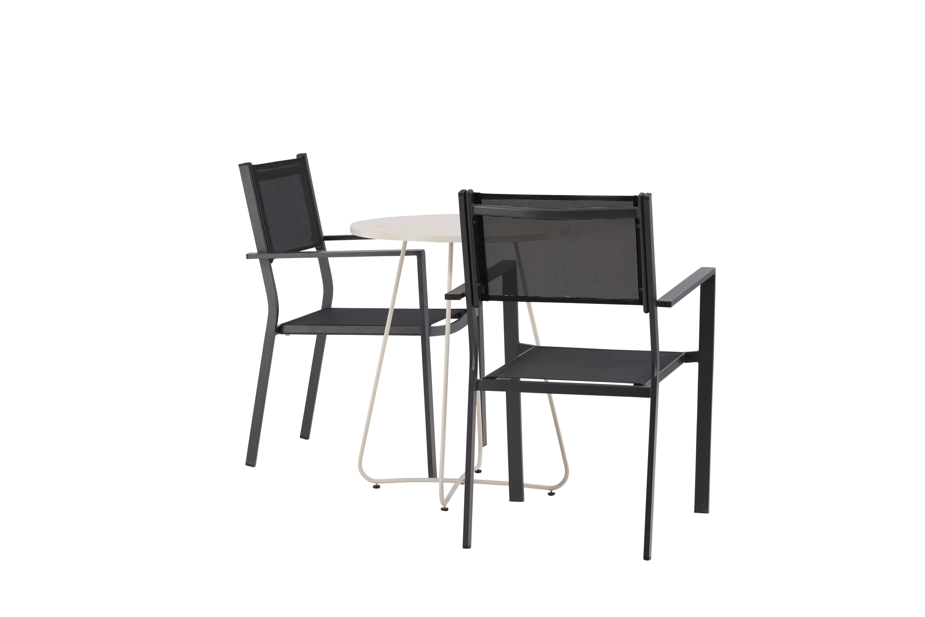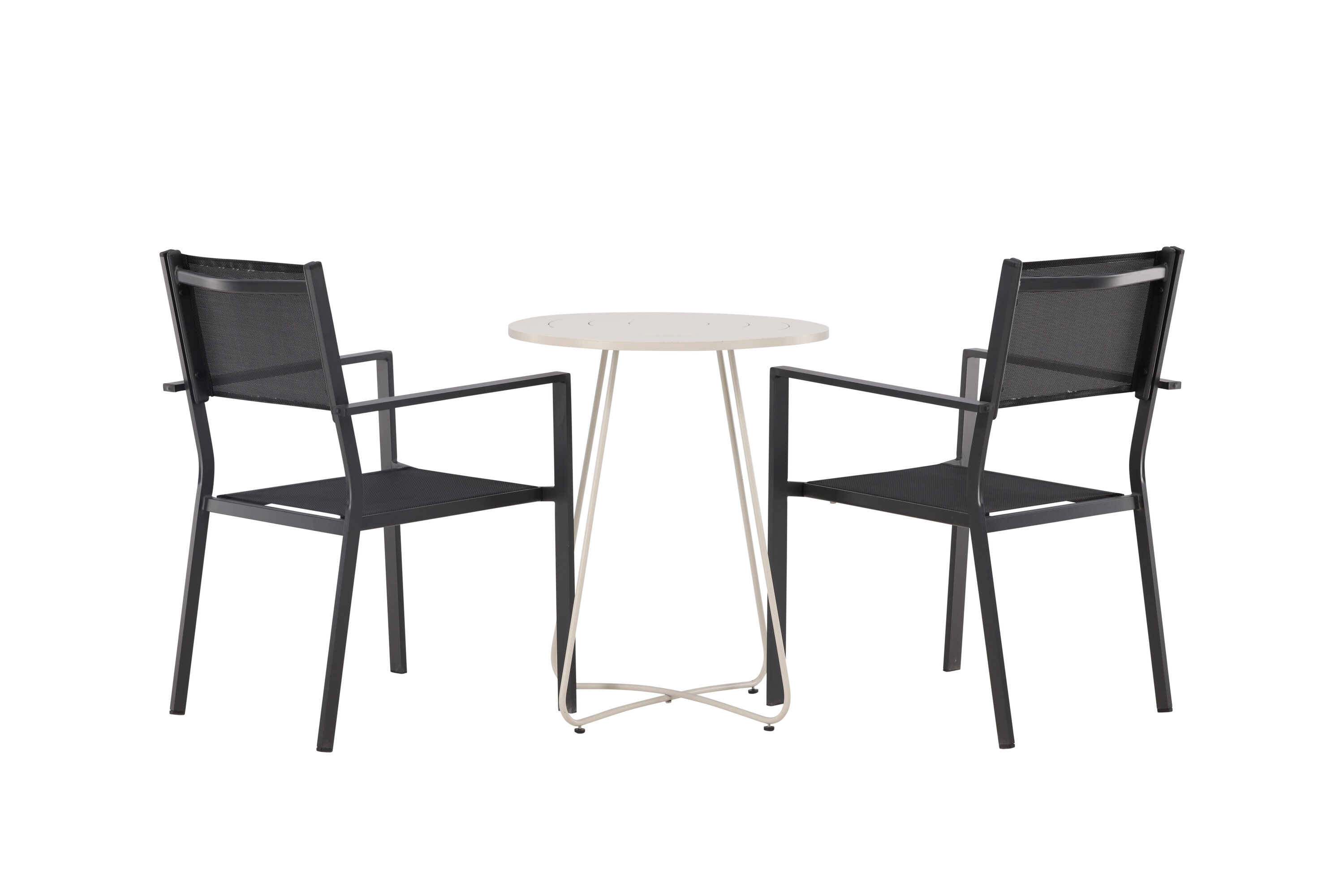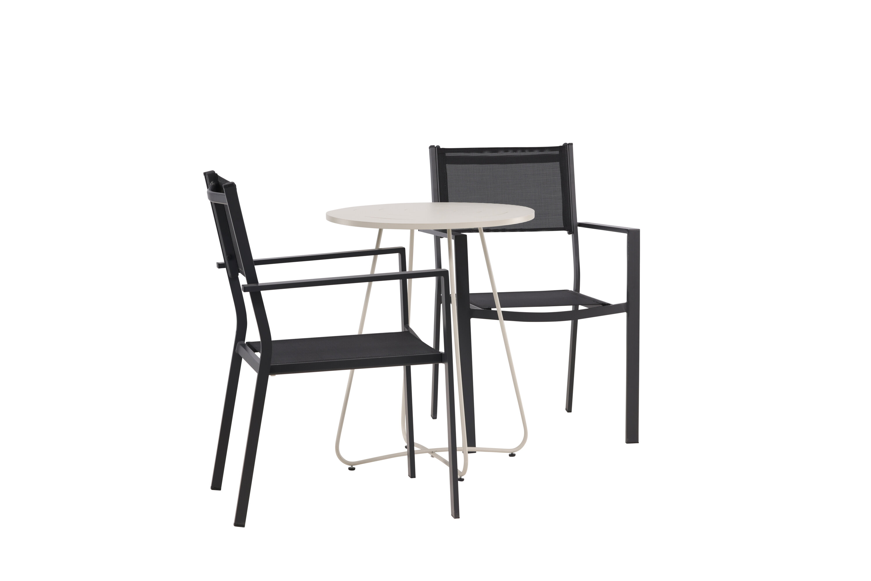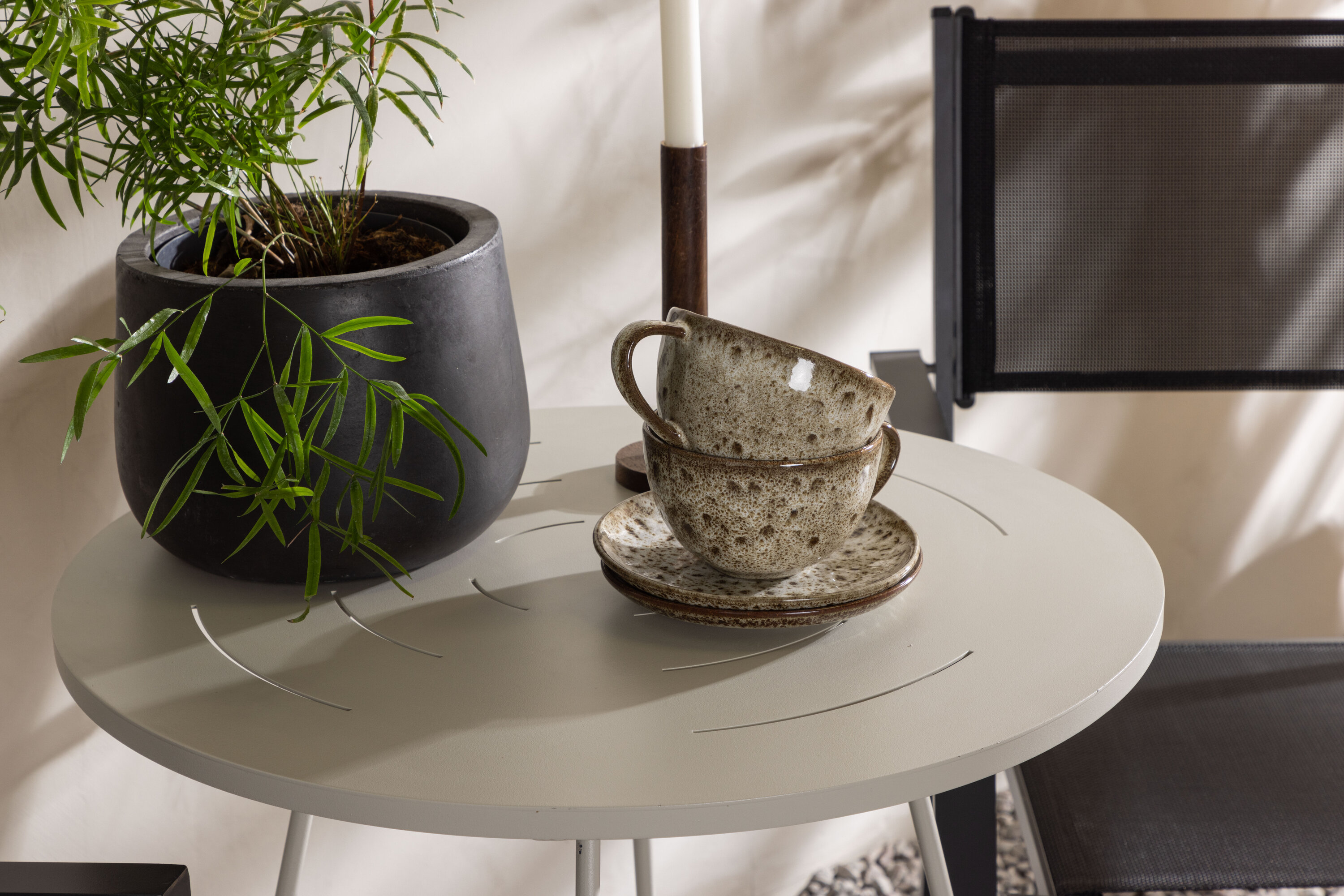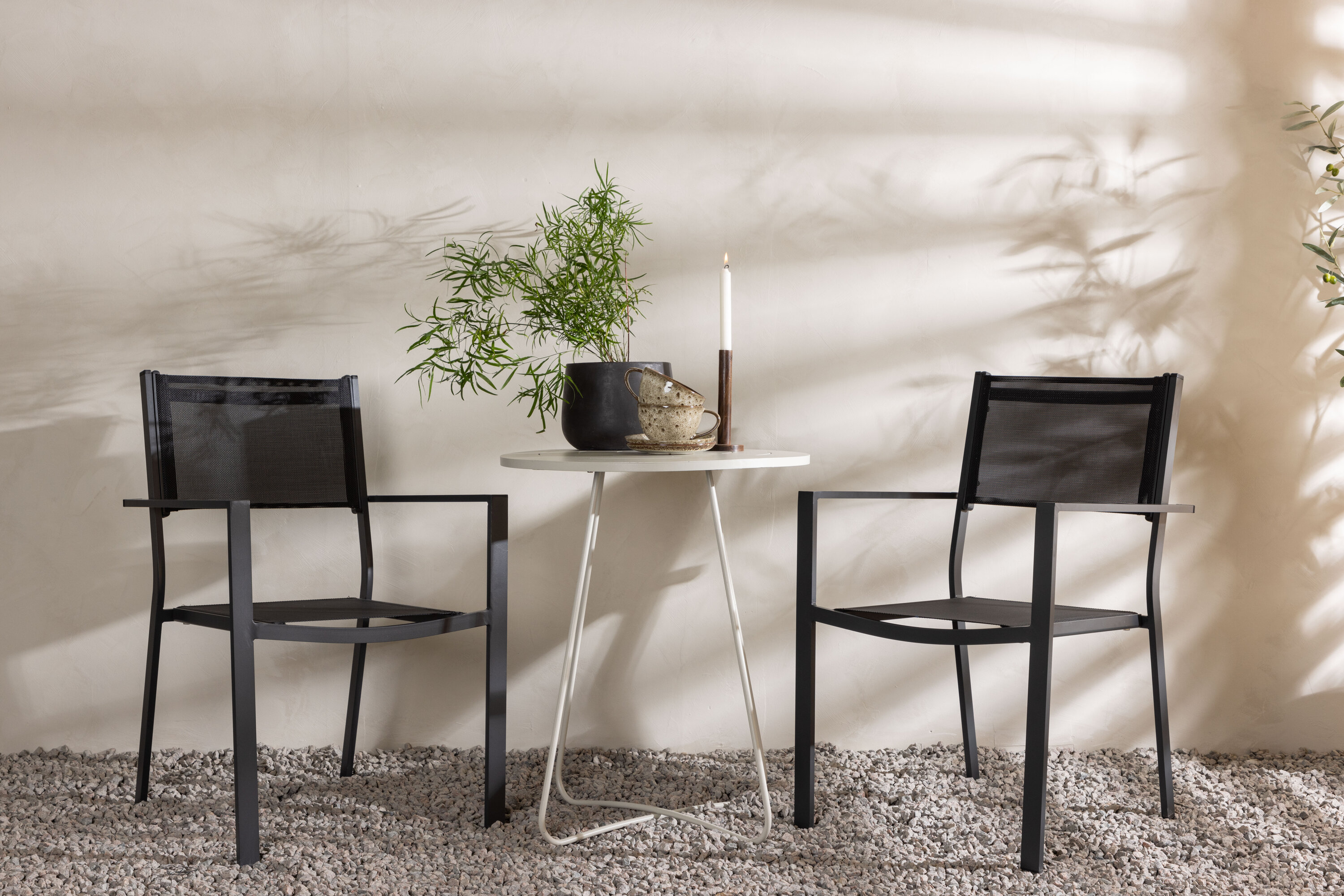 Eine perfekte Café-Gruppe für den kleinen Balkon oder die Terrasse! Der gepflegte Café-Tisch aus der Bacong-Serie hat eine runde Oberseite und schlanke Beine aus beigefarbenem Stahl. Hier in stilvoller Kombination mit 2 Esszimmerstühlen aus der Serie Copacabana. Die Stühle haben gerade nordische Formen und sind stapelbar. Der Sitz ist aus Textil und die Stuhlbeine aus schwarzem Aluminium. Trinken Sie diesen Sommer Ihren Kaffee draußen und genießen Sie angenehme Momente! Tischdurchmesser: 60cm.