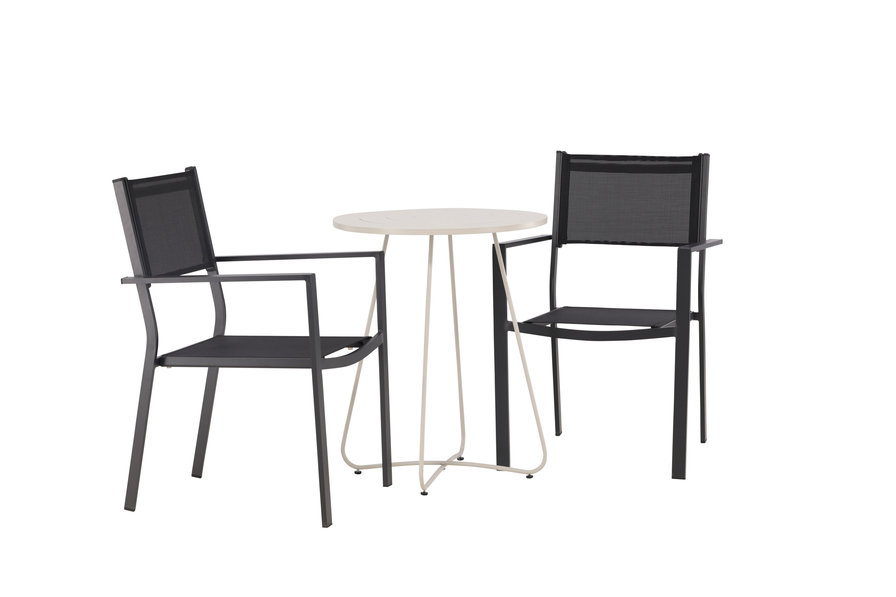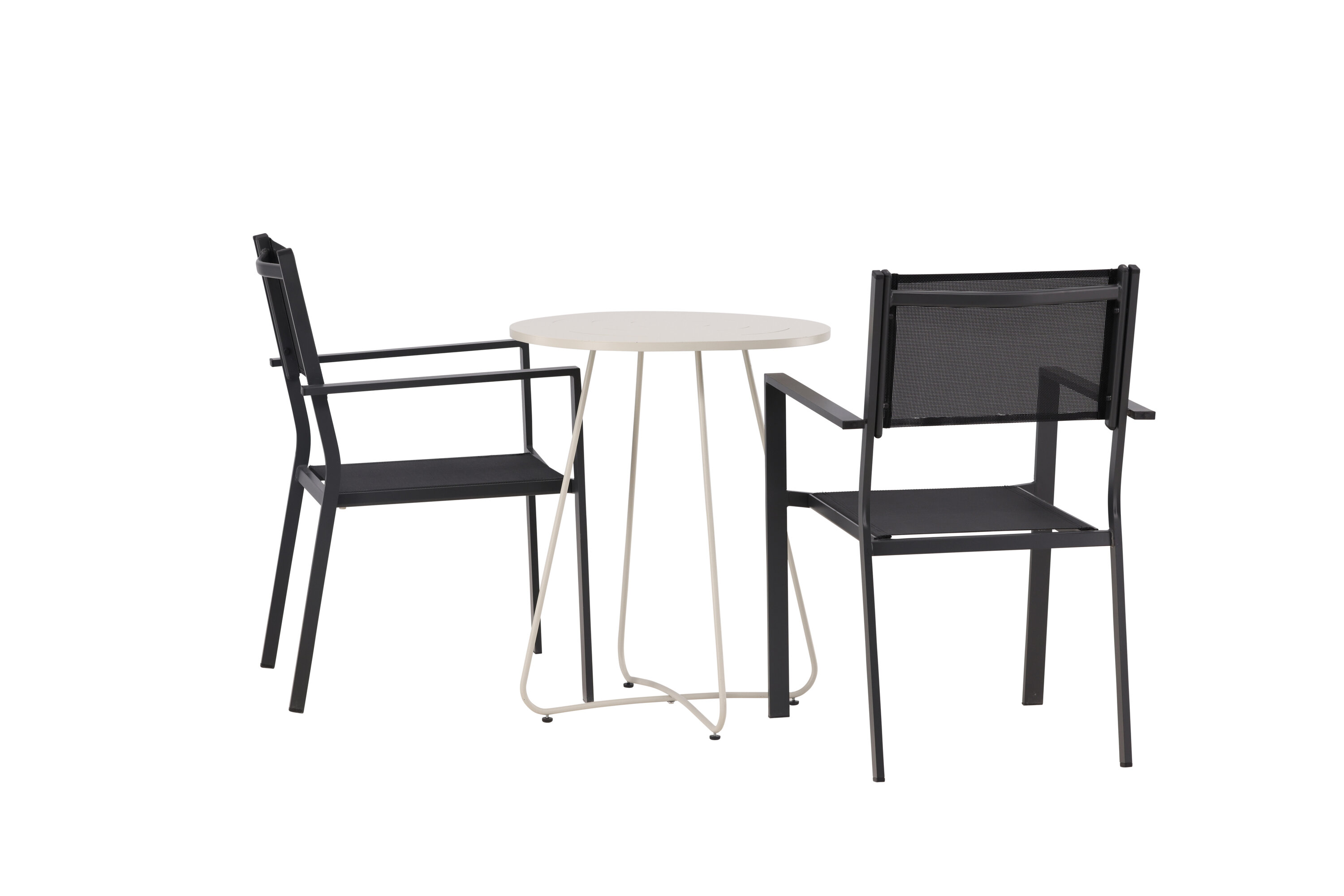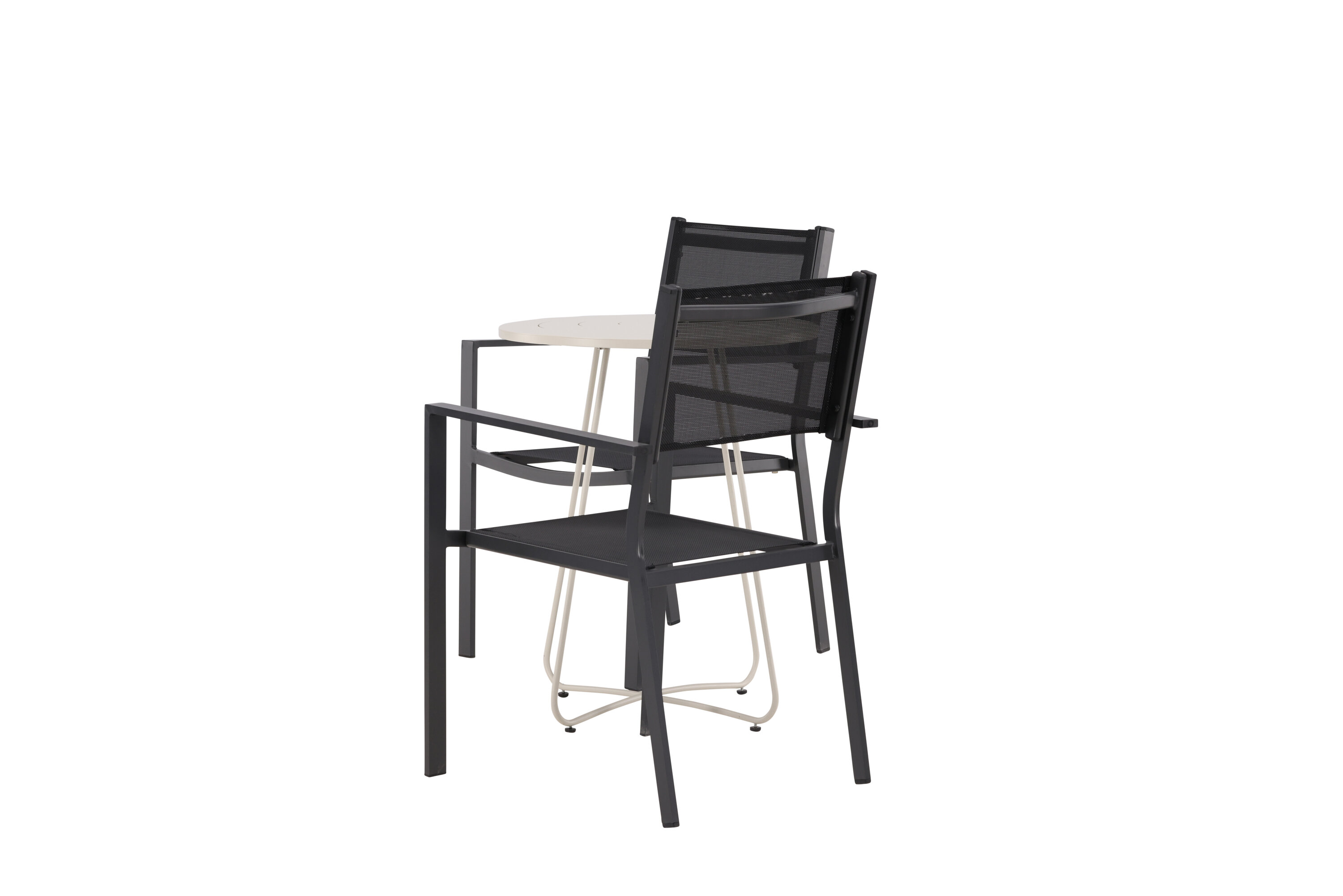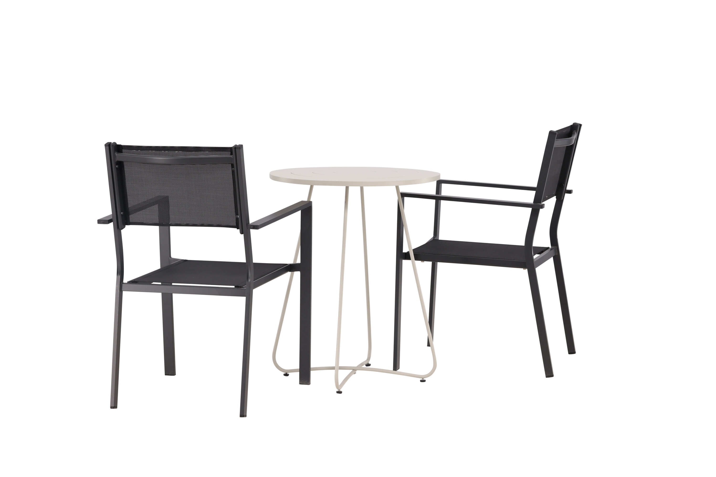 Eine perfekte Café-Gruppe für den kleinen Balkon oder die Terrasse! Der gepflegte Café-Tisch aus der Bacong-Serie hat eine runde Oberseite und schlanke Beine aus beigefarbenem Stahl. Hier in stilvoller Kombination mit 2 Esszimmerstühlen aus der Serie Copacabana. Die Stühle haben gerade nordische Formen und sind stapelbar. Der Sitz ist aus Textil und die Stuhlbeine aus schwarzem Aluminium. Trinken Sie diesen Sommer Ihren Kaffee draußen und genießen Sie angenehme Momente! Tischdurchmesser: 60cm.
