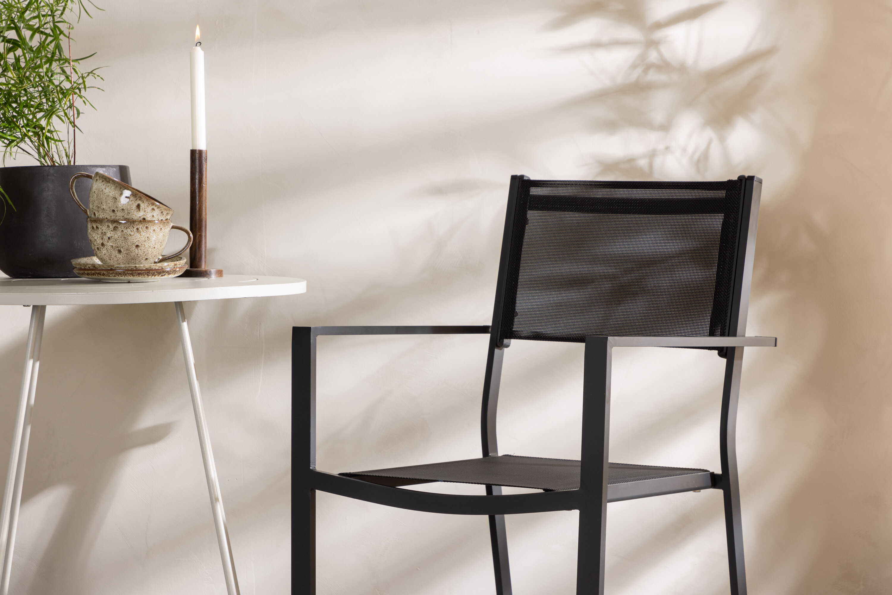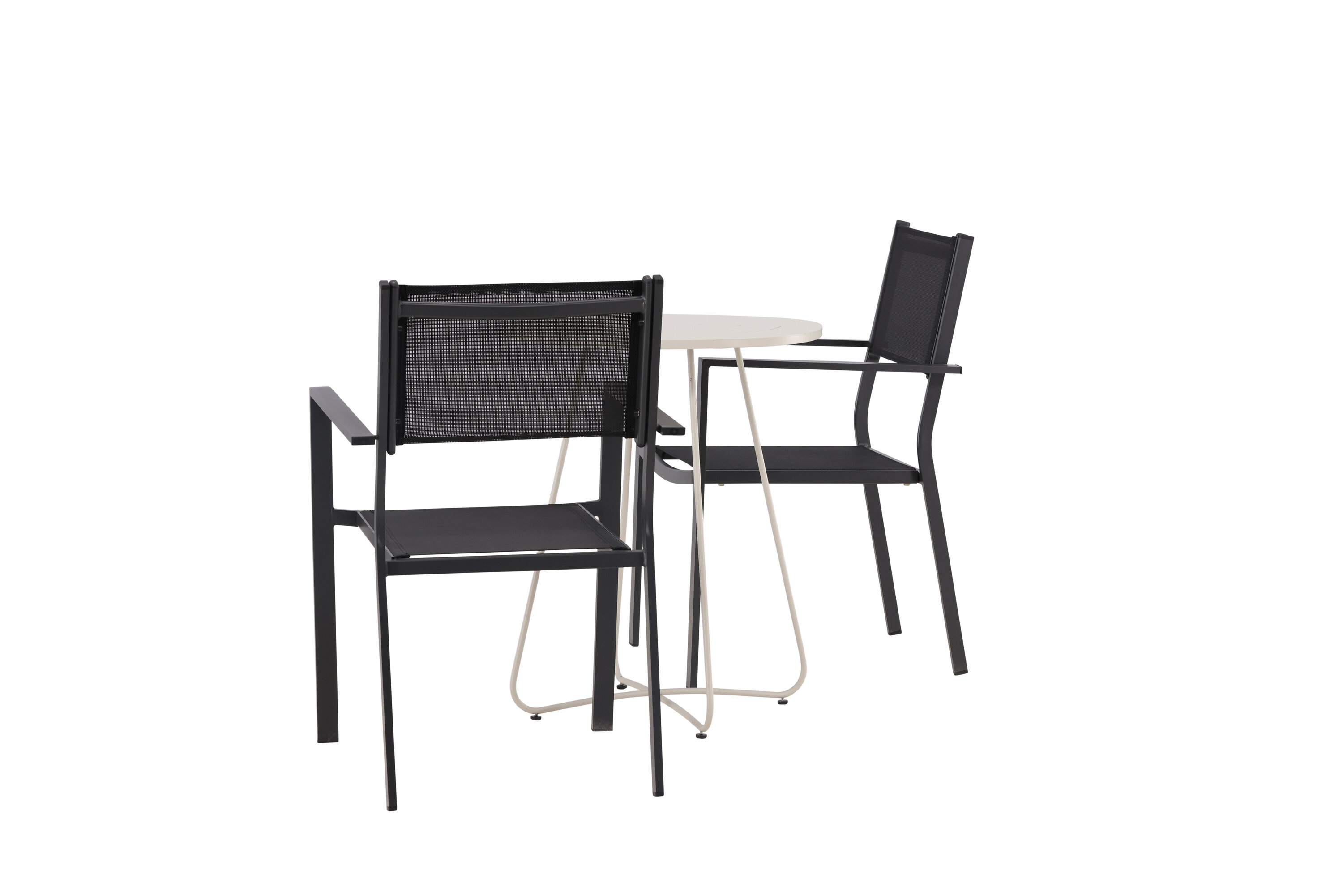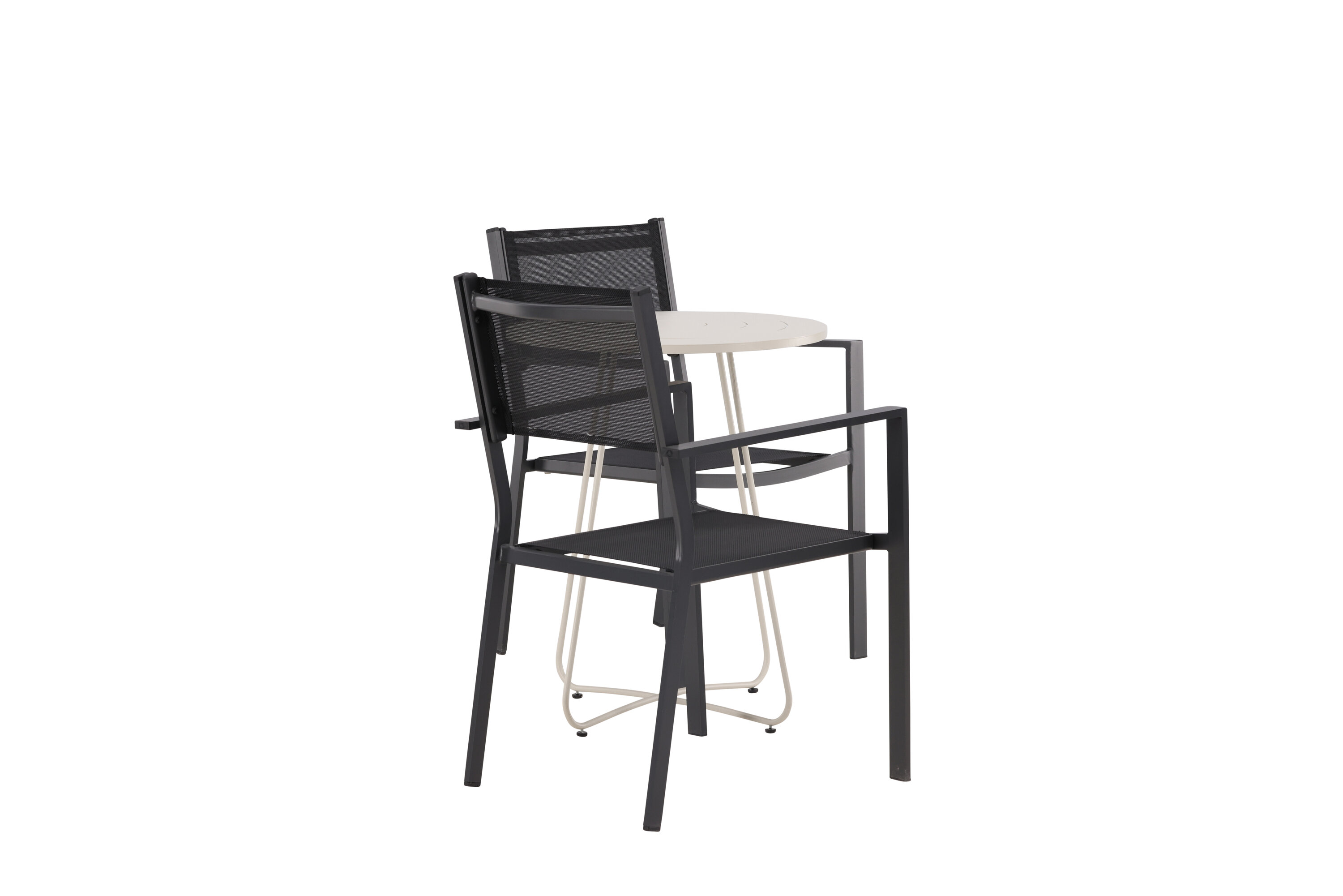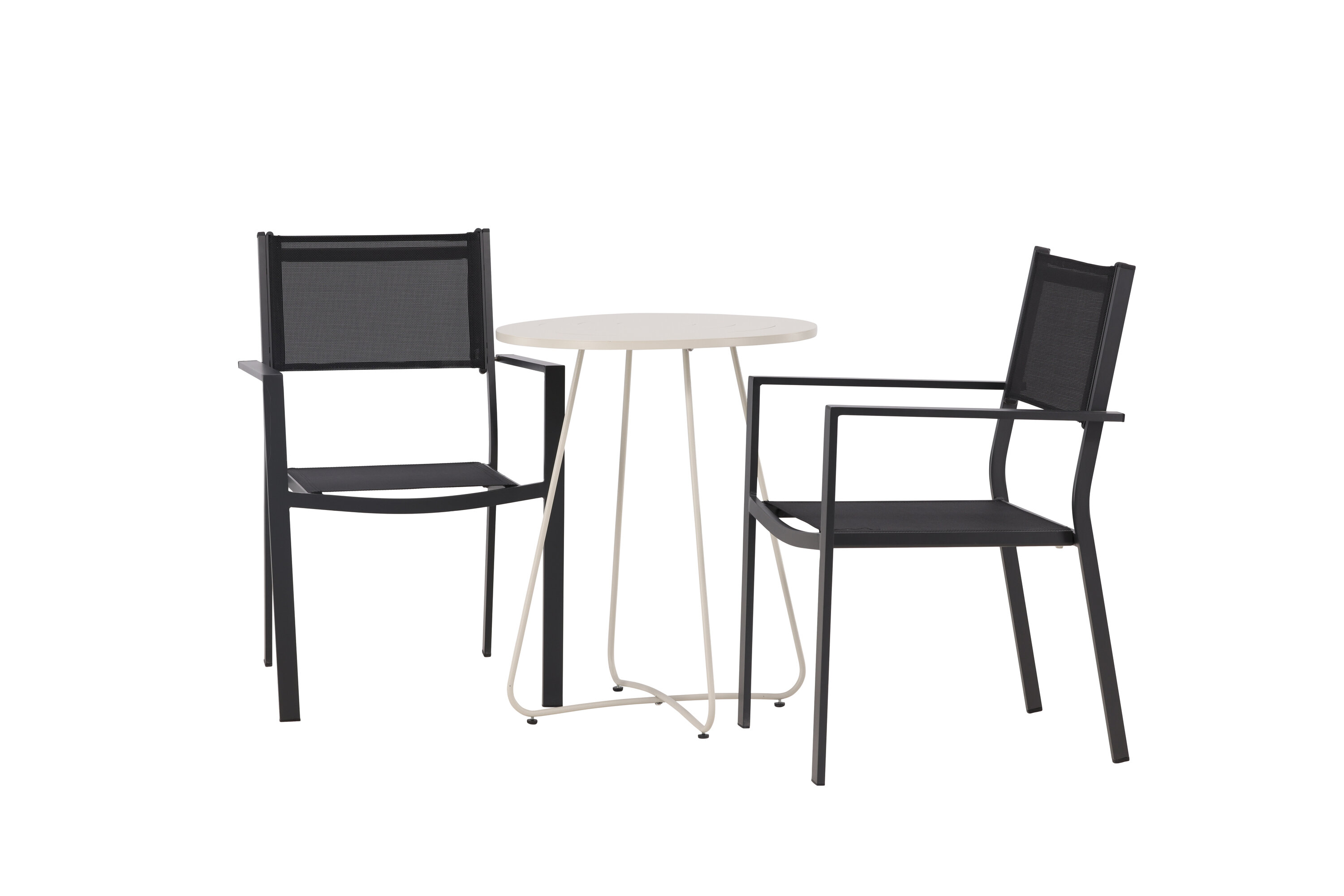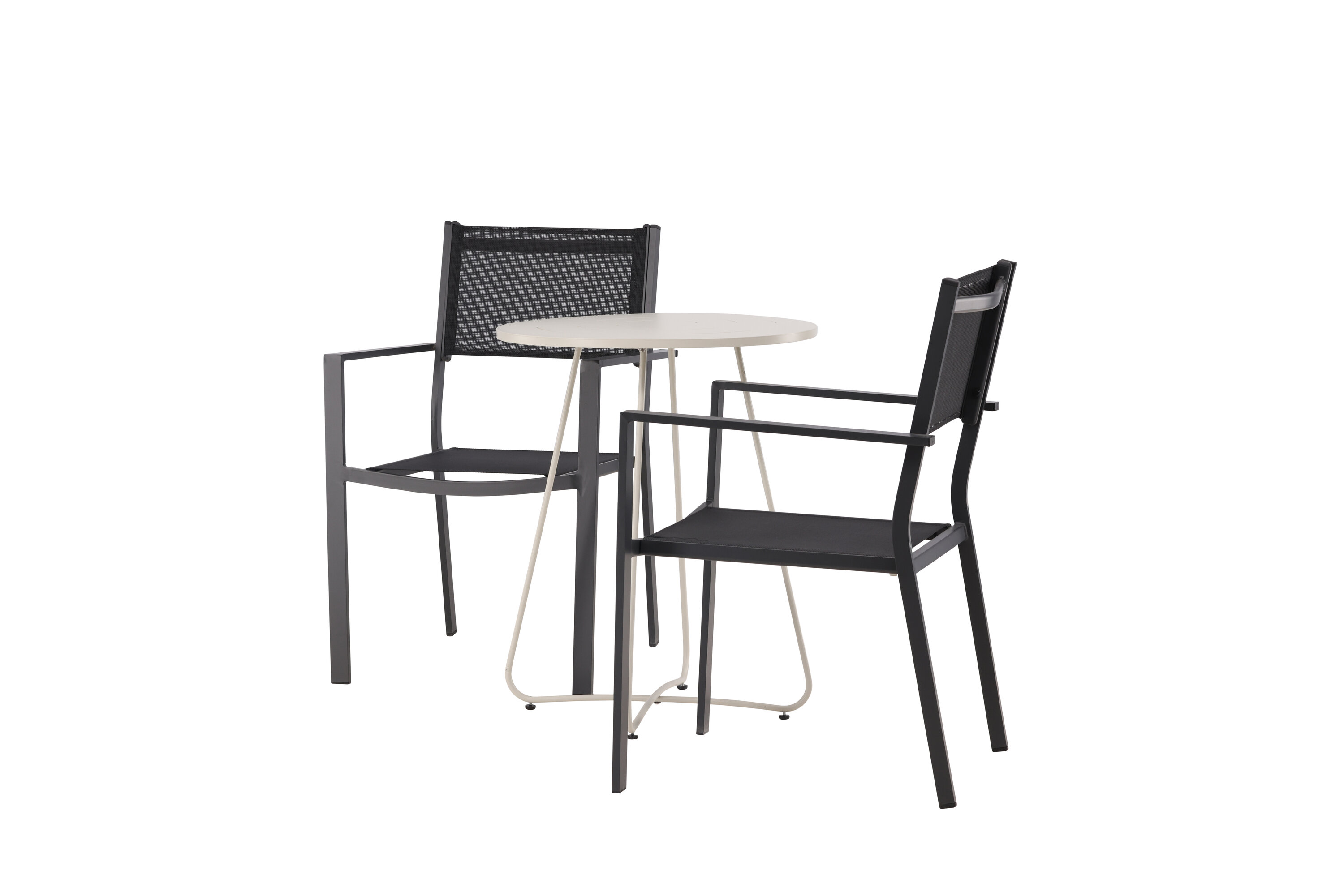 Eine perfekte Café-Gruppe für den kleinen Balkon oder die Terrasse! Der gepflegte Café-Tisch aus der Bacong-Serie hat eine runde Oberseite und schlanke Beine aus beigefarbenem Stahl. Hier in stilvoller Kombination mit 2 Esszimmerstühlen aus der Serie Copacabana. Die Stühle haben gerade nordische Formen und sind stapelbar. Der Sitz ist aus Textil und die Stuhlbeine aus schwarzem Aluminium. Trinken Sie diesen Sommer Ihren Kaffee draußen und genießen Sie angenehme Momente! Tischdurchmesser: 60cm.