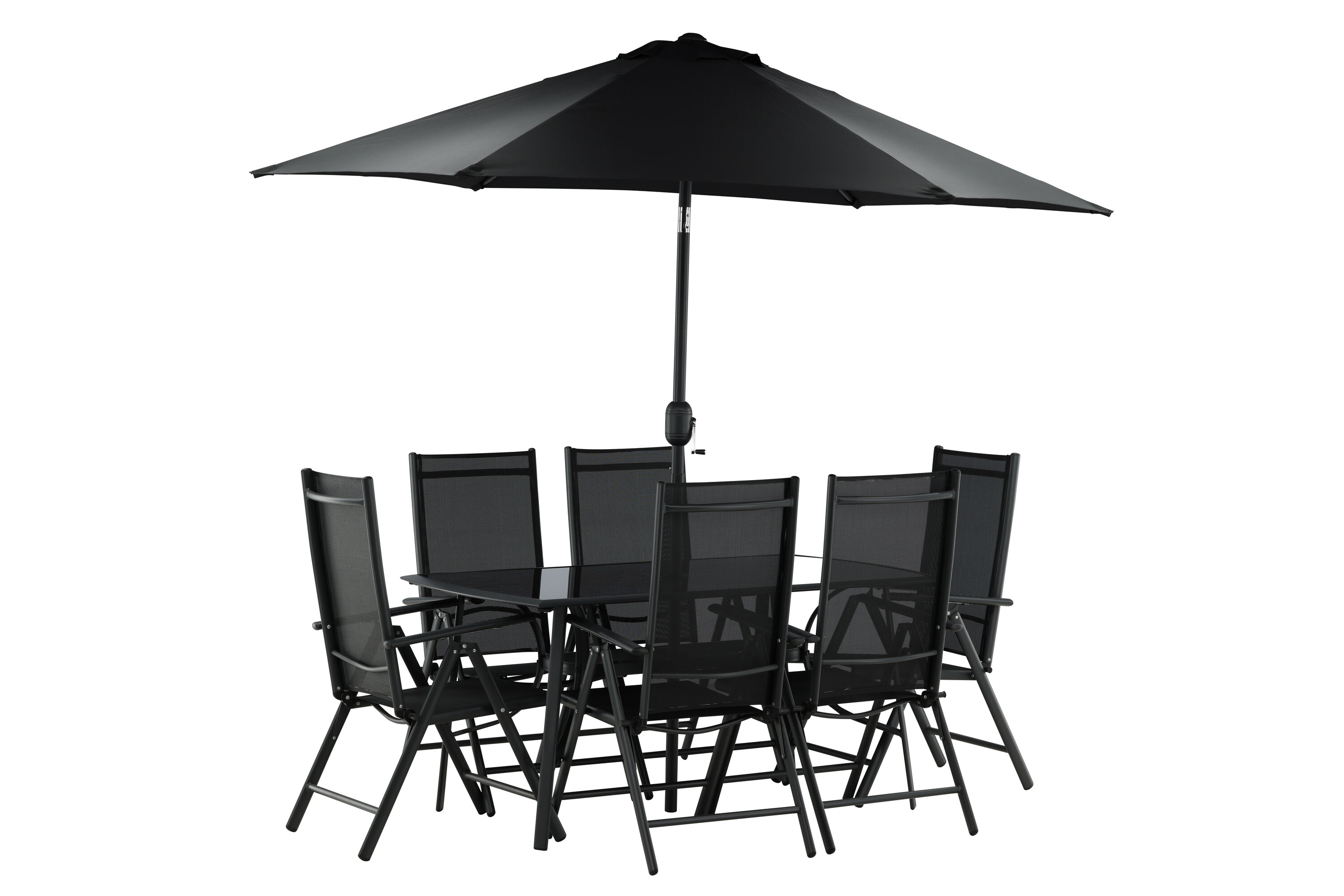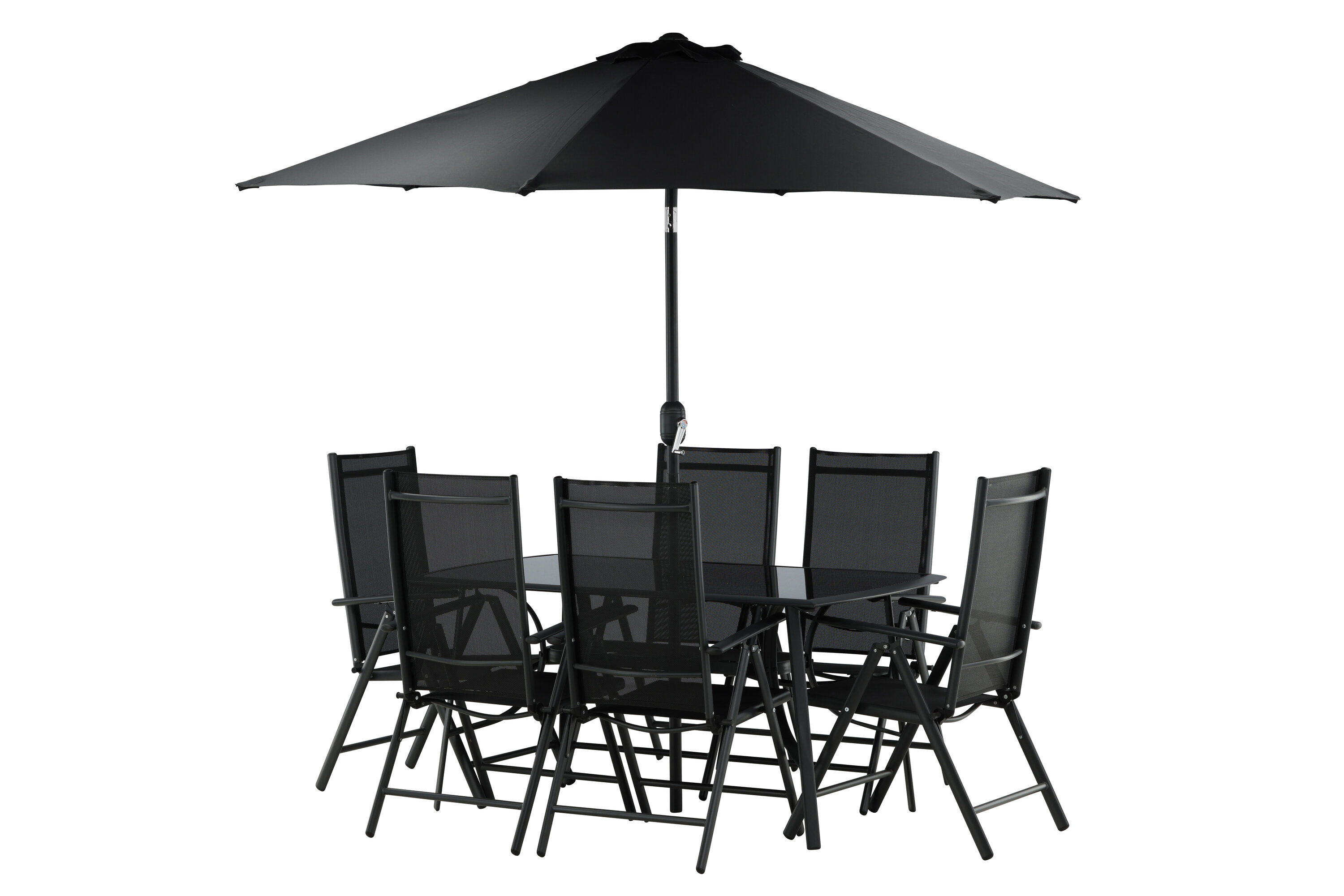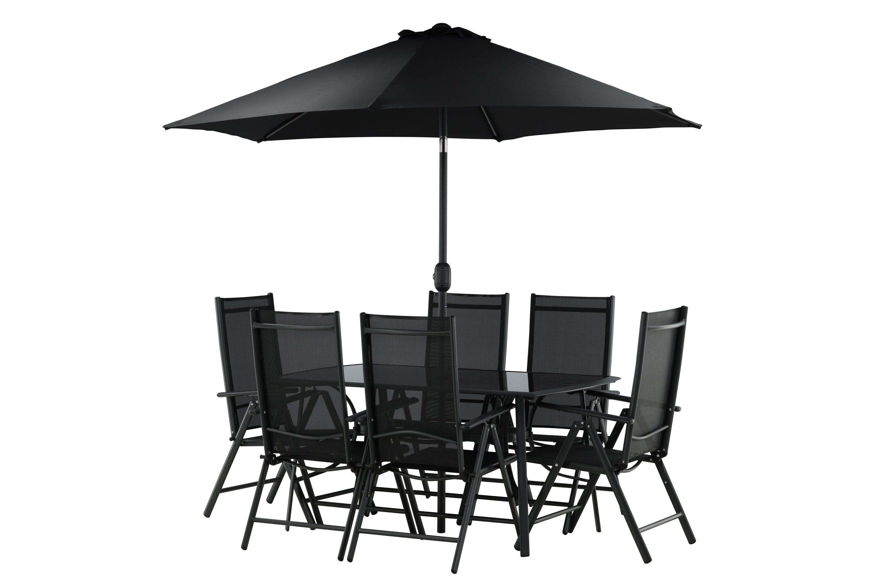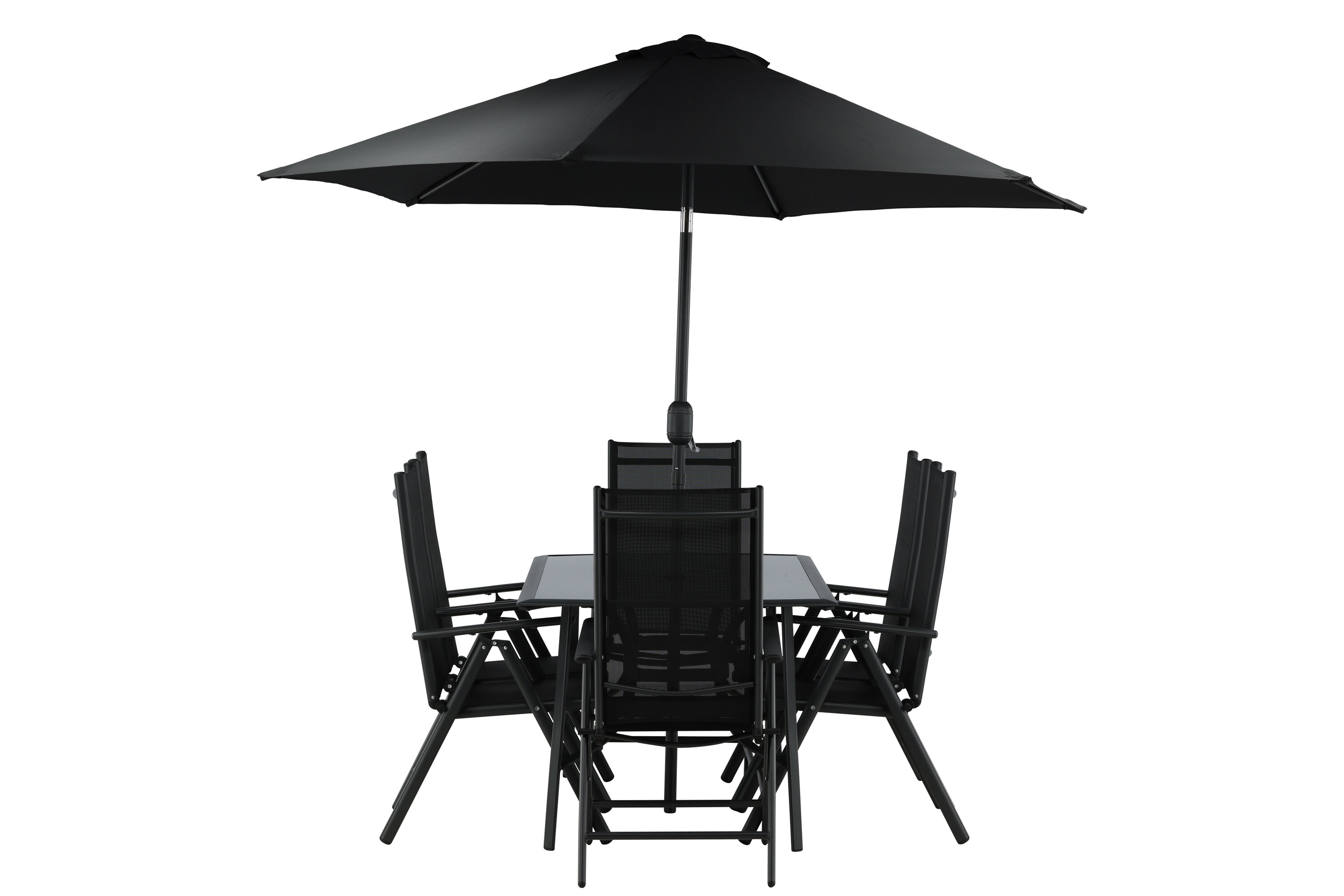 Erfrischen Sie sich eine Weile im Schatten in einer modernen Essgruppe unter einem eleganten Sonnenschirm! Die Brekki Essgruppe bietet sowohl einen stilvollen Esstisch mit einer Tischplatte aus Glas als auch gerade Beine aus schwarzem Aluminium. Hier zusammen mit klappbaren Esszimmerstühlen mit einem Sitz in schwarzer Textilene und Rahmen in Aluminium. Der Sonnenschirm ist in der Mitte des Tisches angebracht und schützt Sie beim Abendessen vor den heißen Sonnenstrahlen. Der Sonnenschirm hat einen schwarzen Stoff mit einem Aluminiumrahmen. Besser geht es nicht!