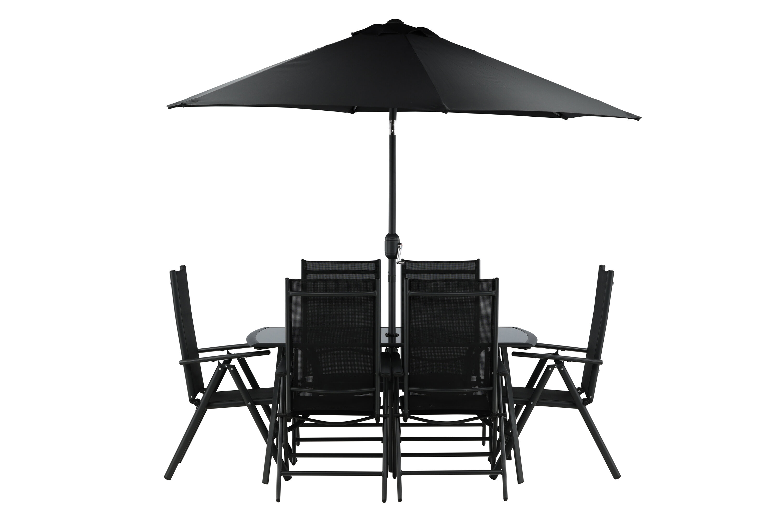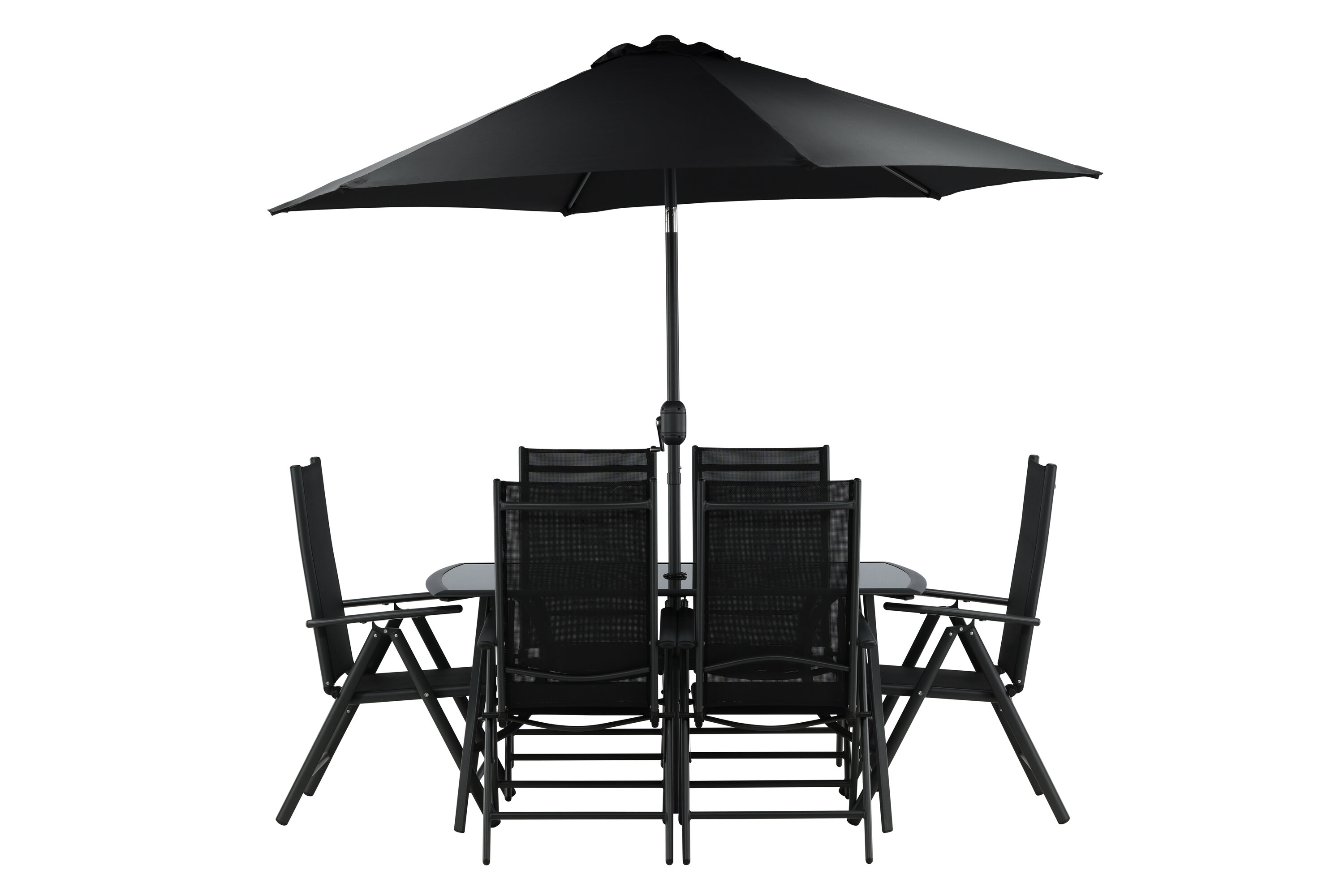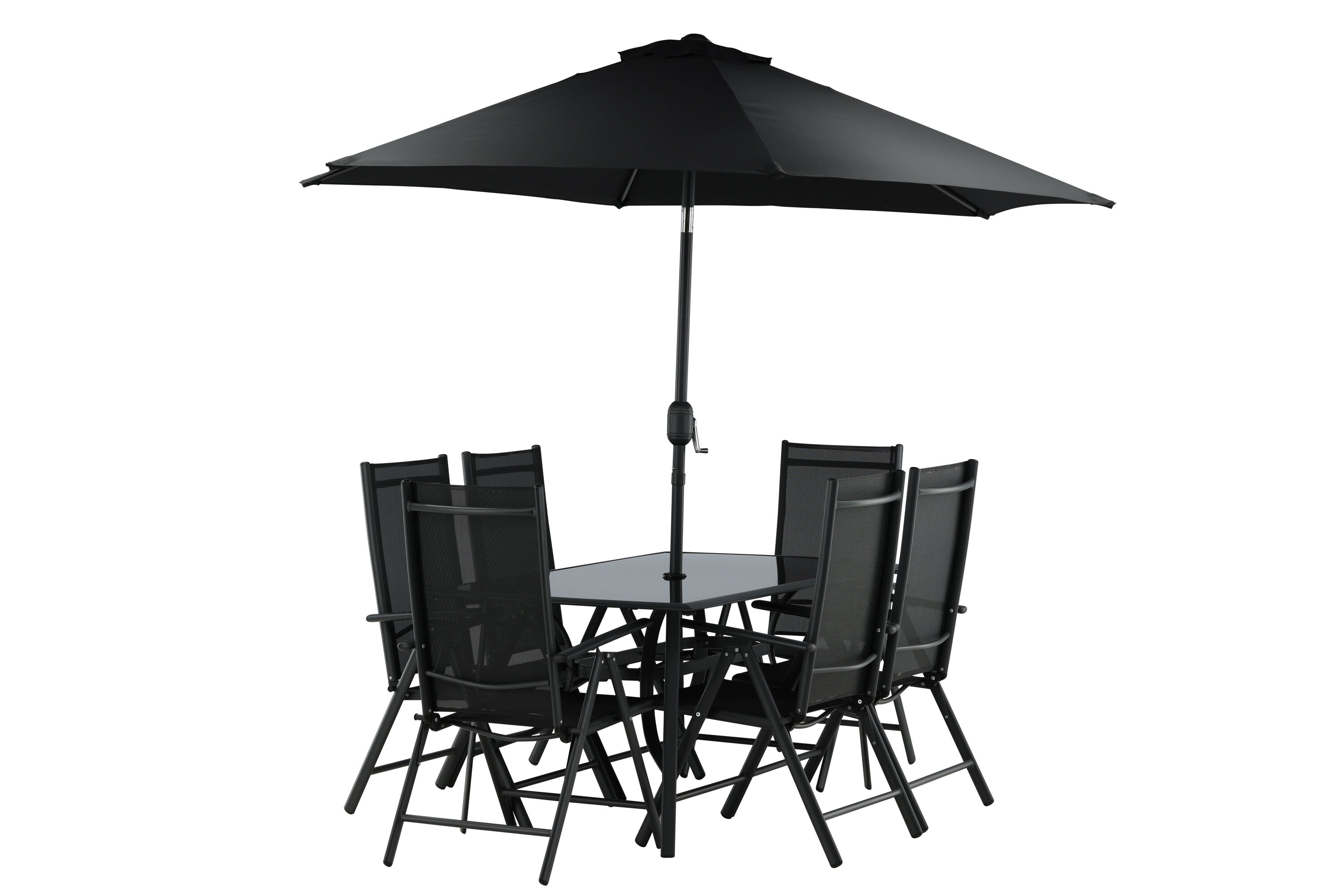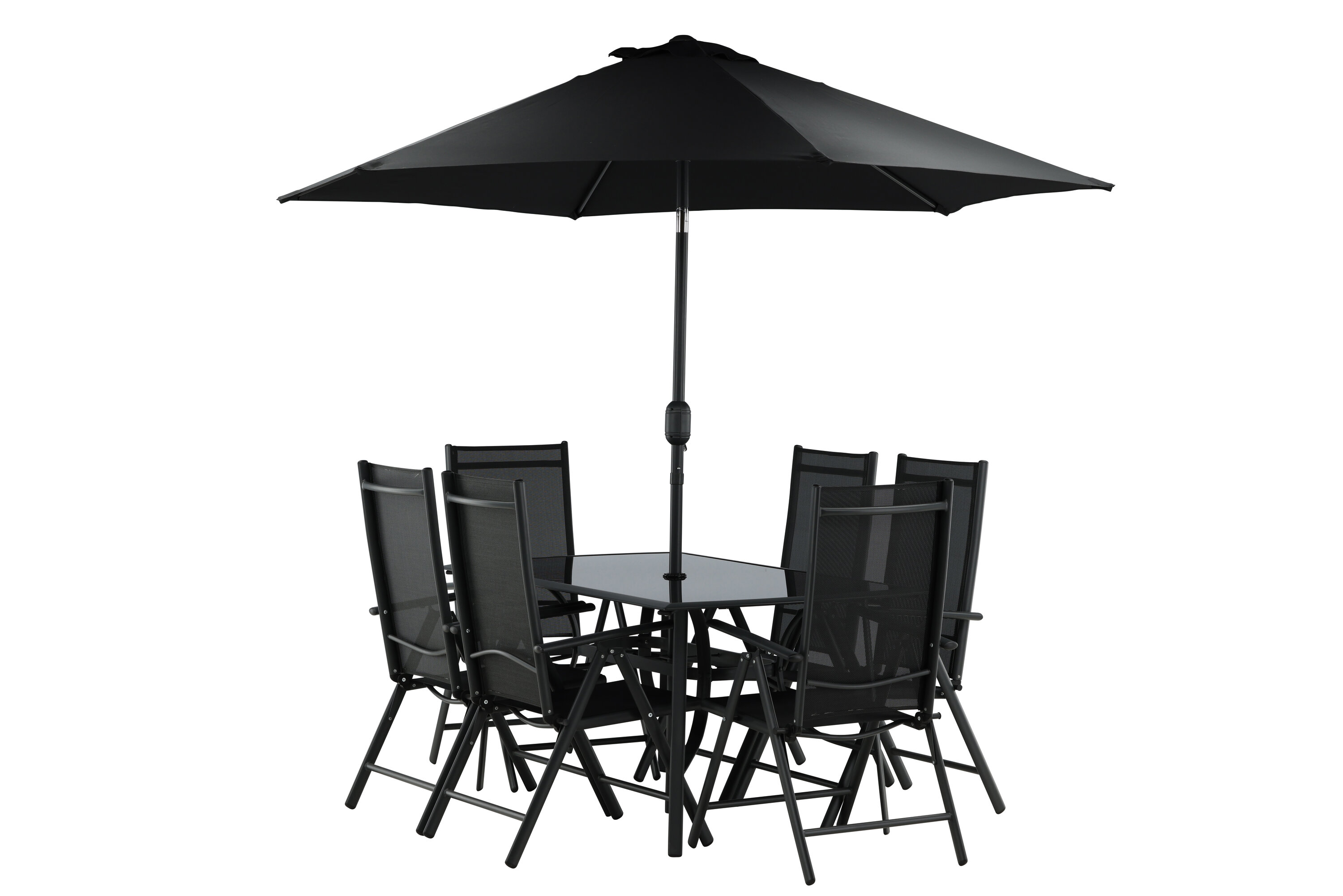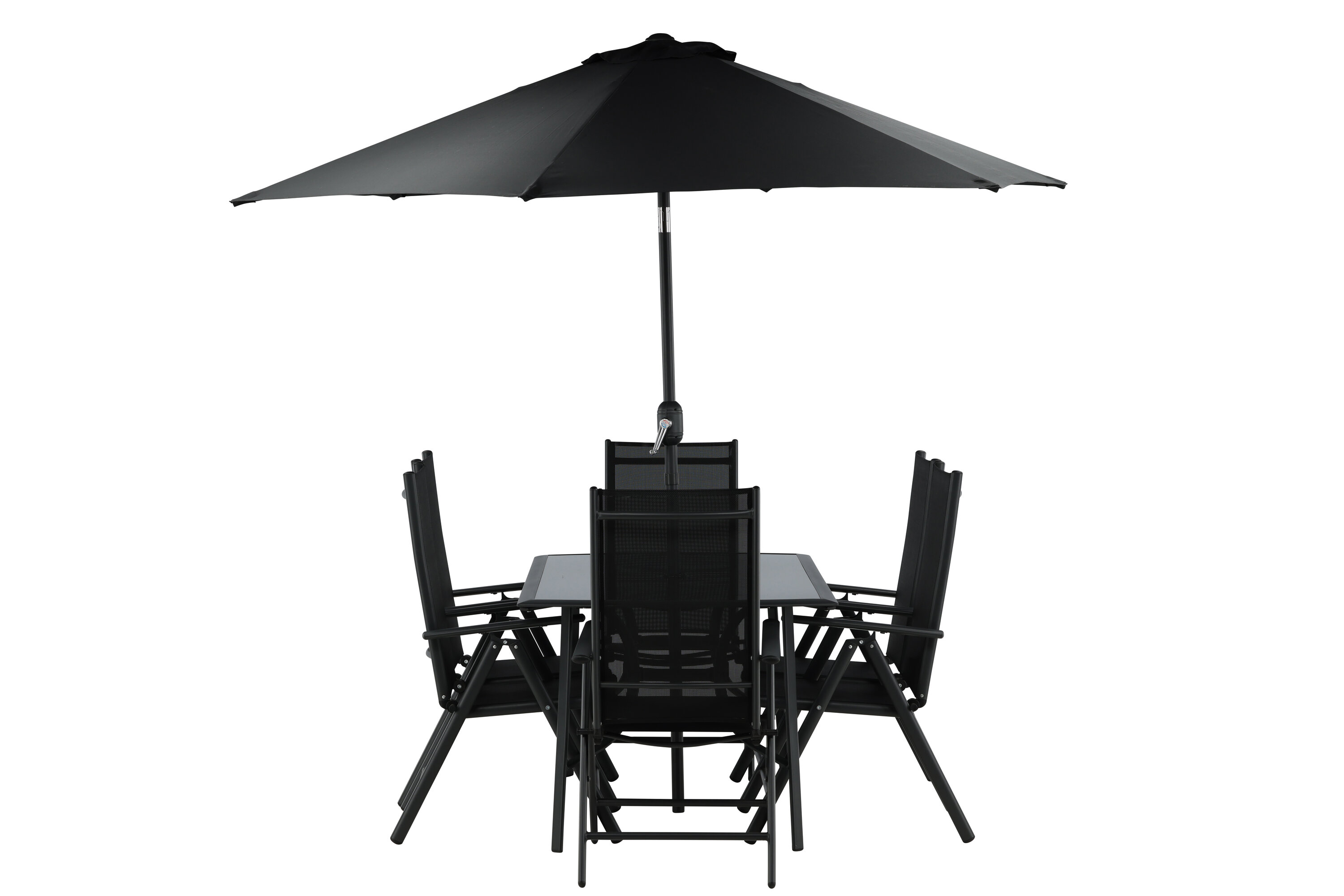 Erfrischen Sie sich eine Weile im Schatten in einer modernen Essgruppe unter einem eleganten Sonnenschirm! Die Brekki Essgruppe bietet sowohl einen stilvollen Esstisch mit einer Tischplatte aus Glas als auch gerade Beine aus schwarzem Aluminium. Hier zusammen mit klappbaren Esszimmerstühlen mit einem Sitz in schwarzer Textilene und Rahmen in Aluminium. Der Sonnenschirm ist in der Mitte des Tisches angebracht und schützt Sie beim Abendessen vor den heißen Sonnenstrahlen. Der Sonnenschirm hat einen schwarzen Stoff mit einem Aluminiumrahmen. Besser geht es nicht!