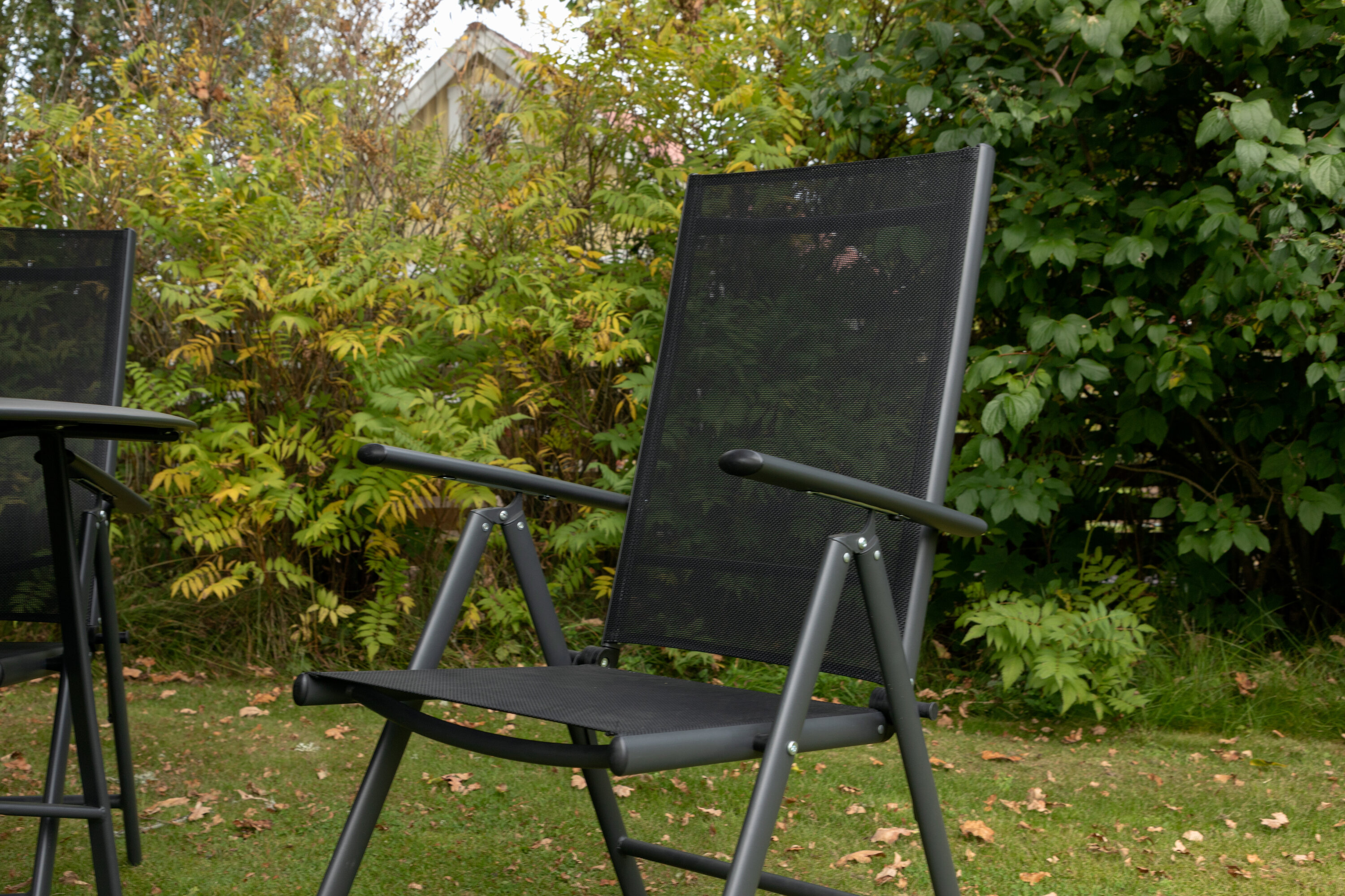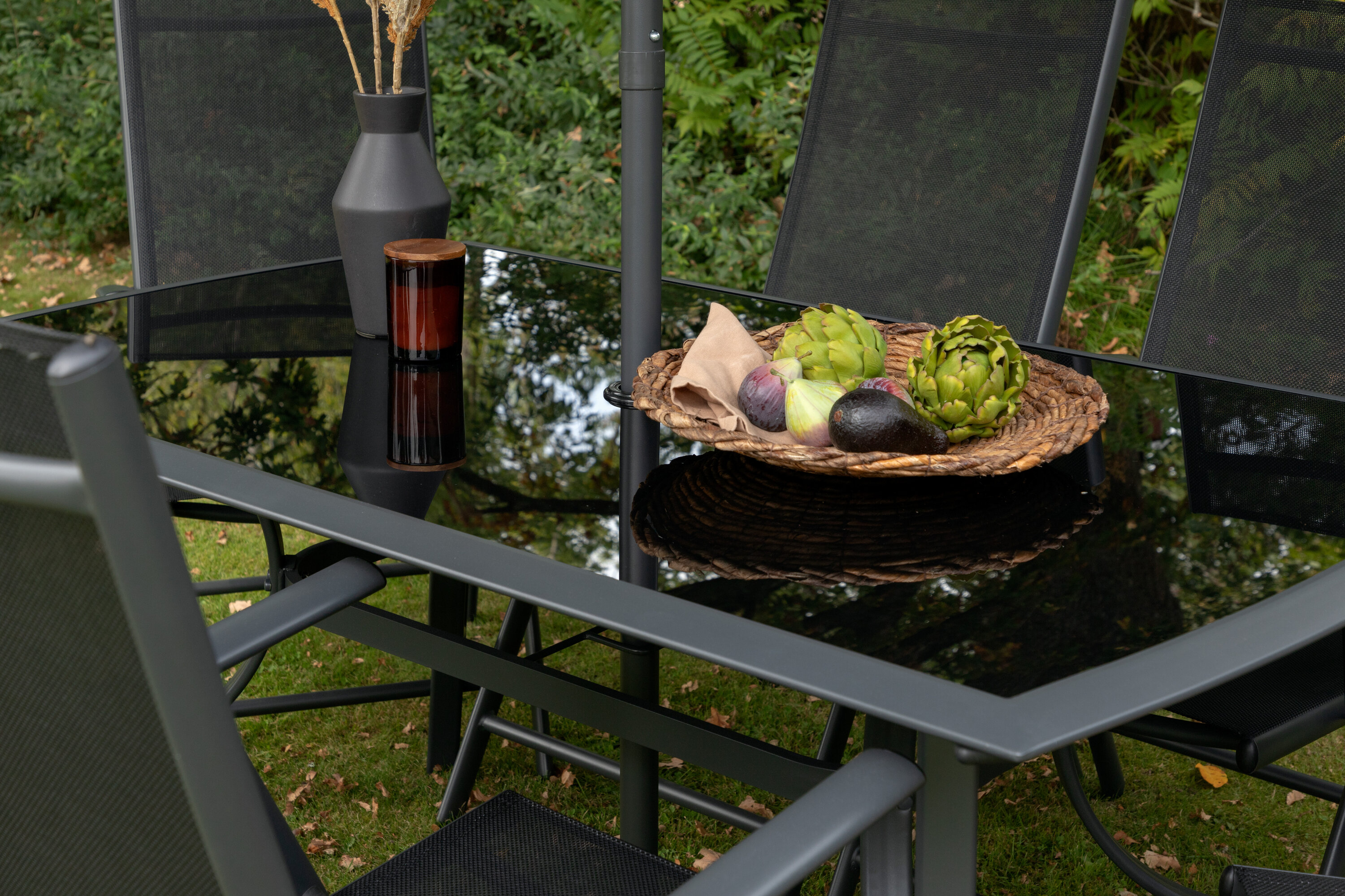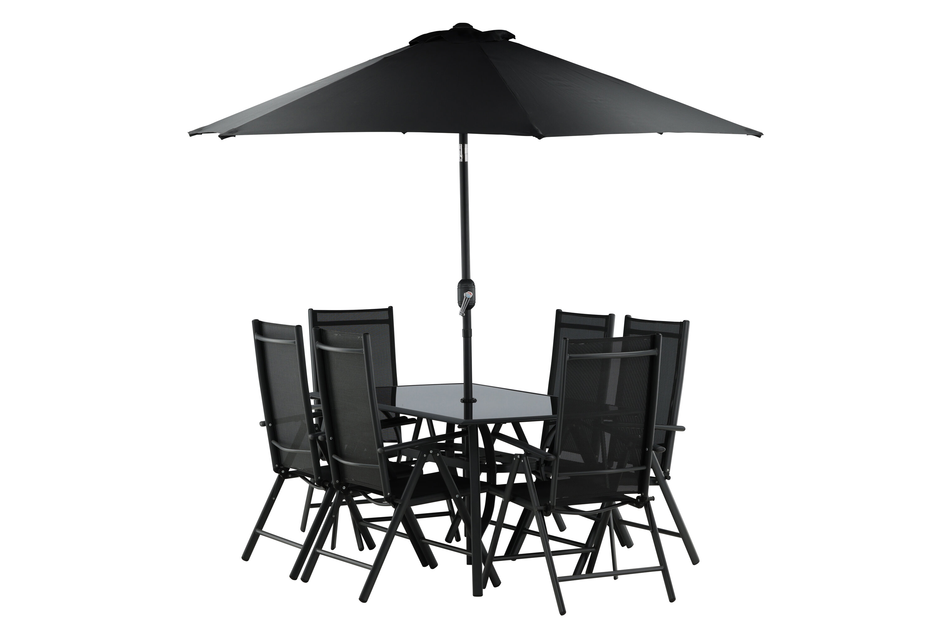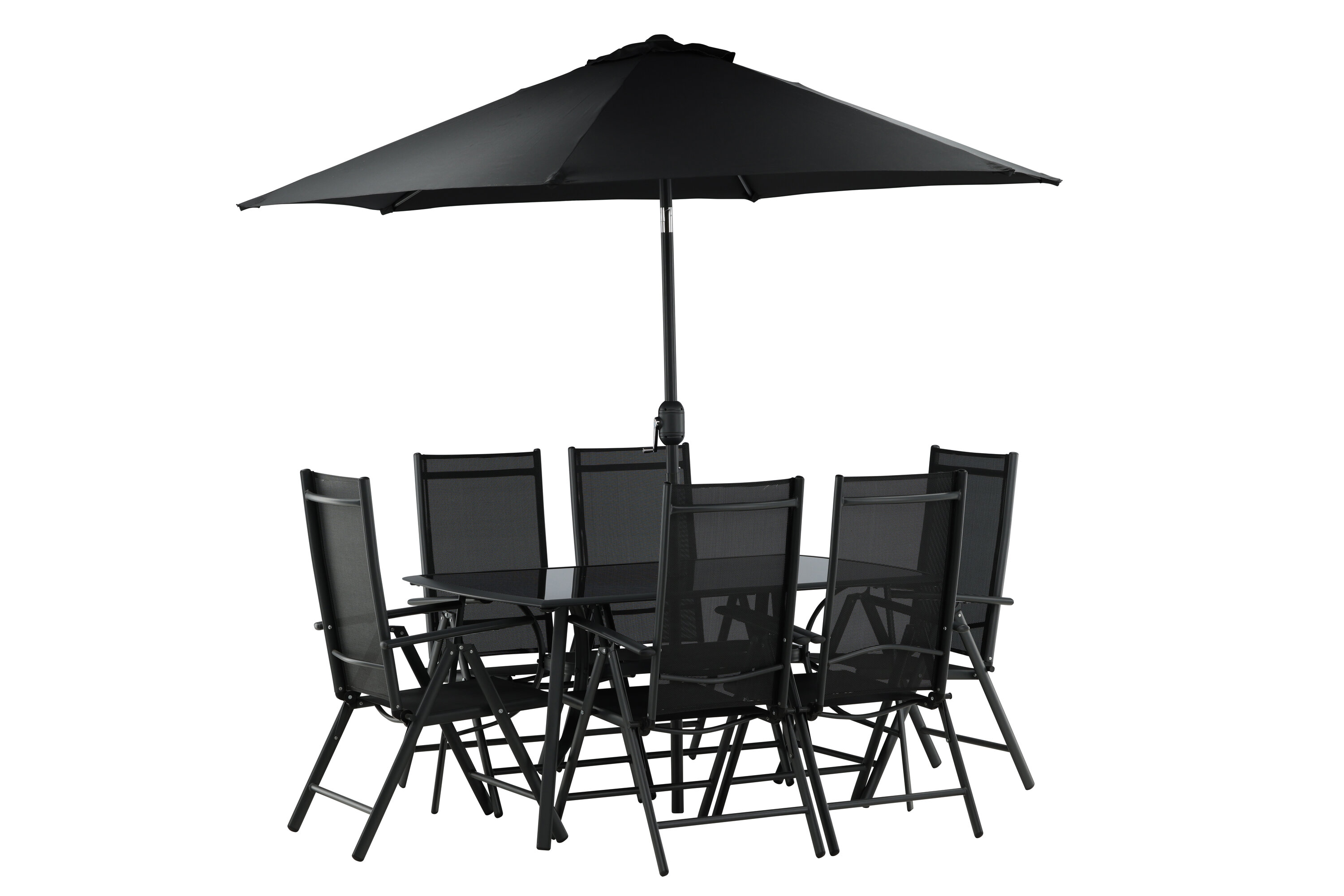 Erfrischen Sie sich eine Weile im Schatten in einer modernen Essgruppe unter einem eleganten Sonnenschirm! Die Brekki Essgruppe bietet sowohl einen stilvollen Esstisch mit einer Tischplatte aus Glas als auch gerade Beine aus schwarzem Aluminium. Hier zusammen mit klappbaren Esszimmerstühlen mit einem Sitz in schwarzer Textilene und Rahmen in Aluminium. Der Sonnenschirm ist in der Mitte des Tisches angebracht und schützt Sie beim Abendessen vor den heißen Sonnenstrahlen. Der Sonnenschirm hat einen schwarzen Stoff mit einem Aluminiumrahmen. Besser geht es nicht!
