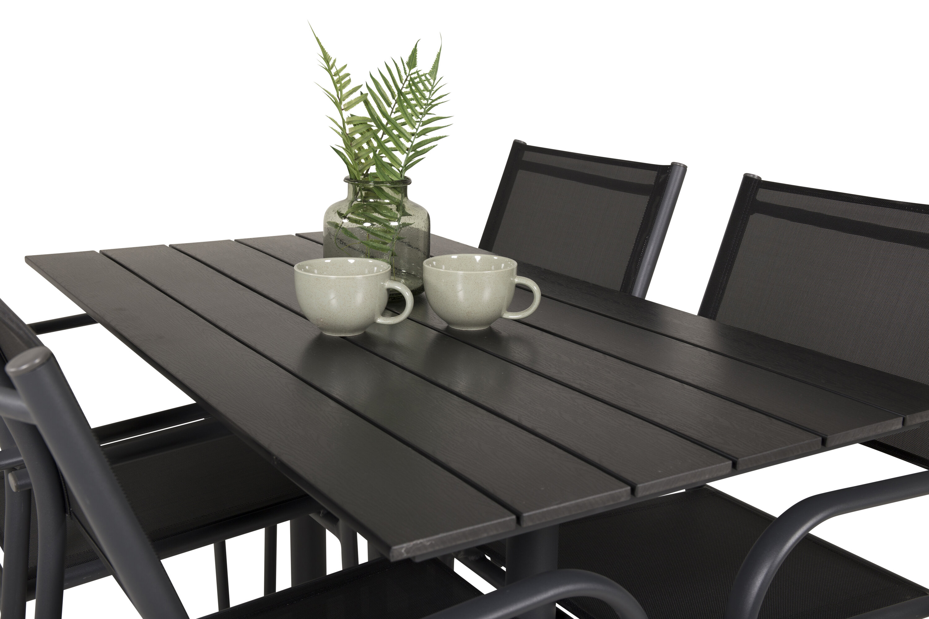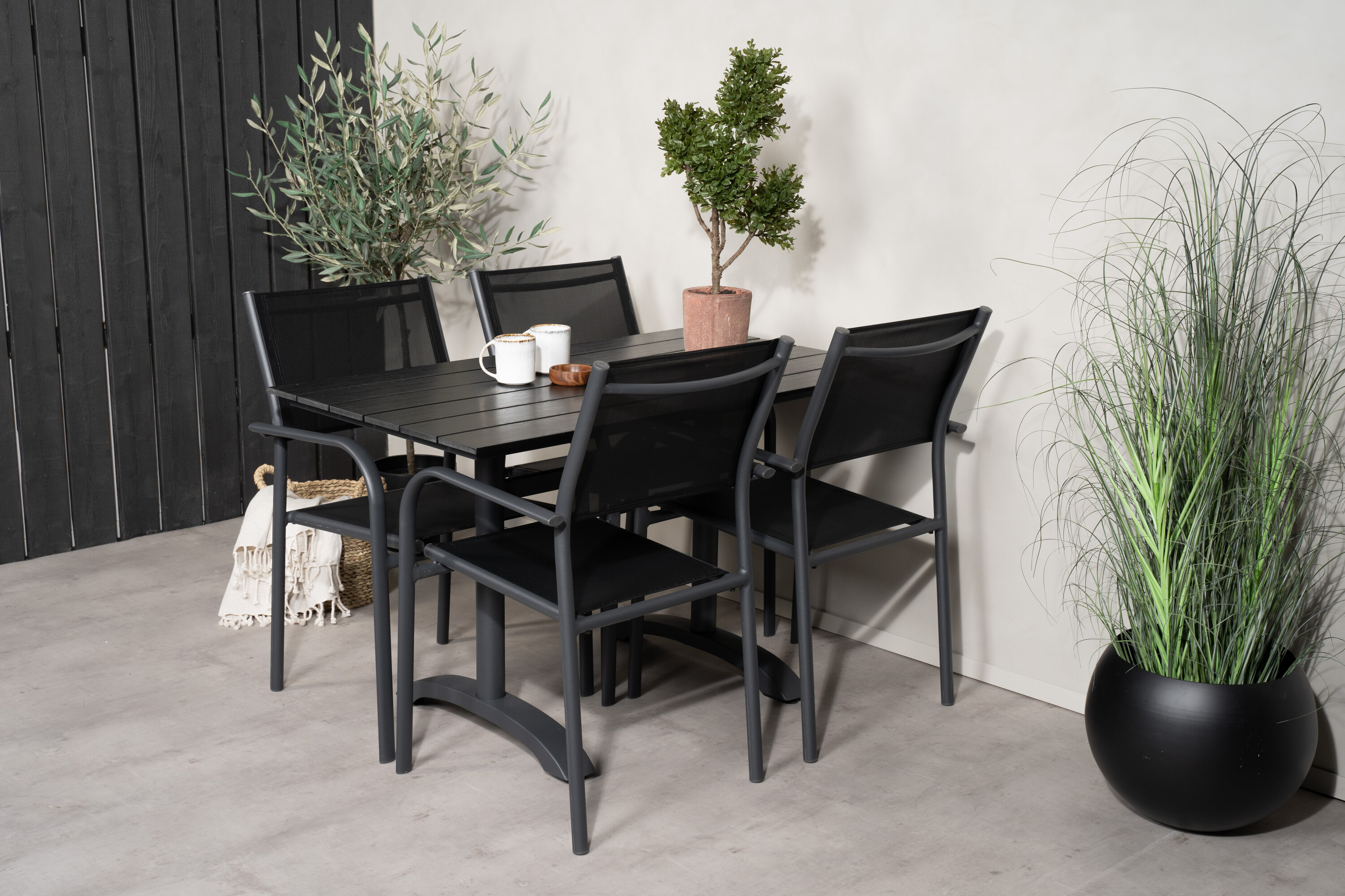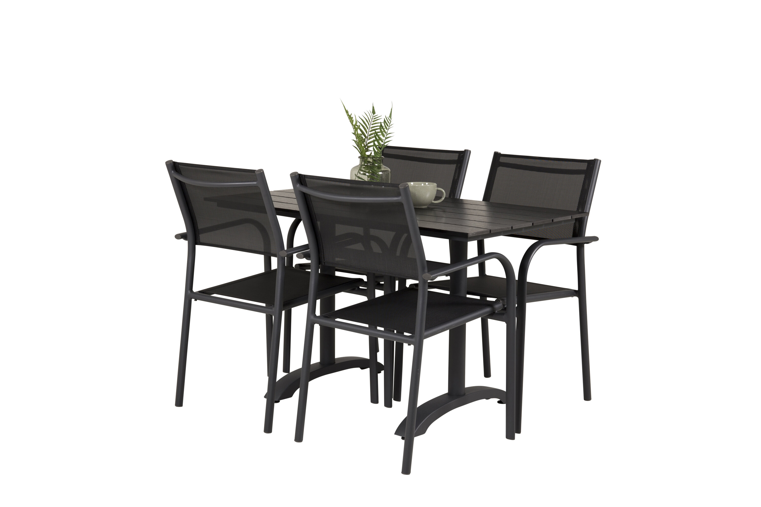 Eine hübsche Essgruppe mit Esstisch aus der Serie Denver und modernen Stühlen aus der Serie Santorini. Perfekt für weniger Platz auf der Terrasse oder dem Balkon!