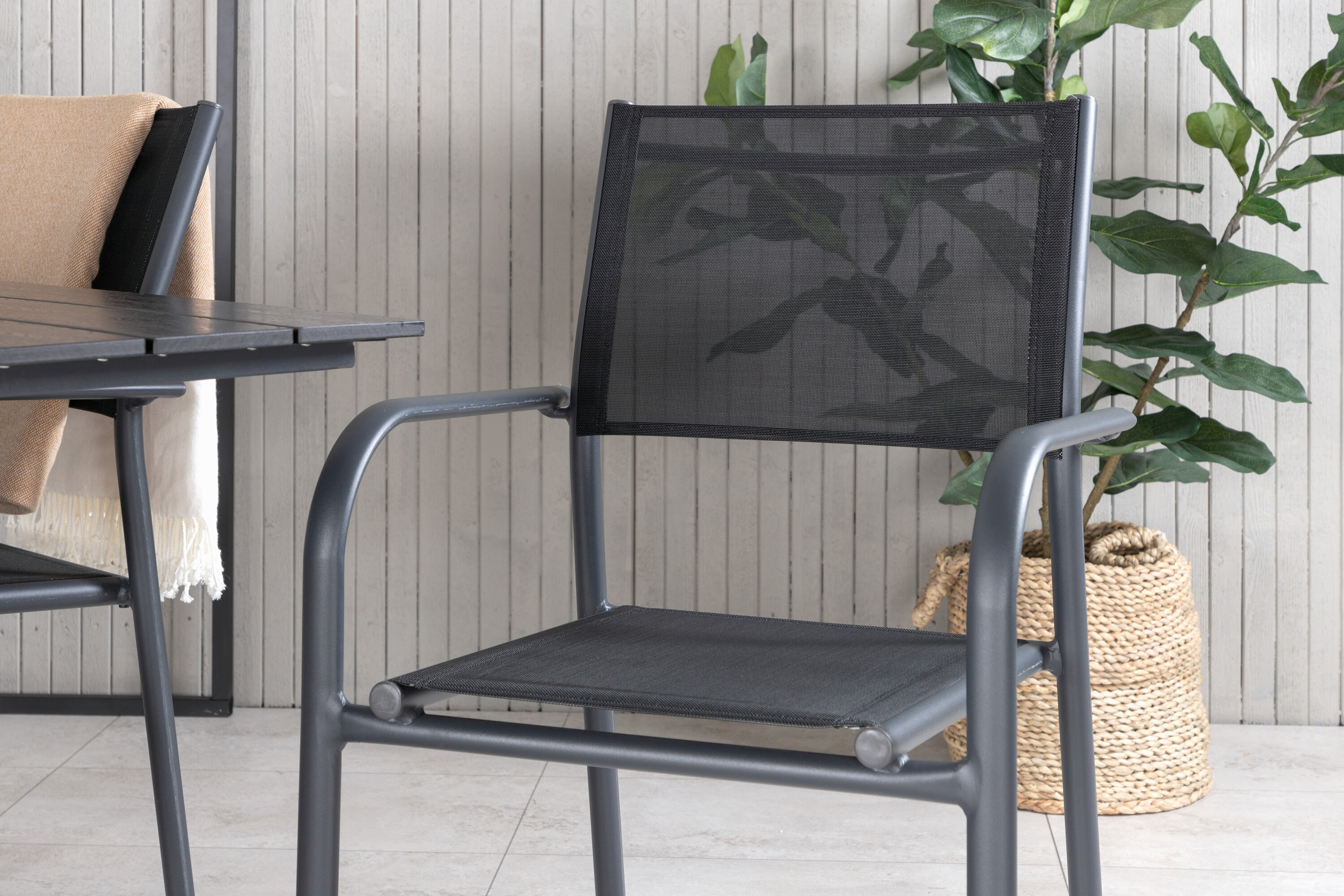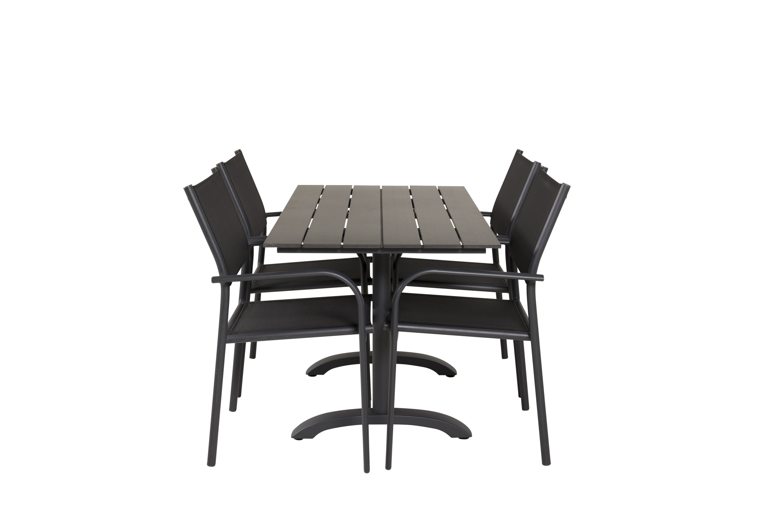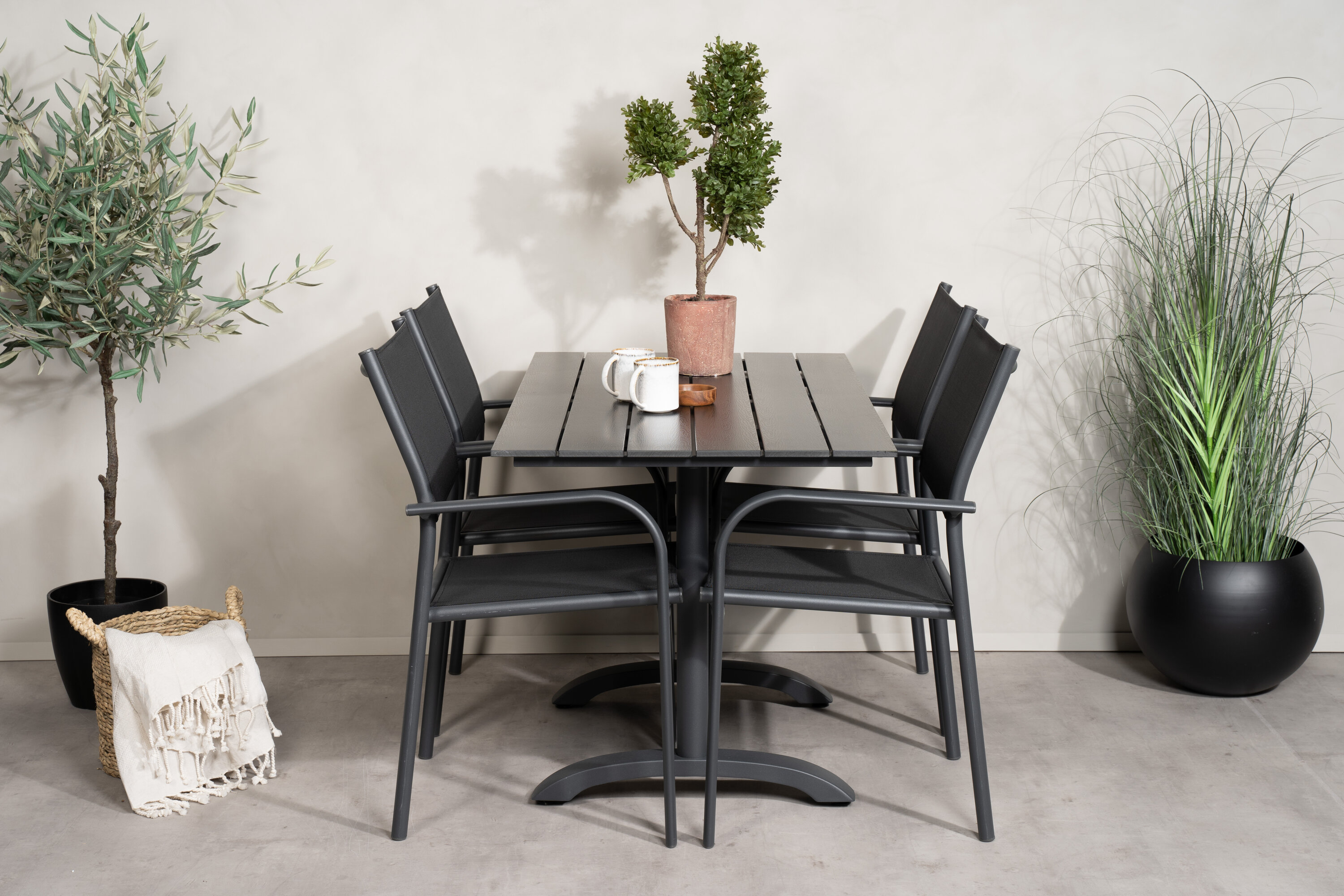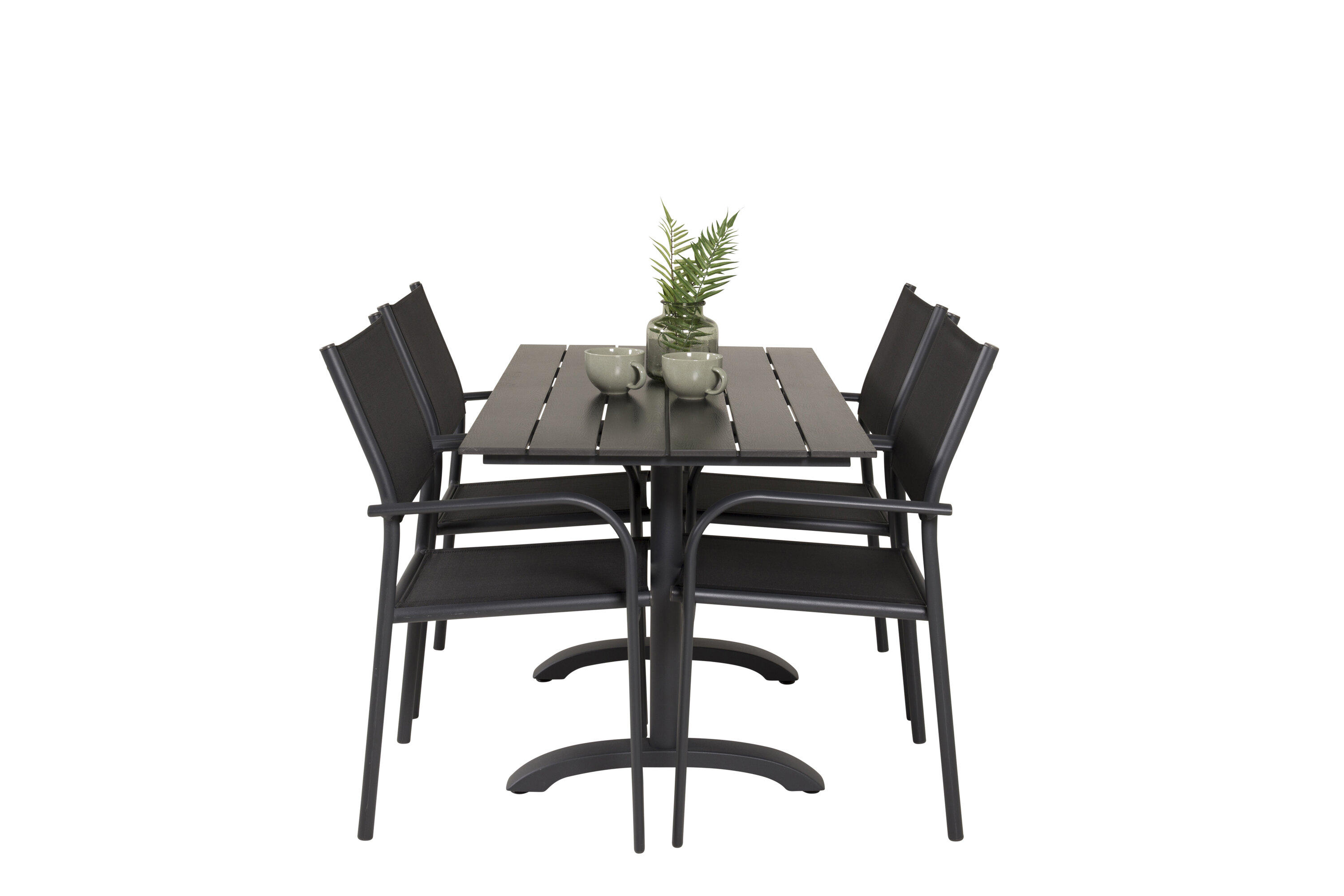Eine hübsche Essgruppe mit Esstisch aus der Serie Denver und modernen Stühlen aus der Serie Santorini. Perfekt für weniger Platz auf der Terrasse oder dem Balkon!
