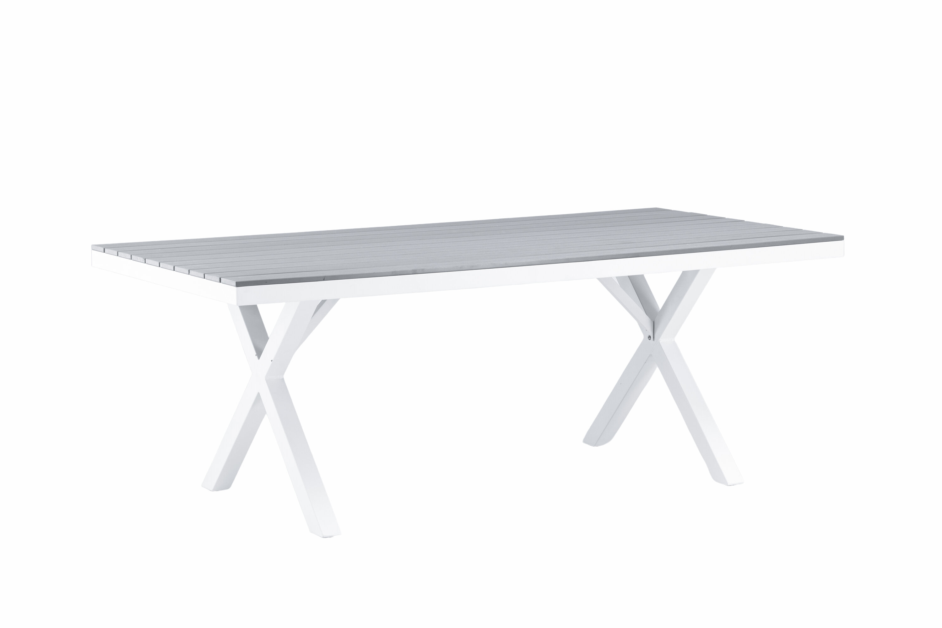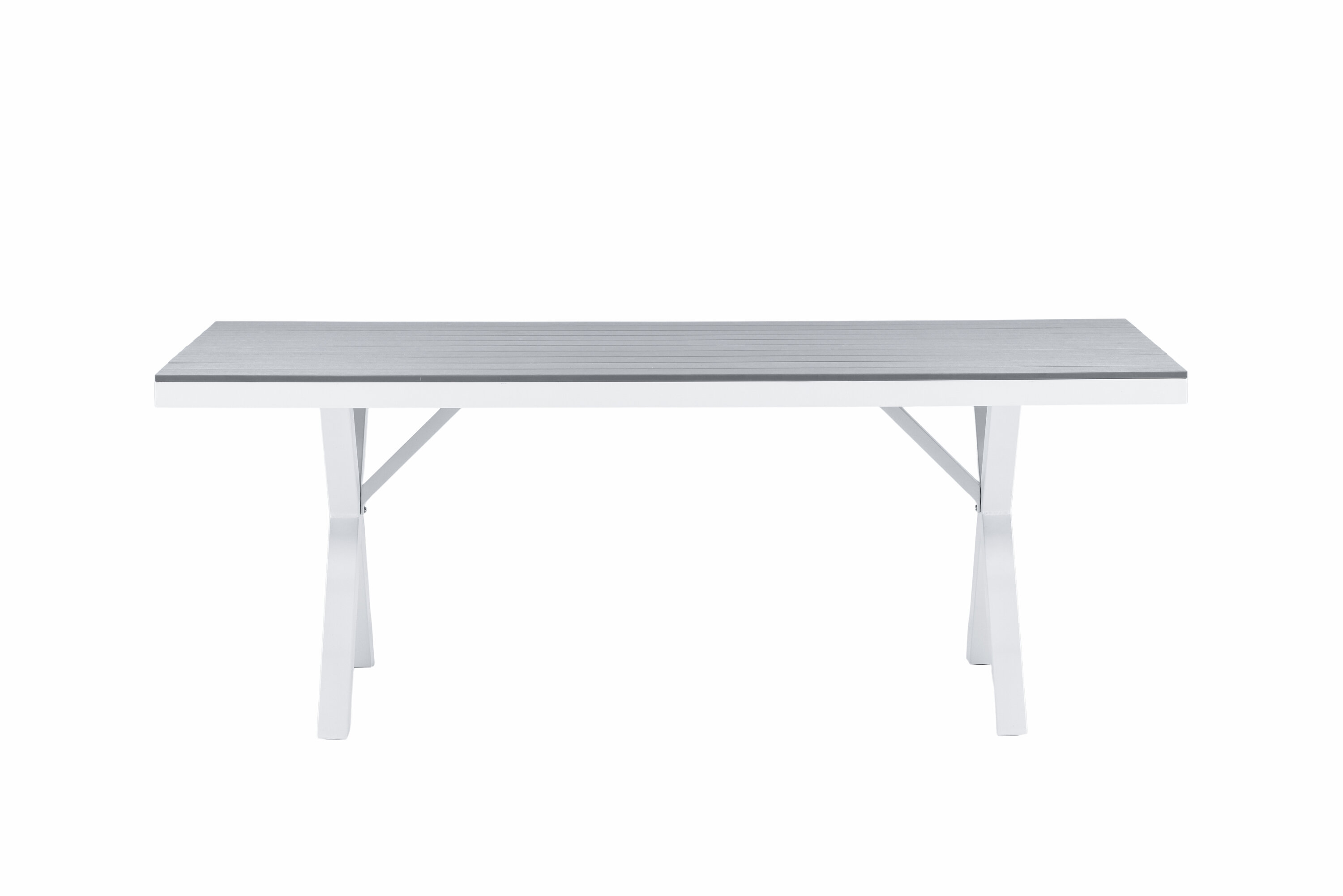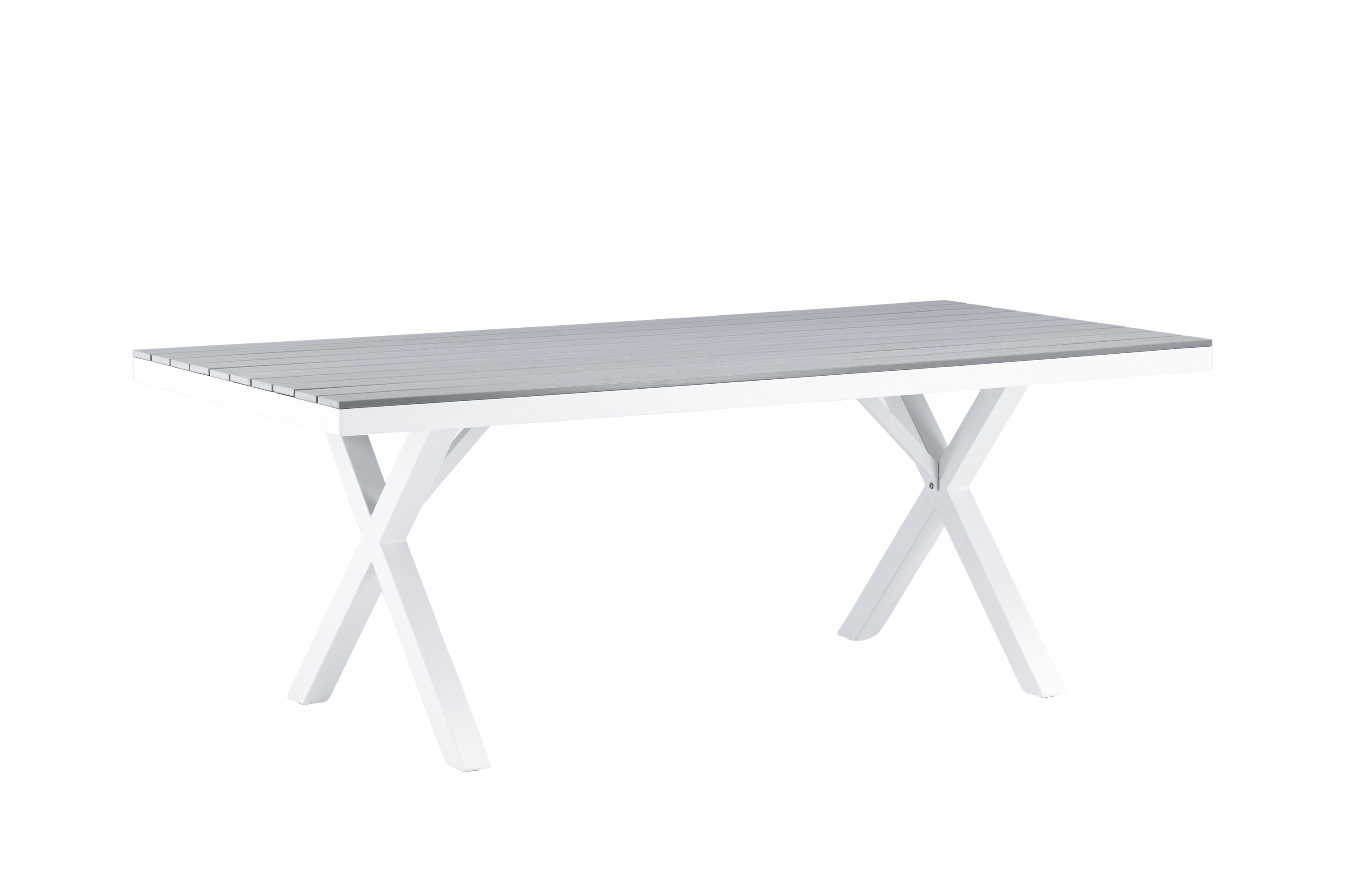 Esstisch aus der Garcia-Serie im klassischen Design mit rechteckiger Tischplatte aus dekorativem Holz - so langlebig wie stilvoll! Der Rahmen besteht aus weißem Aluminium, das leicht ist und den Tisch leicht zu bewegen macht. Der Tisch ist perfekt für den Außenbereich geeignet und passt daher im Wintergarten genauso gut wie im Garten. Kombinieren Sie mit unseren Esszimmerstühlen der gleichen Serie für einen kompletten Look und schaffen Sie einen Blickfang auf Ihrer Terrasse. Hier können Sie in diesem Sommer Ihre Lieben zu brillanten Mahlzeiten versammeln!