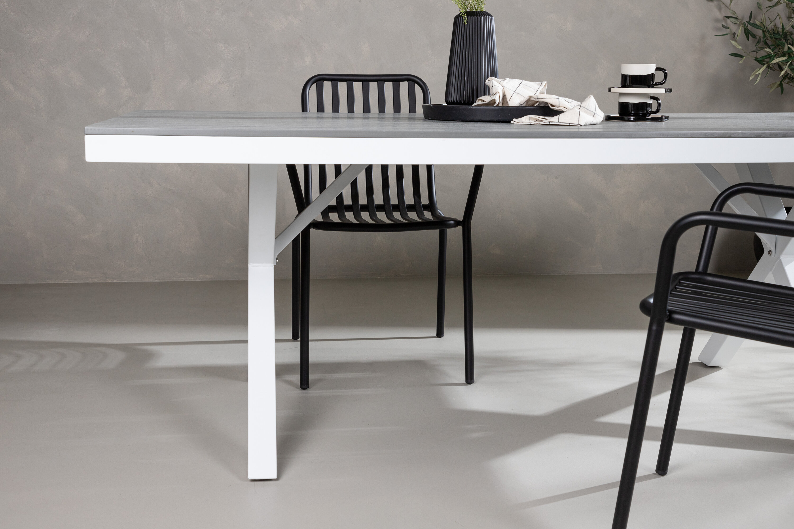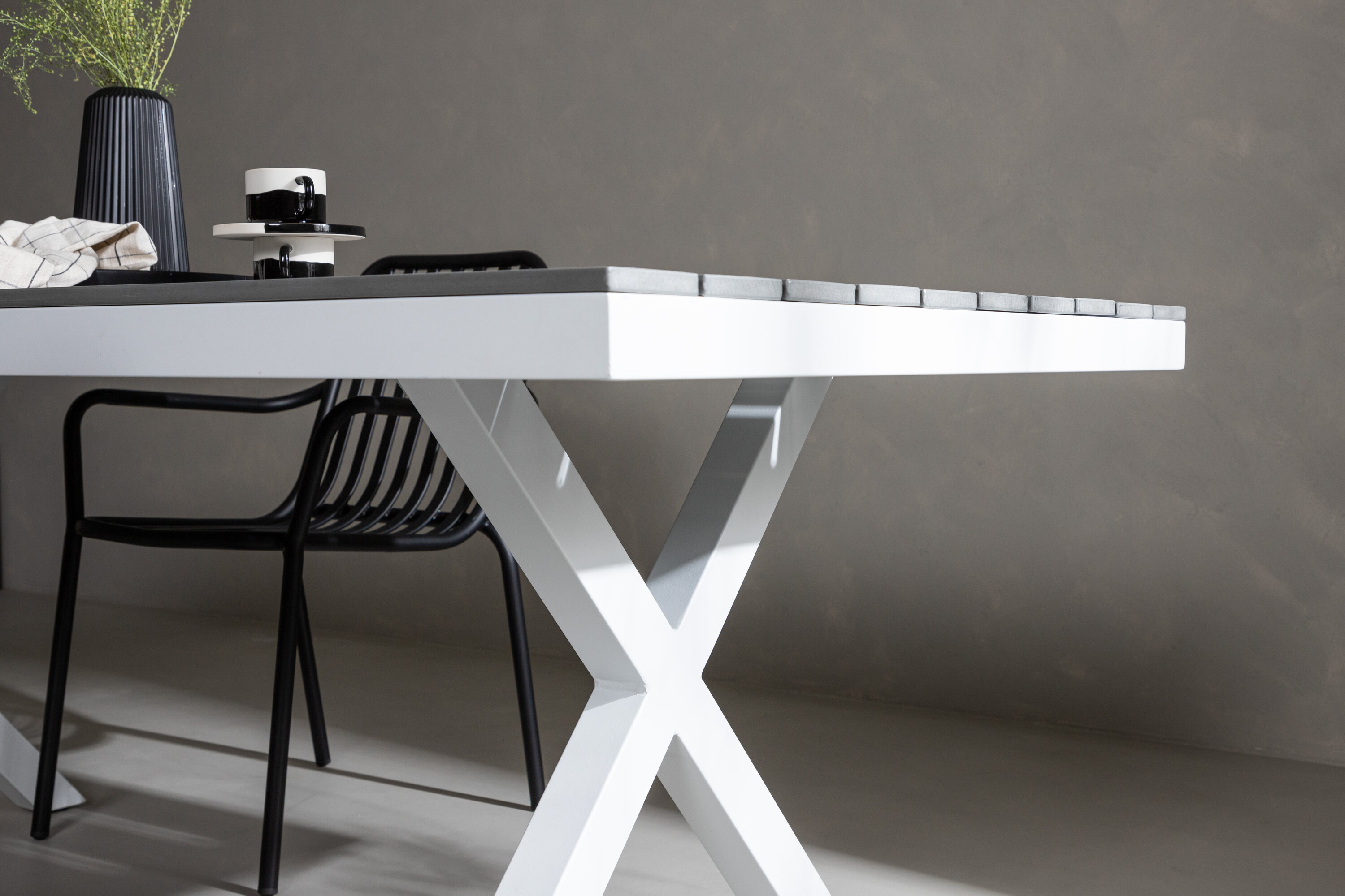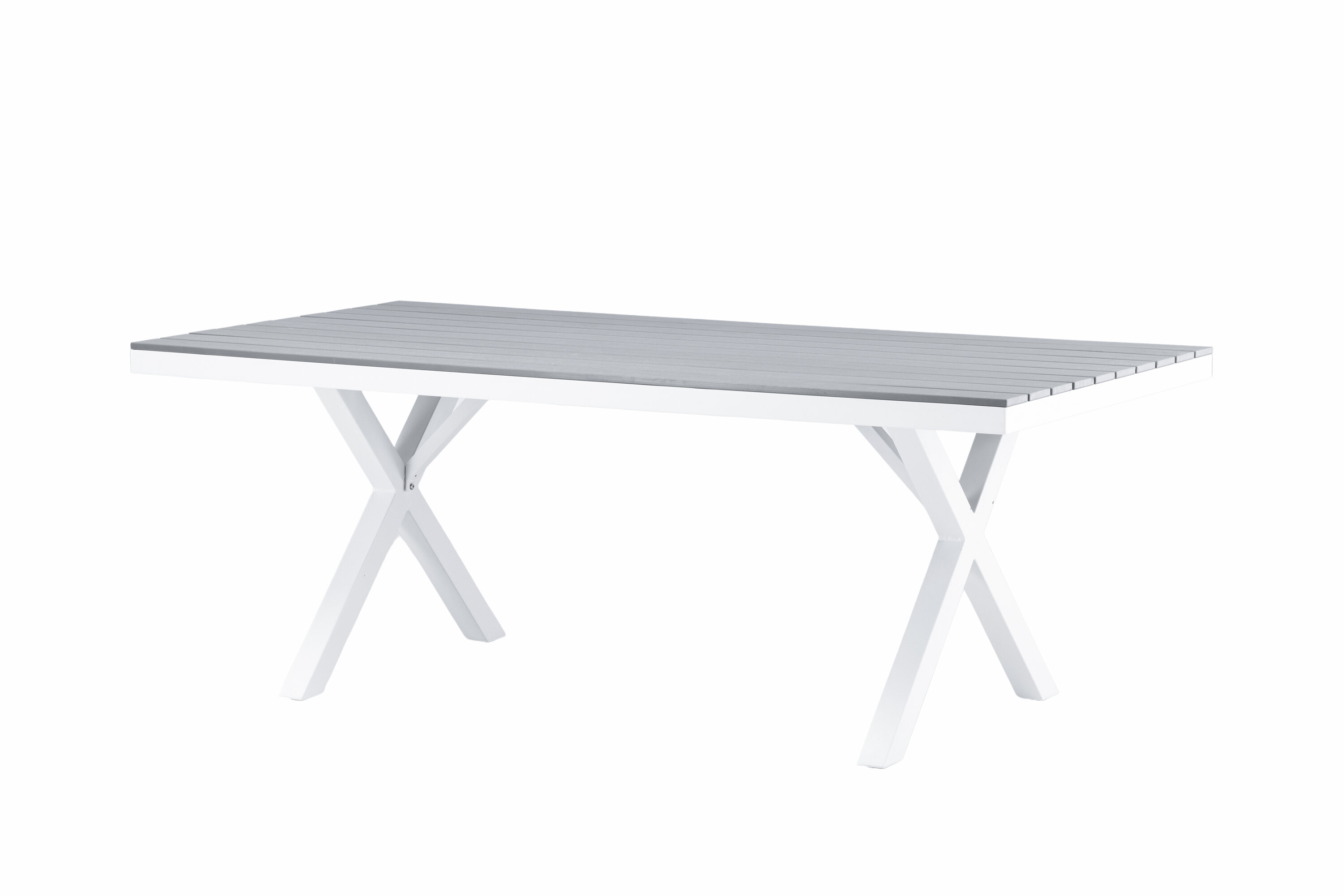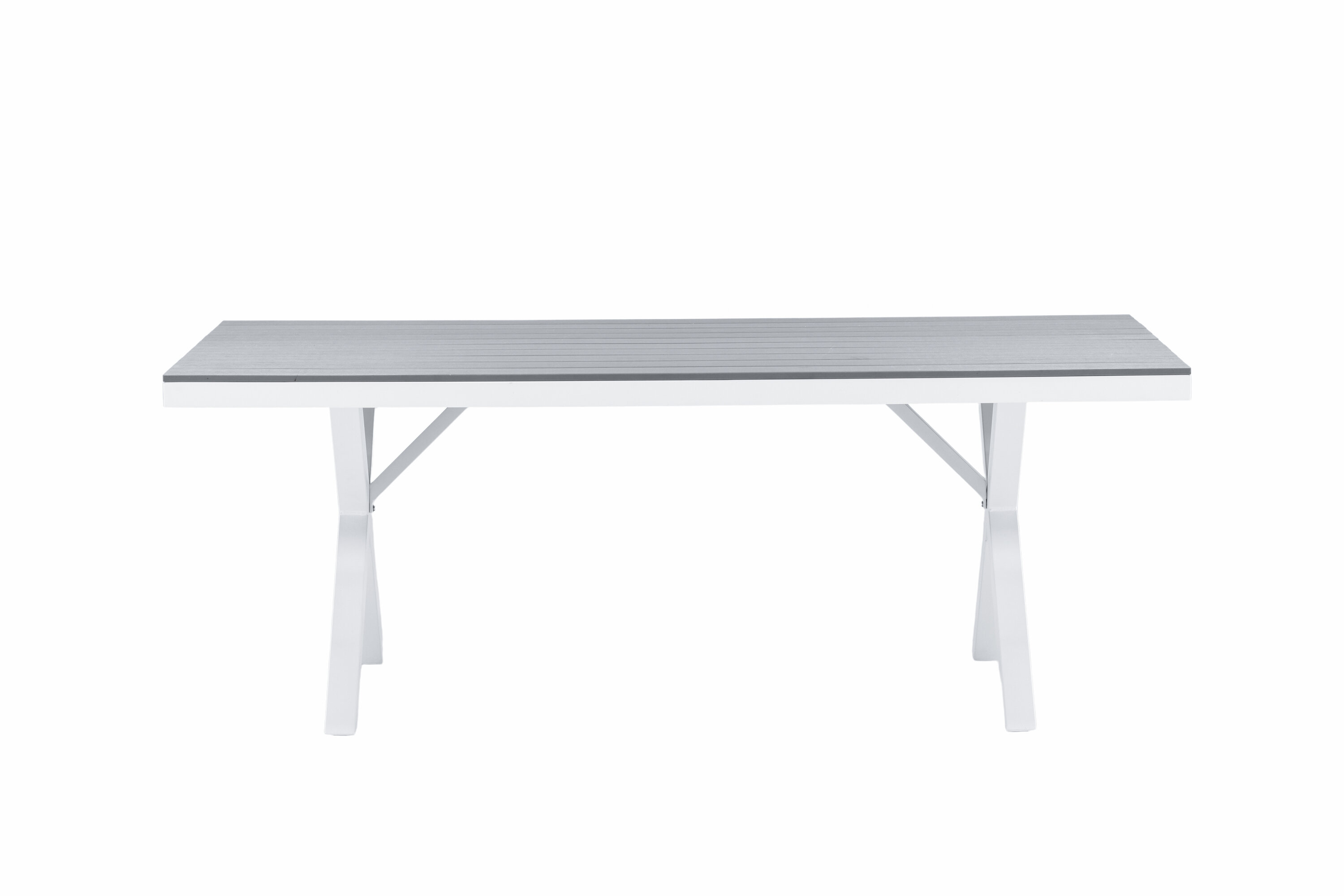Esstisch aus der Garcia-Serie im klassischen Design mit rechteckiger Tischplatte aus dekorativem Holz - so langlebig wie stilvoll! Der Rahmen besteht aus weißem Aluminium, das leicht ist und den Tisch leicht zu bewegen macht. Der Tisch ist perfekt für den Außenbereich geeignet und passt daher im Wintergarten genauso gut wie im Garten. Kombinieren Sie mit unseren Esszimmerstühlen der gleichen Serie für einen kompletten Look und schaffen Sie einen Blickfang auf Ihrer Terrasse. Hier können Sie in diesem Sommer Ihre Lieben zu brillanten Mahlzeiten versammeln!