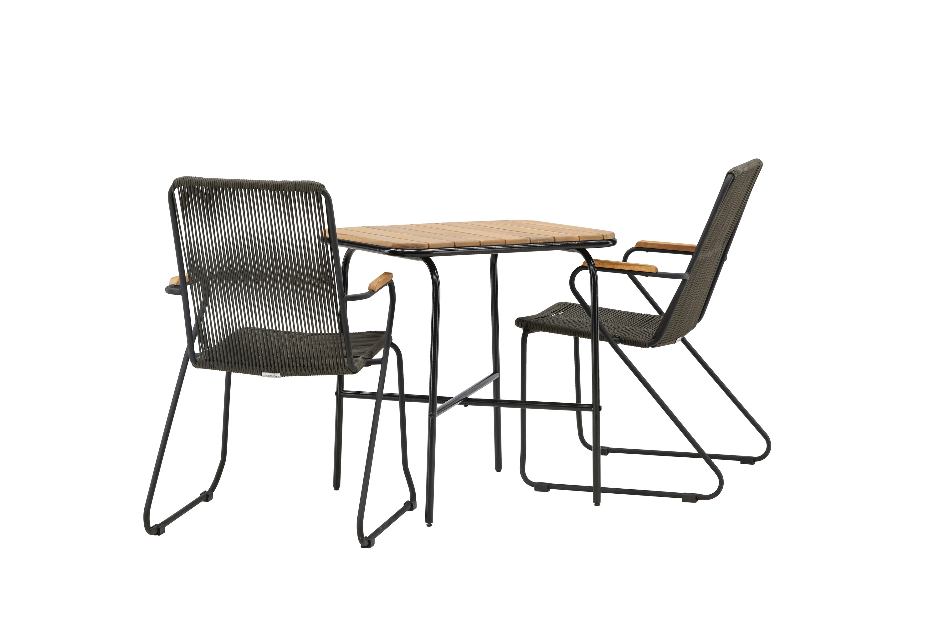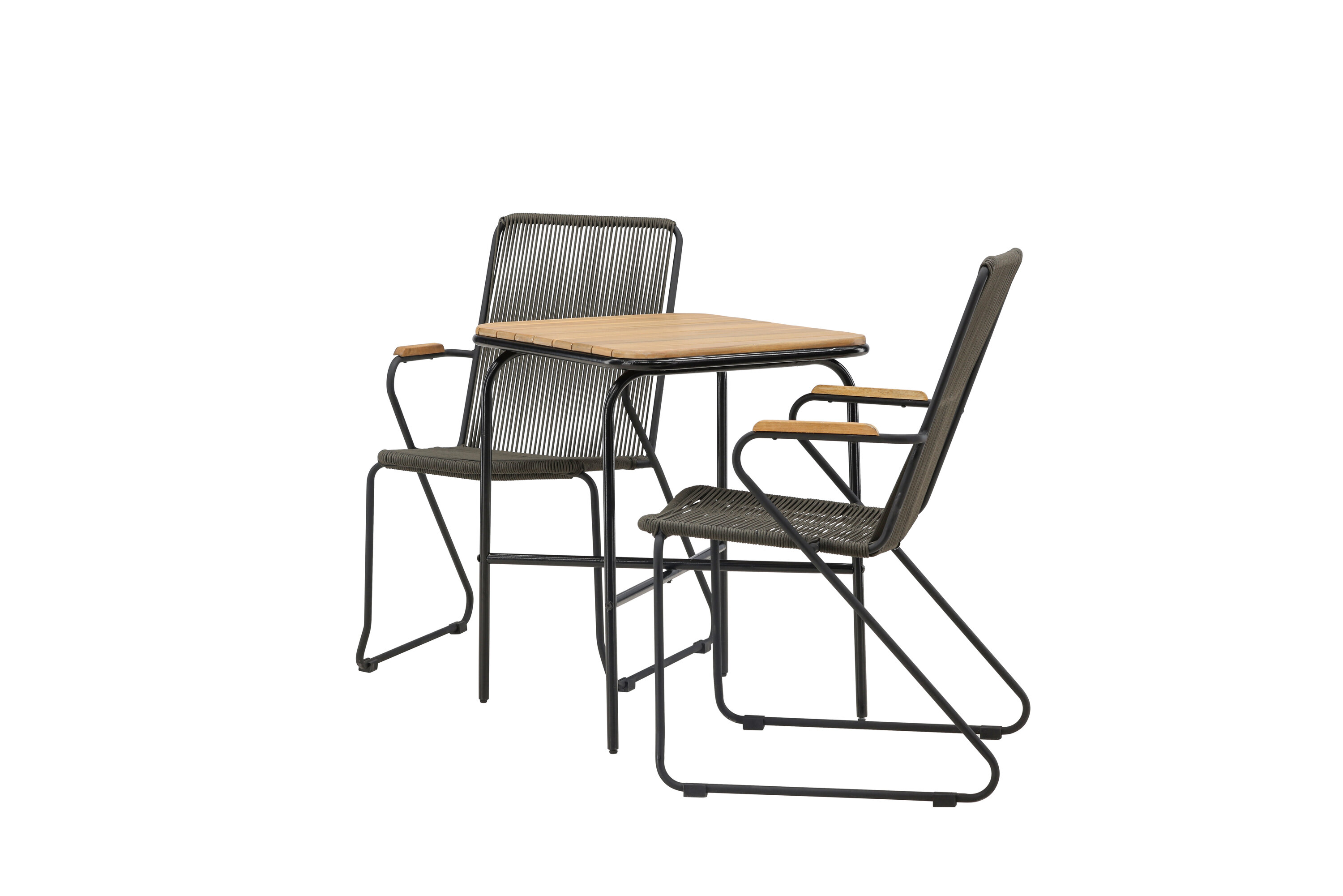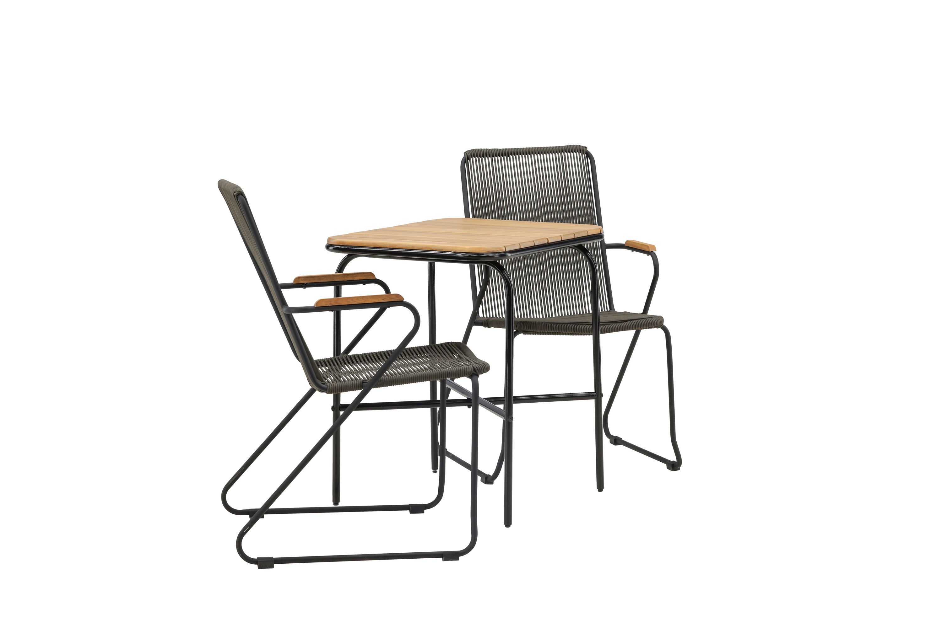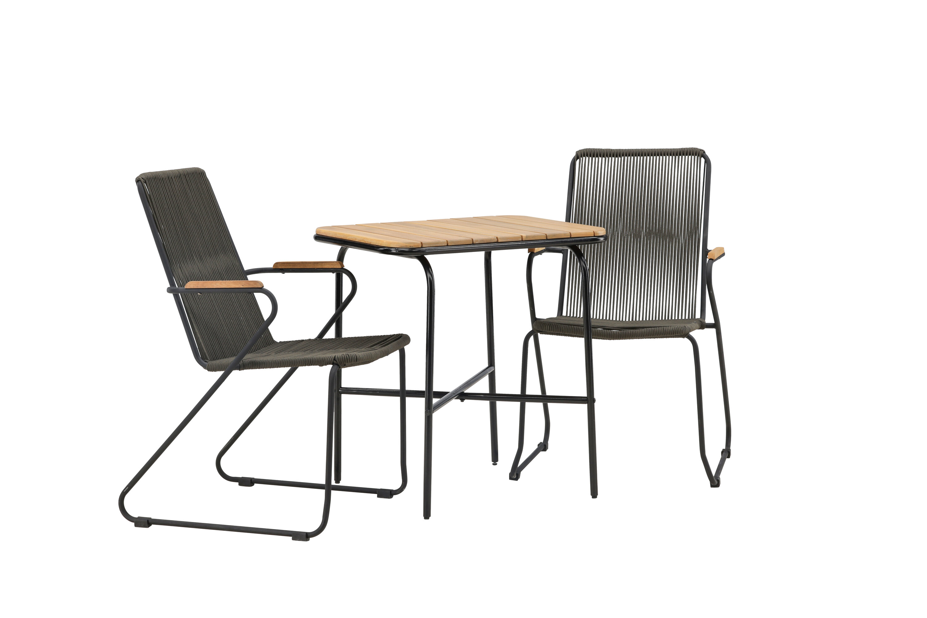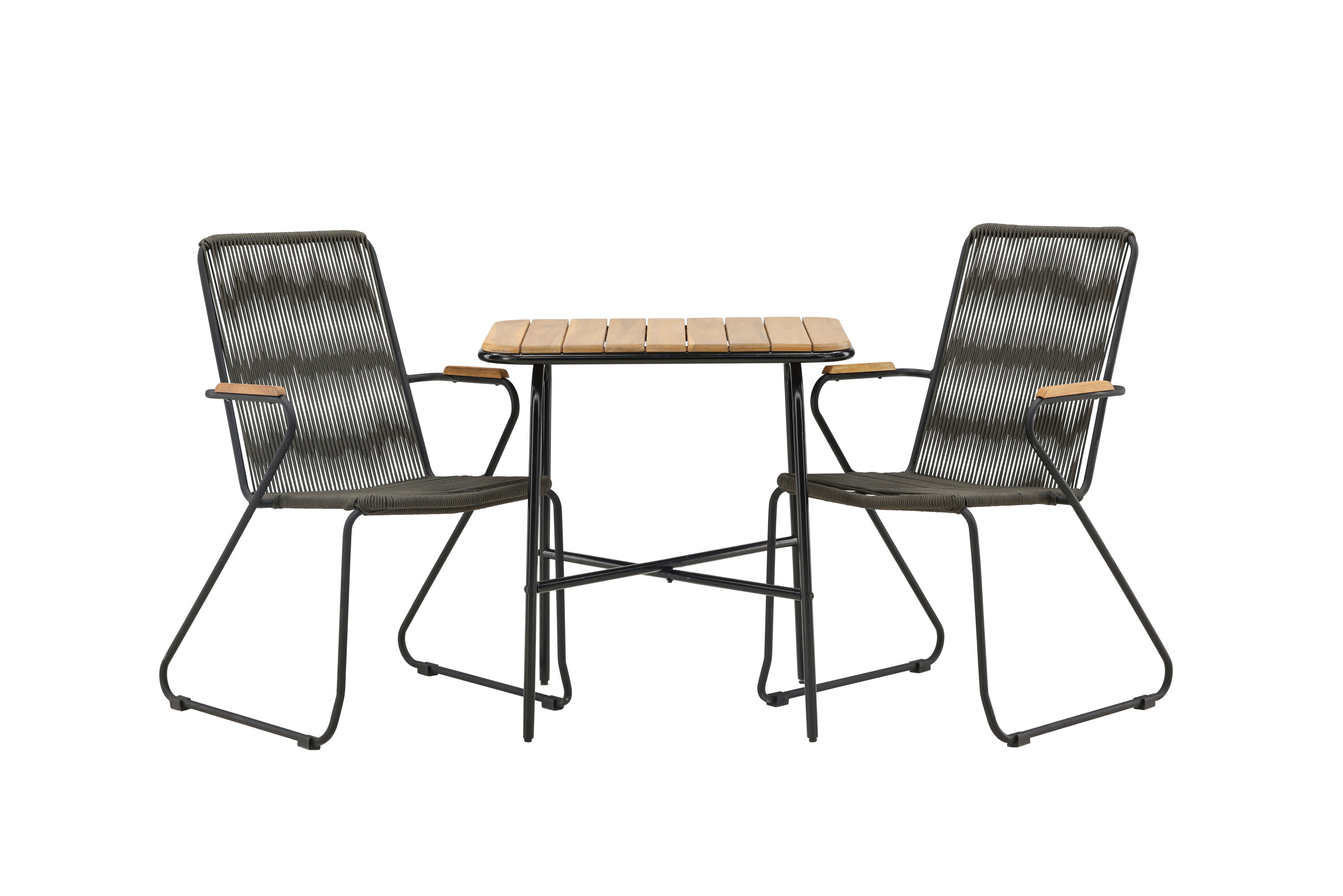 Eine angenehme und charmante Café-Gruppe auf dem kleinen Balkon oder der Terrasse! Unser stilvoller Café-Tisch Holmbeck hat eine moderne, gerippte Tischplatte aus Akazienholz und eine minimalistische Basis aus schwarzem Stahl. Hier zusammen mit 2 grauen Esszimmerstühlen aus der Serie Bois. Der Stuhl hat einen Sitz aus strapazierfähigem Seil in einer beliebten grauen Farbe und einen schmalen Rahmen aus schwarzem Stahl. Decken Sie den Tisch für Kaffee und genießen Sie einen gemütlichen Moment im Freien! Tischmaße: 74x70x55cm.