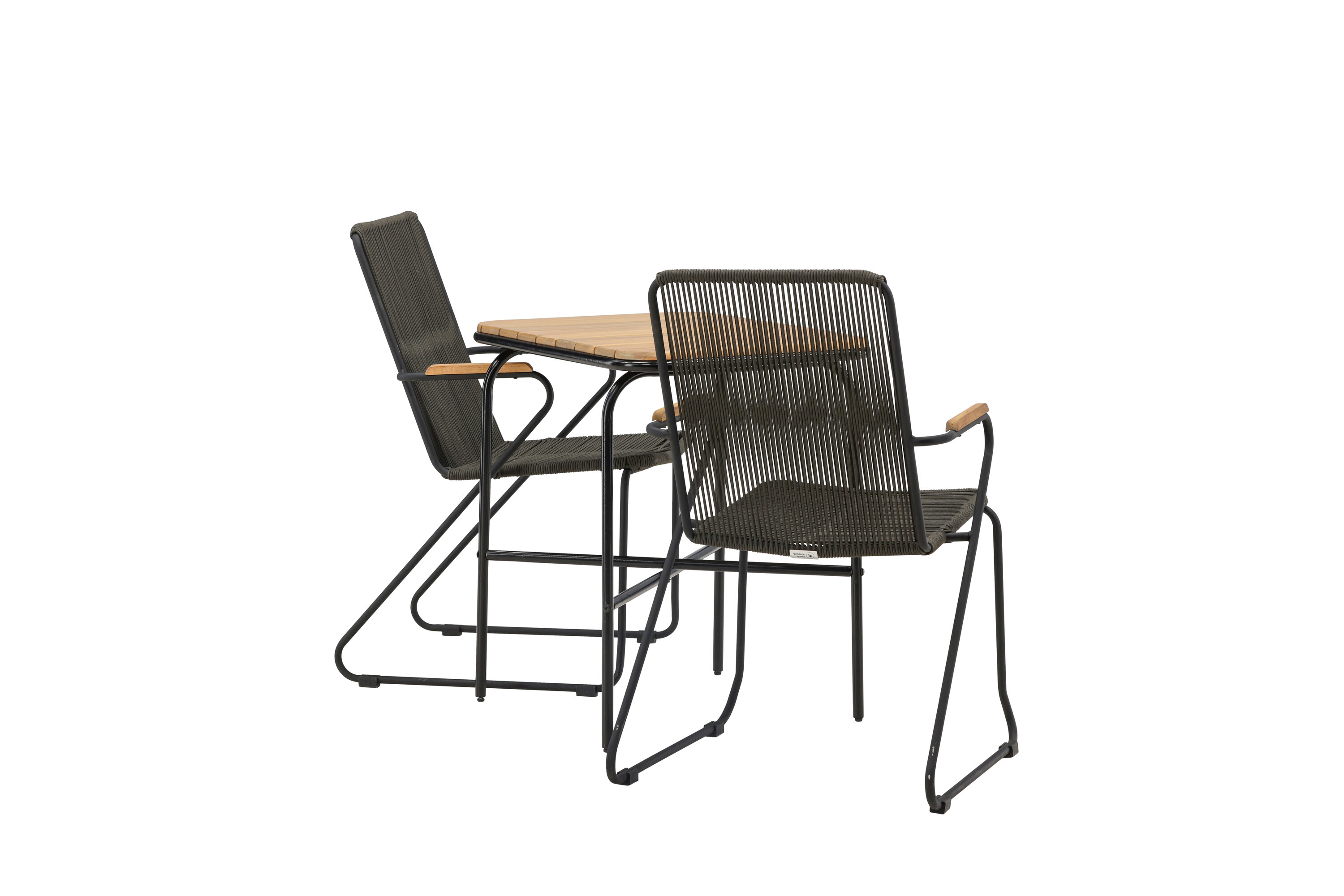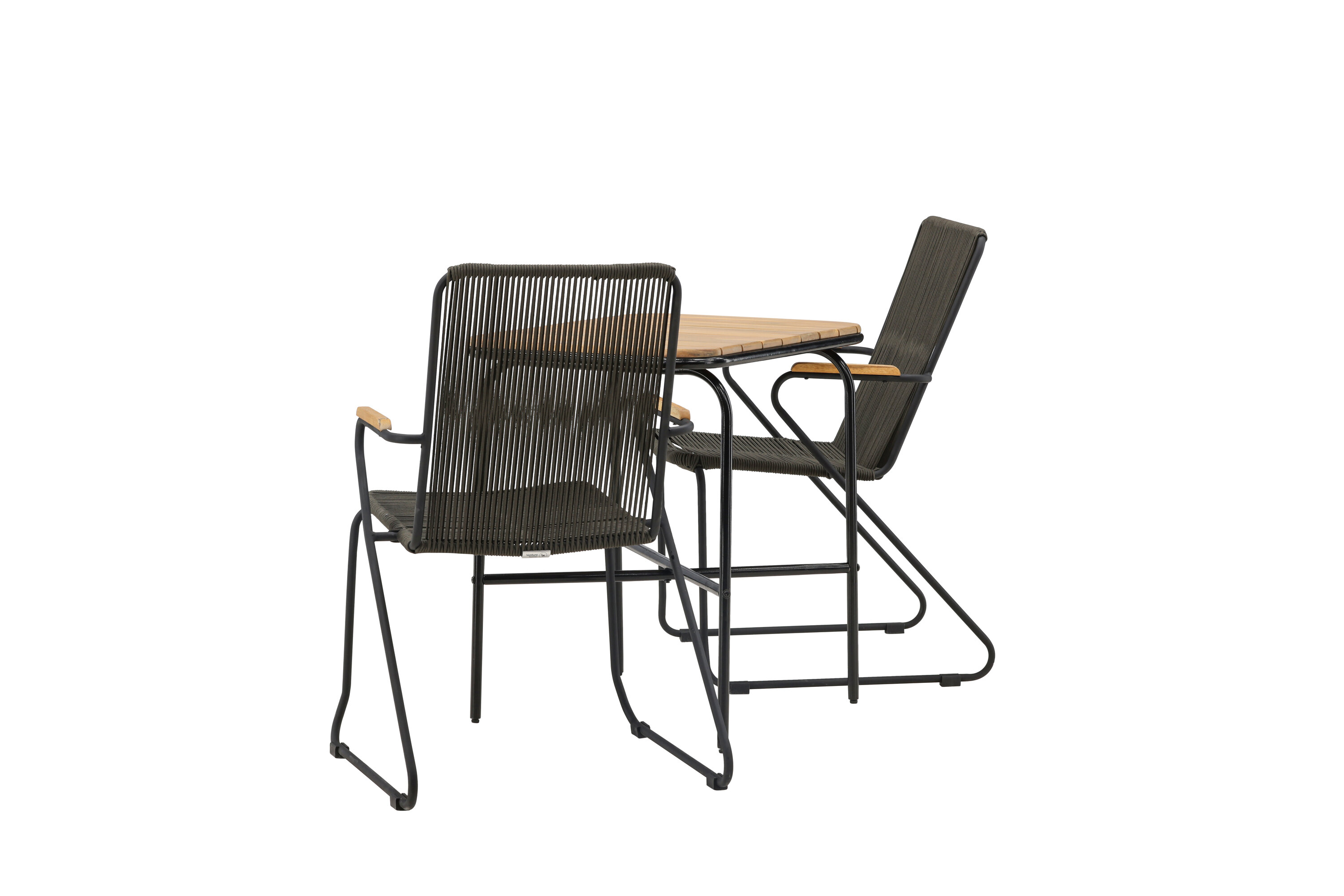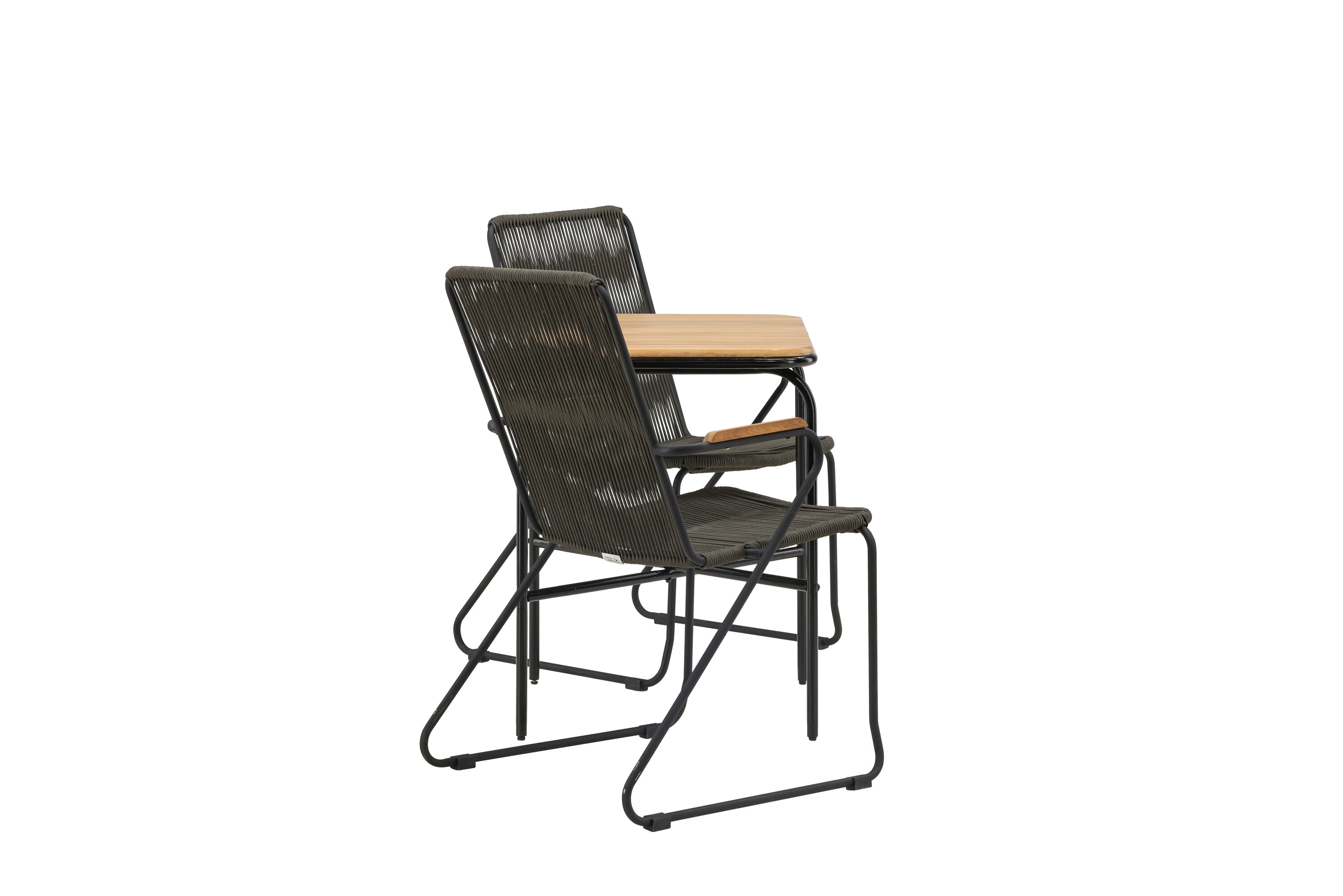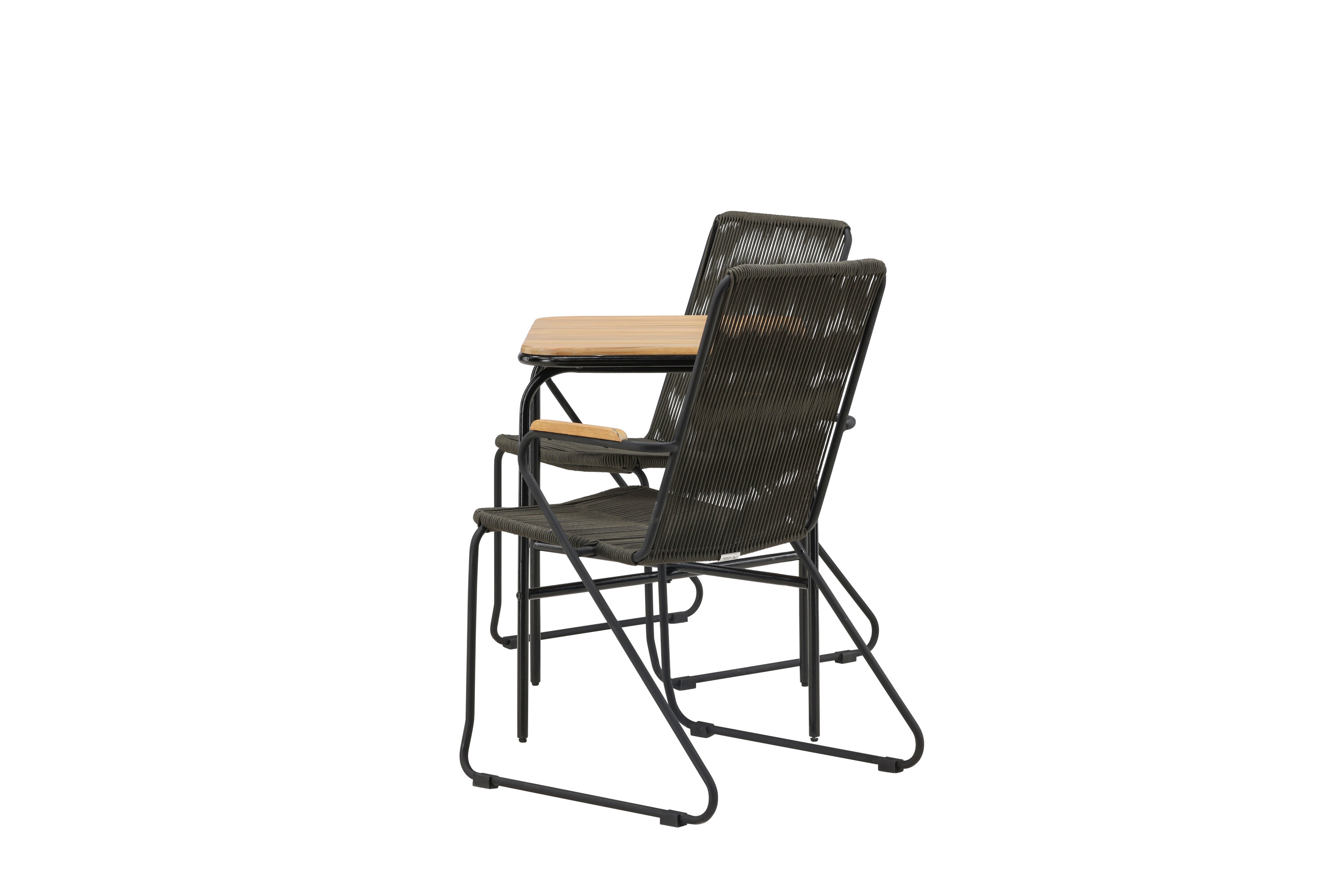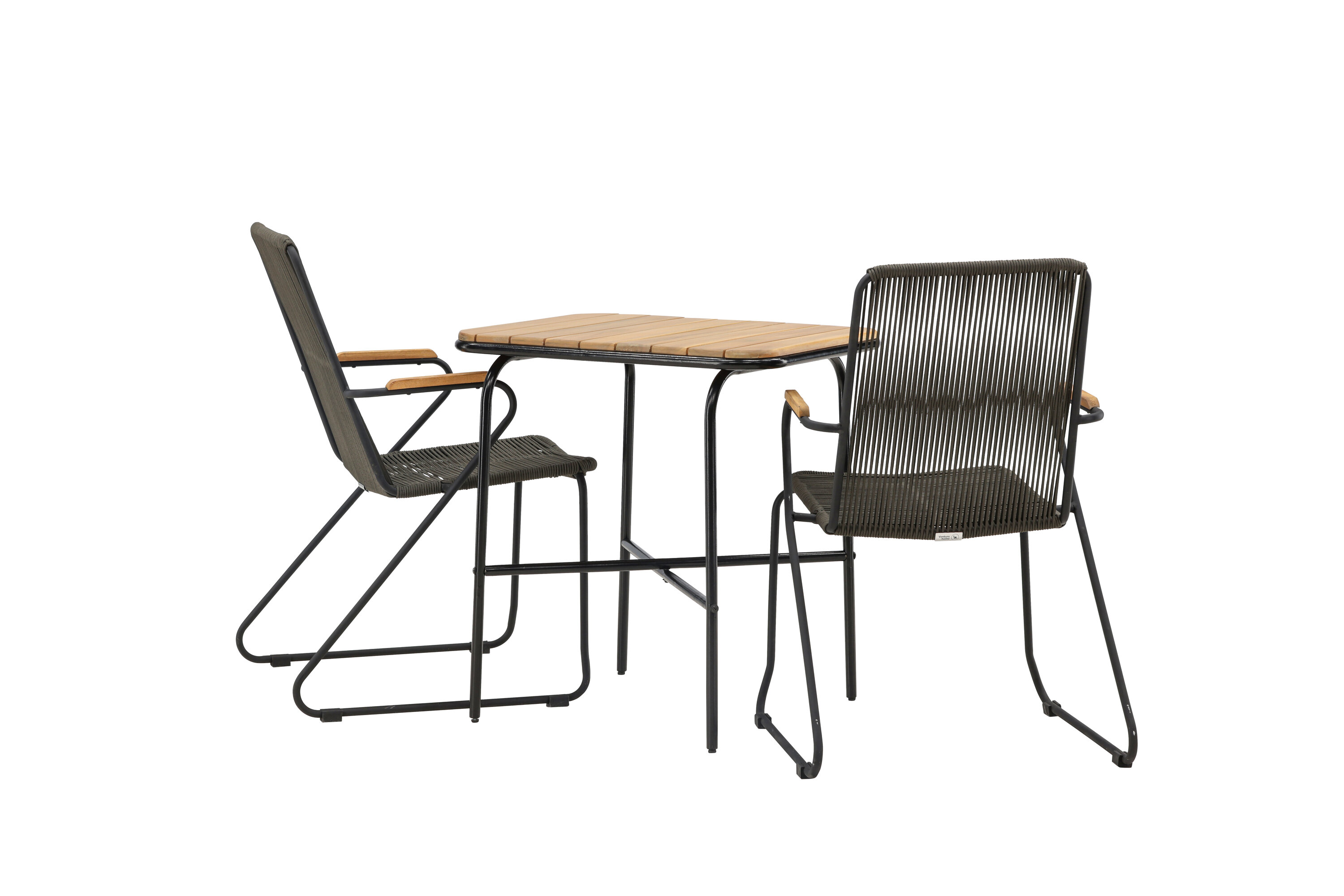 Eine angenehme und charmante Café-Gruppe auf dem kleinen Balkon oder der Terrasse! Unser stilvoller Café-Tisch Holmbeck hat eine moderne, gerippte Tischplatte aus Akazienholz und eine minimalistische Basis aus schwarzem Stahl. Hier zusammen mit 2 grauen Esszimmerstühlen aus der Serie Bois. Der Stuhl hat einen Sitz aus strapazierfähigem Seil in einer beliebten grauen Farbe und einen schmalen Rahmen aus schwarzem Stahl. Decken Sie den Tisch für Kaffee und genießen Sie einen gemütlichen Moment im Freien! Tischmaße: 74x70x55cm.