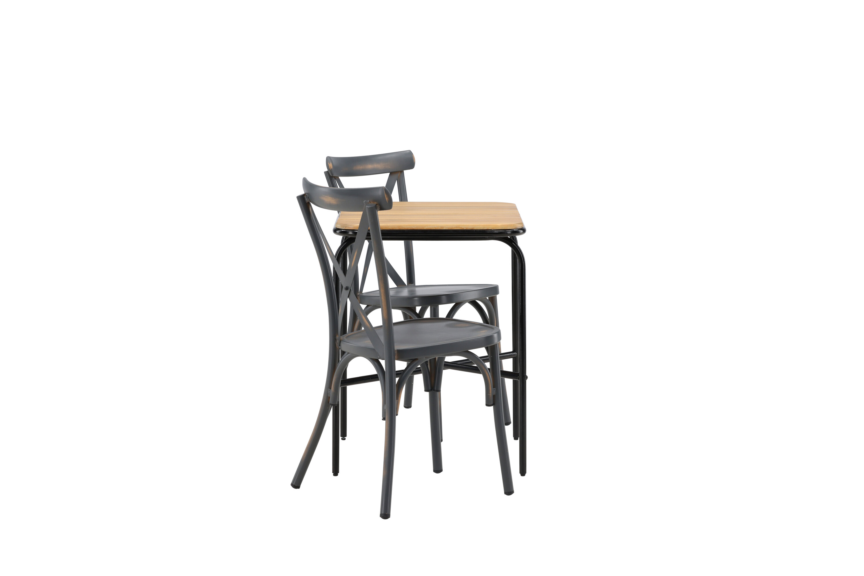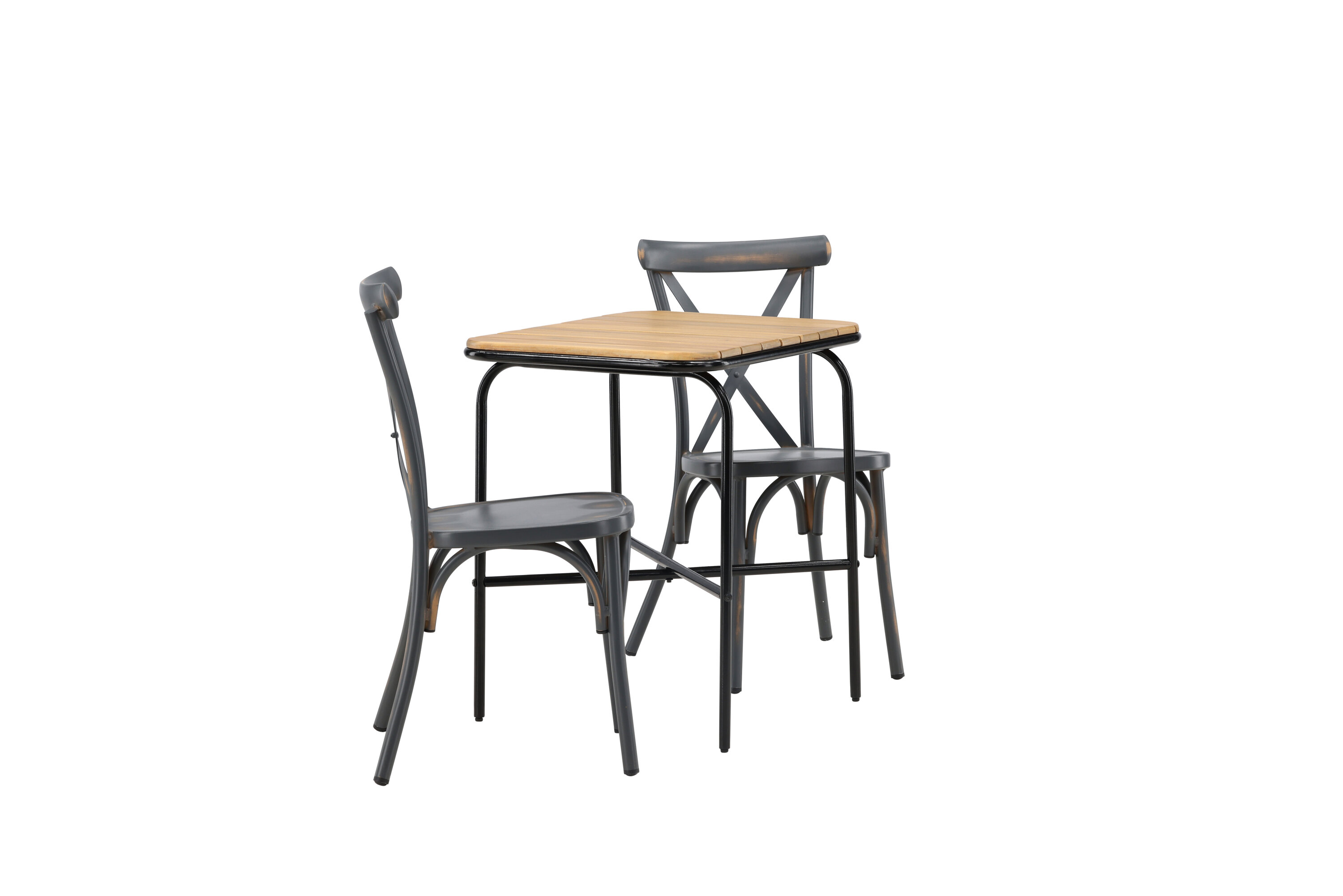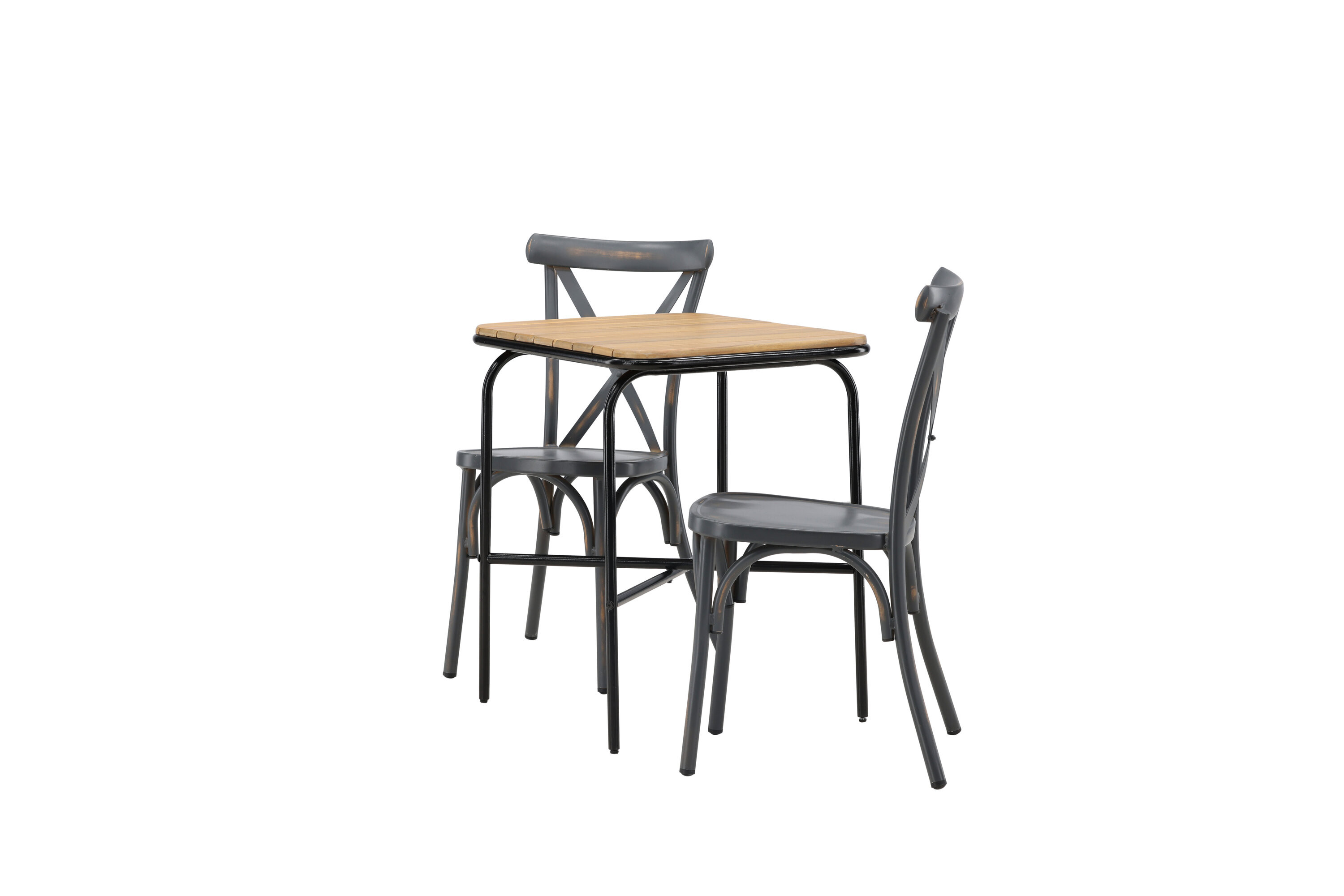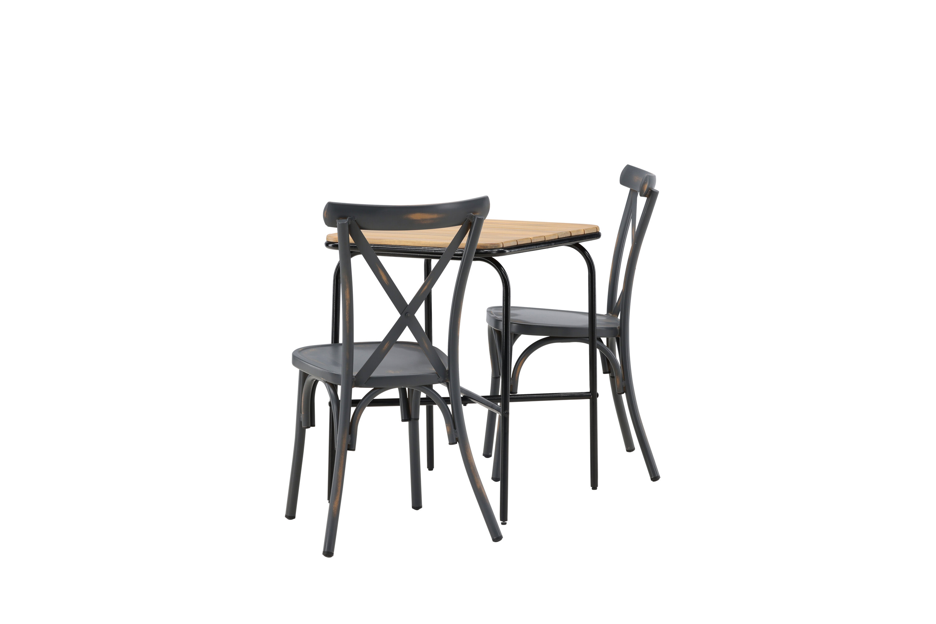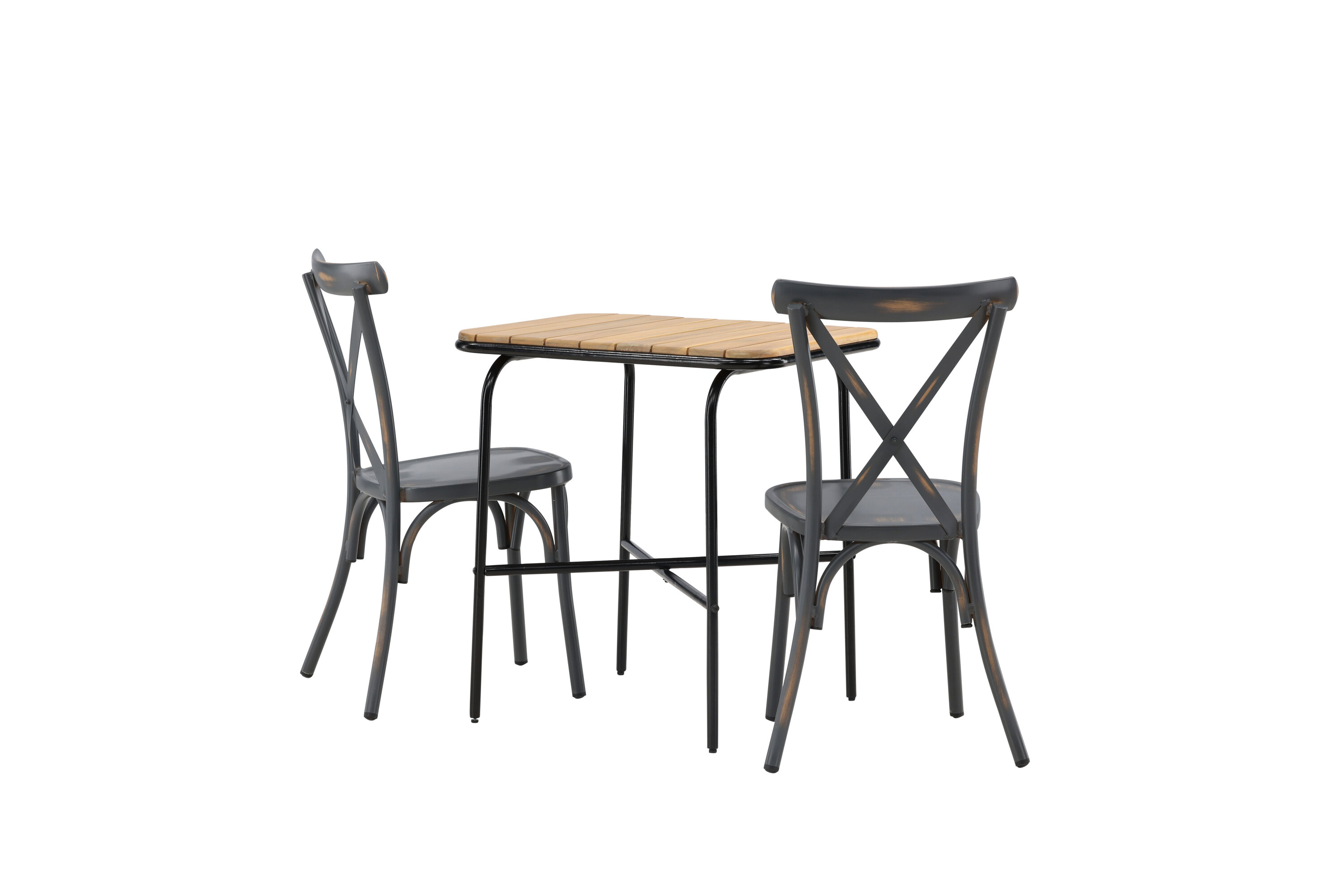 Eine Café-Gruppe mit einem durchdachten Design! Unser stilvoller Café-Tisch Holmbeck hat eine moderne, gerippte Tischplatte aus Akazienholz und eine minimalistische Basis aus schwarzem Stahl. Hier zusammen mit 2 schwarzen Esszimmerstühlen aus der Serie Tablas. Der Stuhl hat einen industriellen Stil und besteht aus strapazierfähigem Aluminium in einer rußschwarzen Farbe. Hier können Sie ganz einfach ruhige Momente und schöne Kaffeepausen draußen genießen! Tischmaße: 74x70x55cm.