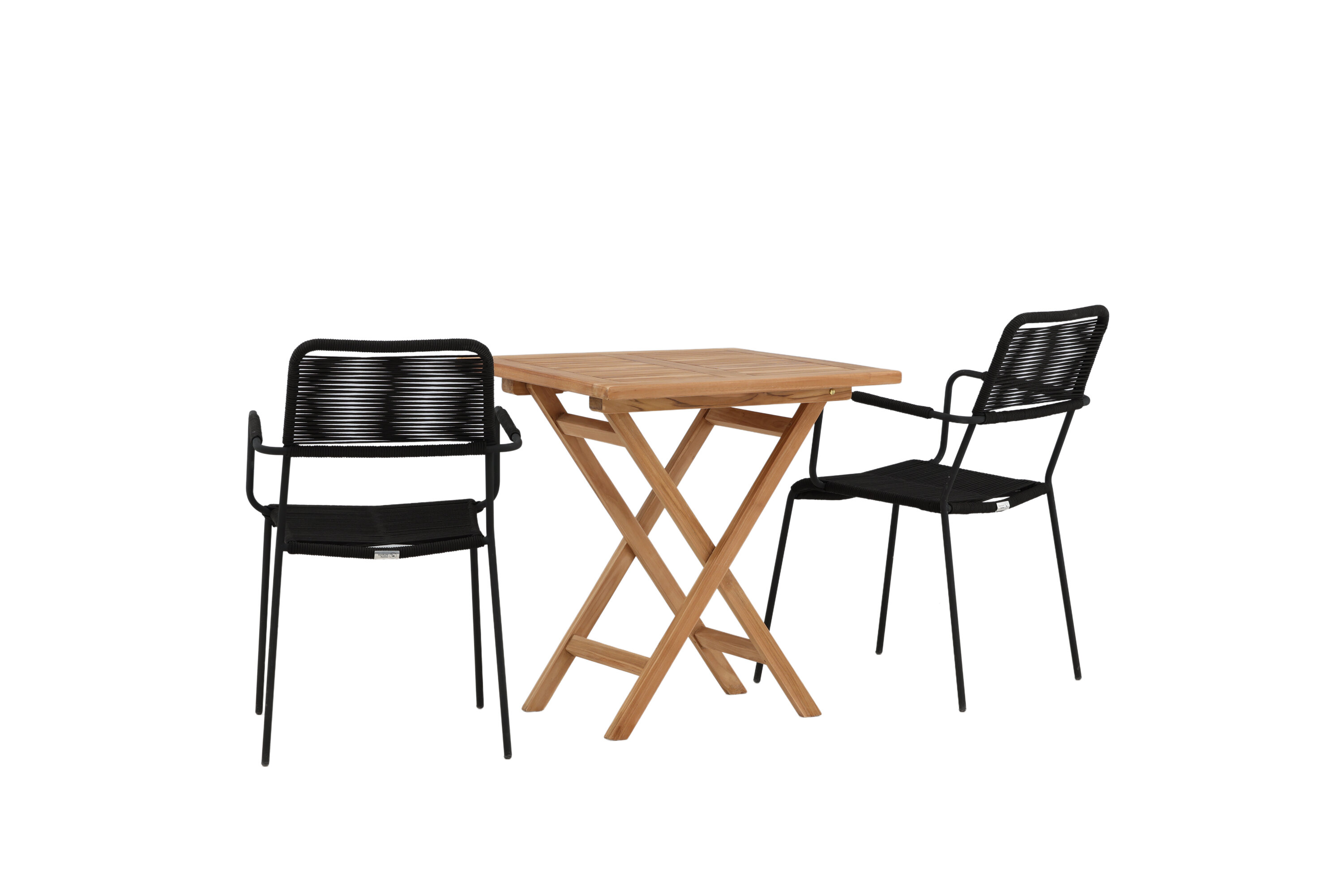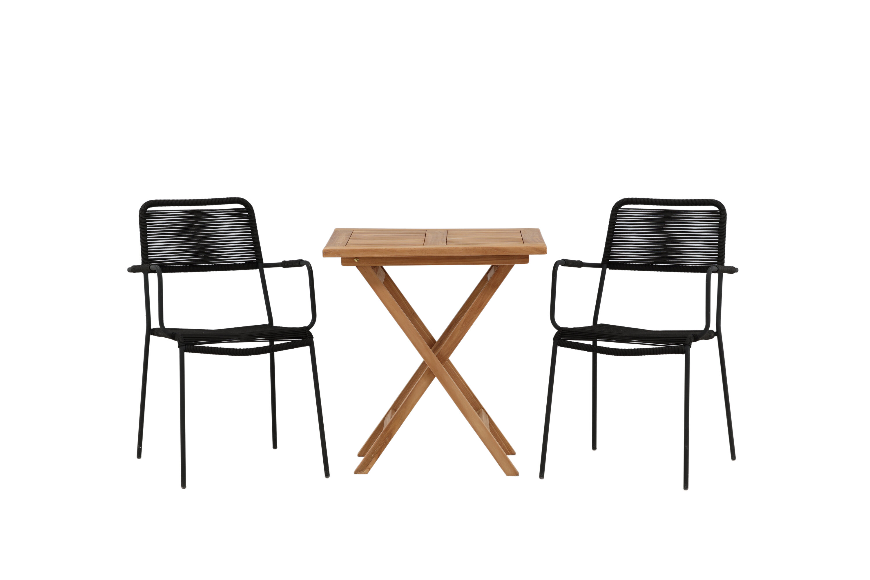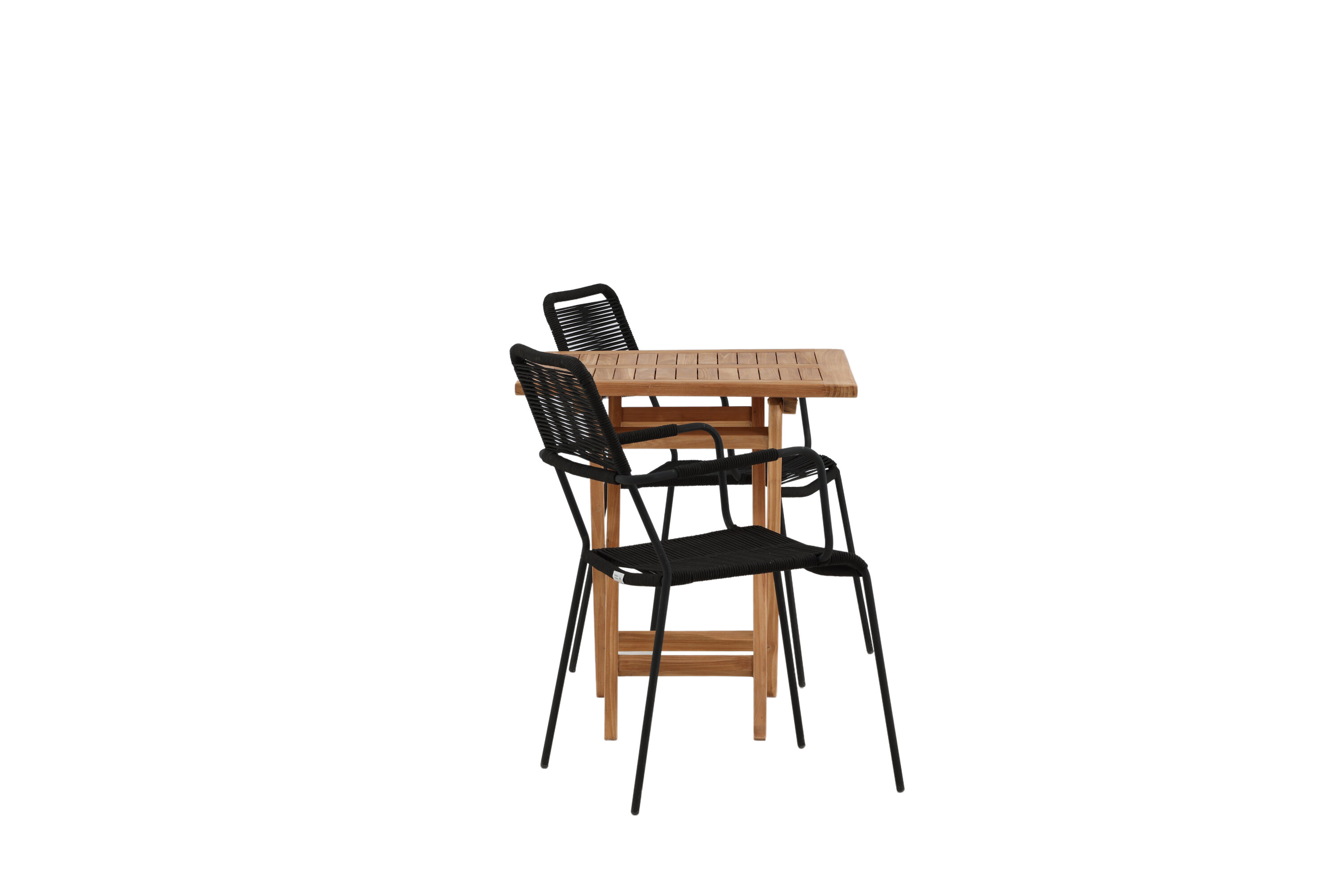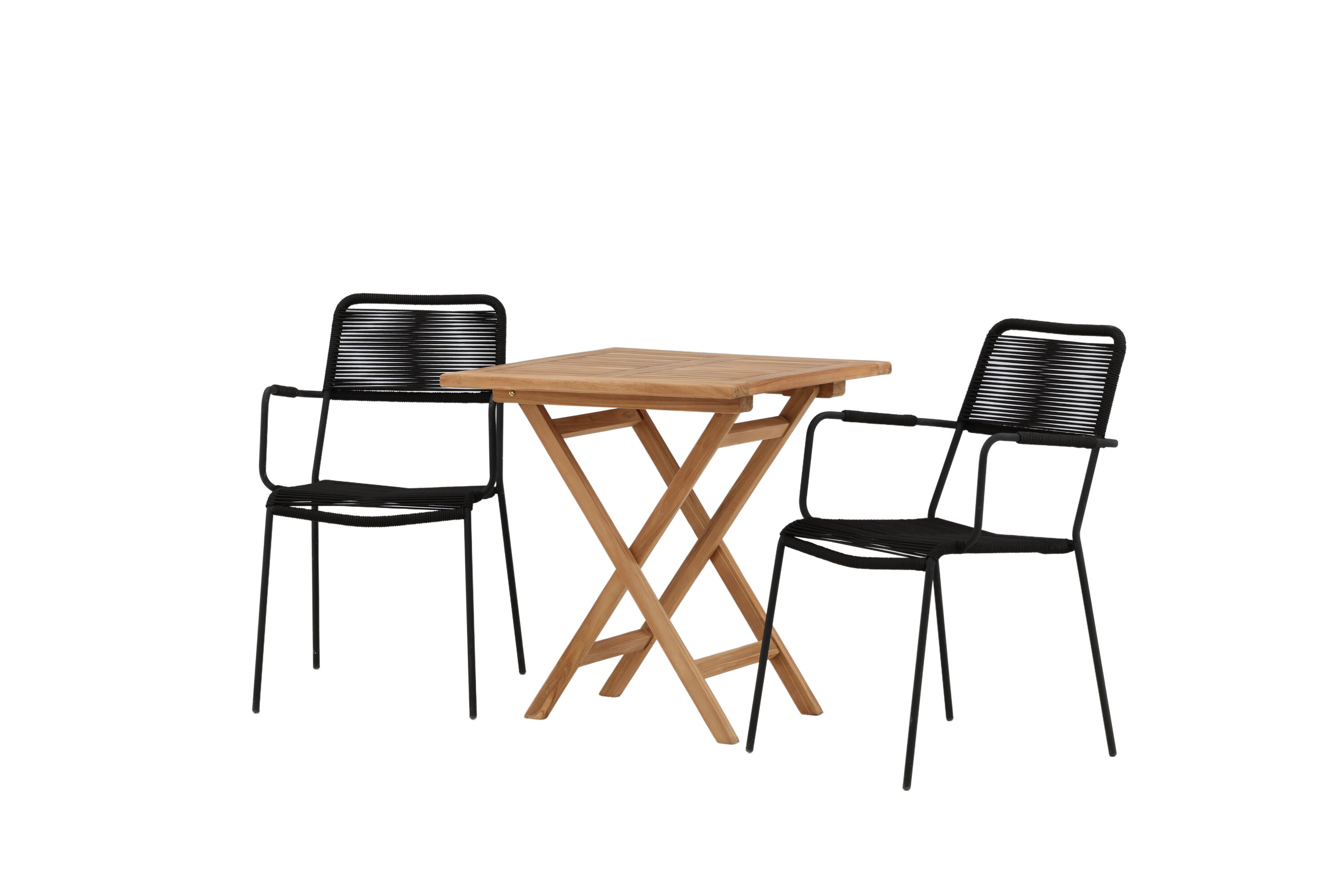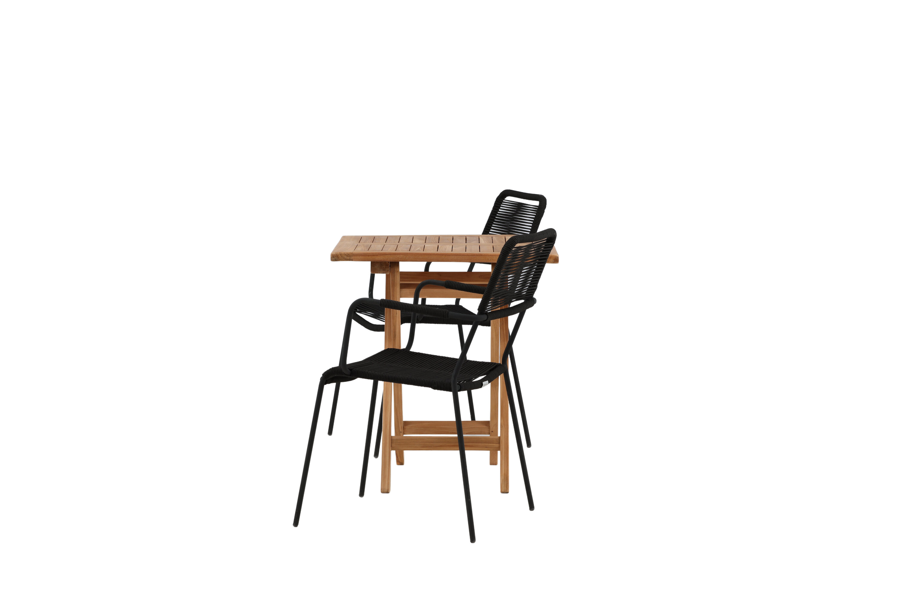 Möblieren Sie den Balkon oder die Terrasse charmant für alle Sommeranlässe! Der Kenya Café Tisch ist der perfekte Tisch aus wunderschönem Teakholz, der sich hervorragend für das Outdoor-Frühstück und den Nachmittagskaffee im Sommer eignet. Mit seinem klassischen Design und dem flexiblen Design lässt sich der Tisch leicht zusammenstellen und leicht bewegen. Maße: 70x70 cm. Hier zusammen mit Stühlen aus der Lindos Serie in modebewusstem Design. Die Stühle haben stilvolle schmale Beine und integrierte Armlehnen aus schwarzem Aluminium und einen Sitz aus strapazierfähigem, schwarzem Seil. Dies ist eine einladende Essensgruppe für zwei, die diesen Sommer garantiert angenehme Momente verlängern wird!