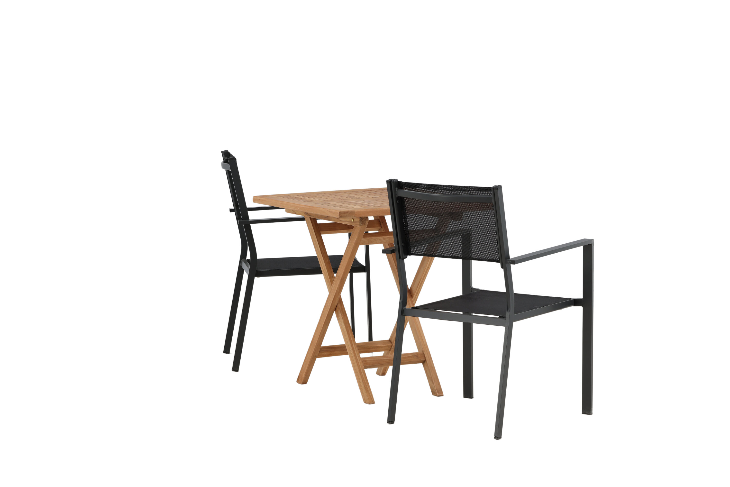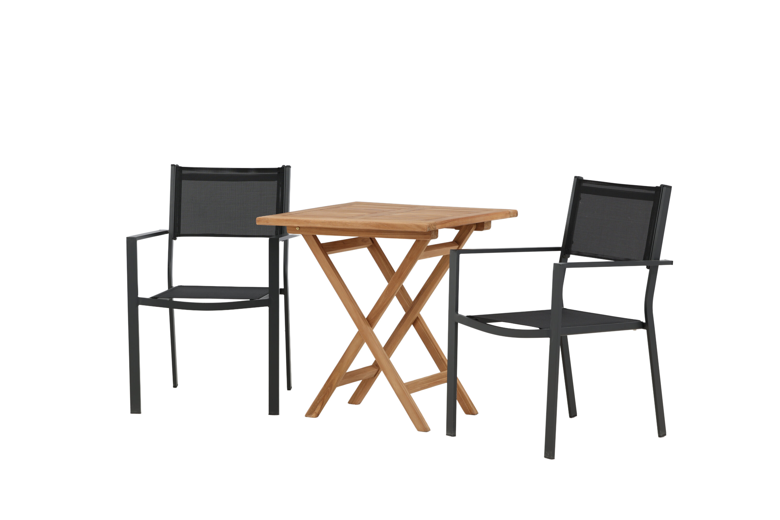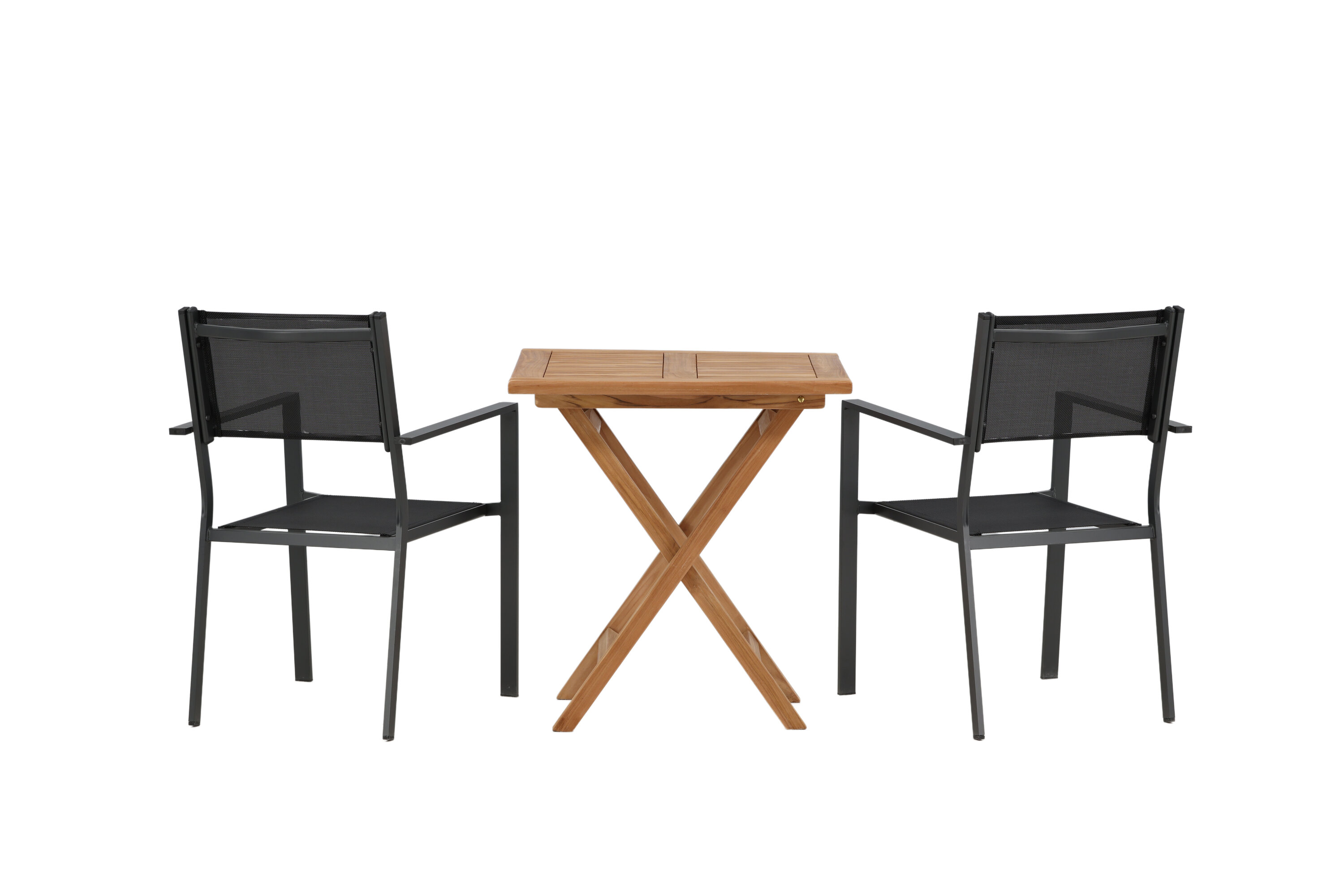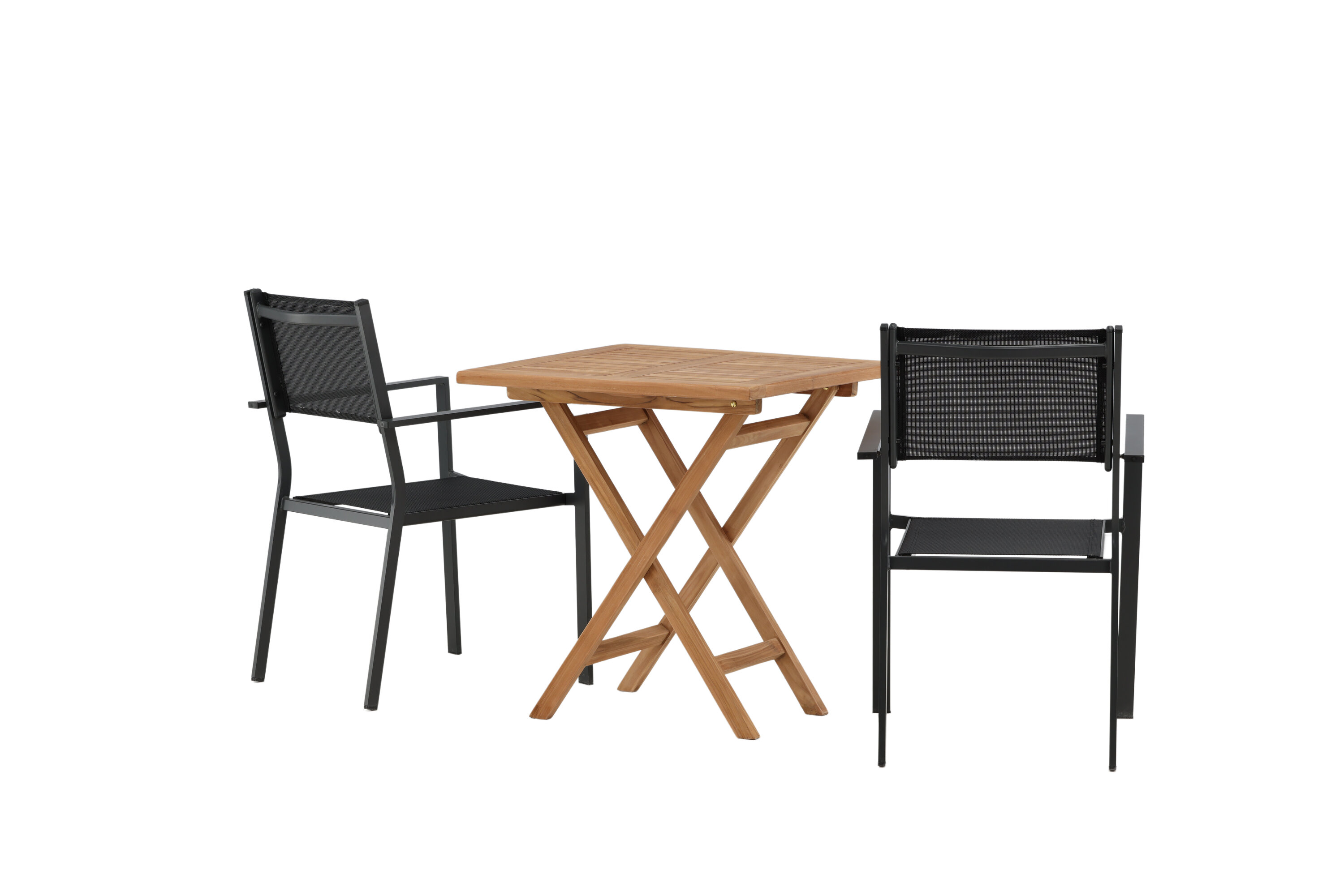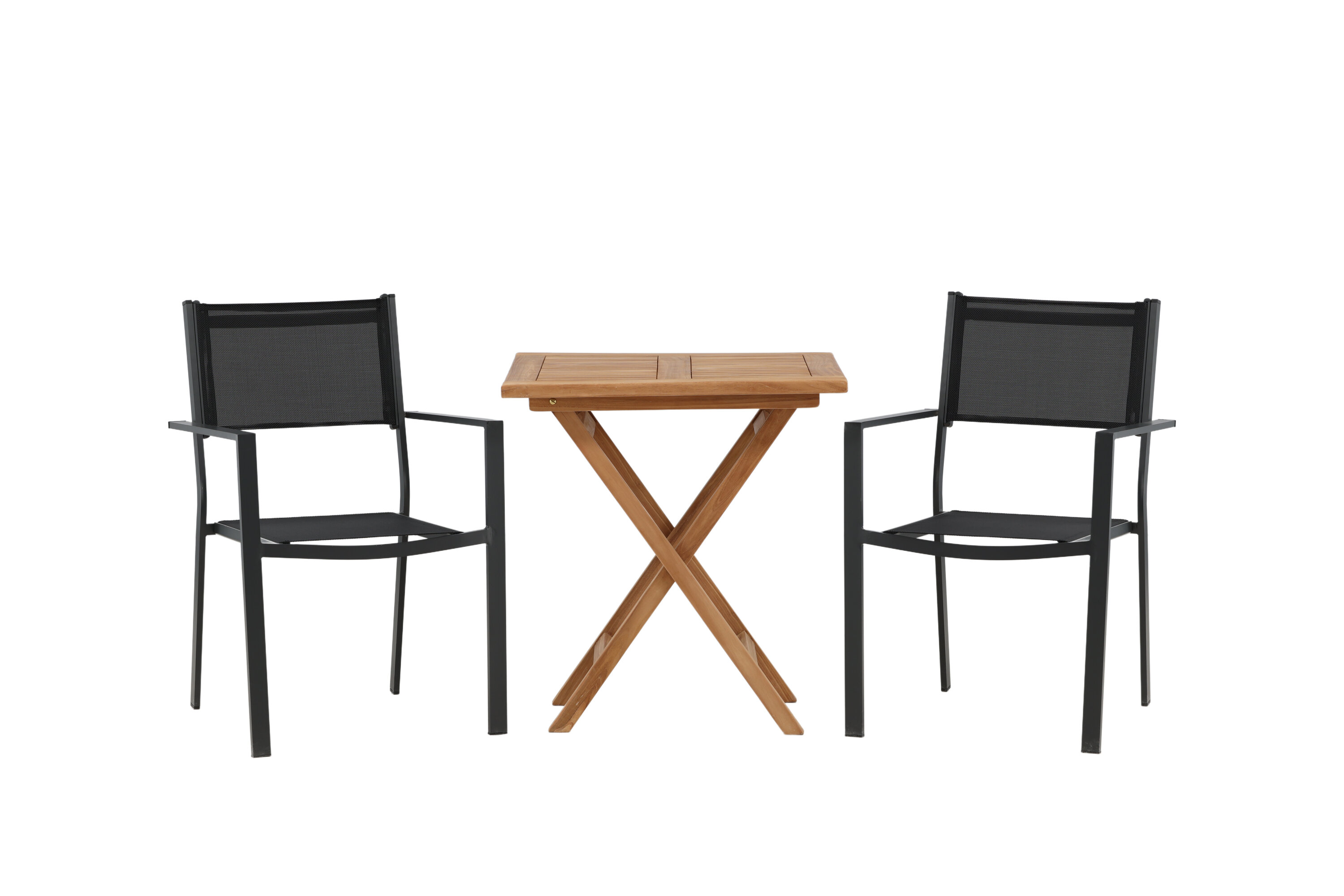 Eine einladende Essensgruppe für zwei, die diesen Sommer garantiert angenehme Momente verlängert! Kenias Café-Tisch ist der perfekte Klapptisch aus wunderschönem Teakholz, der sich hervorragend für das Outdoor-Frühstück und den Nachmittagskaffee im Sommer eignet. Mit seinem klassischen Design und dem flexiblen Design lässt sich der Tisch leicht zusammenstellen und leicht bewegen. Maße: 70x70 cm. Hier zusammen mit 2 Stühlen aus der Copacabana Serie. Die Stühle sind stapelbar mit einem Sitz aus schwarzem Textil und einem Rahmen aus Aluminium. Lassen Sie die Zeit hier das Highlight des Tages sein!