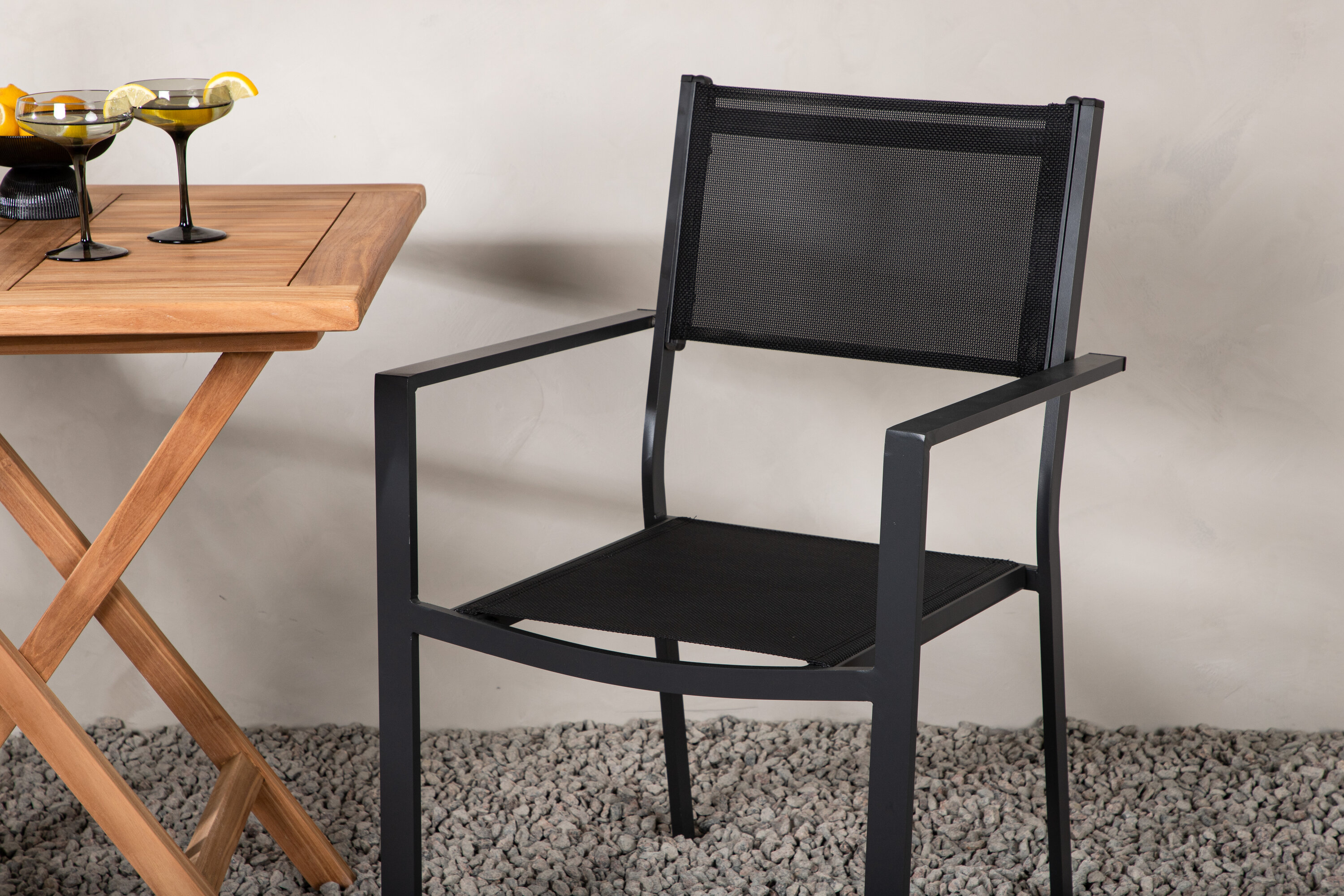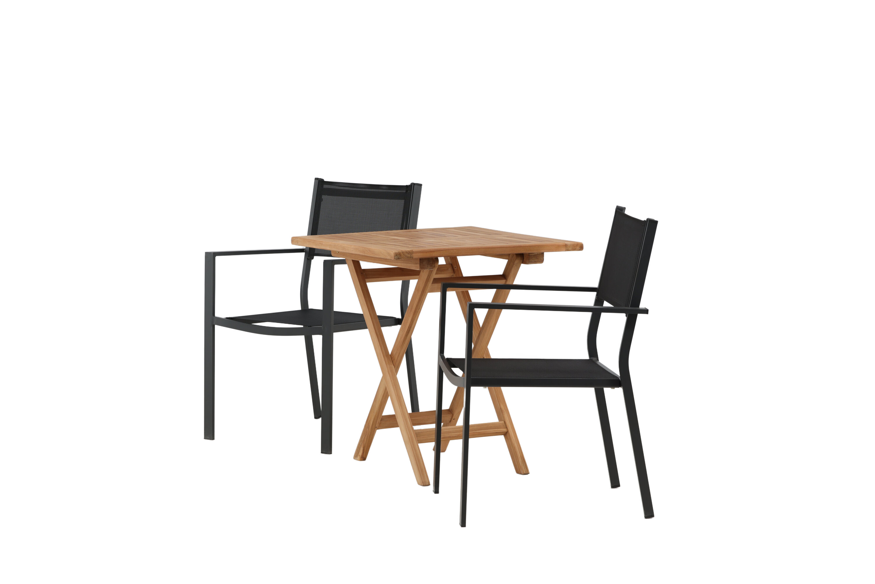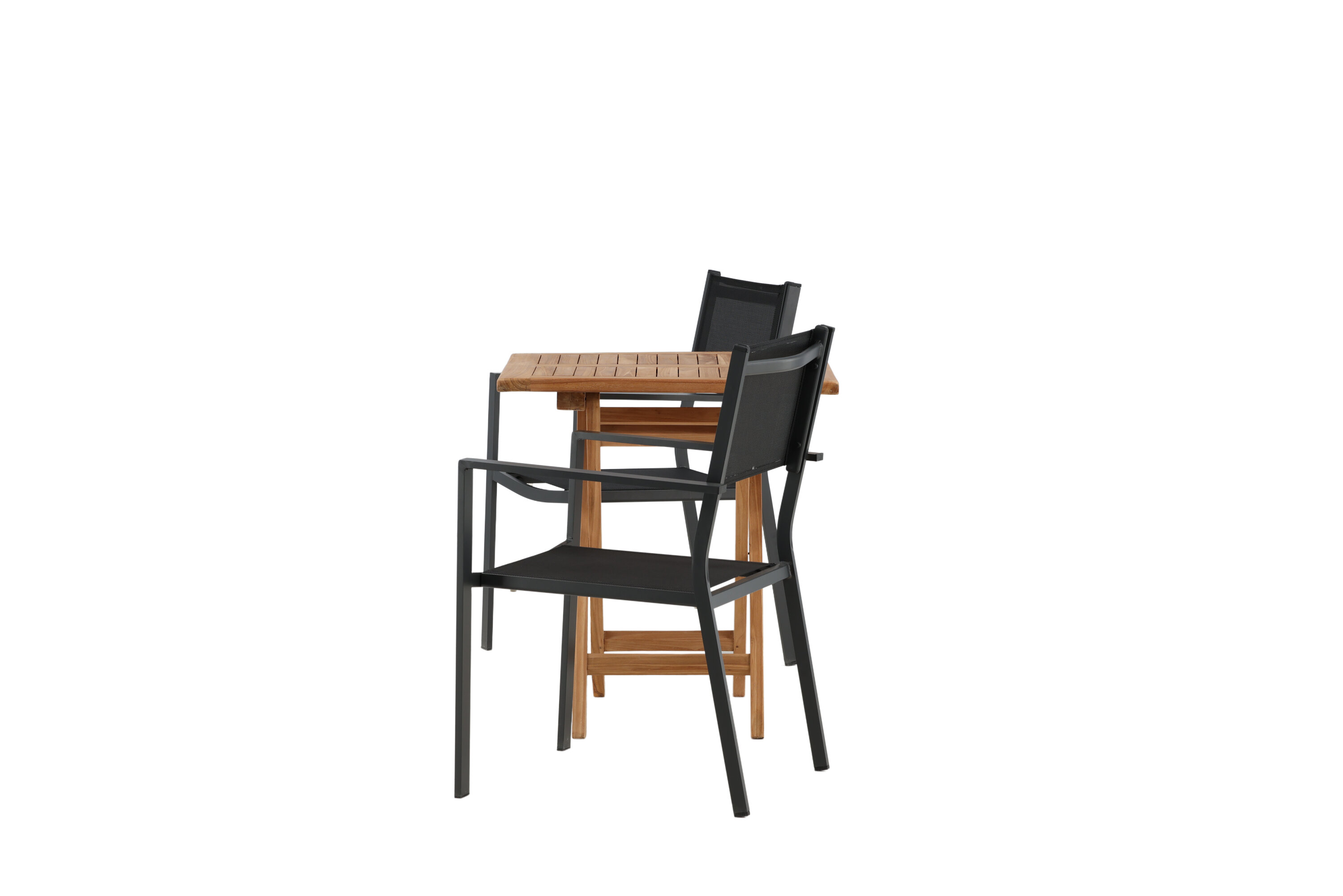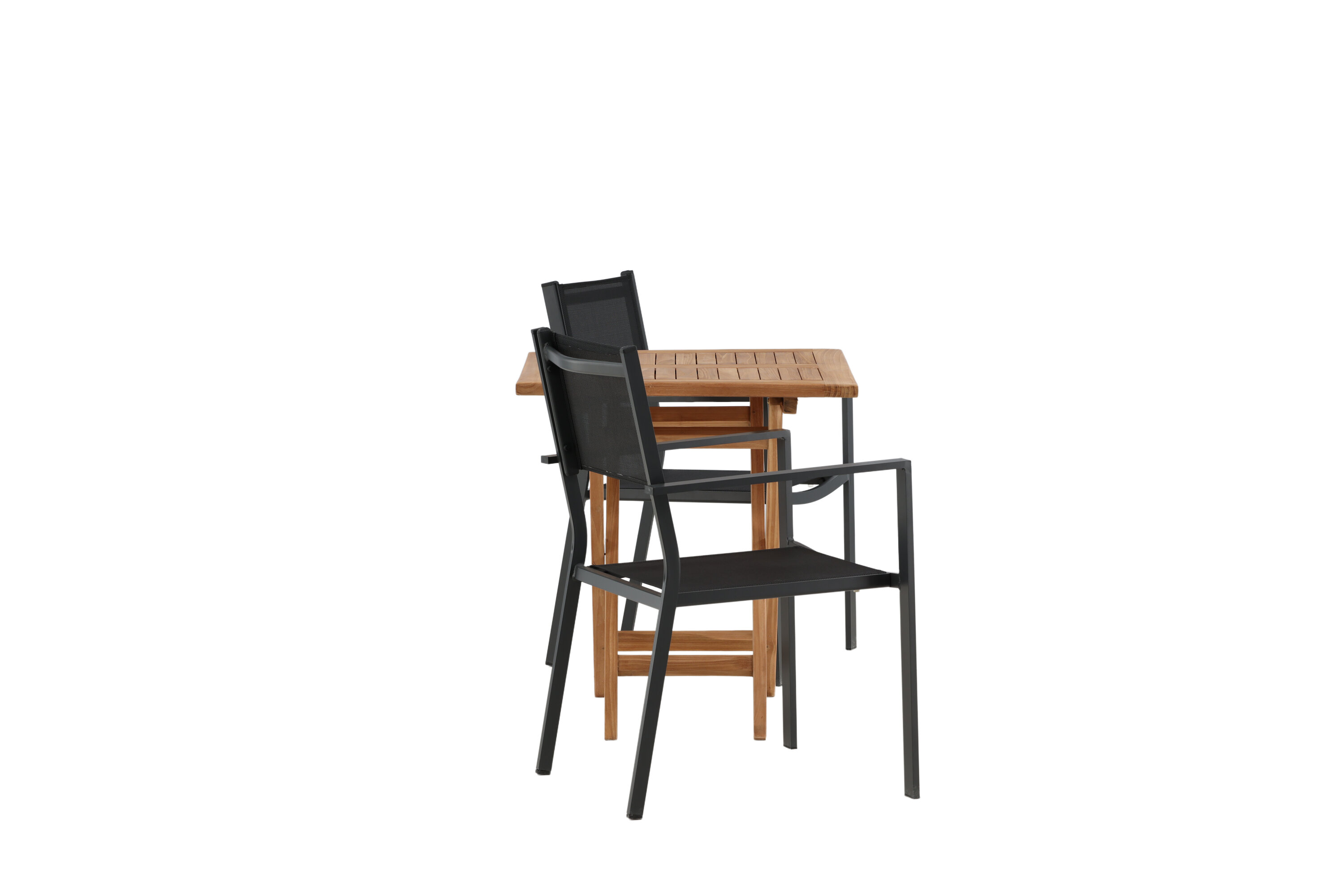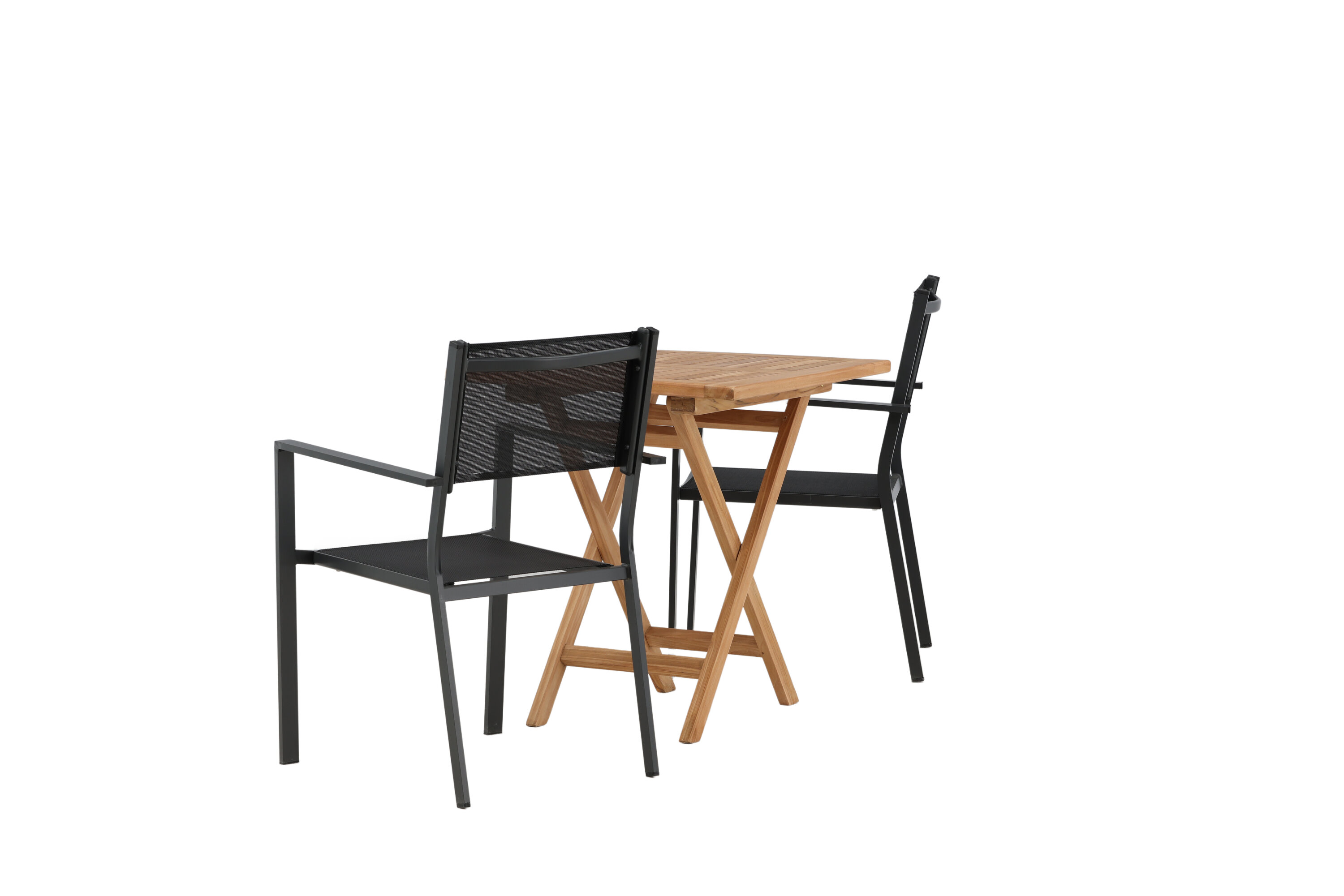 Eine einladende Essensgruppe für zwei, die diesen Sommer garantiert angenehme Momente verlängert! Kenias Café-Tisch ist der perfekte Klapptisch aus wunderschönem Teakholz, der sich hervorragend für das Outdoor-Frühstück und den Nachmittagskaffee im Sommer eignet. Mit seinem klassischen Design und dem flexiblen Design lässt sich der Tisch leicht zusammenstellen und leicht bewegen. Maße: 70x70 cm. Hier zusammen mit 2 Stühlen aus der Copacabana Serie. Die Stühle sind stapelbar mit einem Sitz aus schwarzem Textil und einem Rahmen aus Aluminium. Lassen Sie die Zeit hier das Highlight des Tages sein!