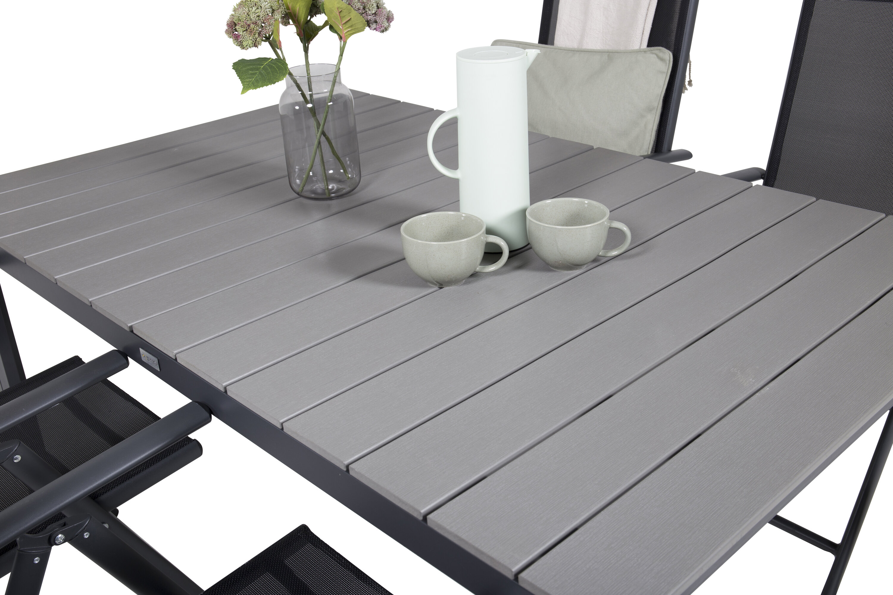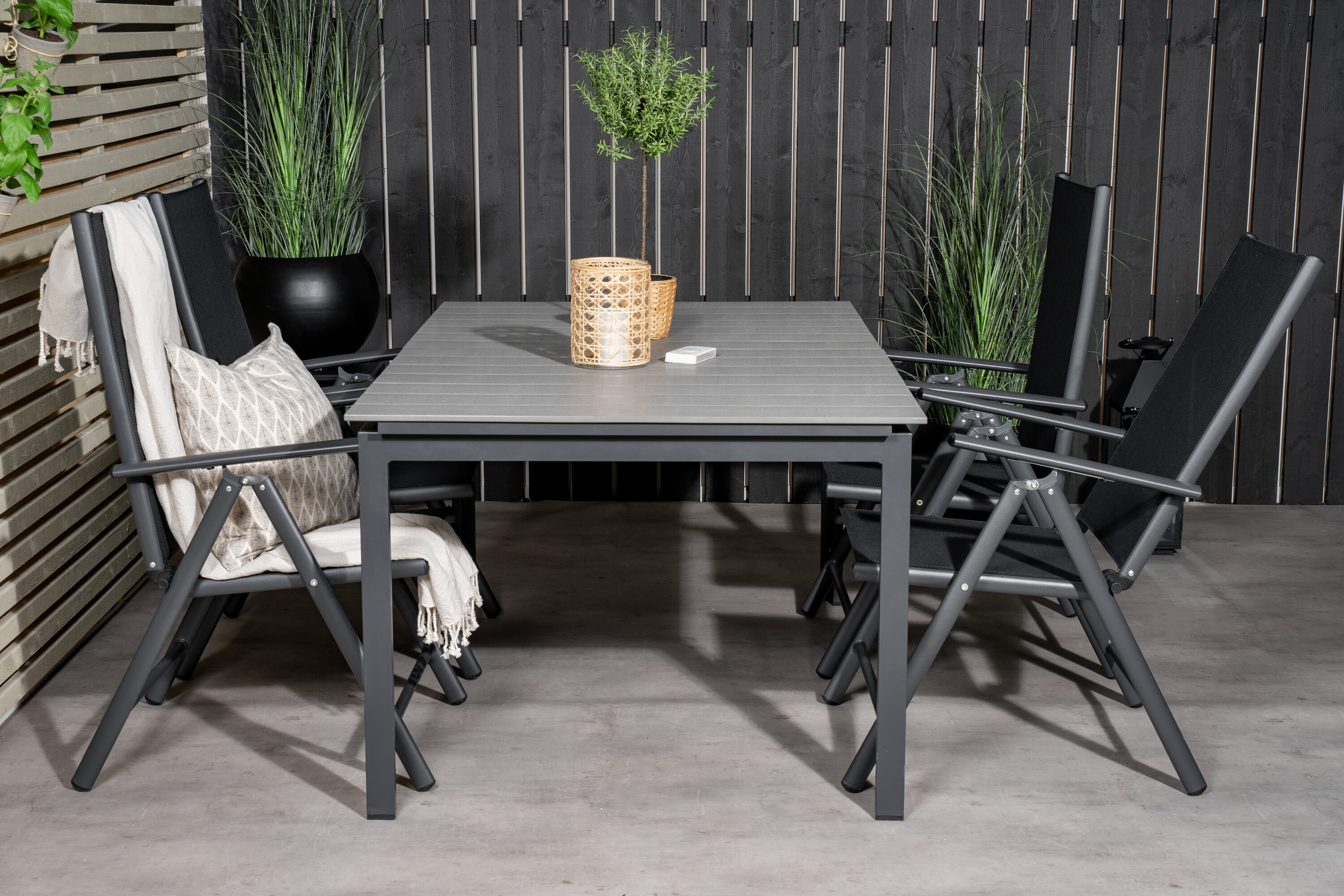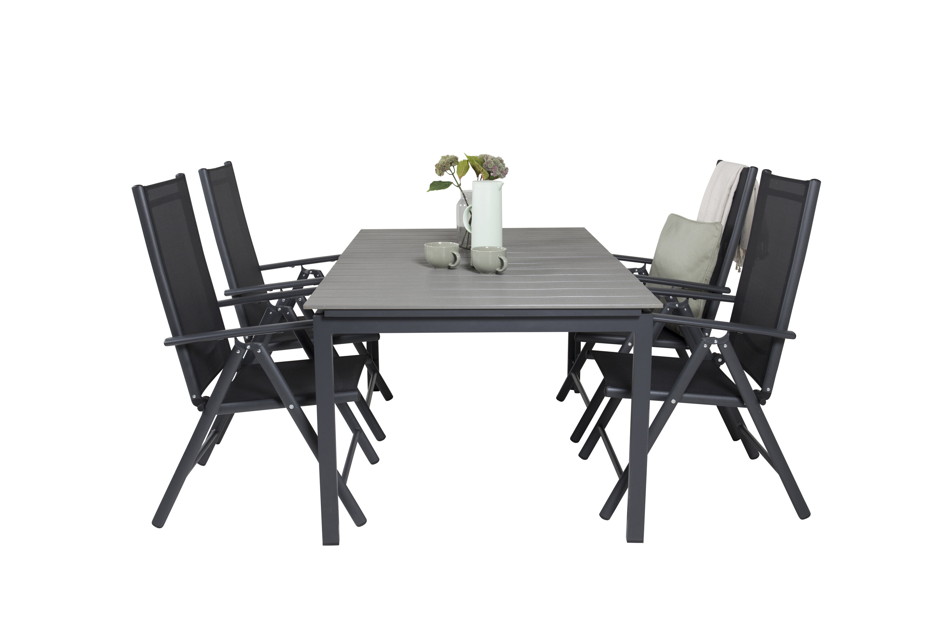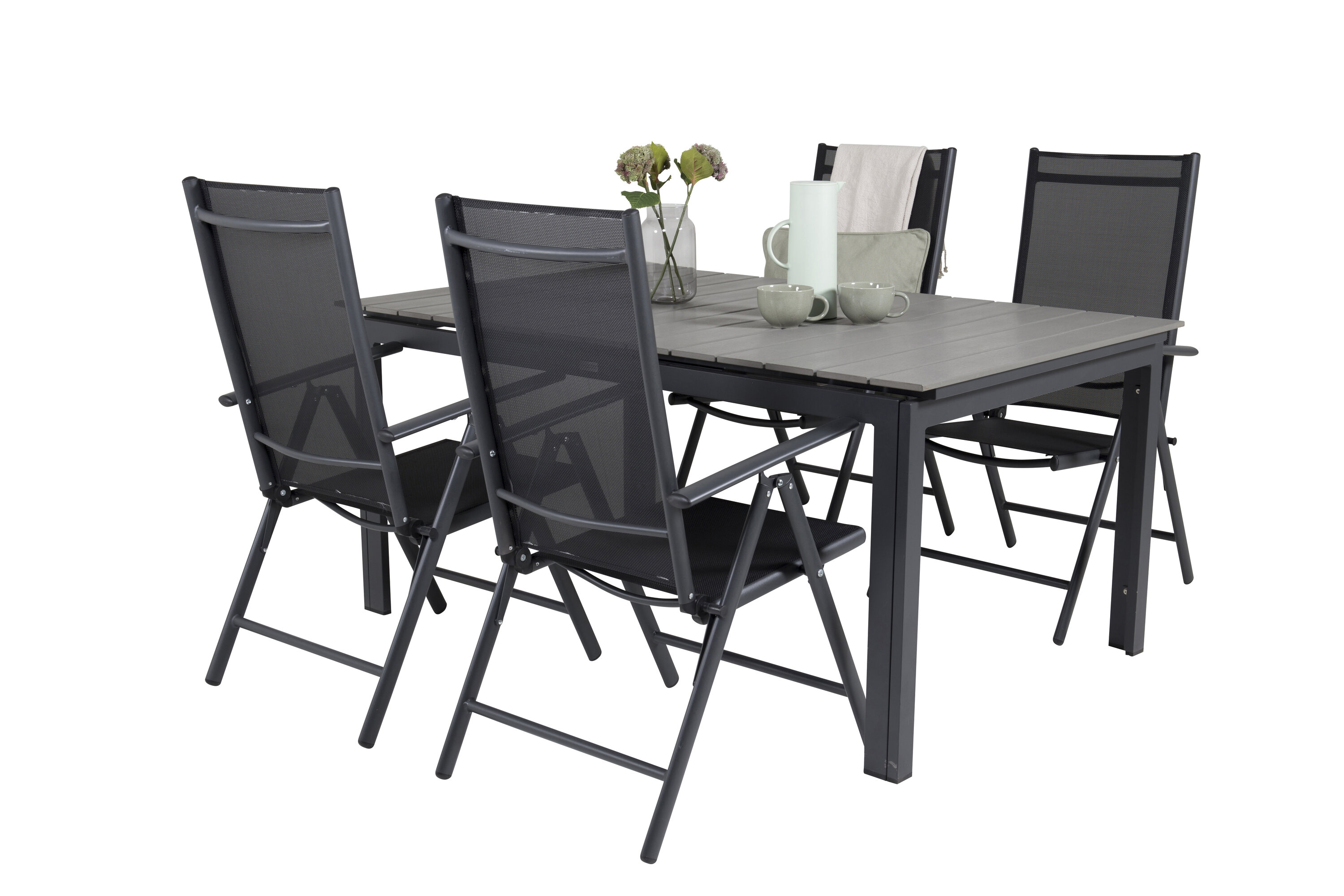 Unsere beliebten Klapp-Essstühle der Serie Break zusammen mit Esstisch-Ebenen im klassischen Stil! Die perfekte Kombination für diejenigen, die eine stilvolle und praktische Lebensmittelgruppe suchen, um die Terrasse zu dekorieren!