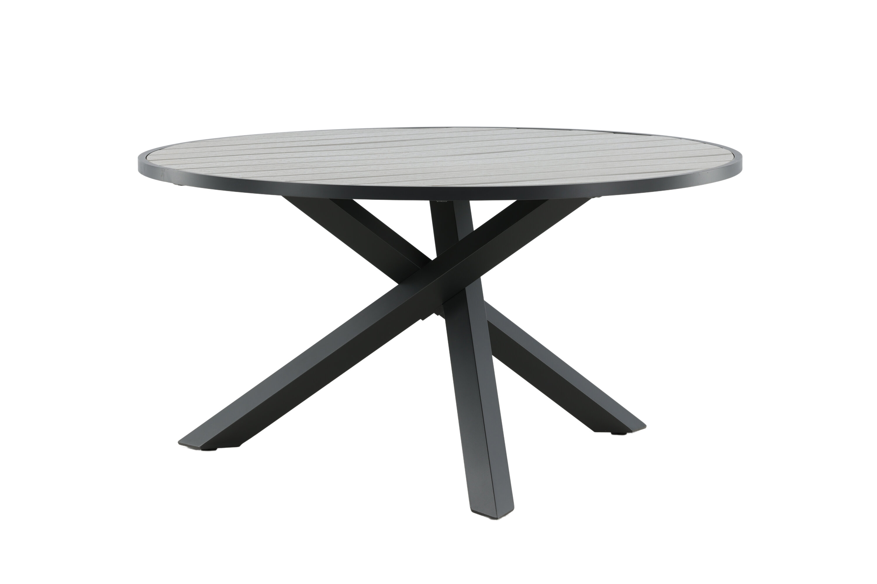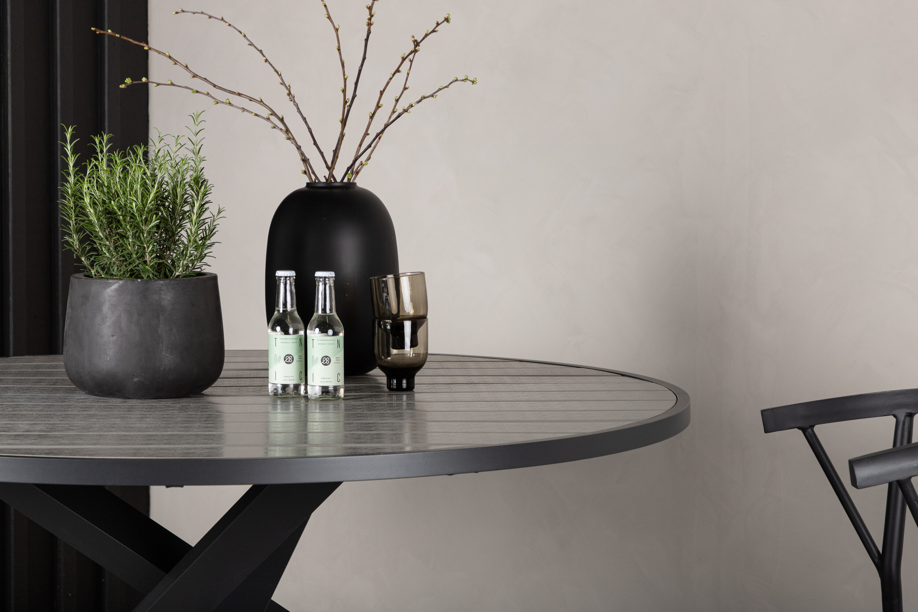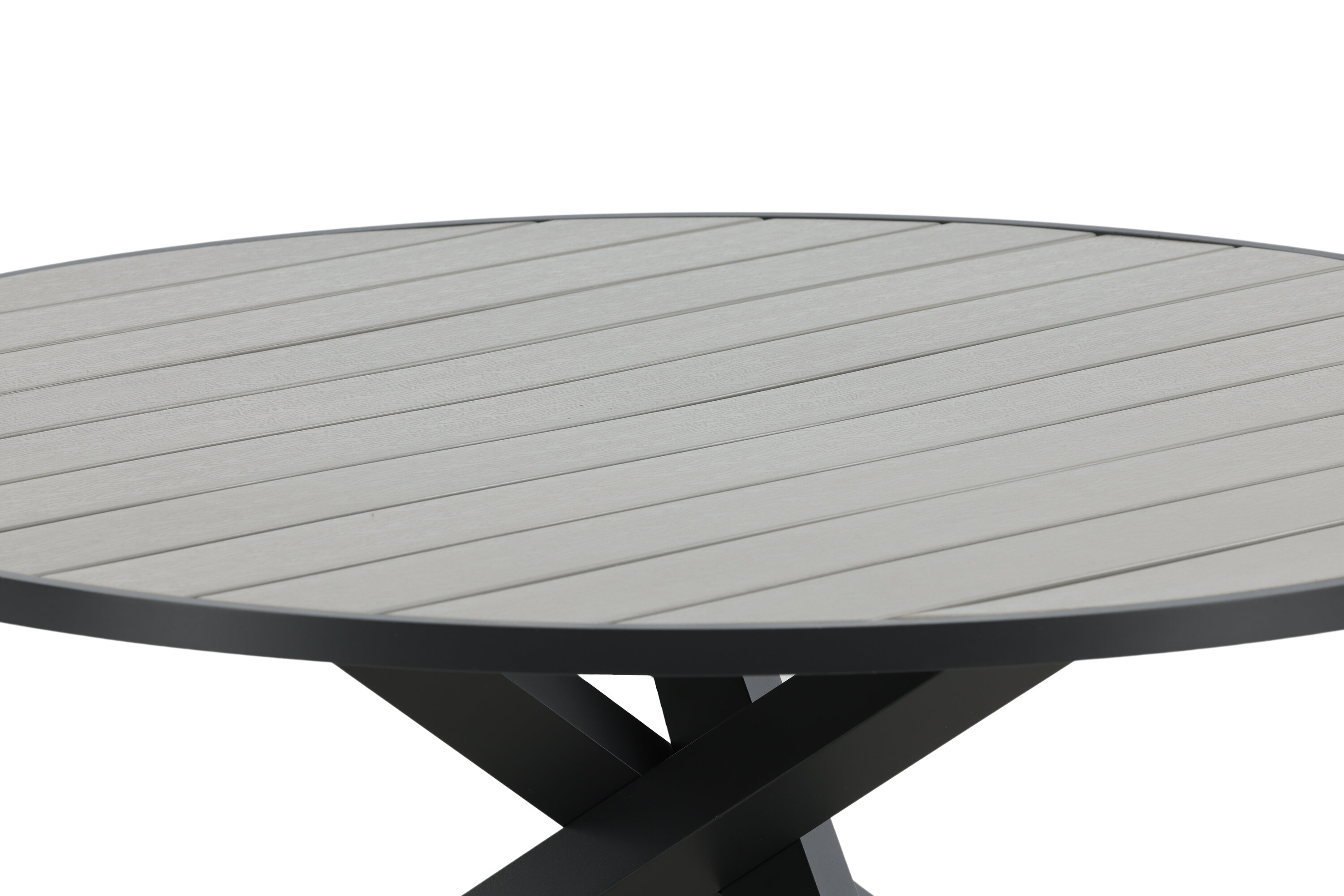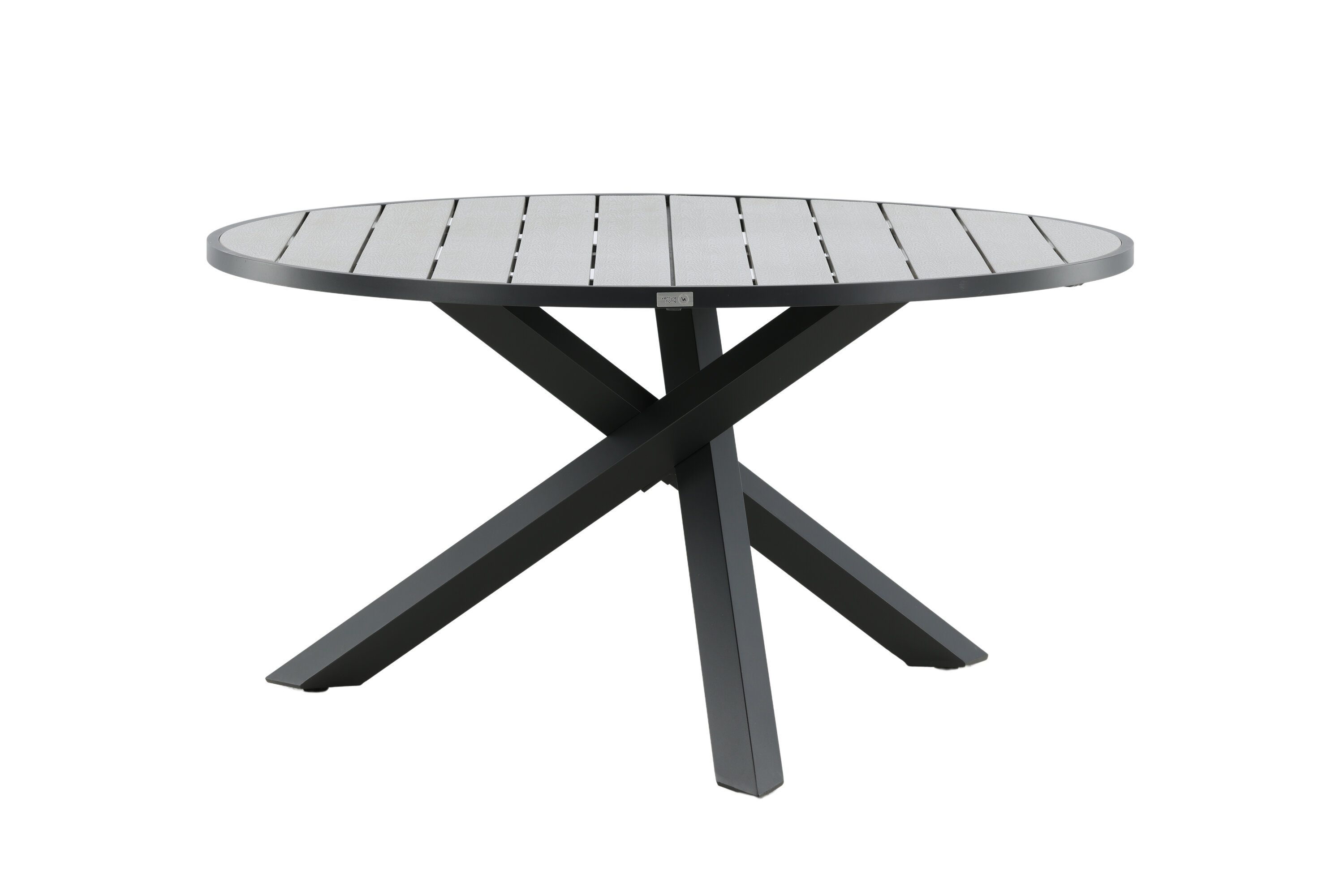 Ein runder Esstisch ist perfekt für diejenigen, die in diesem Sommer ein angenehmes, geselliges und einladendes Gefühl für den Außenbereich oder den Balkon schaffen wollen! Hier können Gespräche und Lachen frei um einen stilvollen Esstisch im klassischen Look aus der Parma-Serie fließen. Der Esstisch hat eine graue Aintwood-Tischplatte und ein kreuzfahrtähnliches Fahrgestell aus schwarzem Metall - machen Sie sich bereit für das Nachtleben und lassen Sie die Zeit hier zum Highlight des Tages werden!
