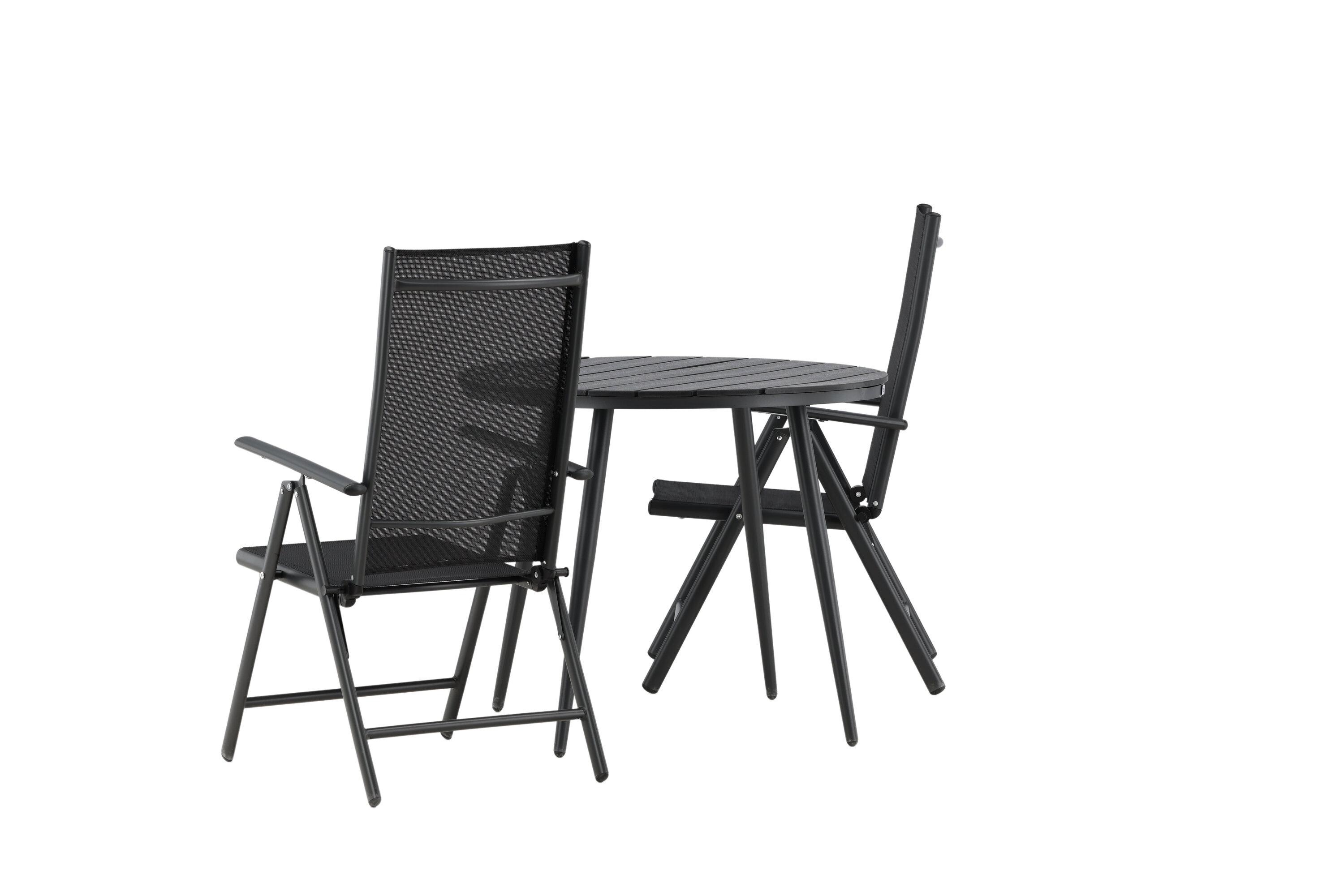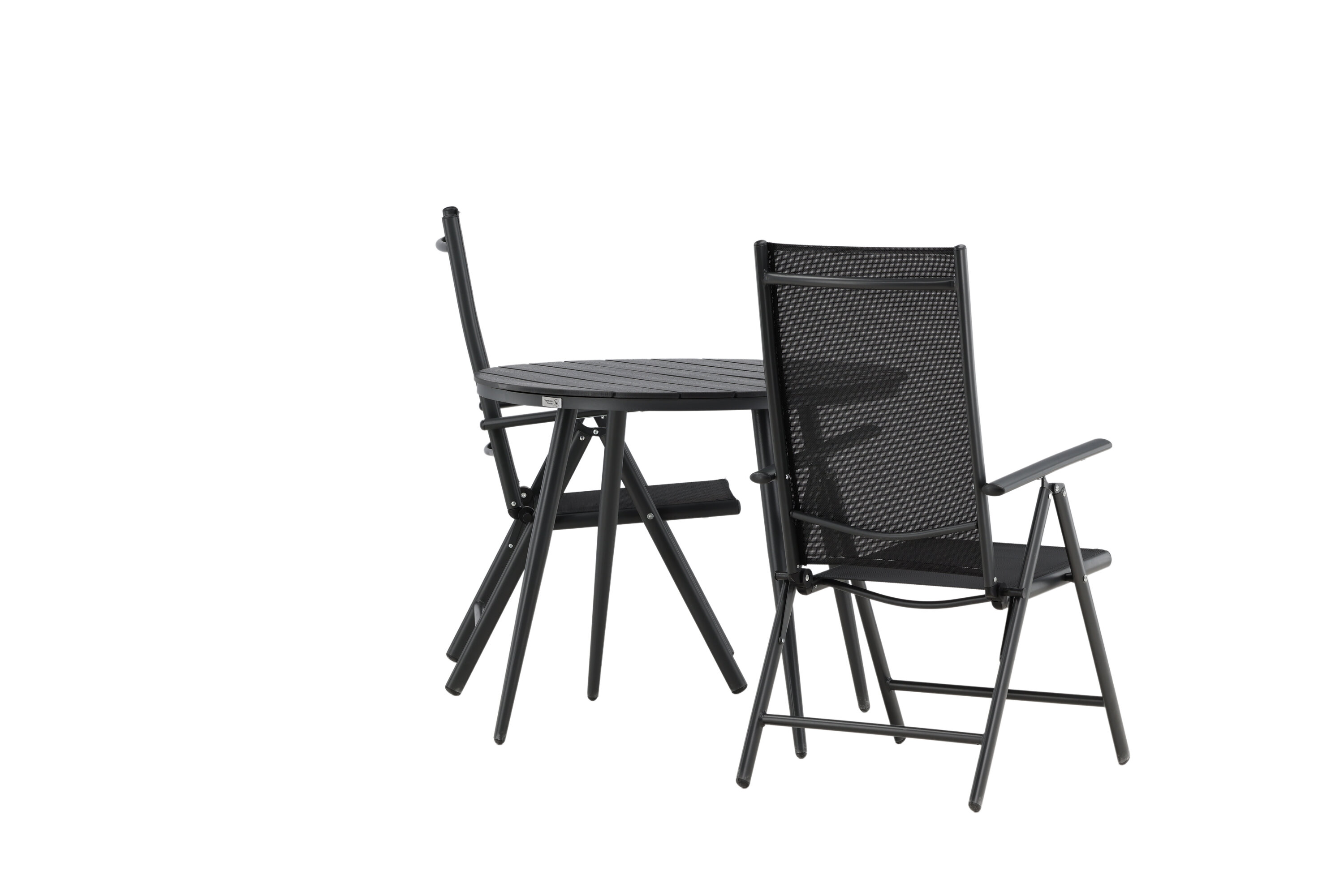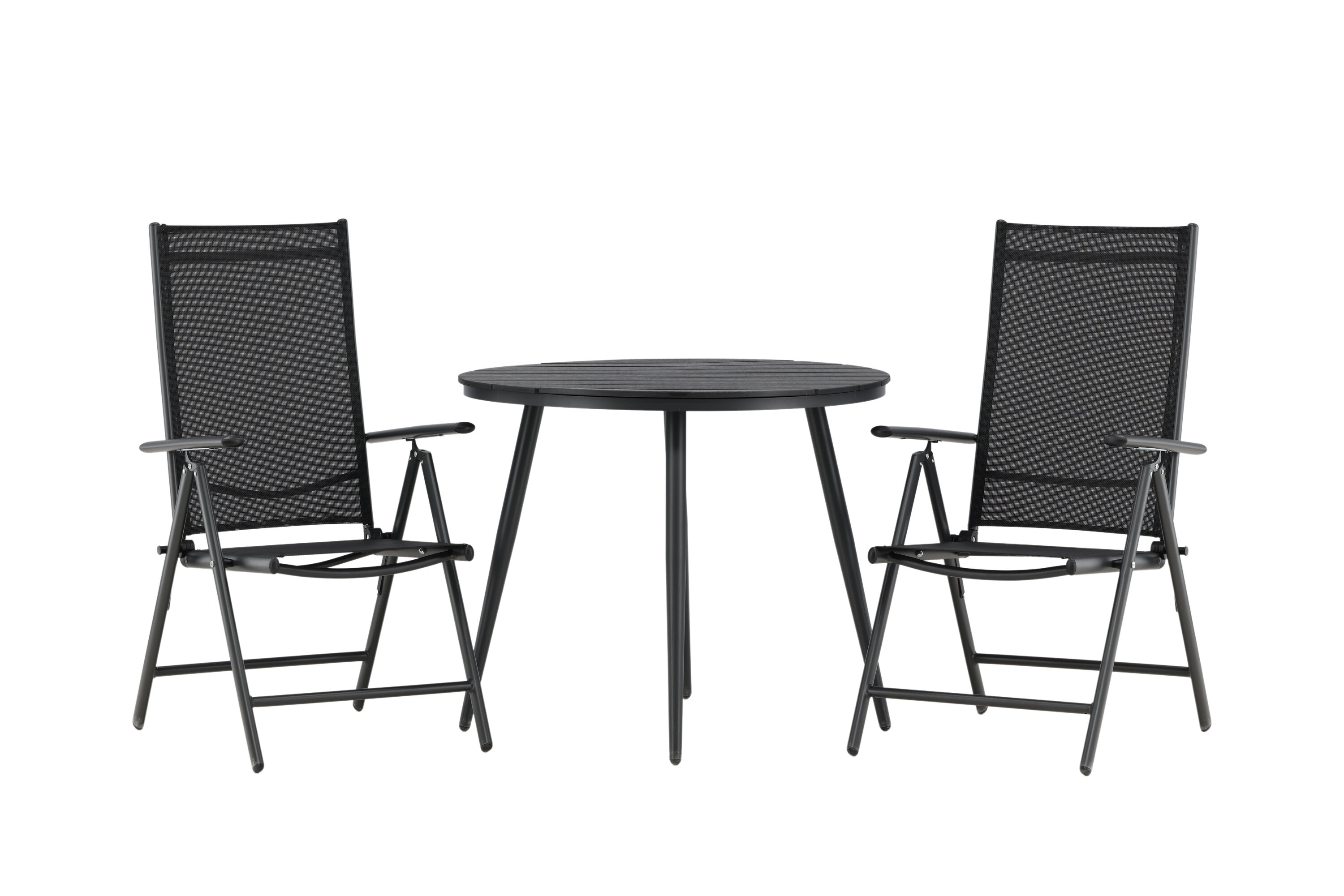 Bequeme, einladende und hübsche Café-Gruppe in schwarzer Farbe aus der Break-Serie - einfach zu kombinieren und zeitlos im Design! Der Break-Tisch hat eine runde Tischplatte in Aintwood und ein klassisches Fahrgestell in schwarzem Aluminium. Hier in perfekter Kombination mit klappbaren Esszimmerstühlen aus der gleichen Serie. Die Rückenlehnen der Stühle aus schwarzem Textil können für optimalen Komfort und Entspannung rund um den Esstisch eingestellt werden. Kreieren Sie den perfekten Kaffeeplatz auf Ihrer Terrasse!
