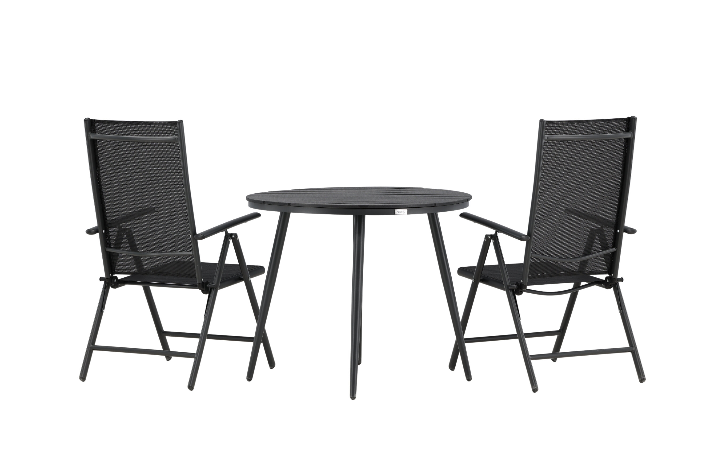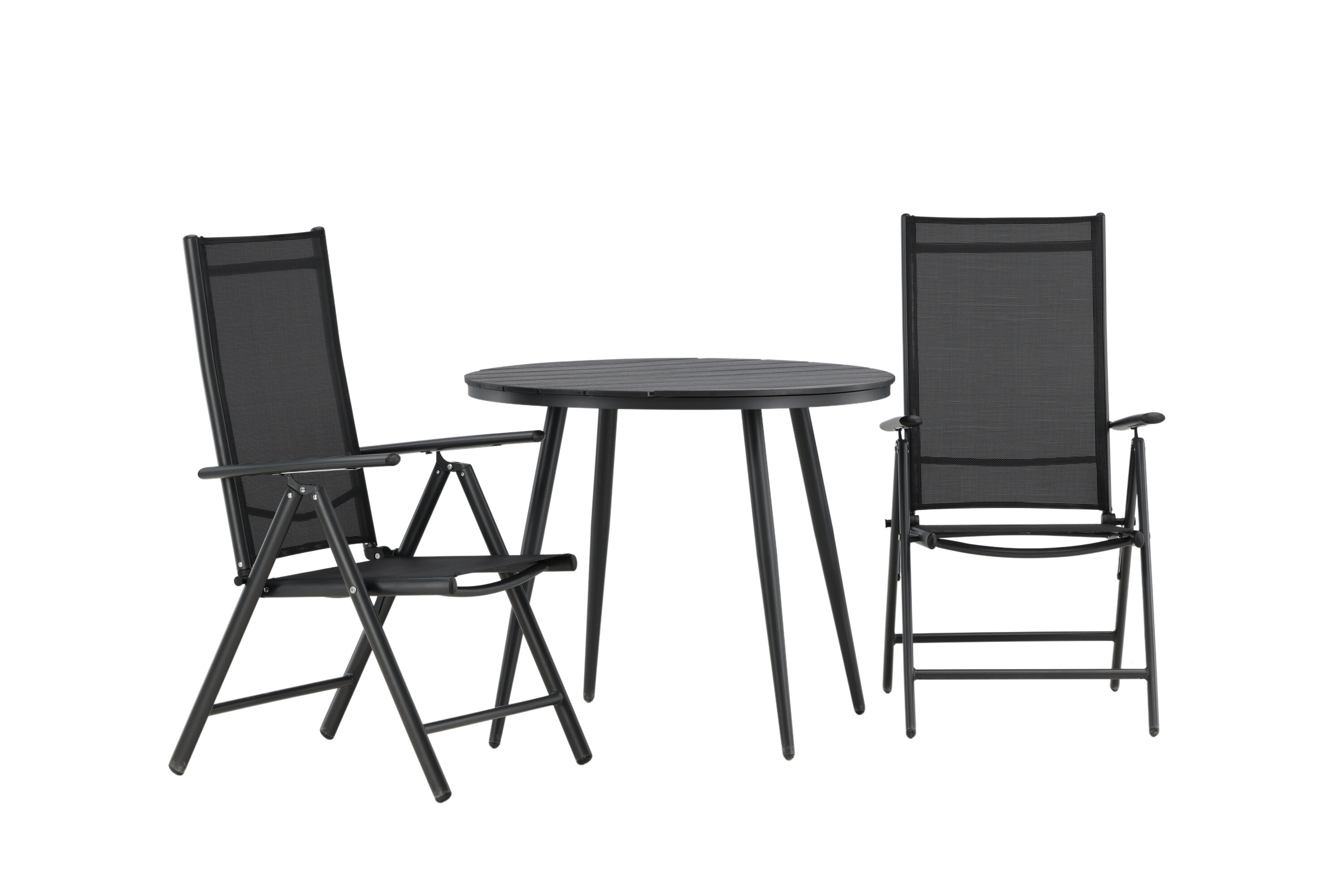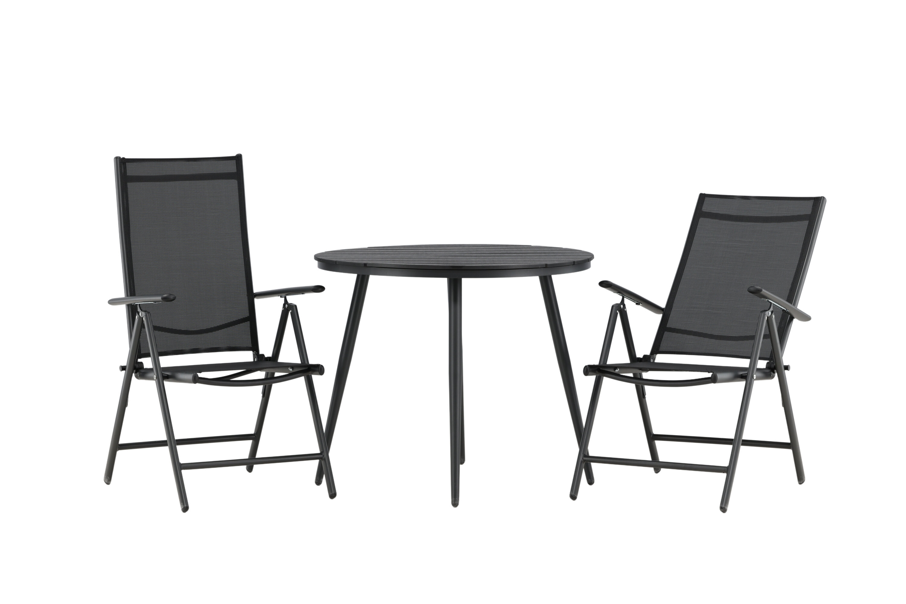 Bequeme, einladende und hübsche Café-Gruppe in schwarzer Farbe aus der Break-Serie - einfach zu kombinieren und zeitlos im Design! Der Break-Tisch hat eine runde Tischplatte in Aintwood und ein klassisches Fahrgestell in schwarzem Aluminium. Hier in perfekter Kombination mit klappbaren Esszimmerstühlen aus der gleichen Serie. Die Rückenlehnen der Stühle aus schwarzem Textil können für optimalen Komfort und Entspannung rund um den Esstisch eingestellt werden. Kreieren Sie den perfekten Kaffeeplatz auf Ihrer Terrasse!