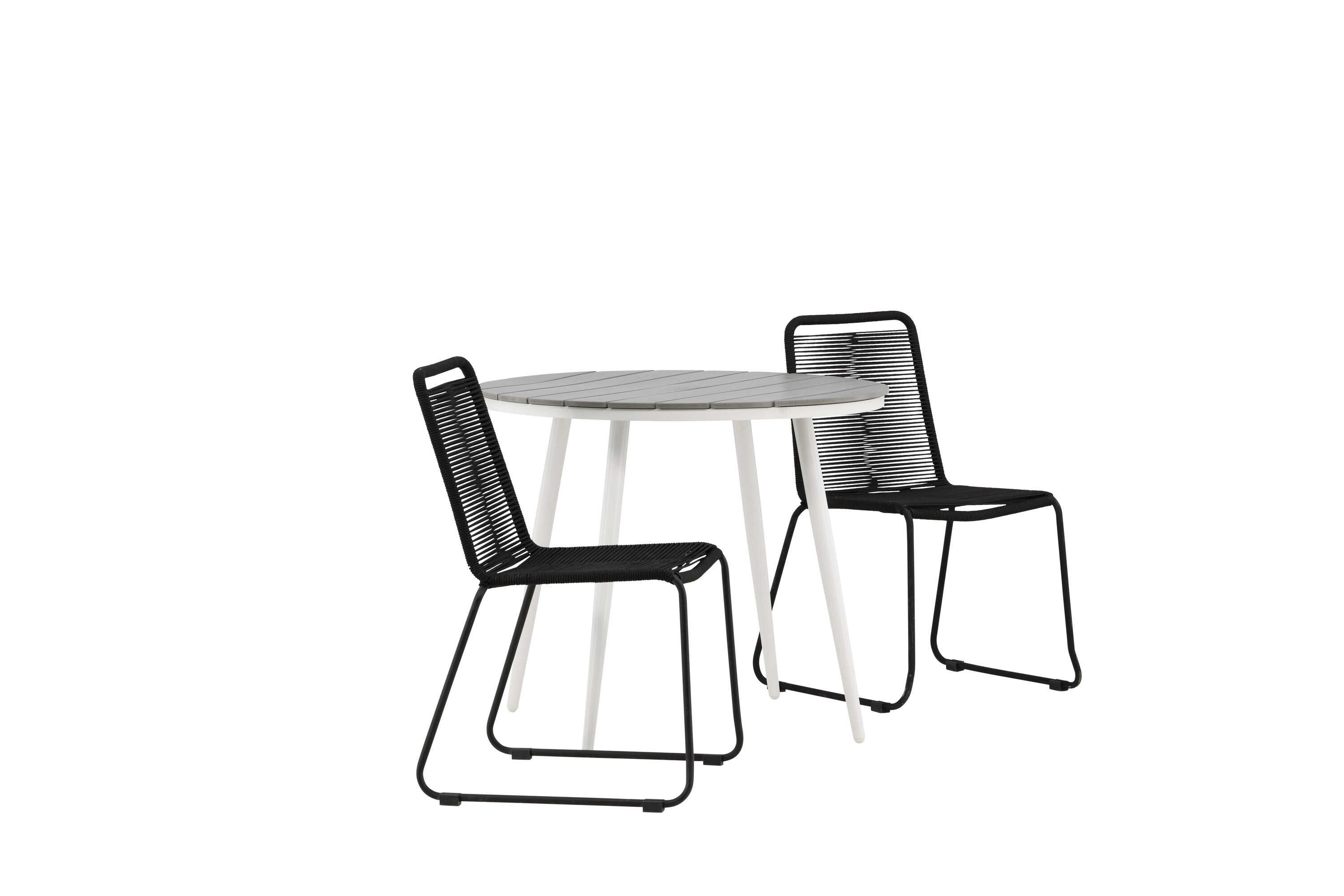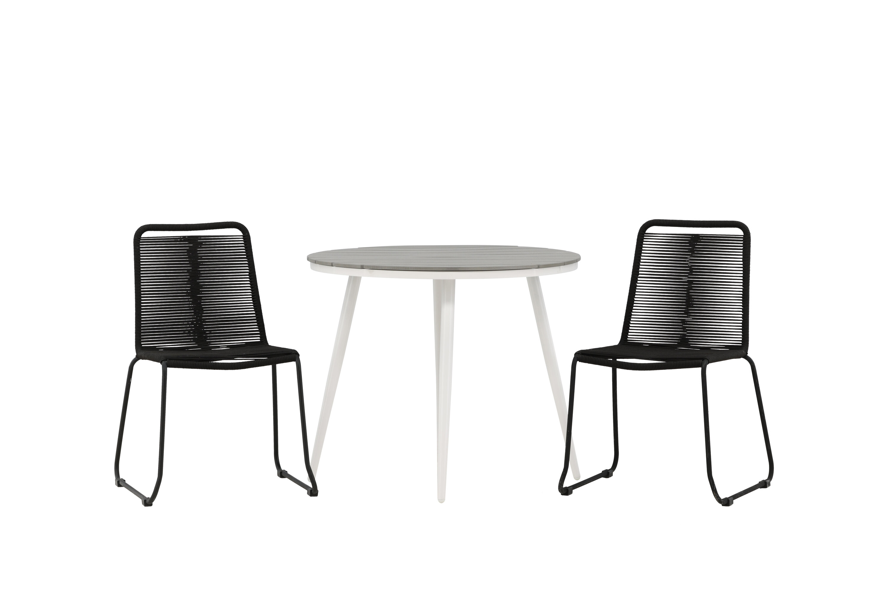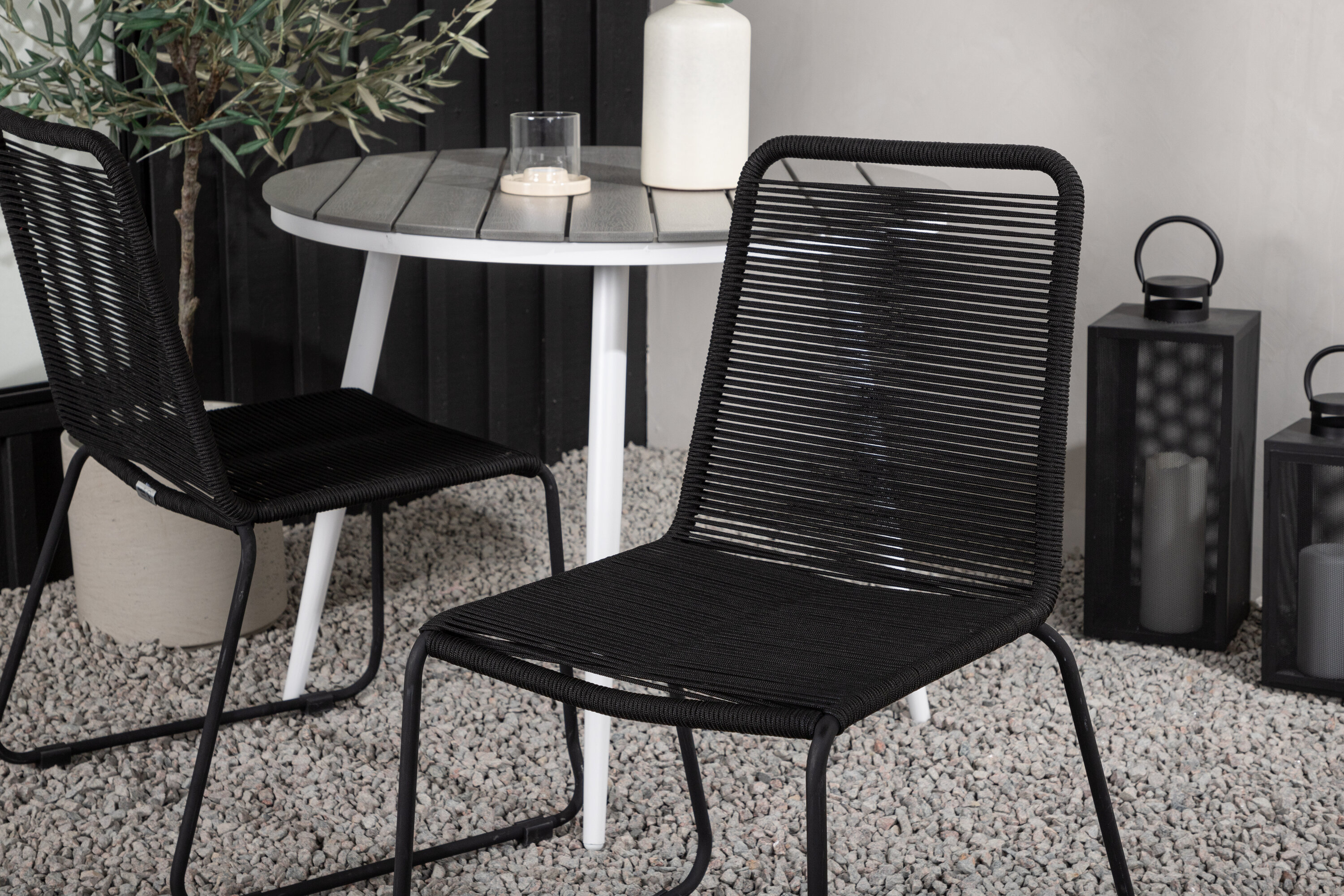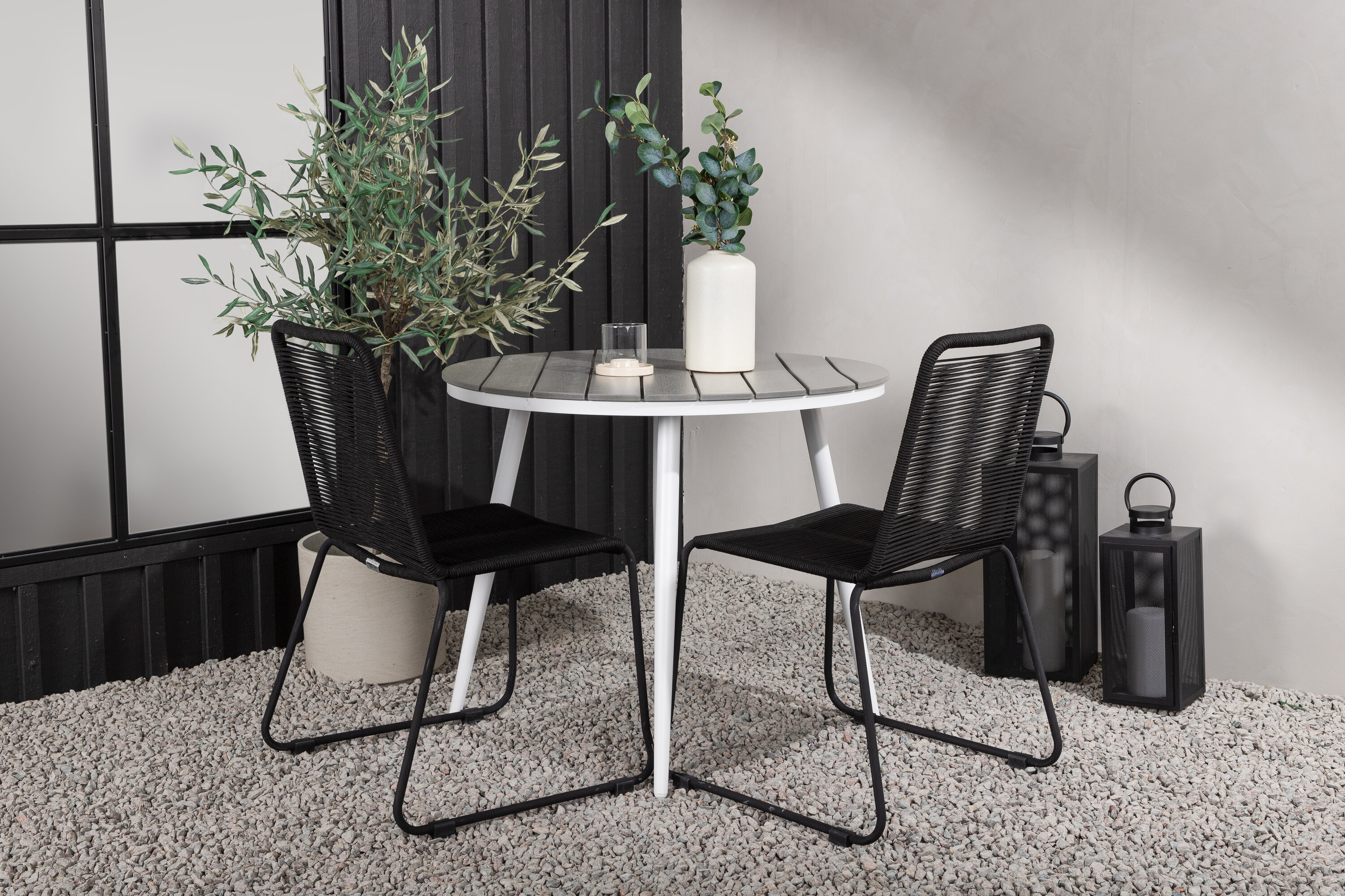 Bequeme, einladende und hübsche Café-Gruppe in schwarzer Farbe passt diesen Sommer perfekt auf die Terrasse! Der Break-Tisch hat eine runde Tischplatte in grauem Aintwood und ein klassisches weißes Aluminium-Fahrgestell. Hier in perfekter Kombination mit schlanken Stühlen aus der Lindos-Serie. Die Stühle haben stilvolle schmale Beine aus schwarzem Aluminium und einen Sitz aus strapazierfähigem, schwarzem Seil. Es ist auch stapelbar für praktische Lagerung. Dies ist eine einladende Essensgruppe für zwei, die diesen Sommer garantiert angenehme Momente verlängern wird!