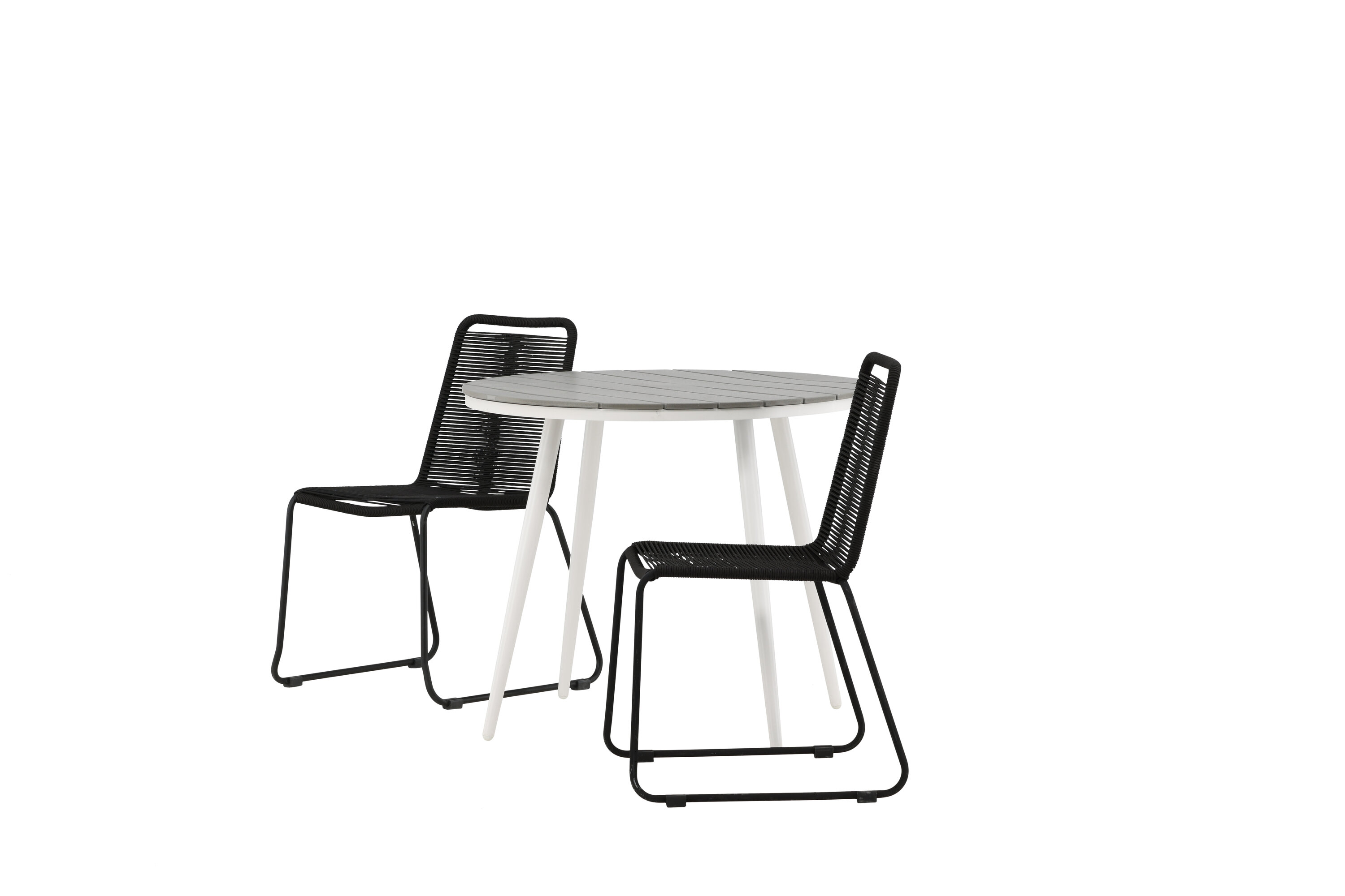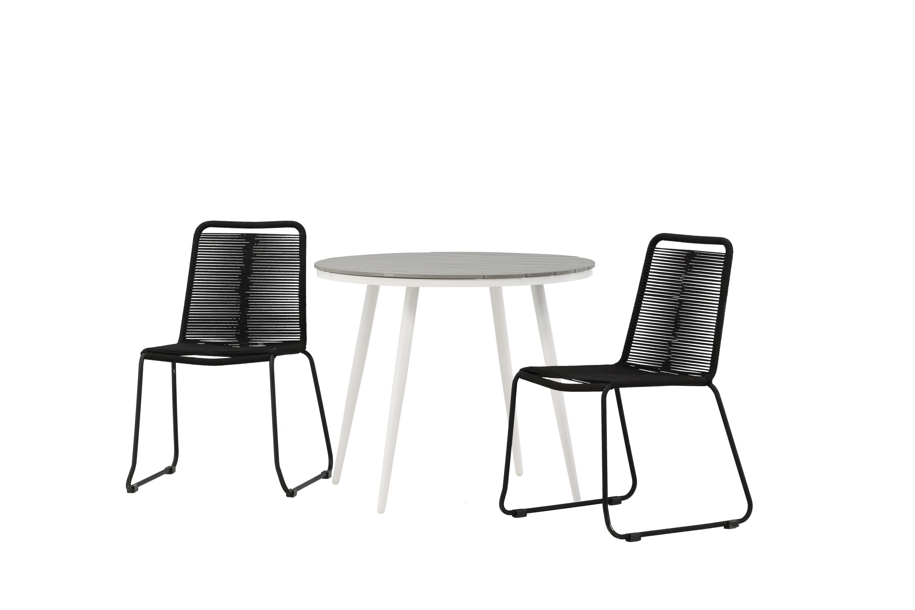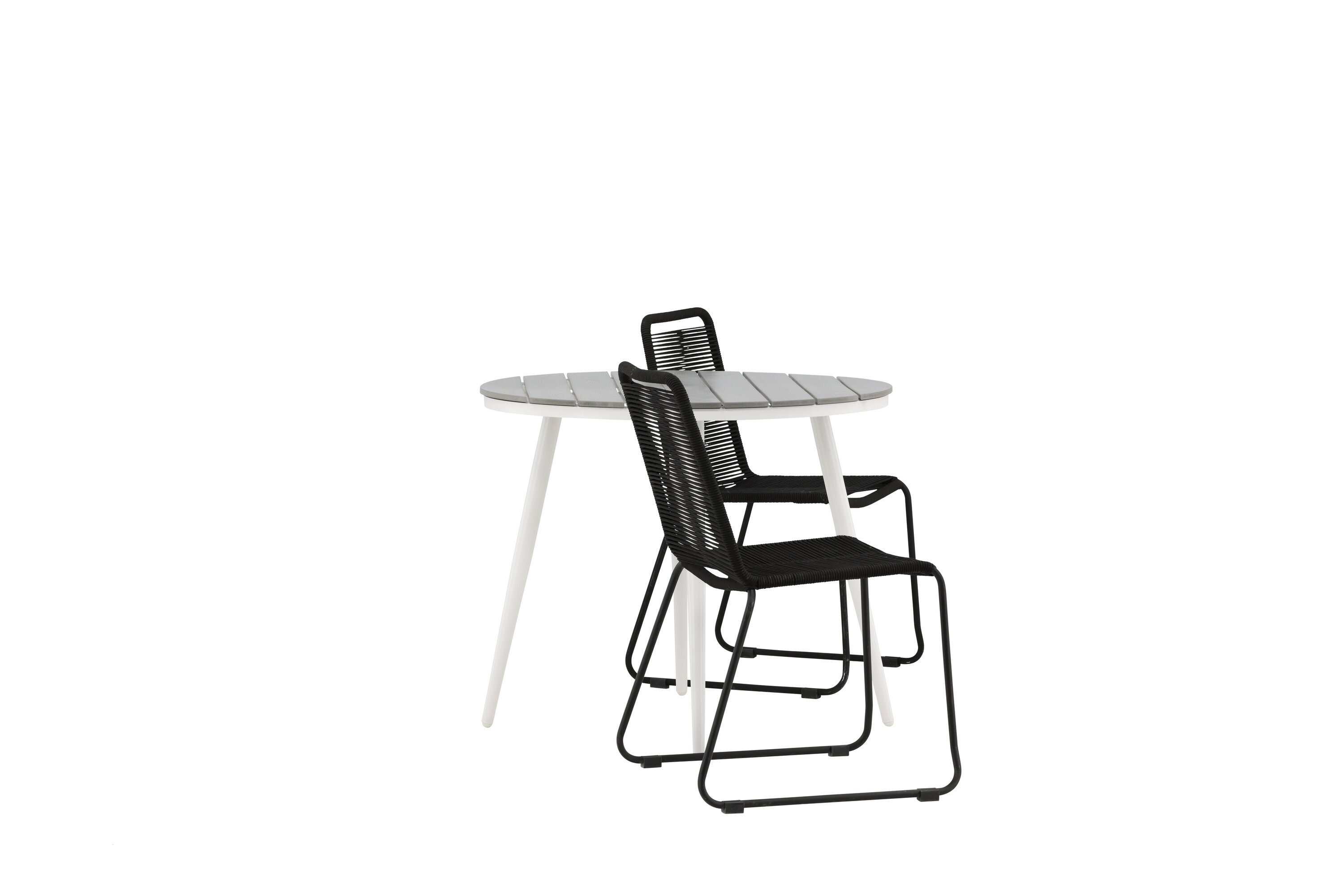 Bequeme, einladende und hübsche Café-Gruppe in schwarzer Farbe passt diesen Sommer perfekt auf die Terrasse! Der Break-Tisch hat eine runde Tischplatte in grauem Aintwood und ein klassisches weißes Aluminium-Fahrgestell. Hier in perfekter Kombination mit schlanken Stühlen aus der Lindos-Serie. Die Stühle haben stilvolle schmale Beine aus schwarzem Aluminium und einen Sitz aus strapazierfähigem, schwarzem Seil. Es ist auch stapelbar für praktische Lagerung. Dies ist eine einladende Essensgruppe für zwei, die diesen Sommer garantiert angenehme Momente verlängern wird!