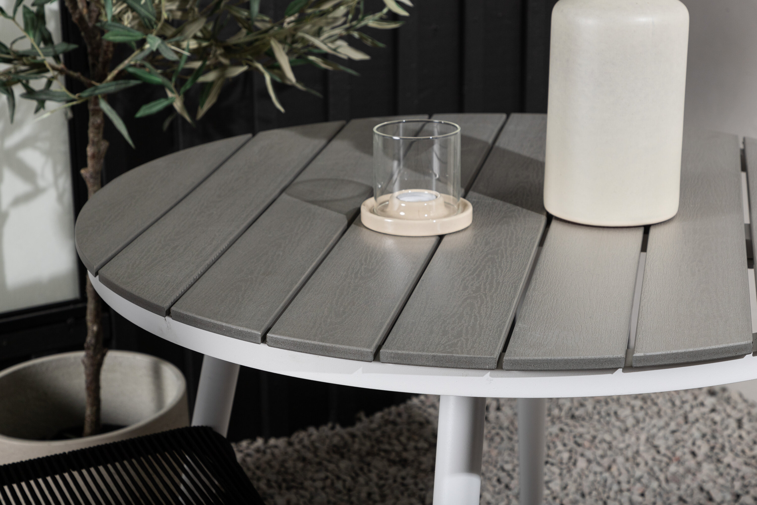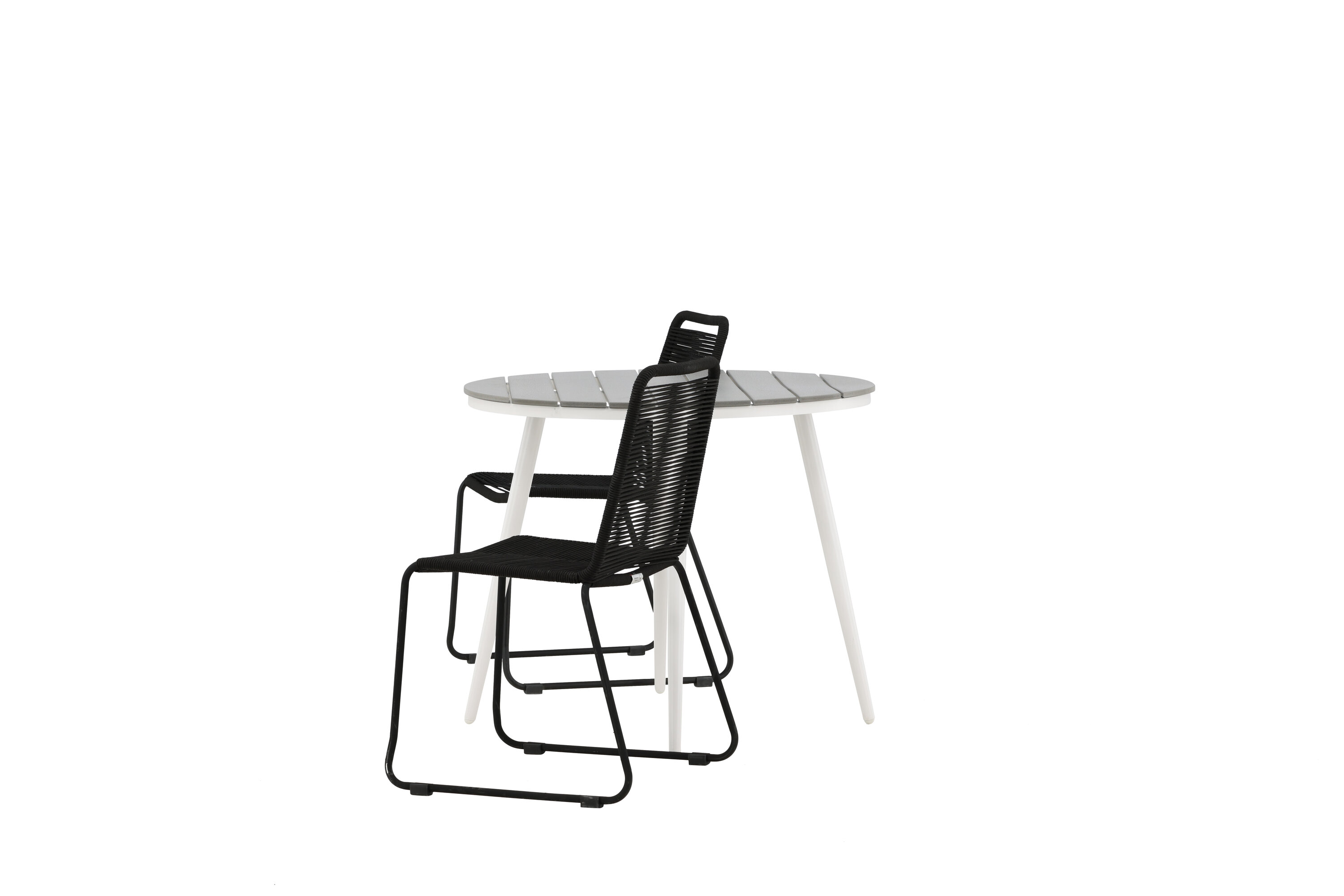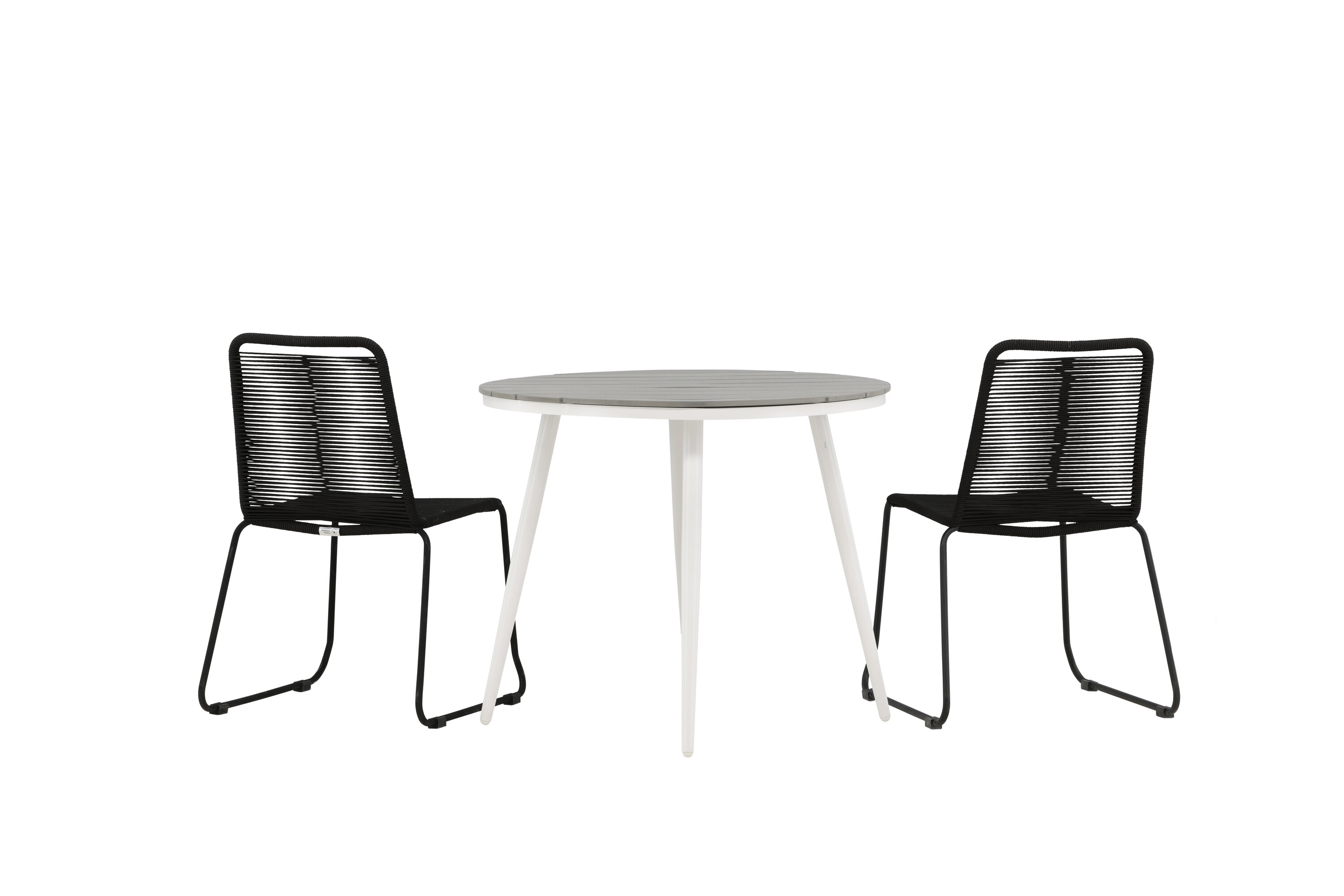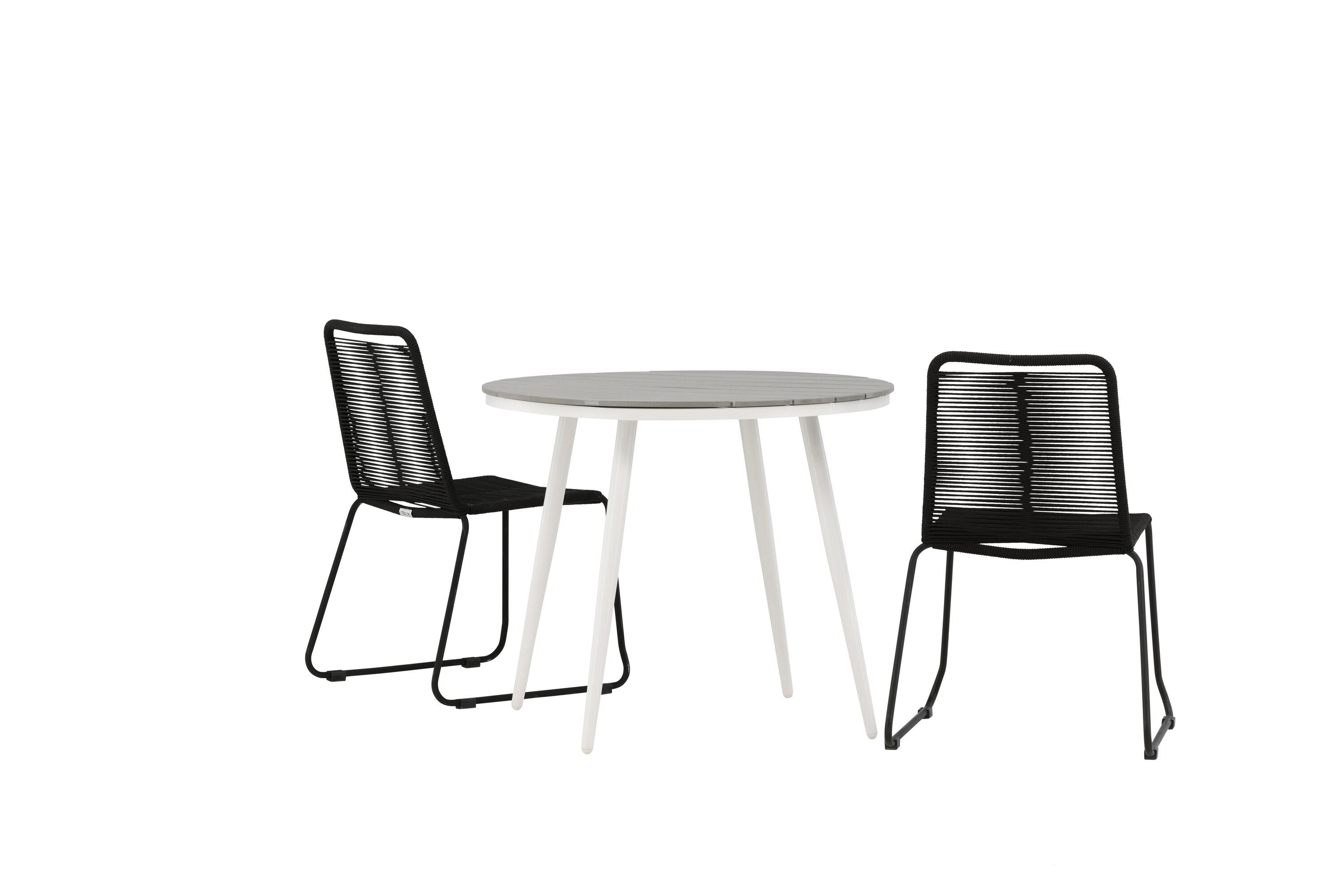 Bequeme, einladende und hübsche Café-Gruppe in schwarzer Farbe passt diesen Sommer perfekt auf die Terrasse! Der Break-Tisch hat eine runde Tischplatte in grauem Aintwood und ein klassisches weißes Aluminium-Fahrgestell. Hier in perfekter Kombination mit schlanken Stühlen aus der Lindos-Serie. Die Stühle haben stilvolle schmale Beine aus schwarzem Aluminium und einen Sitz aus strapazierfähigem, schwarzem Seil. Es ist auch stapelbar für praktische Lagerung. Dies ist eine einladende Essensgruppe für zwei, die diesen Sommer garantiert angenehme Momente verlängern wird!