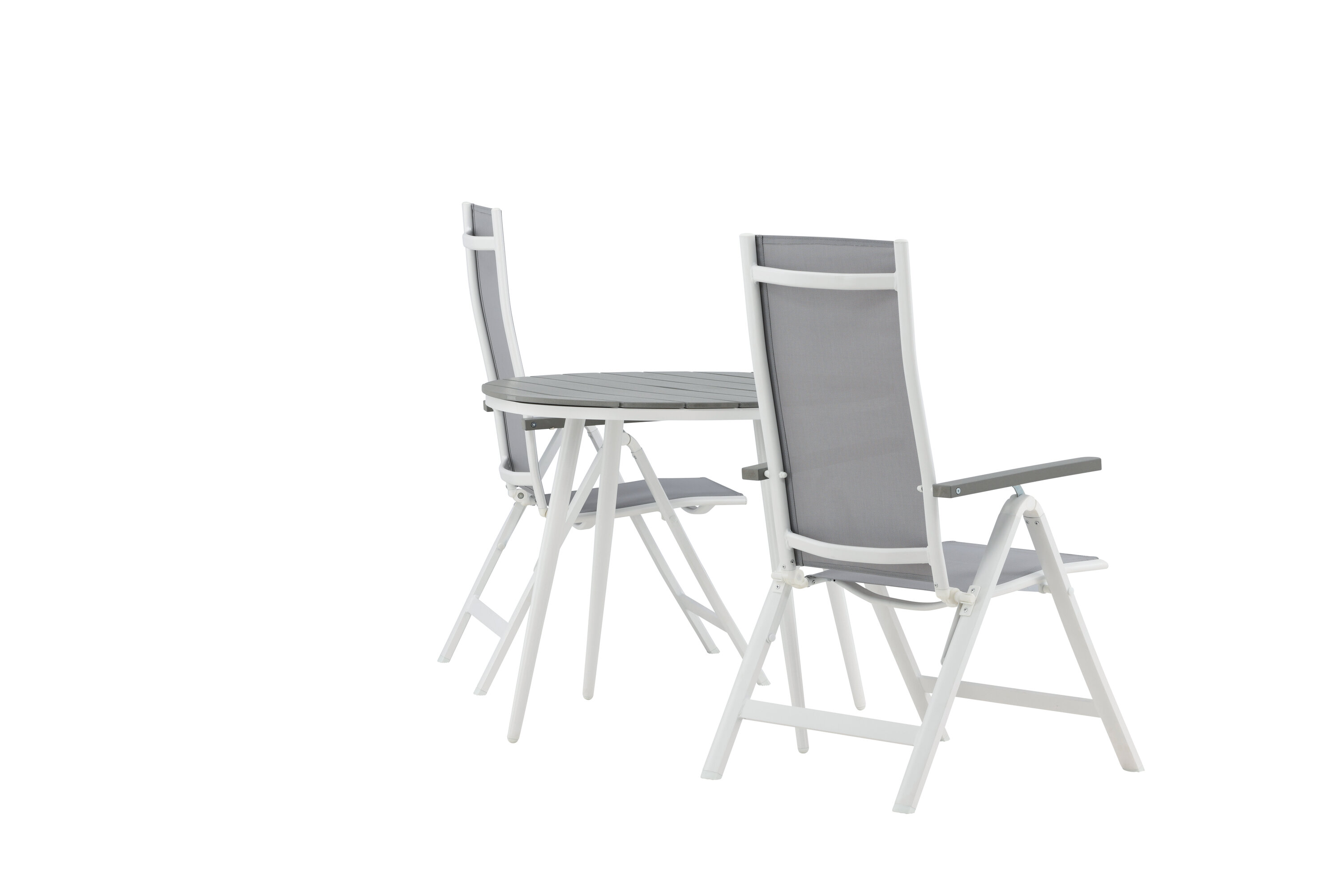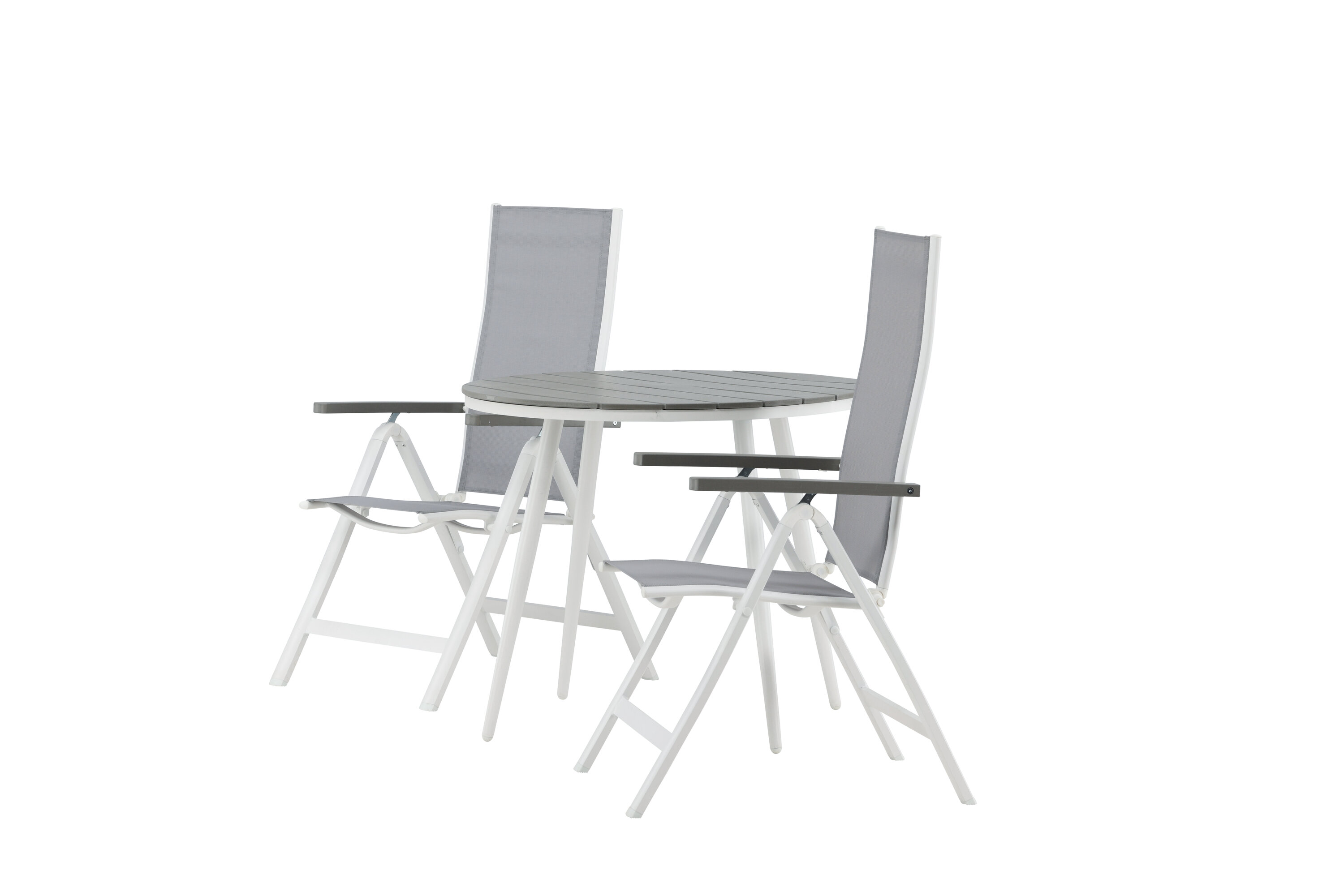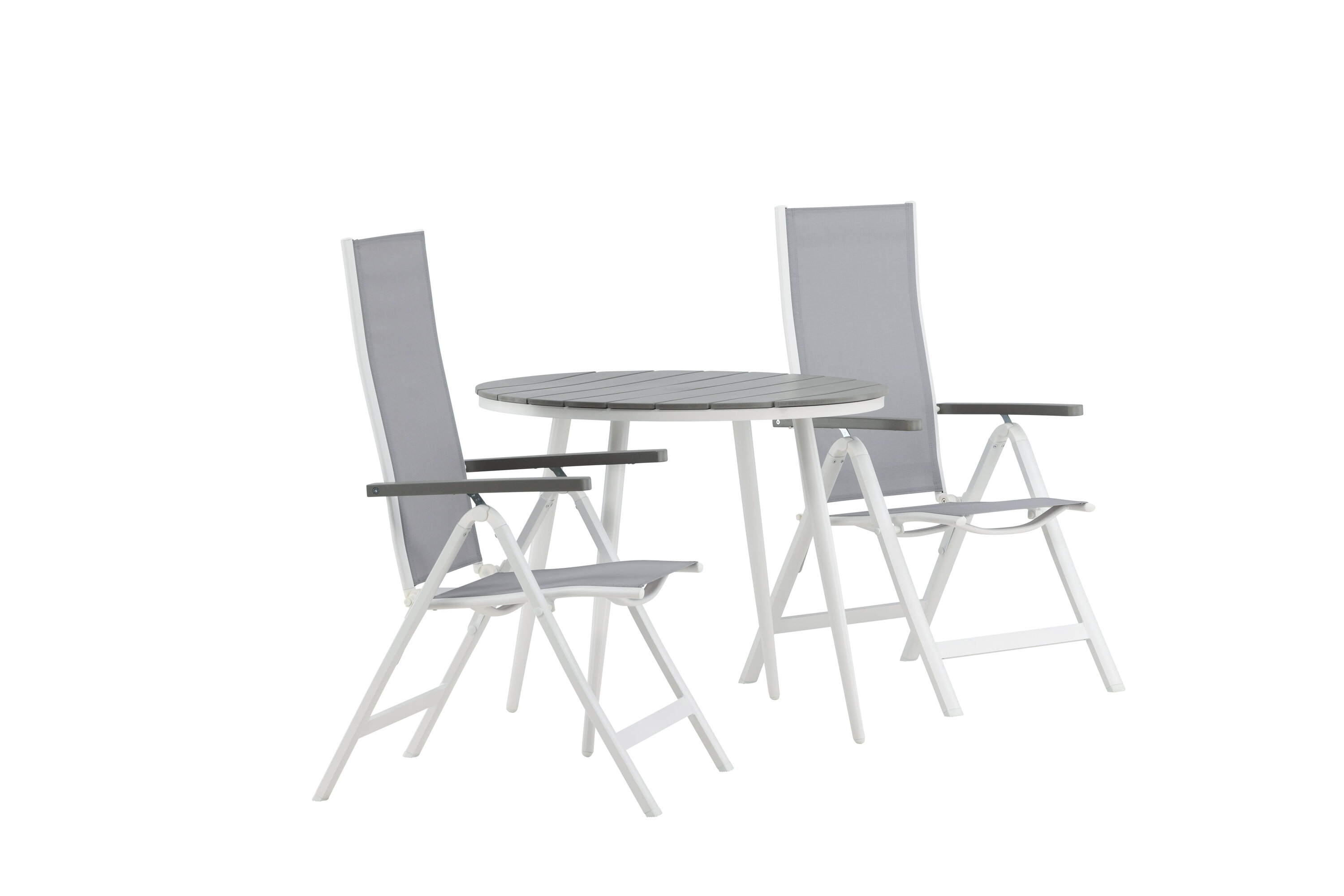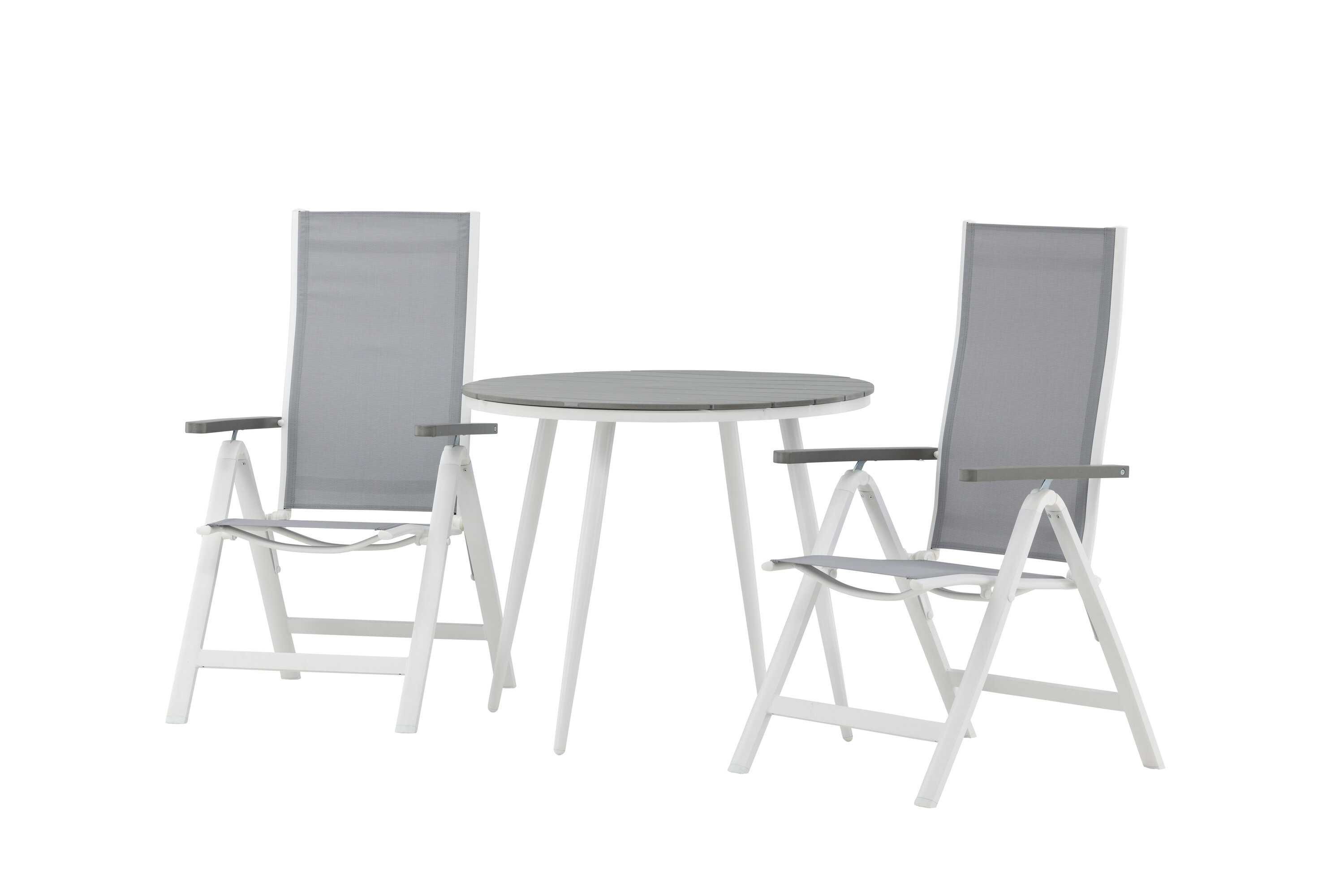 Kreieren Sie diesen Sommer den perfekten Kaffeeplatz auf Ihrer Terrasse! Hier verbindet sich zeitloses Design mit einladenden Formen in einem hübschen Blickfang. Esstisch Break hat eine graue Tischplatte in grauem Aintwood und ein klassisches weißes Aluminium-Fahrgestell. Hier in köstlicher Kombination mit 2 Esszimmerstühlen aus der Serie Albany. Der Stuhl ist ein grauer 5-Positionsstuhl aus Textil mit köstlichen Armlehnen und weißer Aluminiumrahmenkonstruktion. Die Rückenlehne ist klappbar für optimalen Komfort und Entspannung - Frühstück oder Abendkaffee ausrichten und Sommertage genießen!