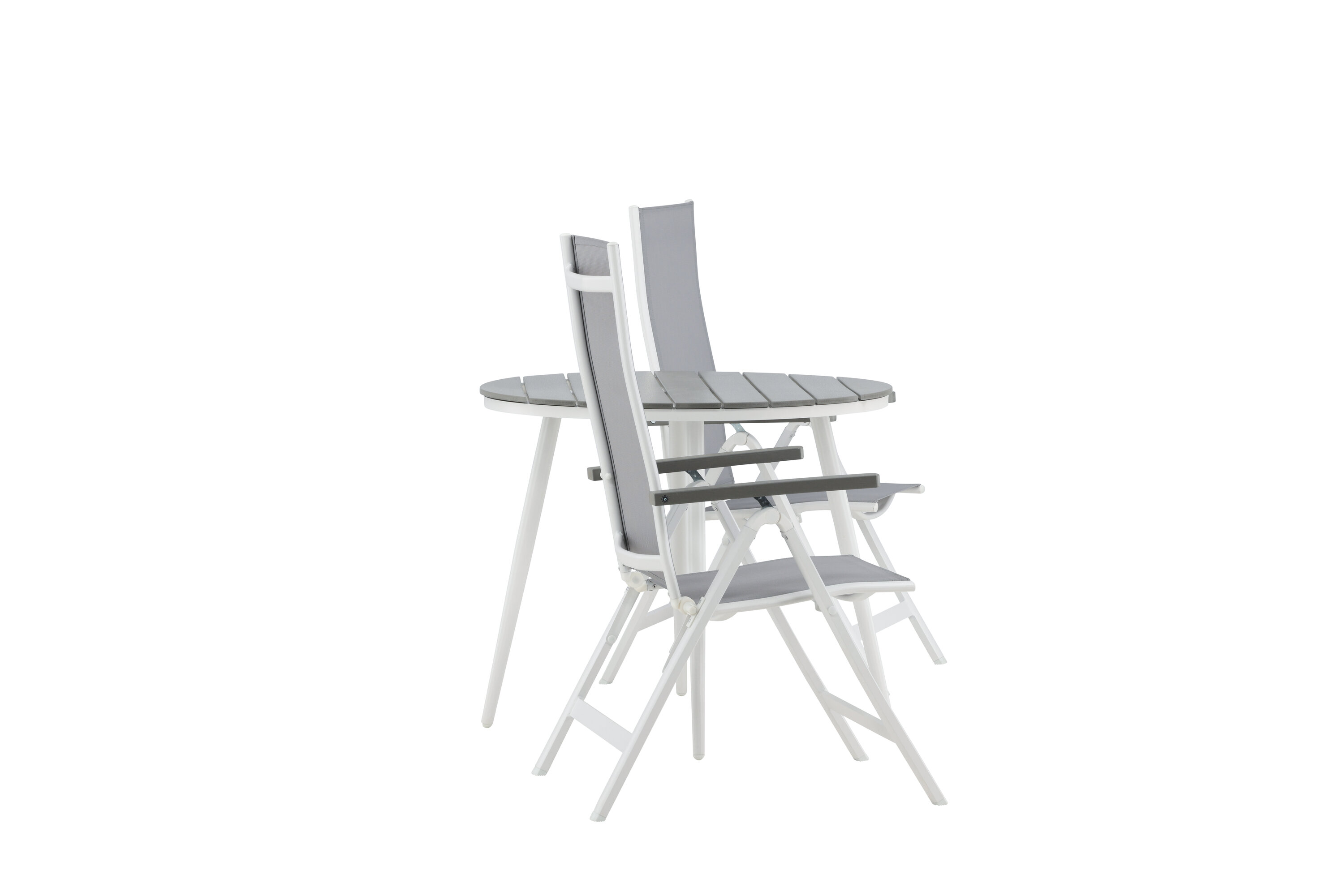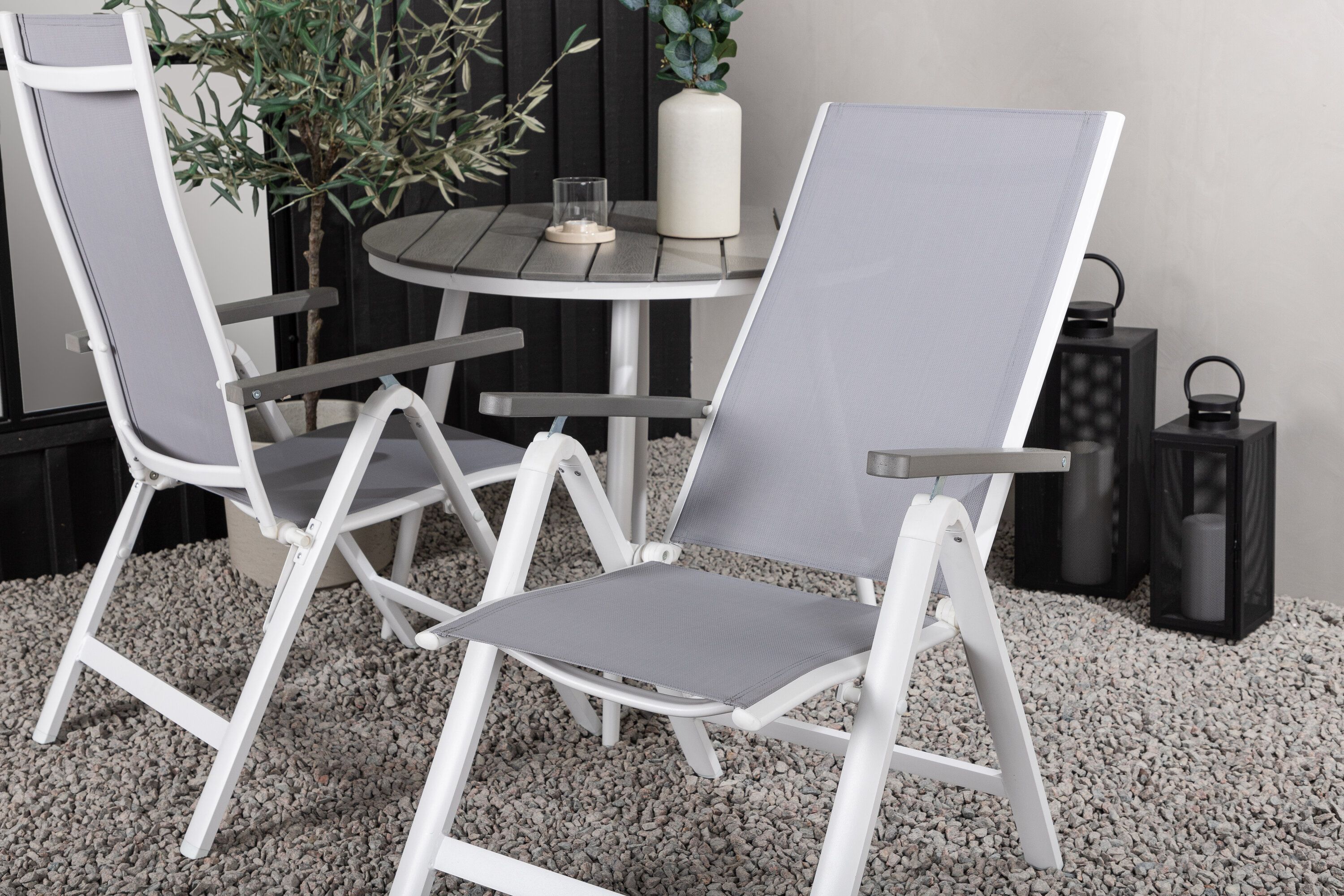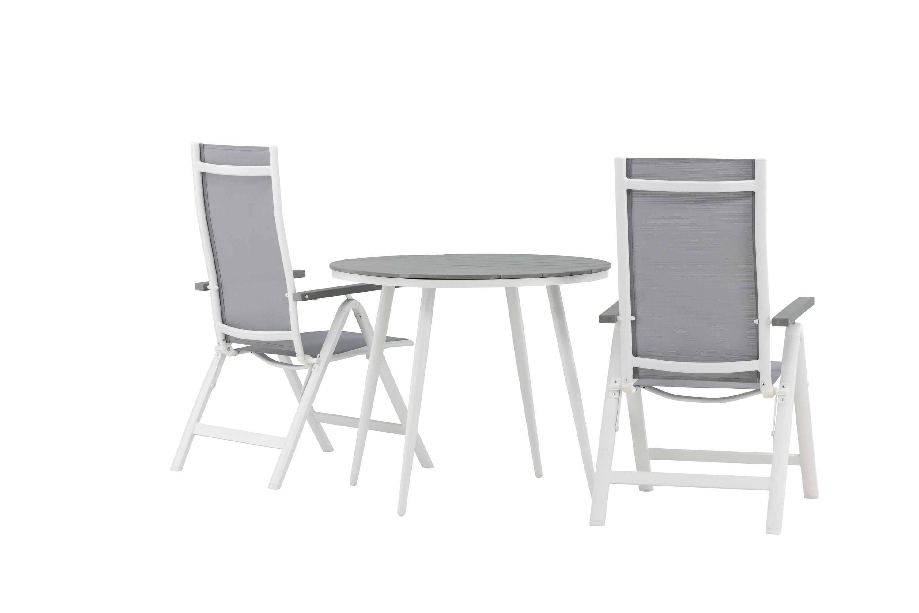 Kreieren Sie diesen Sommer den perfekten Kaffeeplatz auf Ihrer Terrasse! Hier verbindet sich zeitloses Design mit einladenden Formen in einem hübschen Blickfang. Esstisch Break hat eine graue Tischplatte in grauem Aintwood und ein klassisches weißes Aluminium-Fahrgestell. Hier in köstlicher Kombination mit 2 Esszimmerstühlen aus der Serie Albany. Der Stuhl ist ein grauer 5-Positionsstuhl aus Textil mit köstlichen Armlehnen und weißer Aluminiumrahmenkonstruktion. Die Rückenlehne ist klappbar für optimalen Komfort und Entspannung - Frühstück oder Abendkaffee ausrichten und Sommertage genießen!