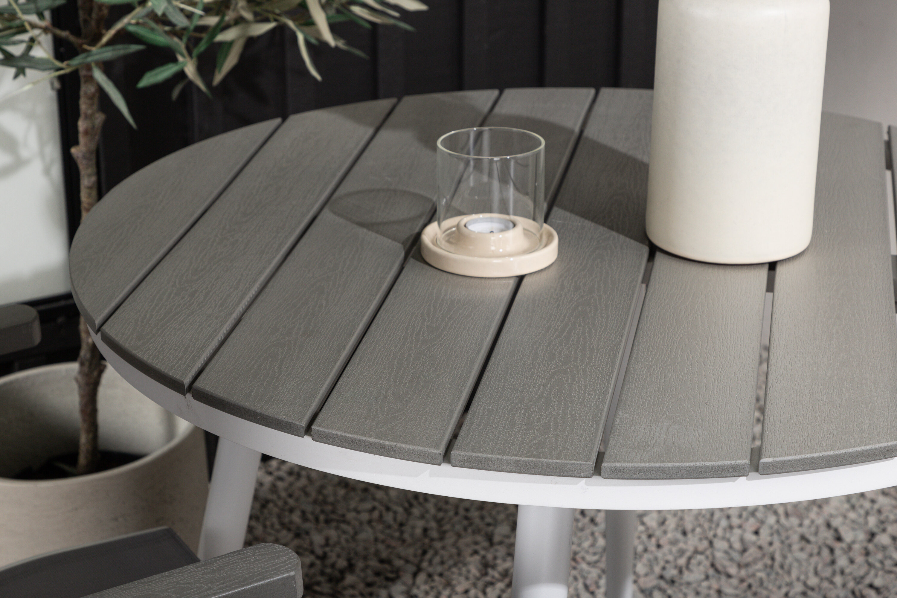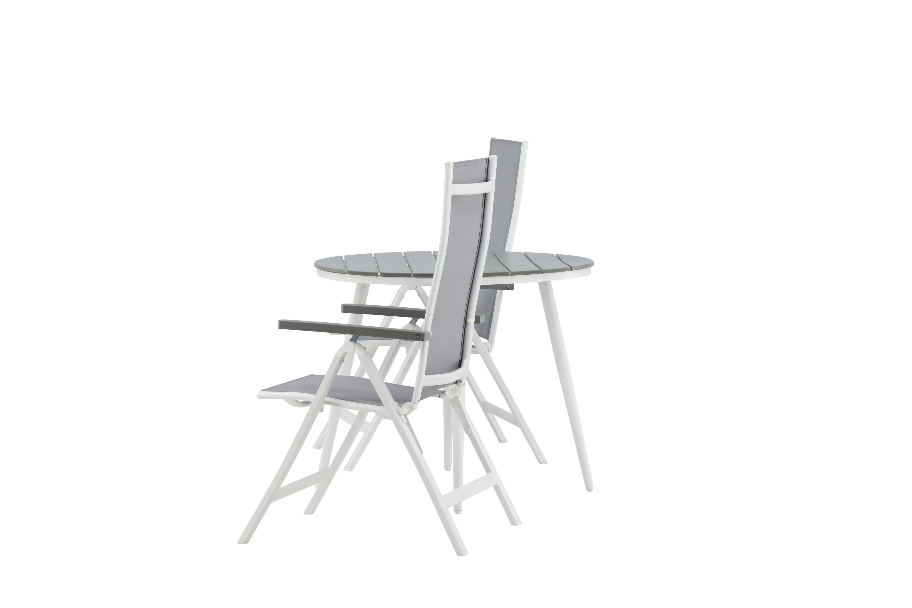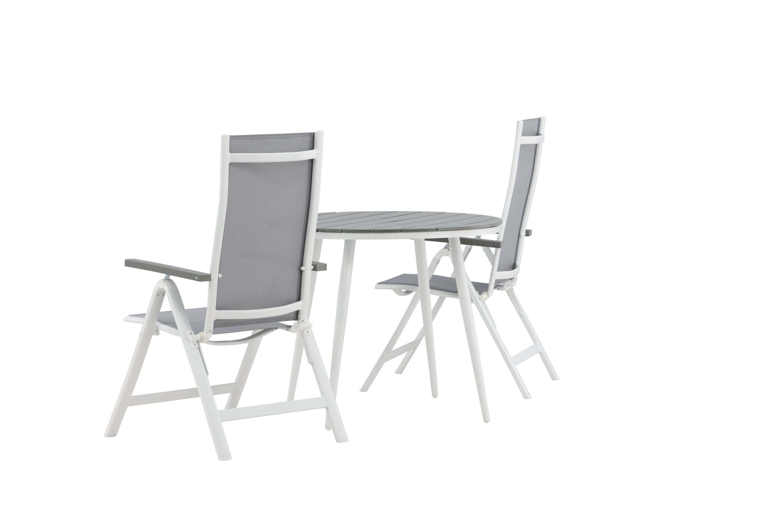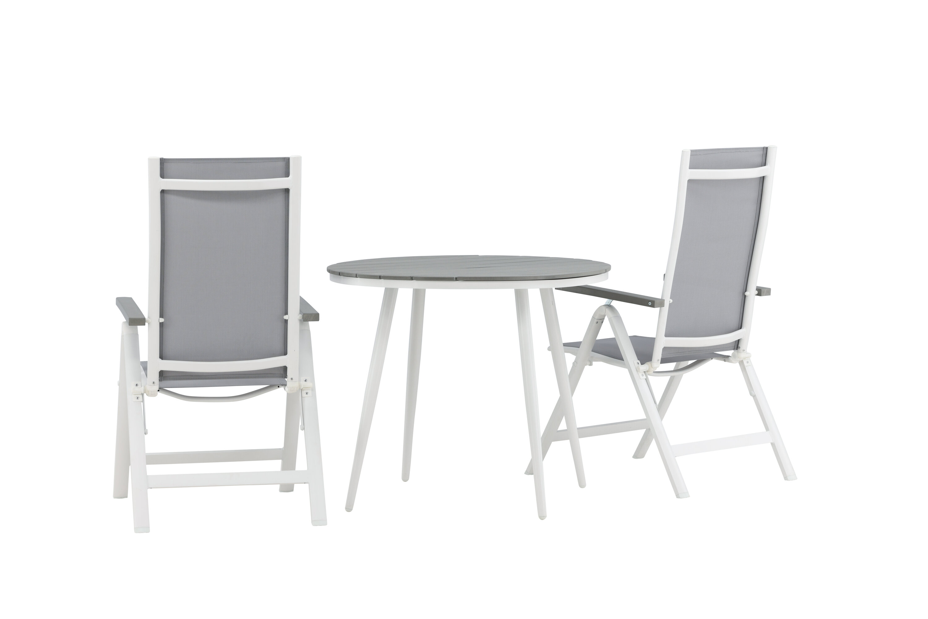 Kreieren Sie diesen Sommer den perfekten Kaffeeplatz auf Ihrer Terrasse! Hier verbindet sich zeitloses Design mit einladenden Formen in einem hübschen Blickfang. Esstisch Break hat eine graue Tischplatte in grauem Aintwood und ein klassisches weißes Aluminium-Fahrgestell. Hier in köstlicher Kombination mit 2 Esszimmerstühlen aus der Serie Albany. Der Stuhl ist ein grauer 5-Positionsstuhl aus Textil mit köstlichen Armlehnen und weißer Aluminiumrahmenkonstruktion. Die Rückenlehne ist klappbar für optimalen Komfort und Entspannung - Frühstück oder Abendkaffee ausrichten und Sommertage genießen!