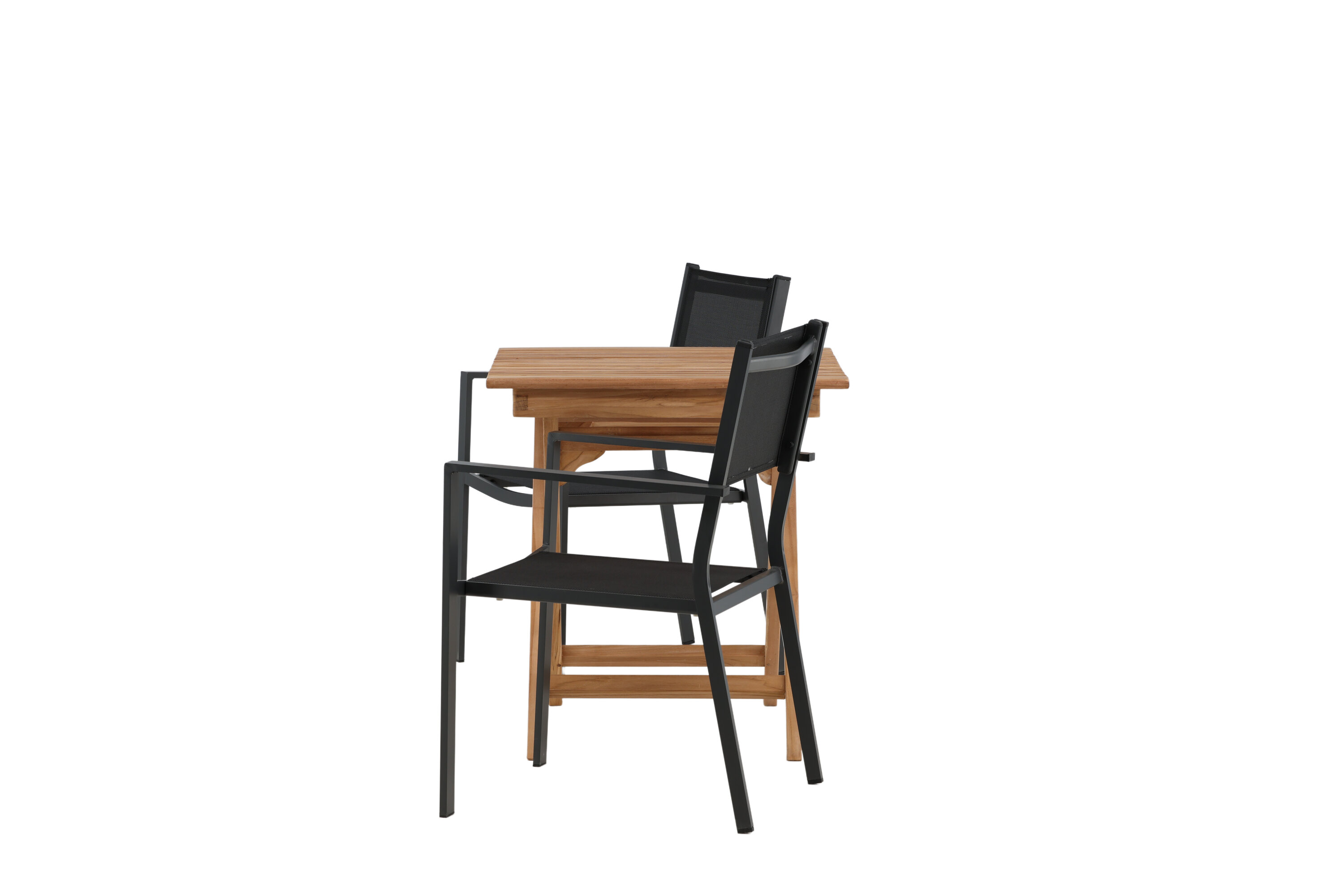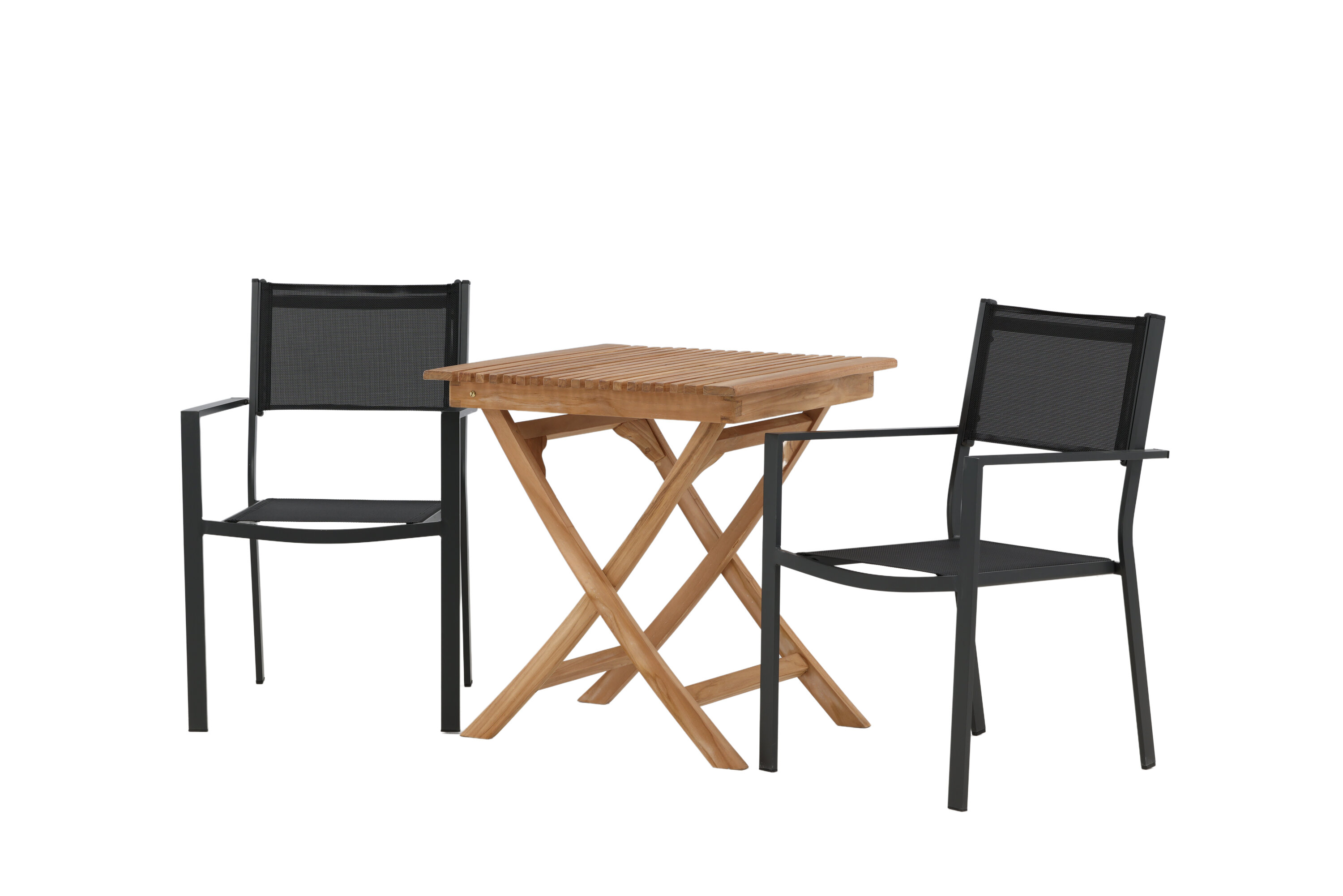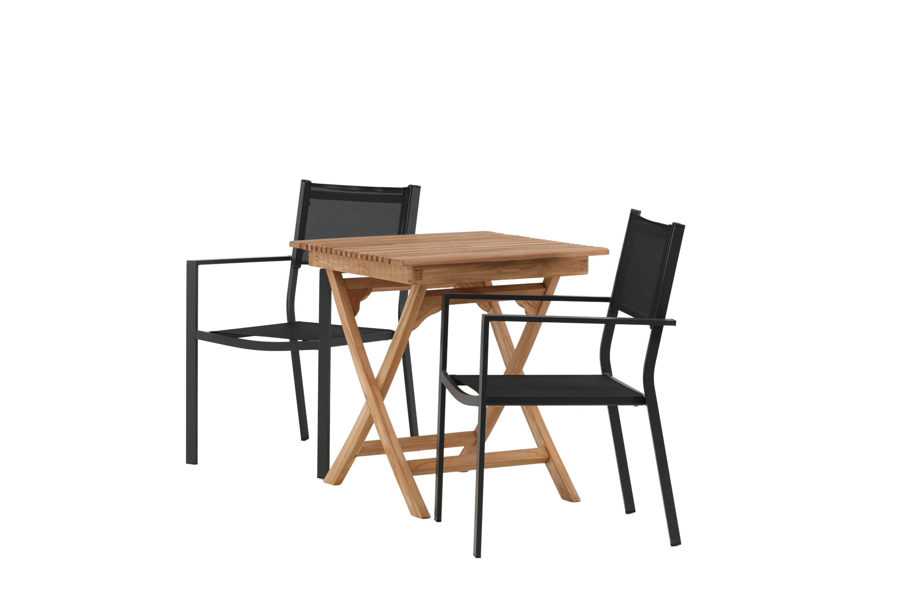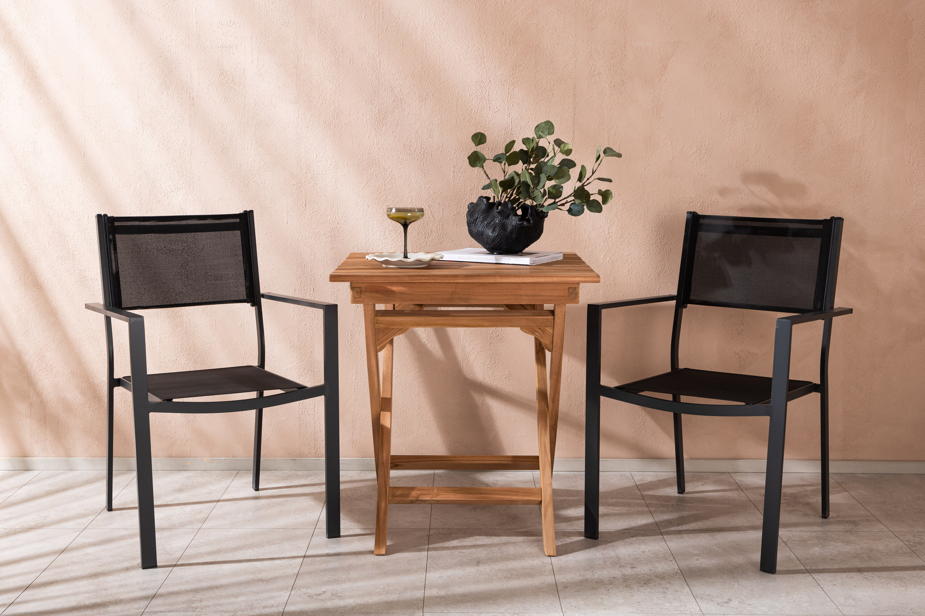 Stilvoll, smart und minimalistisch - ein Café, das den Sommer vergoldet! Esstisch Ghana hat ein hübsches Design in wunderschönem Teakholz und ist für praktische Aufbewahrung und Bewegung zusammenklappbar. Hier zusammen mit stapelbaren Stühlen aus der Copacabana-Serie in Black Textilene. Die Stühle haben gerade nordische Formen und einen weichen Komfort. Erstelle einen einladenden Ort auf deiner Terrasse!